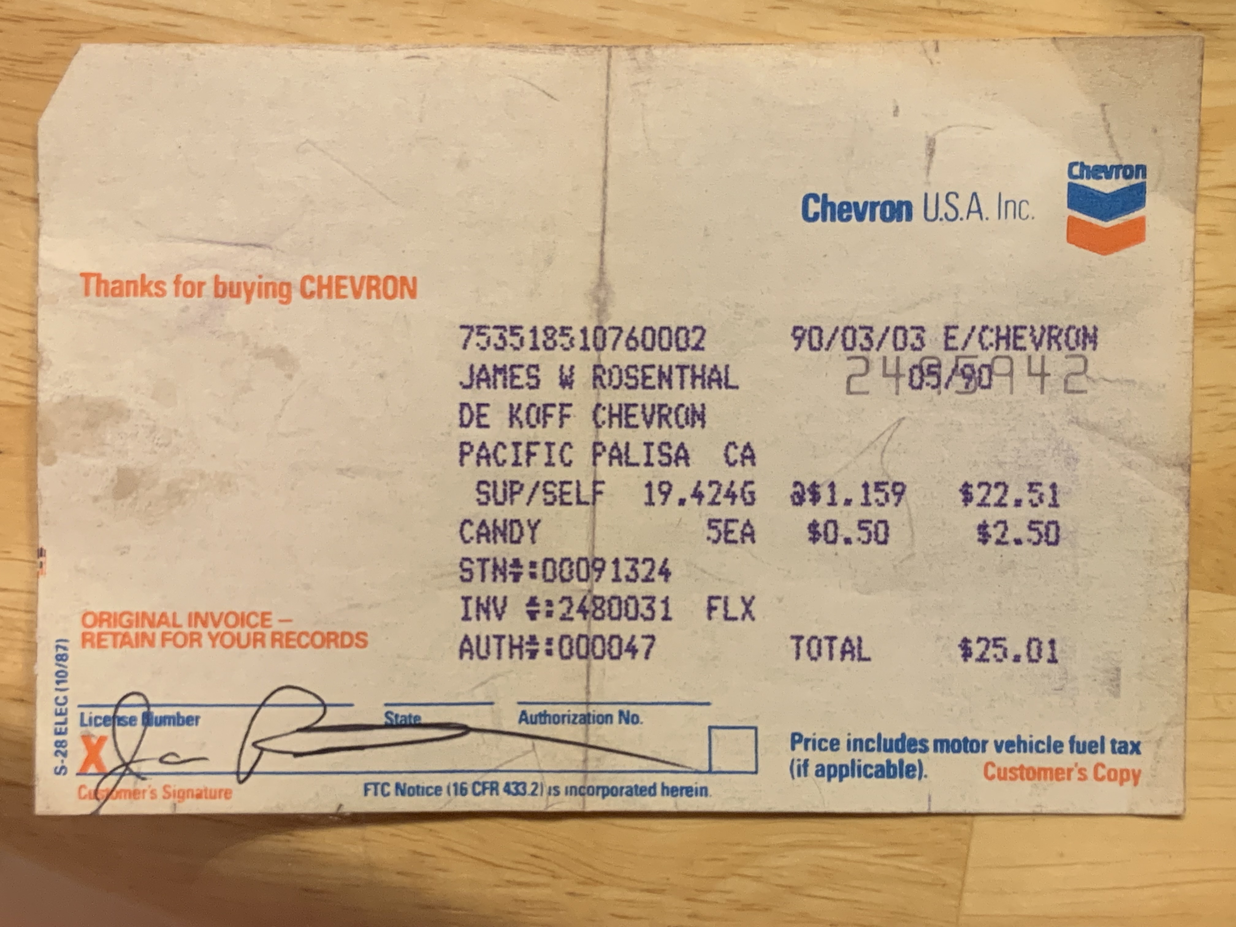 March 3rd, 1990. Chevron at the corner of PCH and Sunset for a full tank of super for my Toyota Landcrusier- and 5 candy bars apparently.