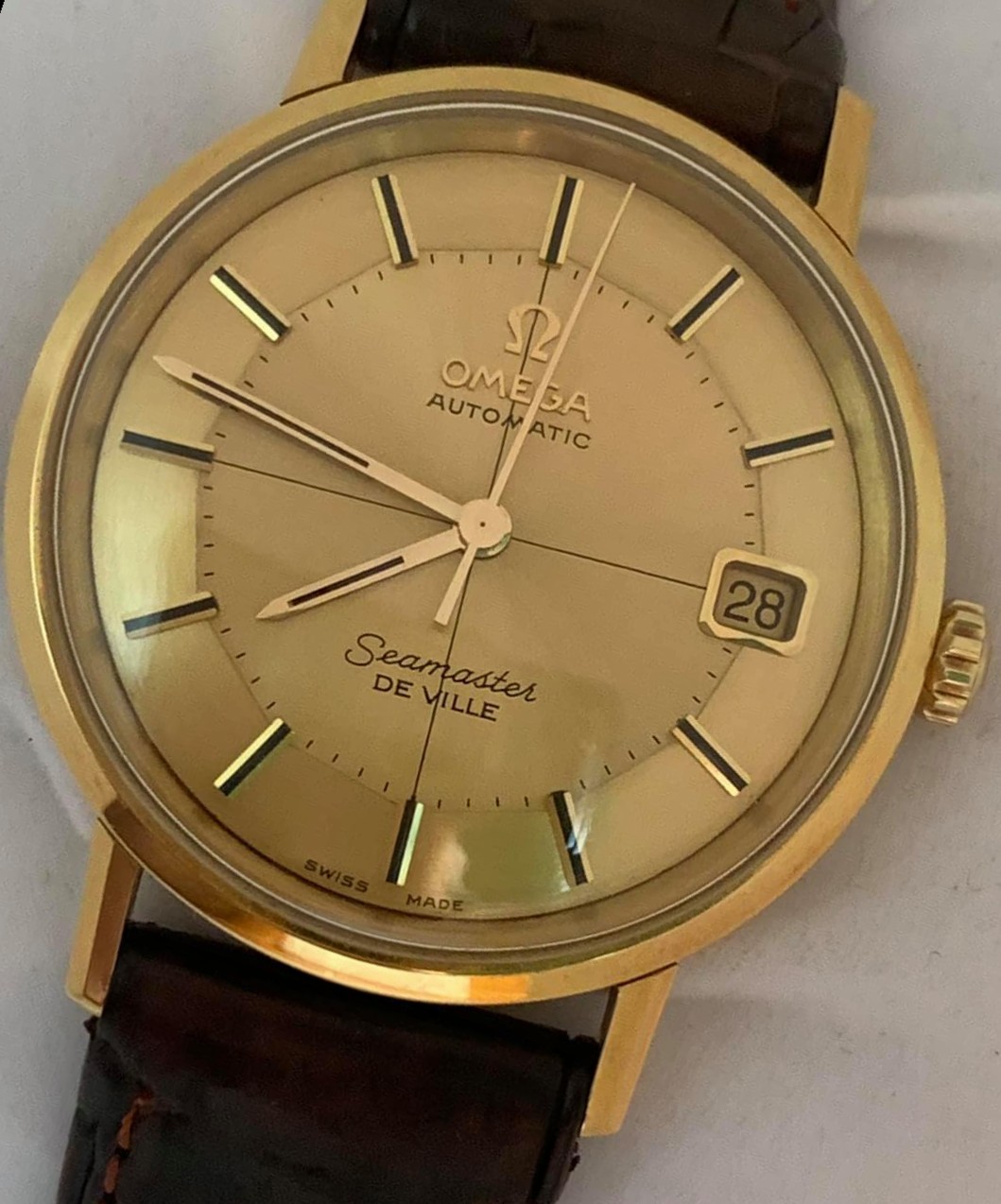 Apart from the eighties quartz Seamaster, I don't recall ever seeing a true "Omega Style" pie pan Seamaster before and if I were to nit-pick the spacing of Swiss Made looks a bit awkward to me. Apart from that, I have a hard time seeing why it shouldn't be correct - very special watch! The black parts are onyx inlays and not paint, correct?