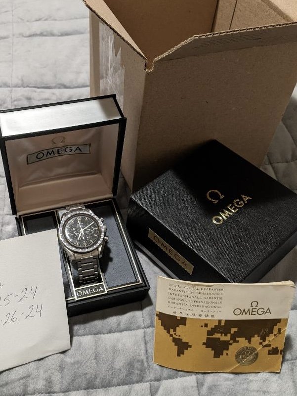 Scrolling through FB Marketplace a little over a week ago, I came across what looked like a vintage Speedmaster 145.022-69 with a Straight Writing case back. Clicked on the listing and saw that it was exactly that. The watch was also offered with what appeared to be an 1175 bracelet with one No. 47 end link, one replacement end link and box and papers! Looked at all the photos, dial looked as it might be a -76 or -78 service dial but the crystal was so scratched up I couldn't be certain. Looked over the other photos, thought I'd give it a chance, and reached out to the seller for photos of the papers information side. Everything looked to check out.