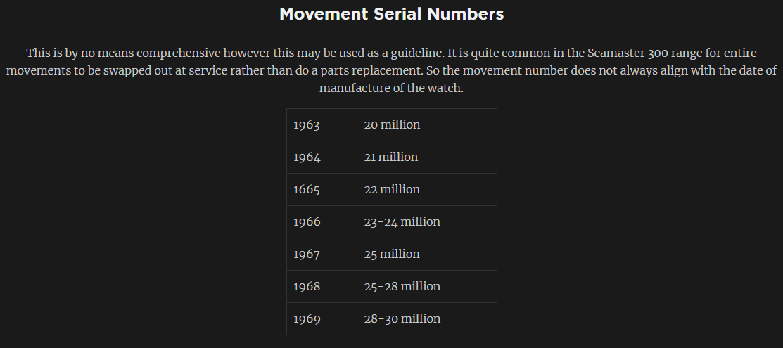 4. Lastly, from what I understood from the seller, the movement serial number is within the 22million range, which according to the omegaseamaster300 website, indicates that the movement period is in 1965.