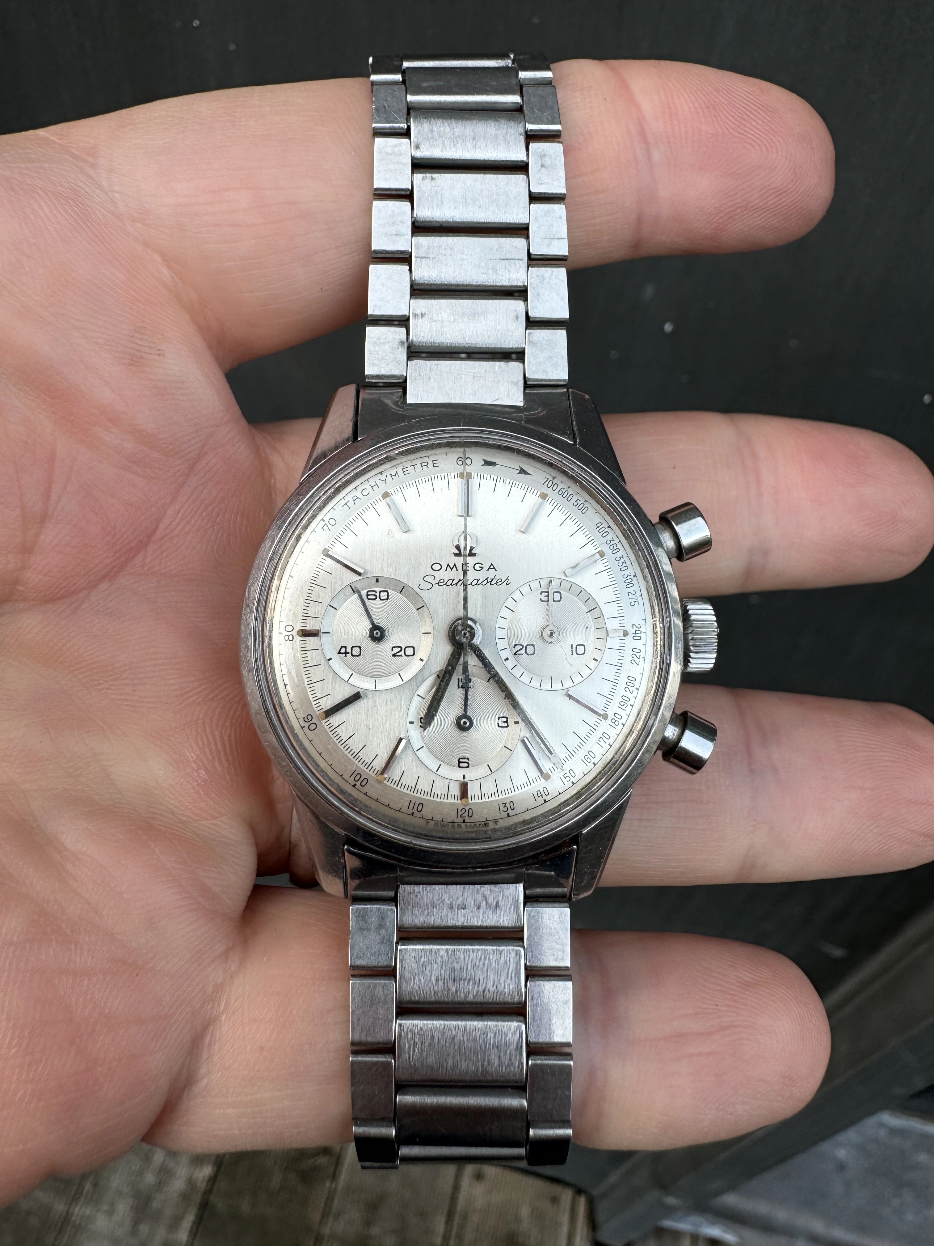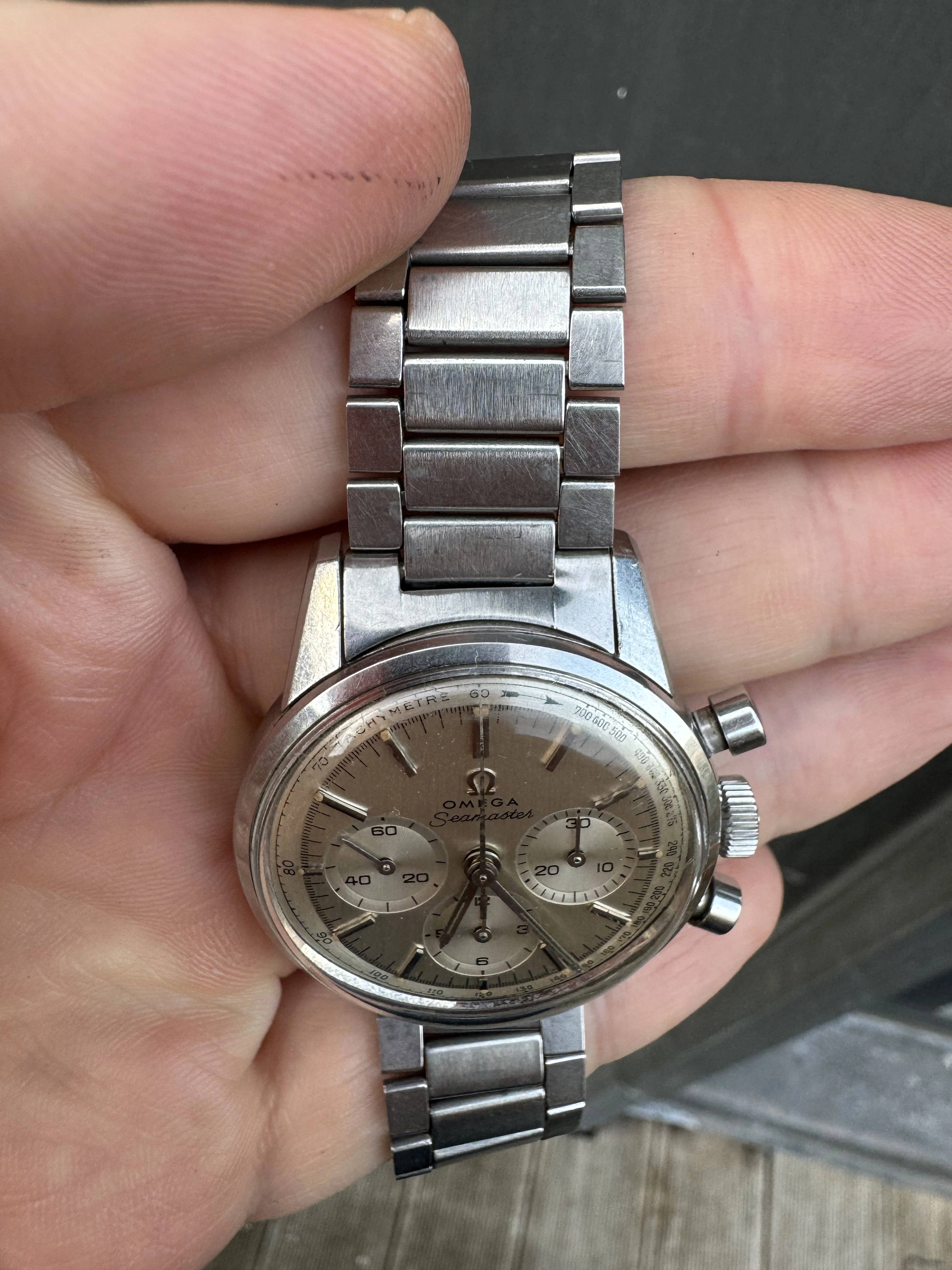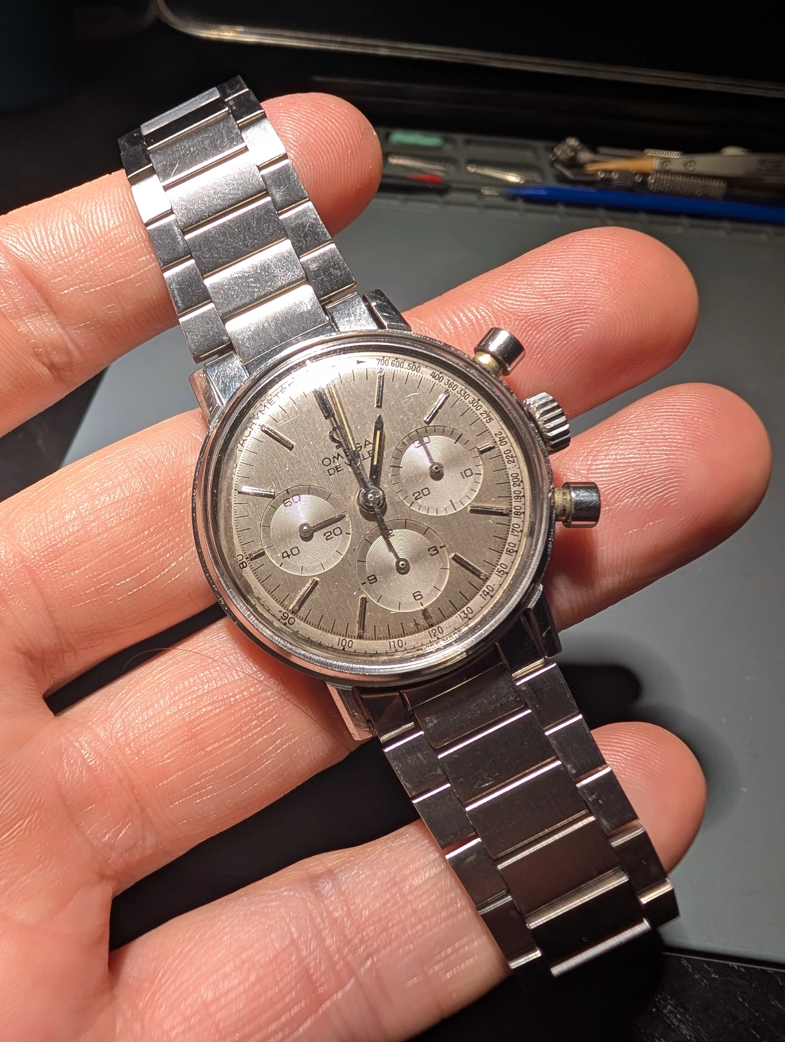 ·Here's the 105.005 I've had sitting in a box for years with applied indices at 3 and 9. Originally it came with the BOR bracelet but now has #7 end links on an aftermarket flat link (because somehow this became a post-Xmas gift to the wifey & I couldn't get the original BOR bracelet to go down small enough!)