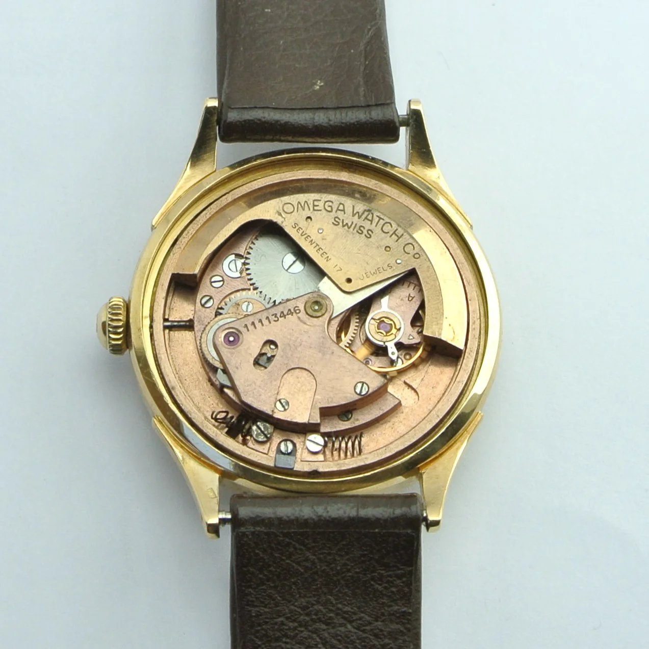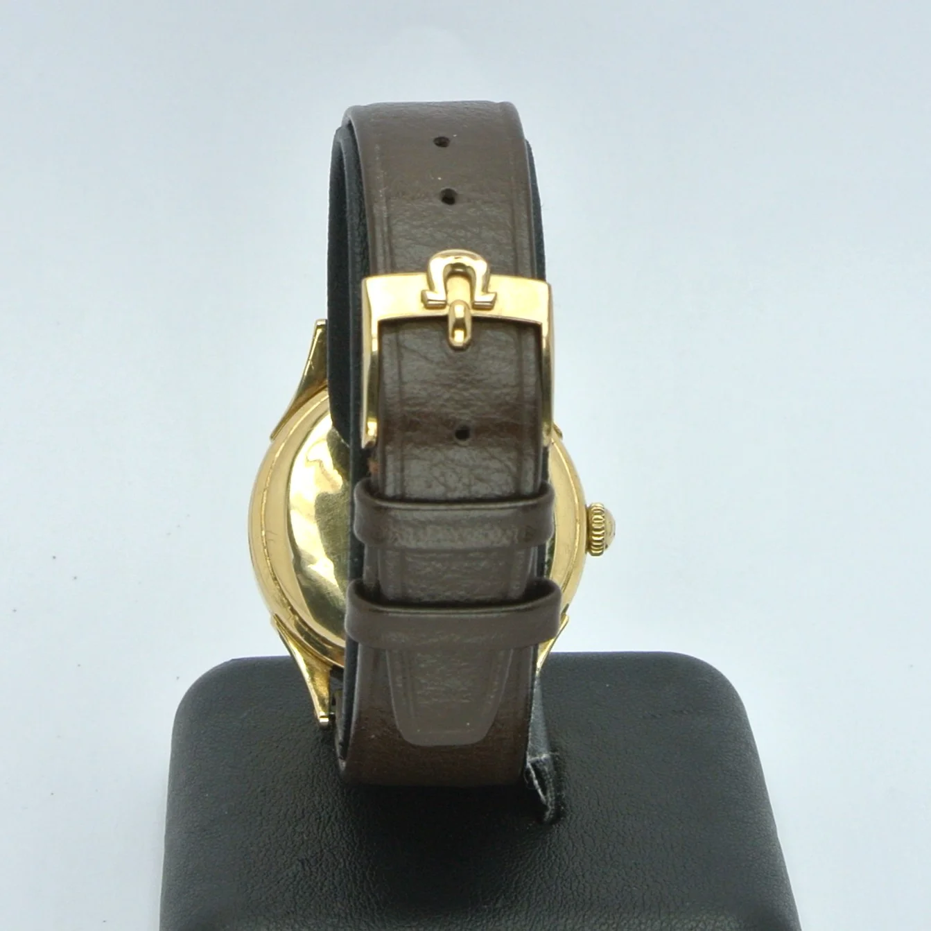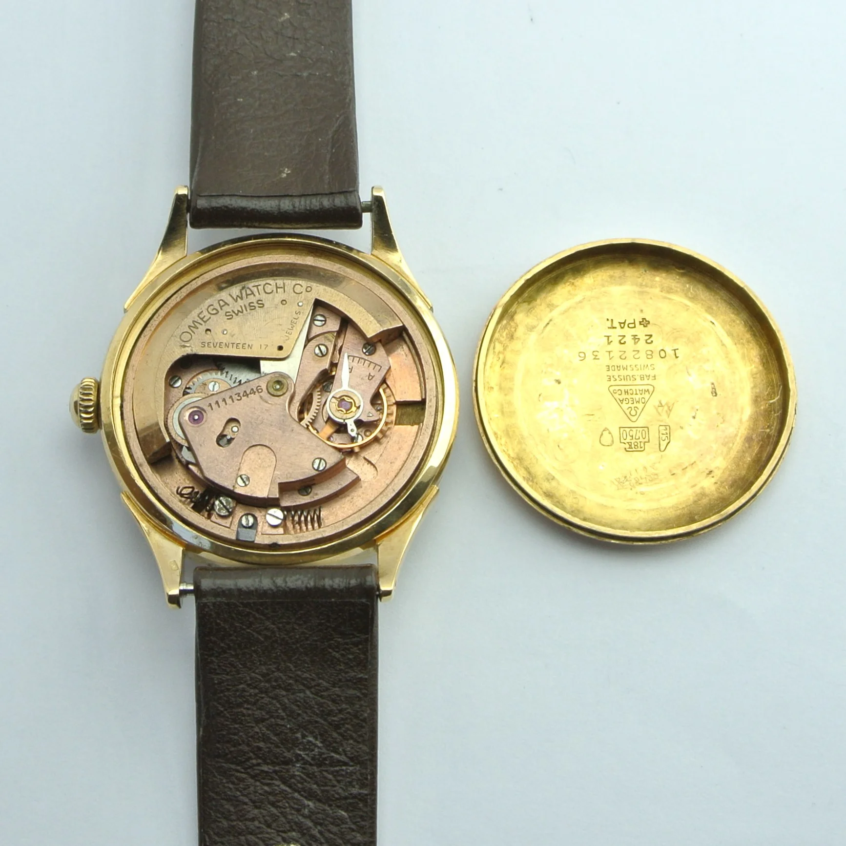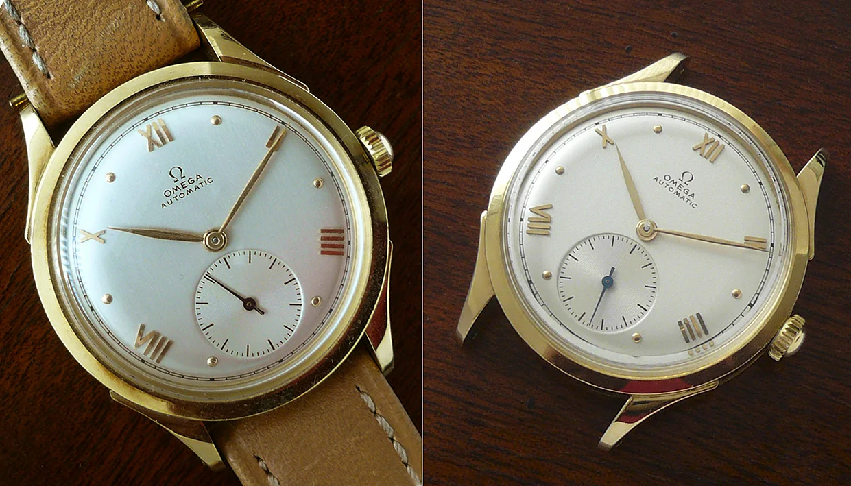 I'm a newbie when it comes to vintage watches, and I recently got my hands on an Omega Ref 2421. I'm excited to share some pictures of it with you! I'd really appreciate any help you could give me with a couple of questions. Do you know whether the crown (which seems gold-plated, compared to a 18k solid gold case) is original? I was just wondering, did Omega make solid gold watches with gold-plated crowns back in the 1940s, or is this a deviation from the original state?