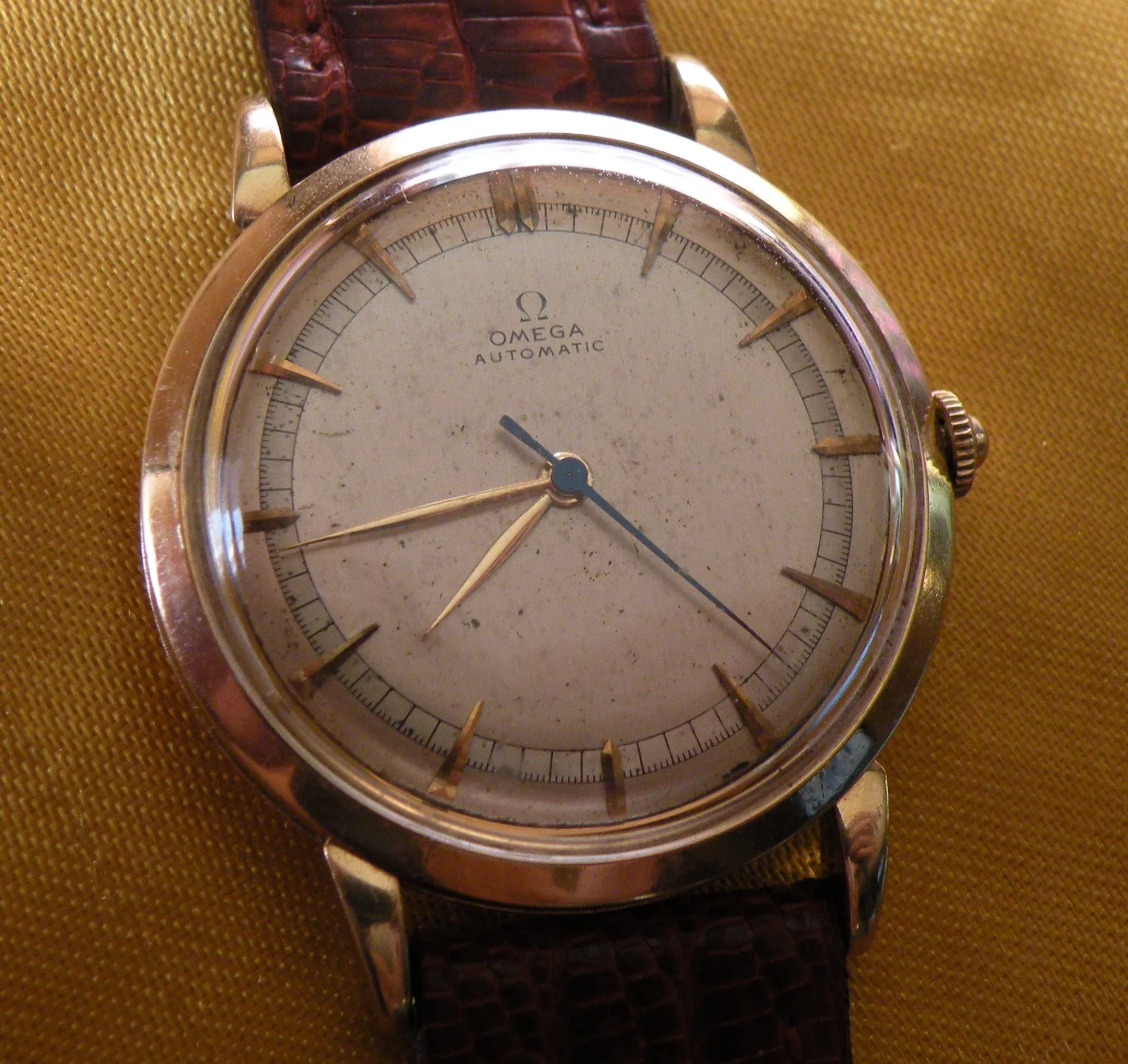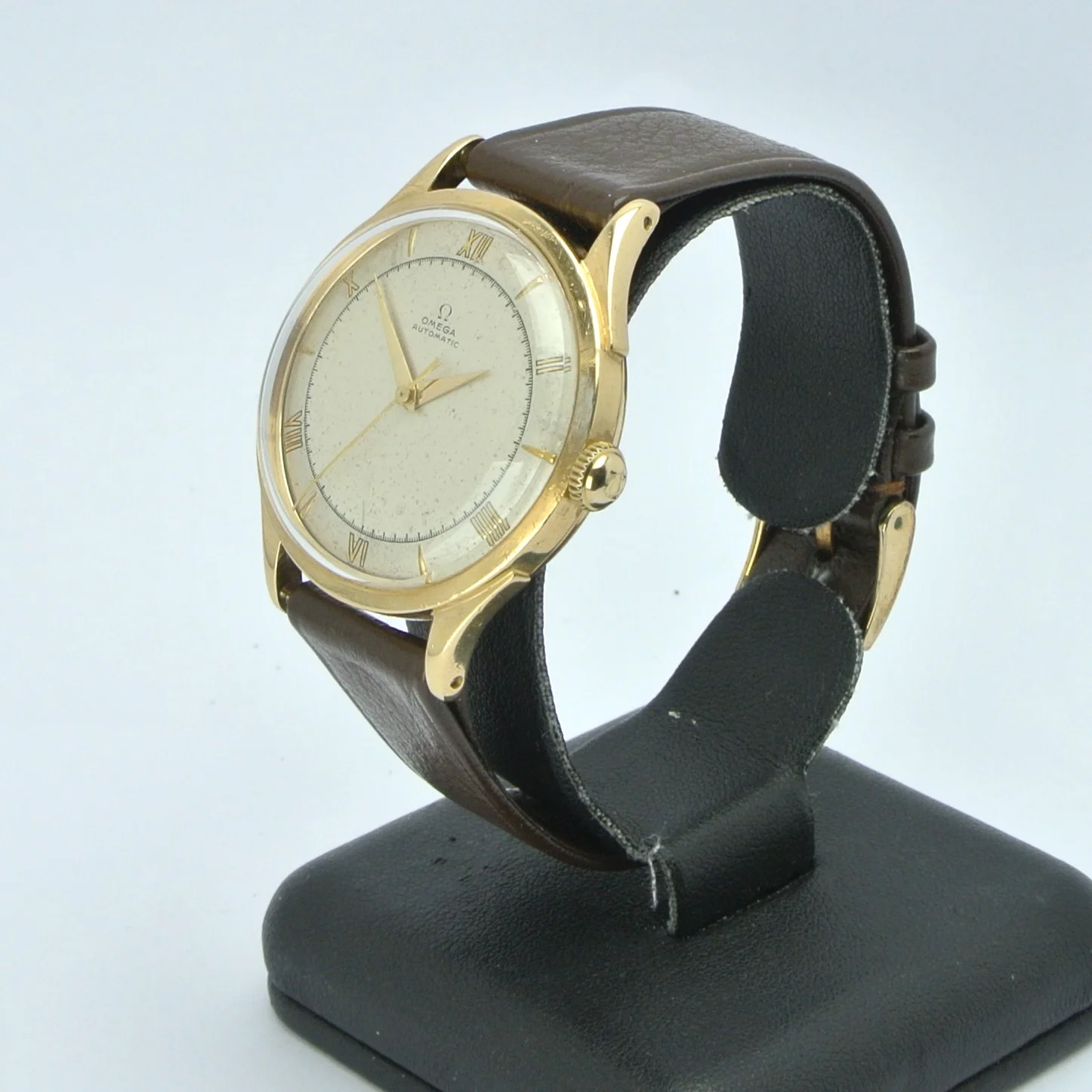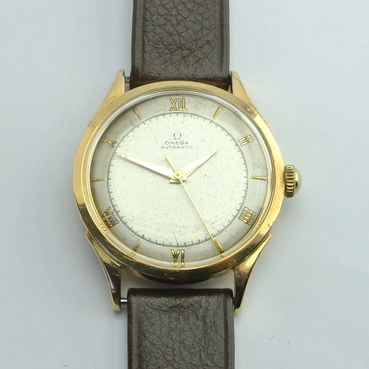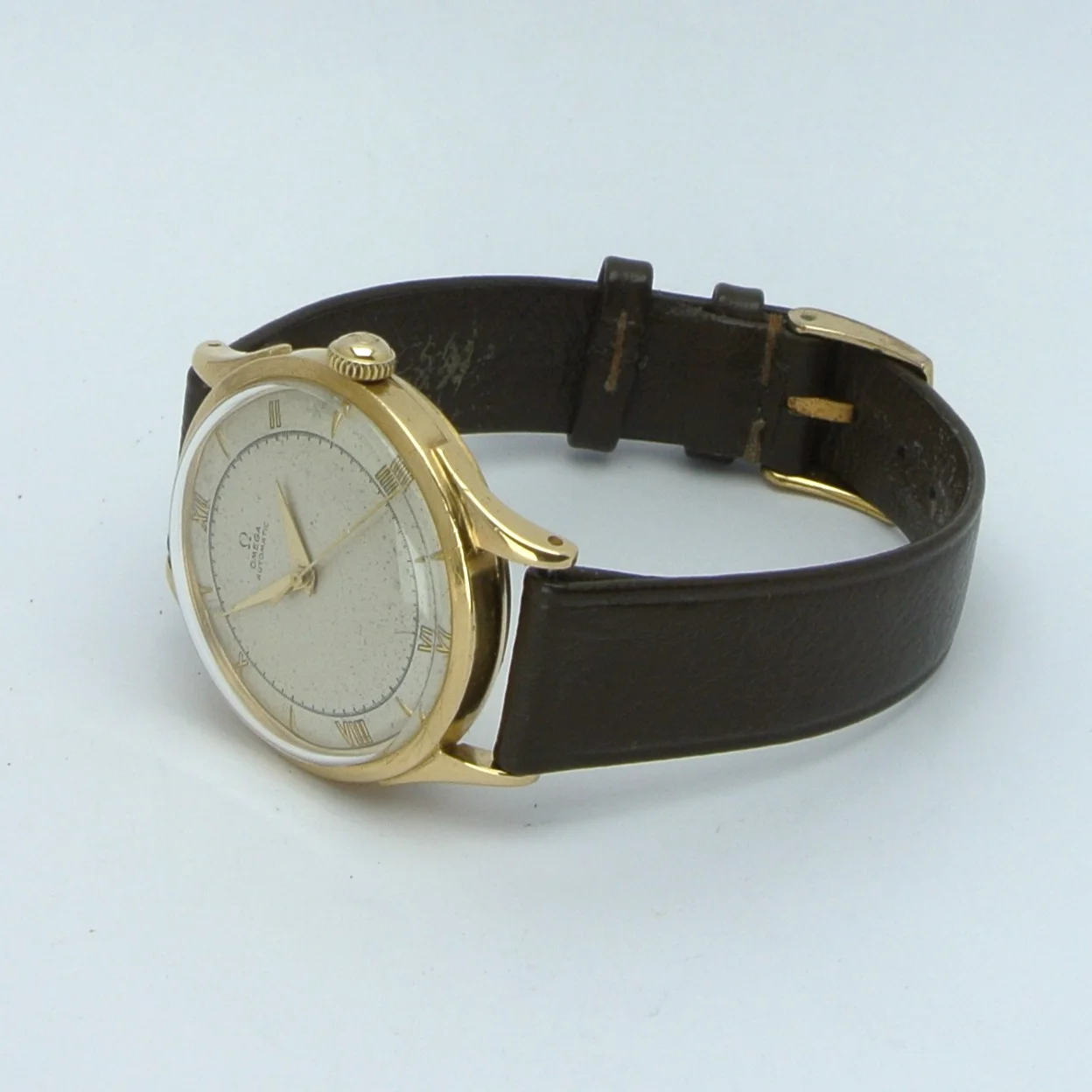 I'm a newbie when it comes to vintage watches, and I recently got my hands on an Omega Ref 2421. I'm excited to share some pictures of it with you! I'd really appreciate any help you could give me with a couple of questions. Do you know whether the crown (which seems gold-plated, compared to a 18k solid gold case) is original? I was just wondering, did Omega make solid gold watches with gold-plated crowns back in the 1940s, or is this a deviation from the original state?