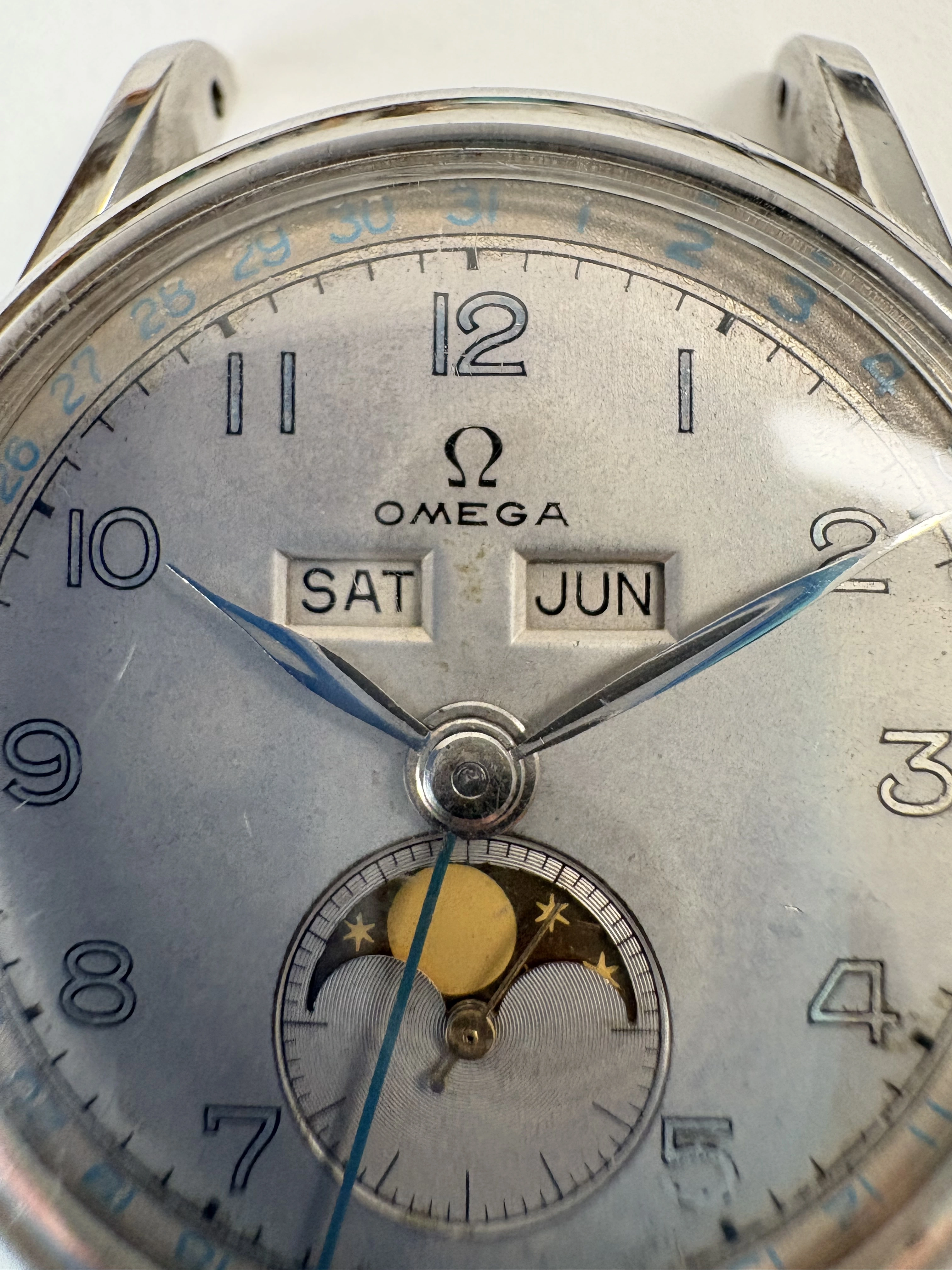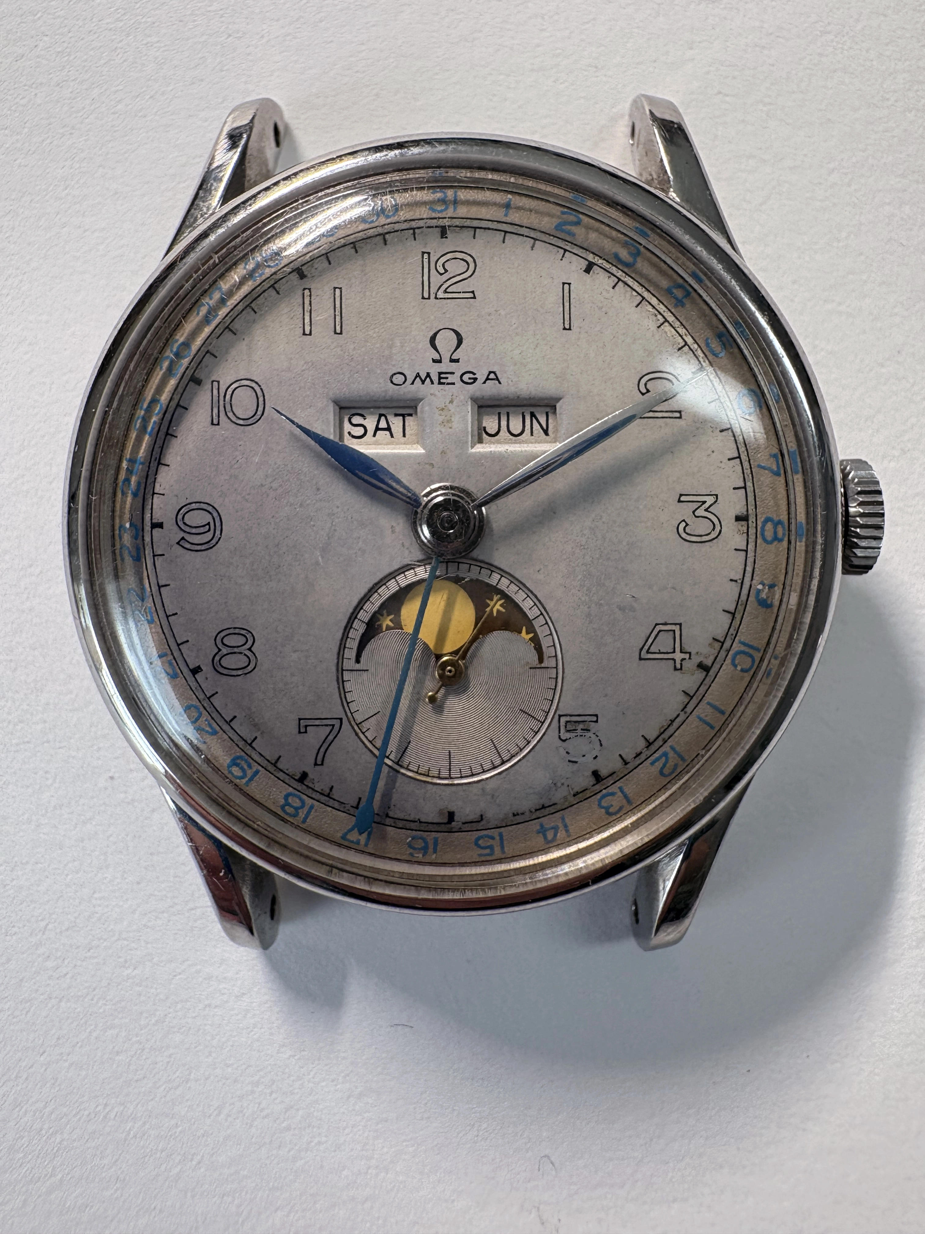 1. The moonphase is not functioning and the pusher is stuck in. I've had the moonphase repaired on 2 occasions. The last watchmaker that serviced it said they can no longer work on vintage Omegas due to the unavailability of parts.