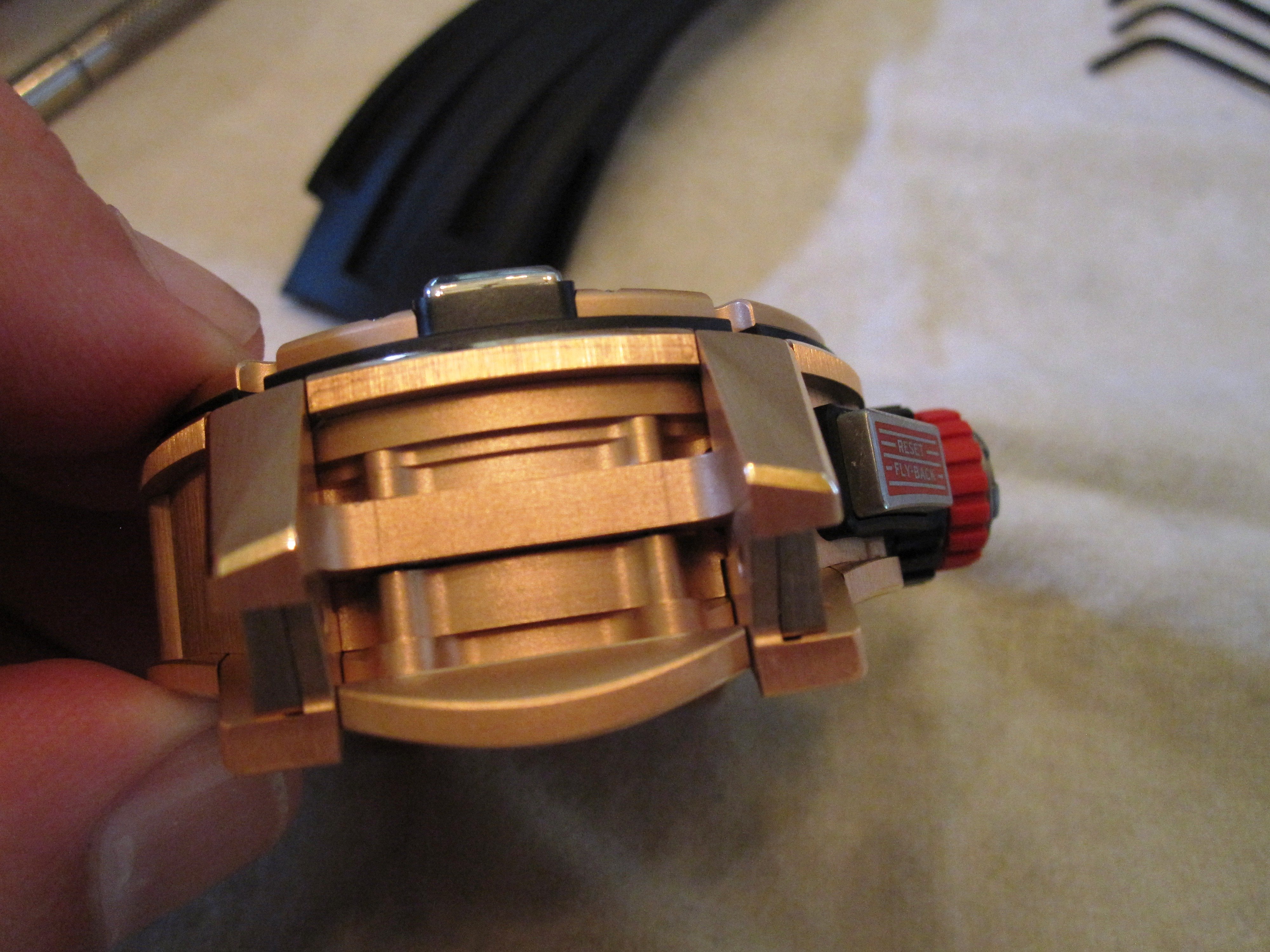 Here is my RM-11 in rose gold and titanium, flyback chrono, annual calendar. And my RM-028 in all gold, most intricately machined case I've ever seen, all perfectly finished and assembled. And if you have a problem with RM, take it up with Stallone.
