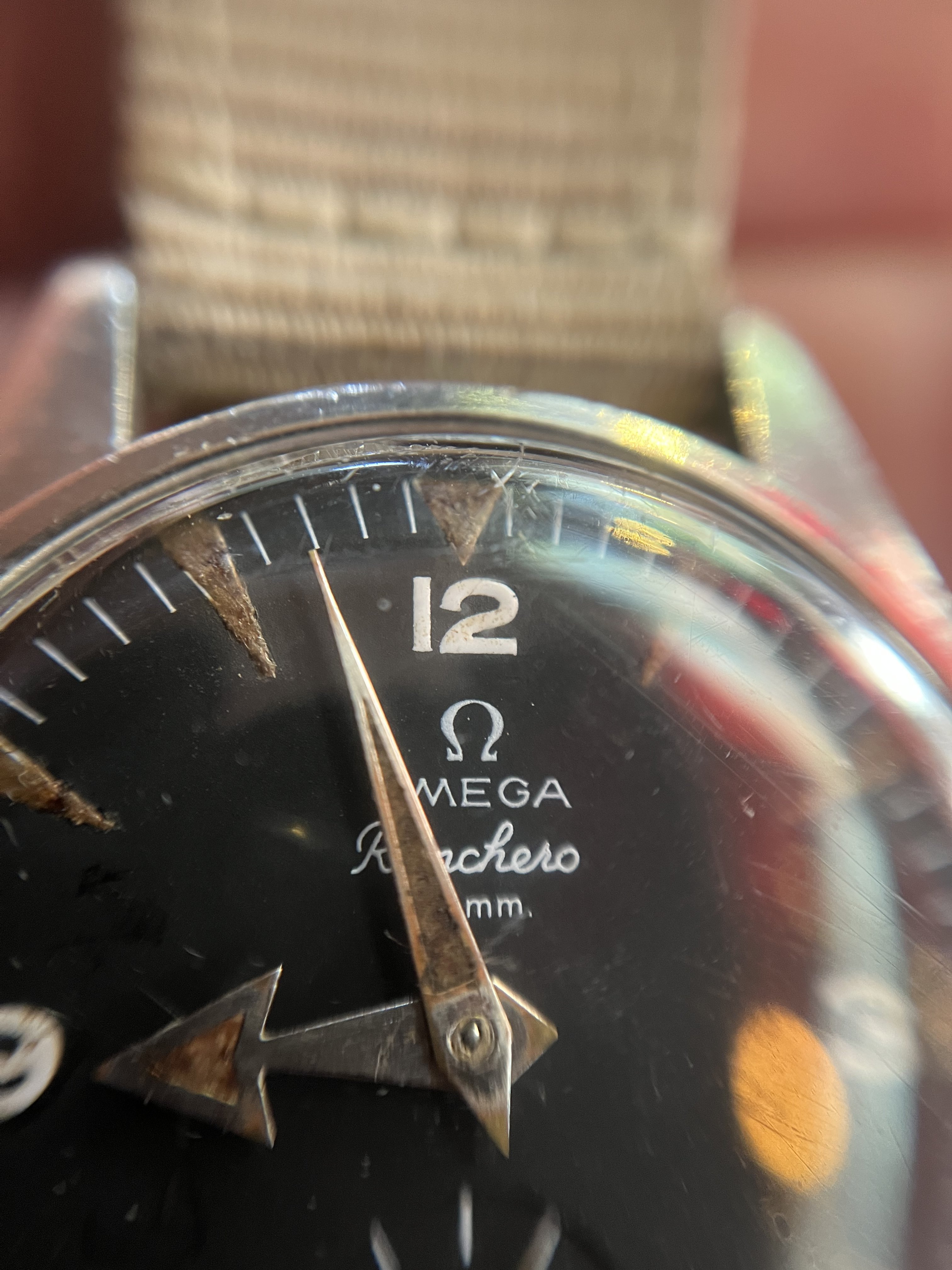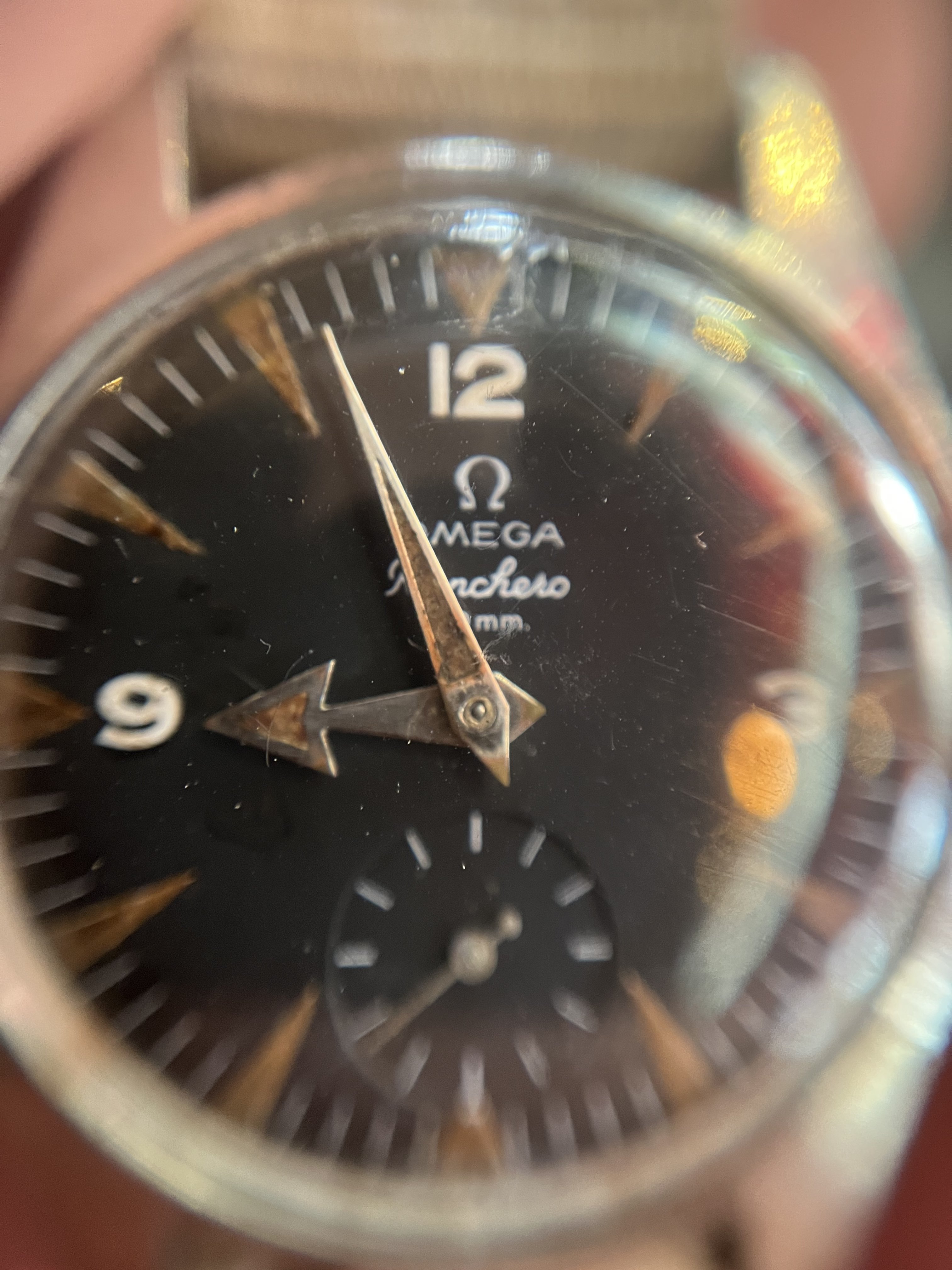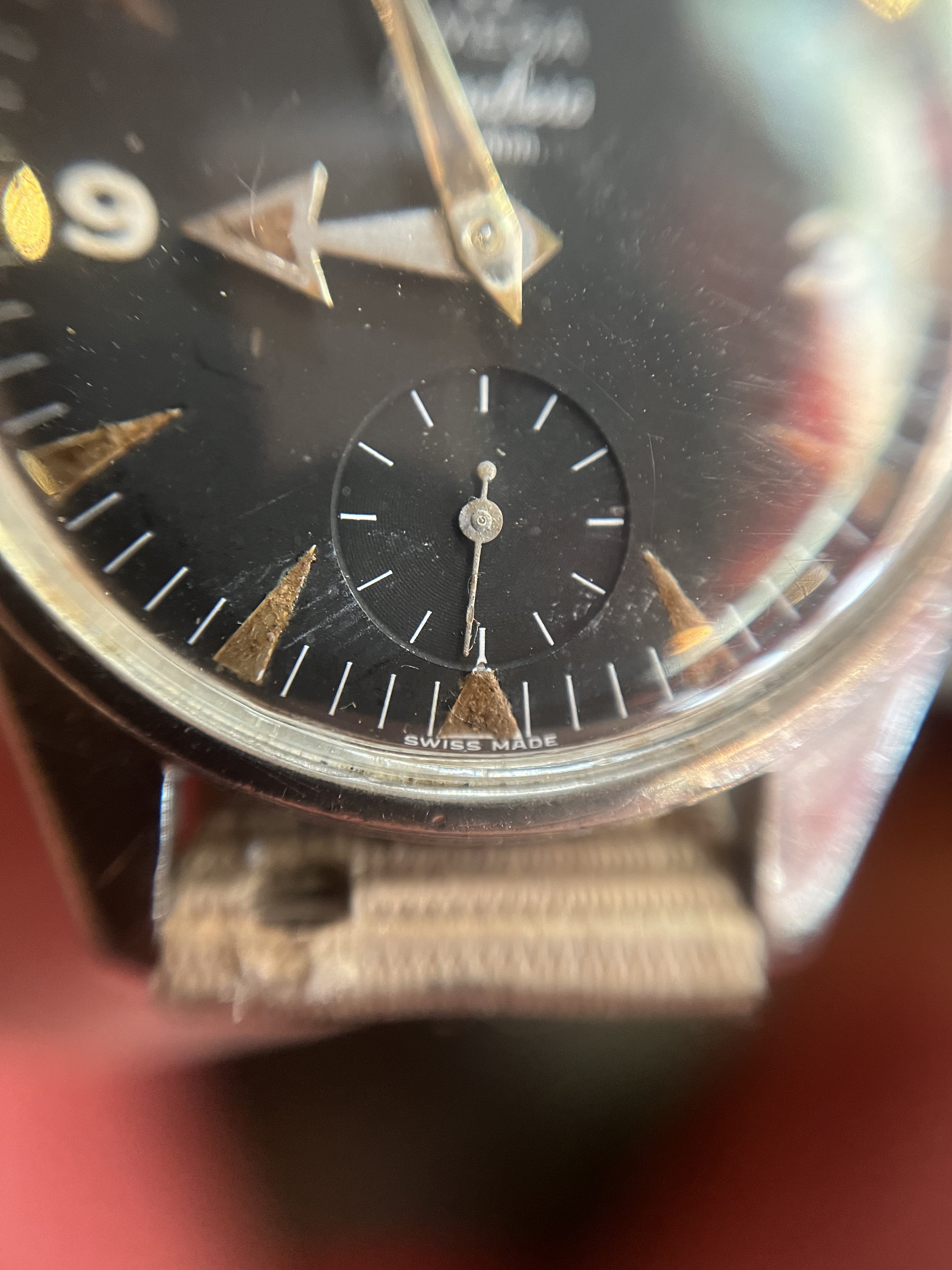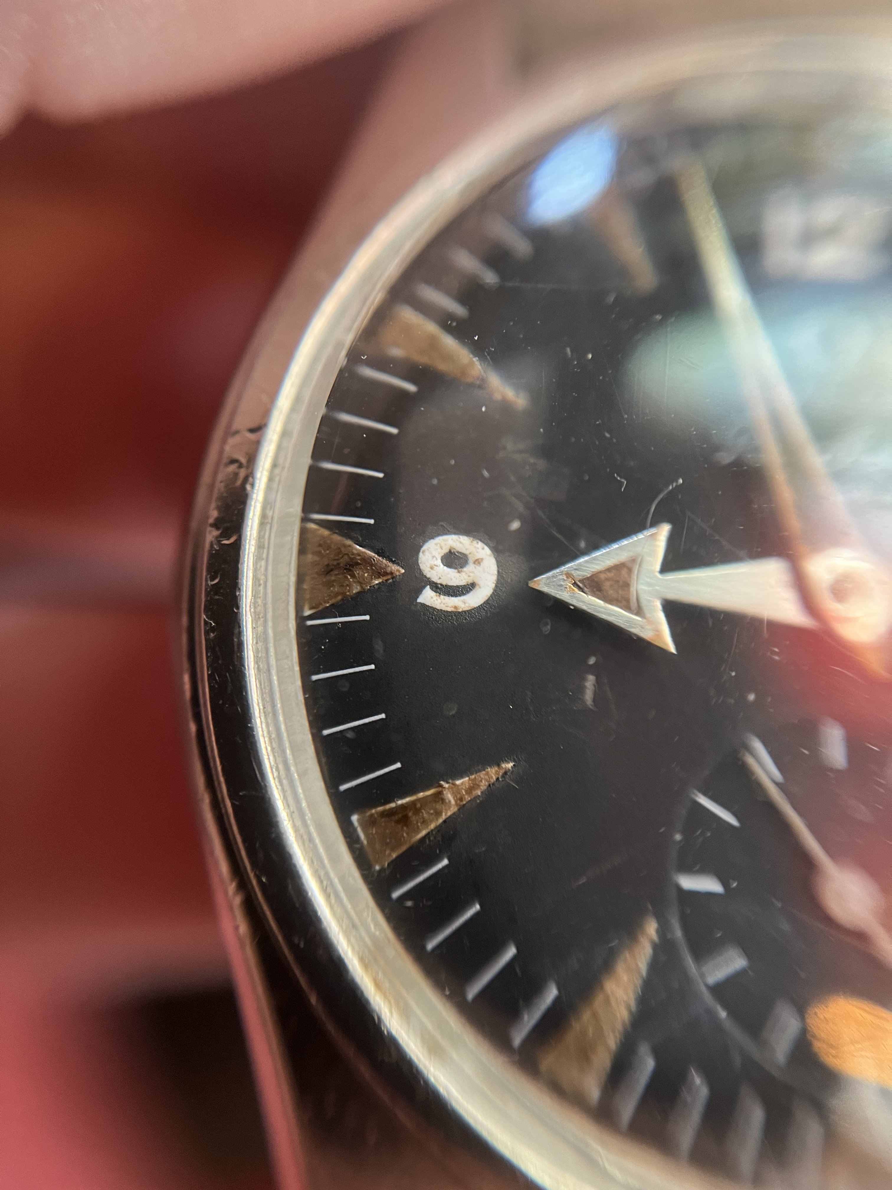It’s very patinated and has a nice « explorer » feeling of a real tool watch, the case looks unpolished to my eyes (and showing its life!). Some corrosion on the hands and dial.
