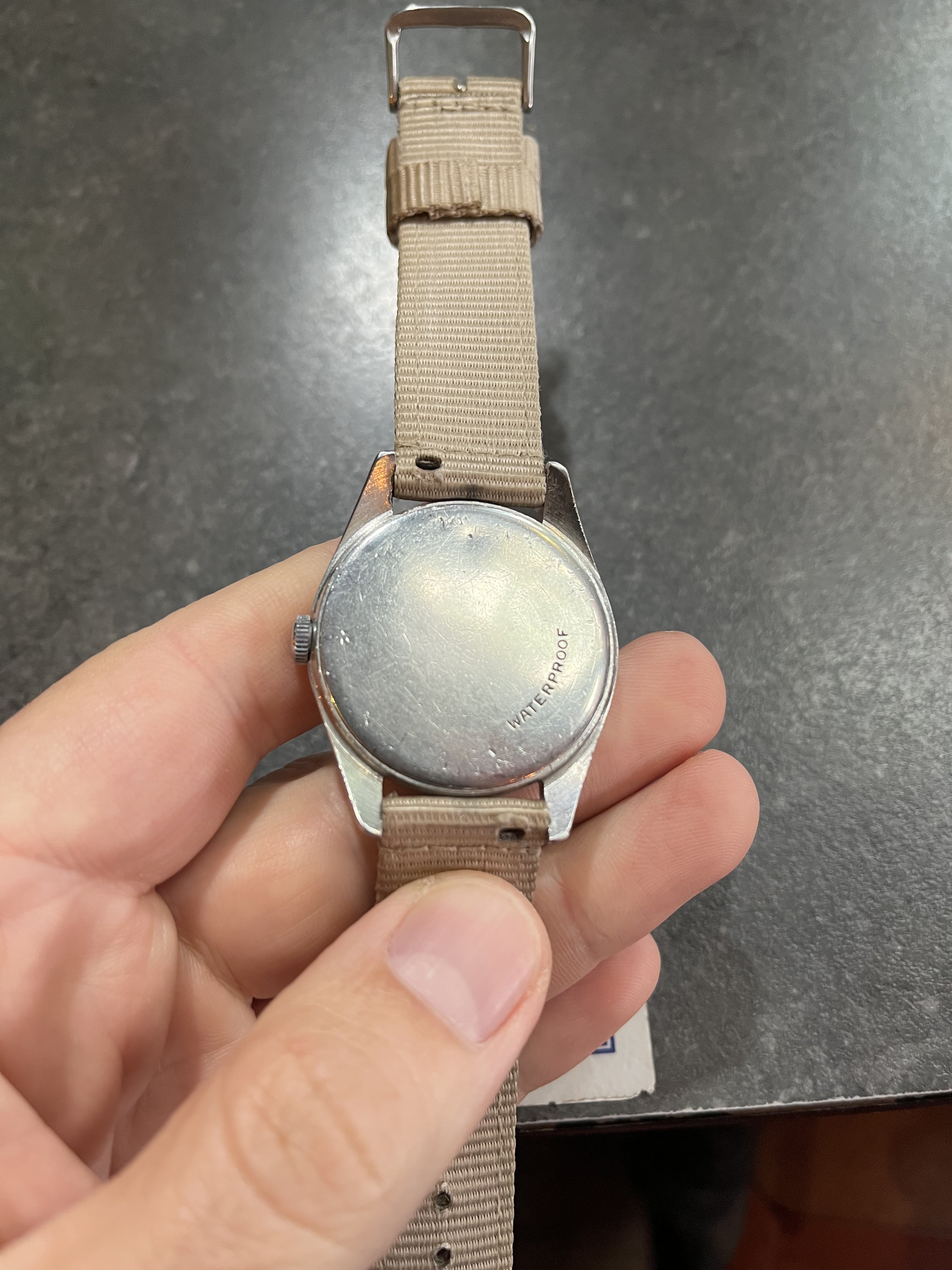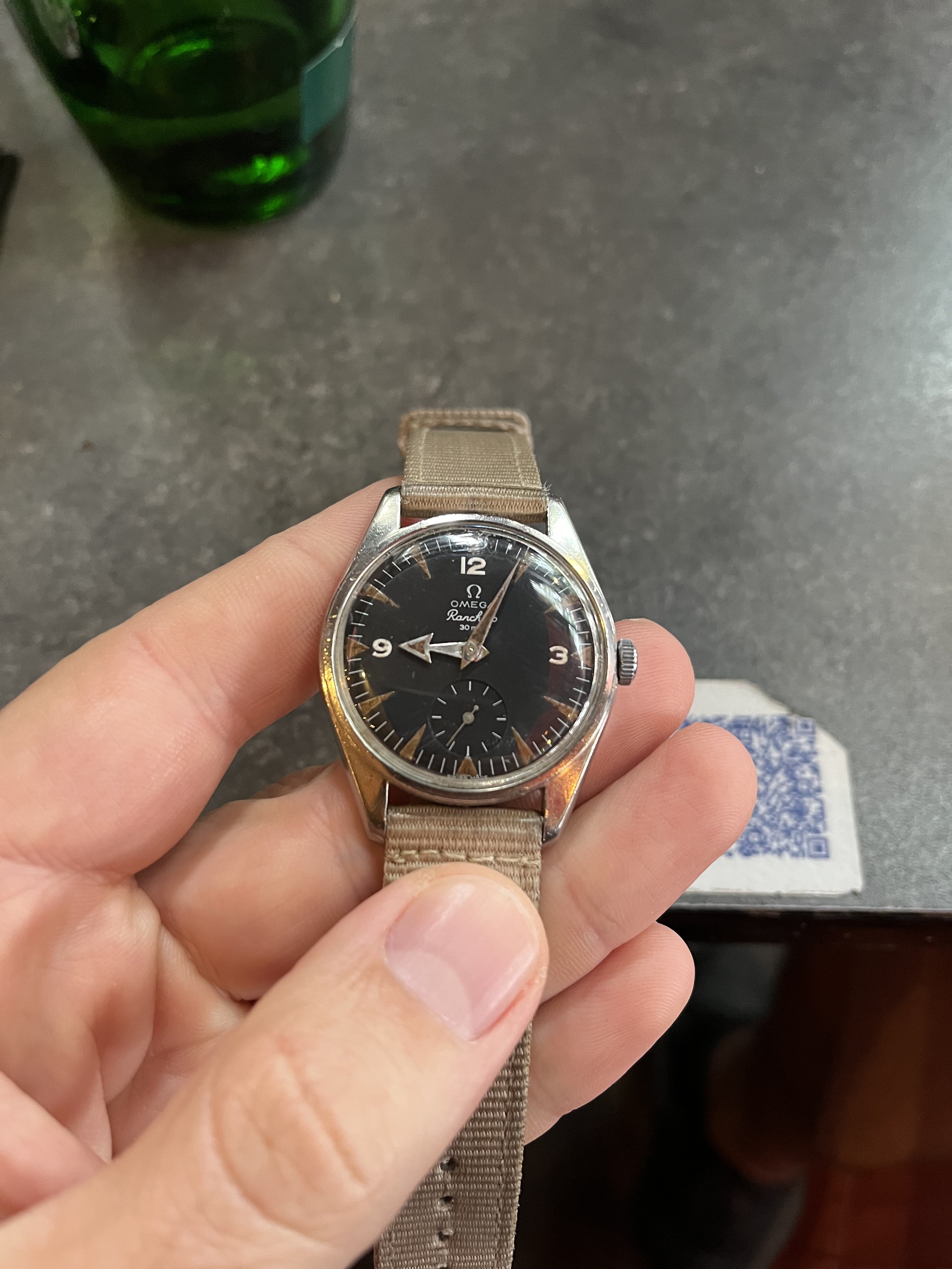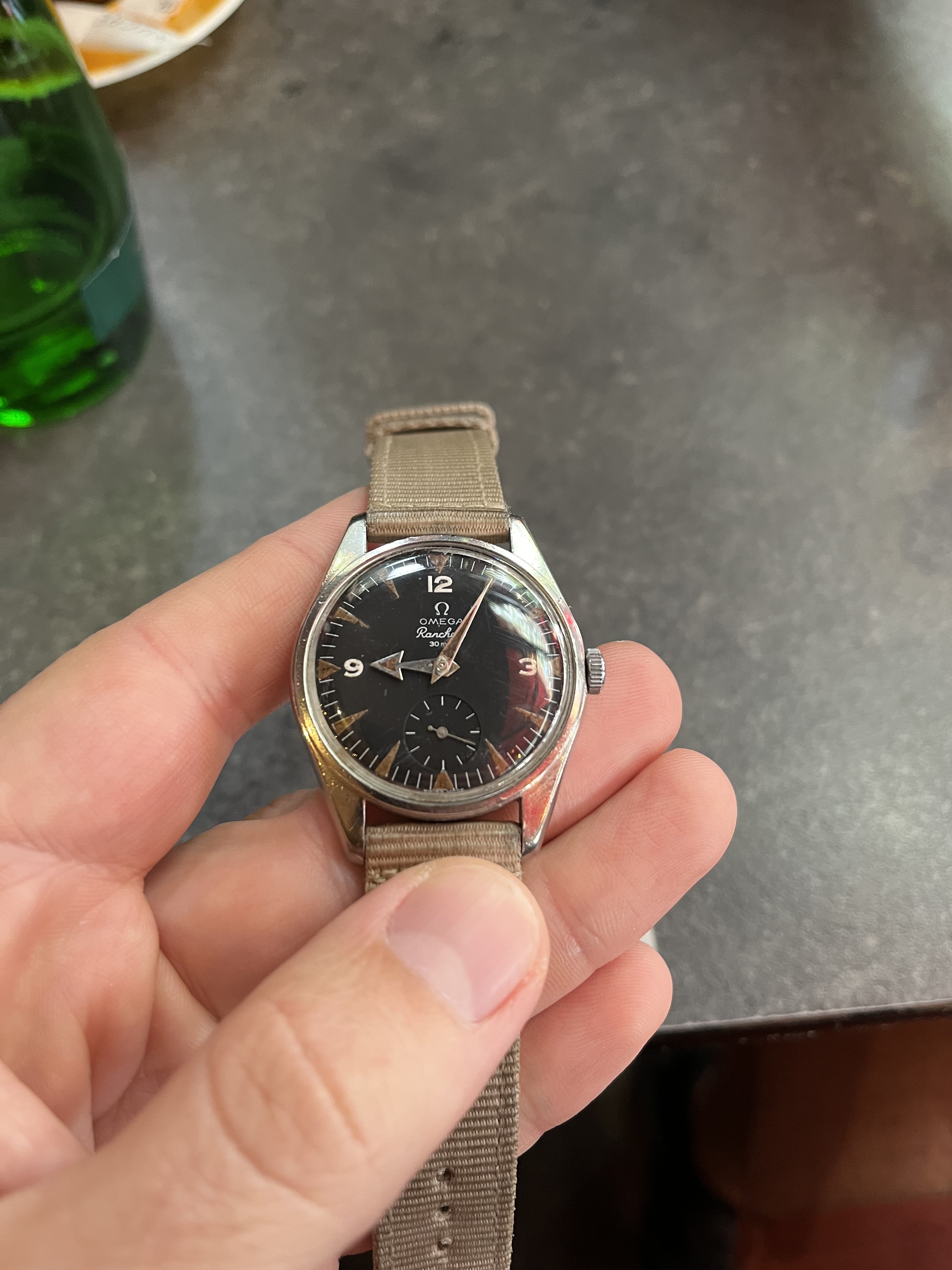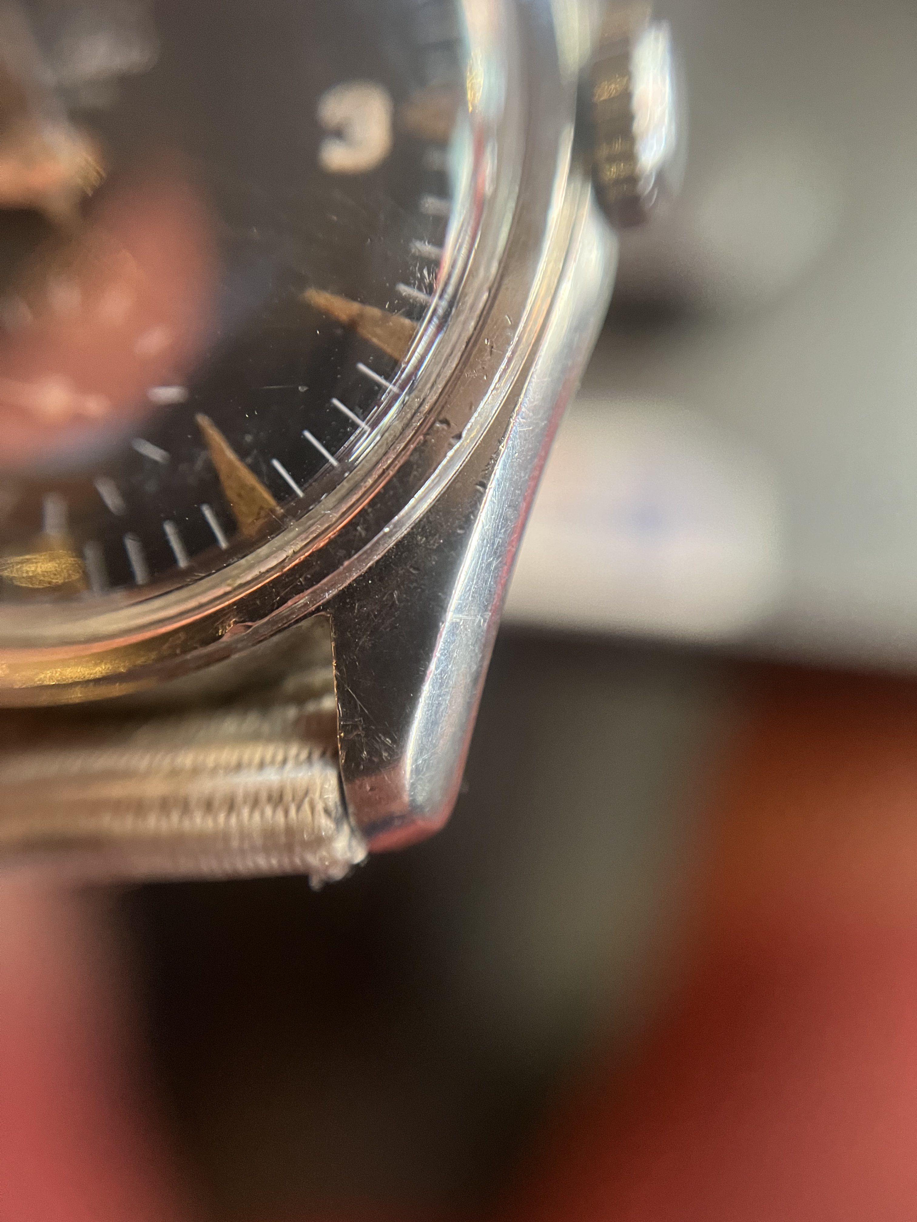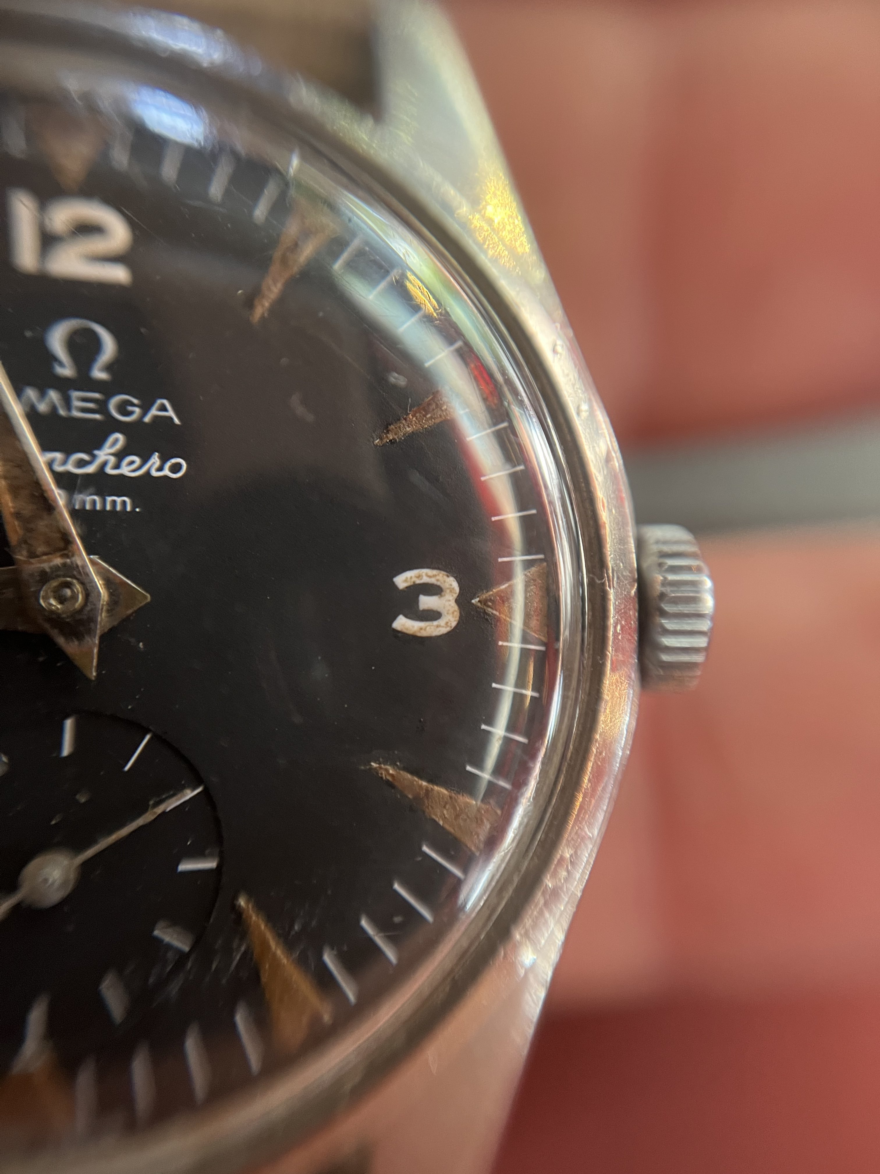 It’s very patinated and has a nice « explorer » feeling of a real tool watch, the case looks unpolished to my eyes (and showing its life!). Some corrosion on the hands and dial.