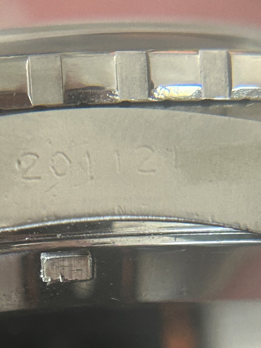 I cannot find a similar example of this dial & hand configuration, being white hands, orange chrono sweep, no colour on the hour plots, a well wrist polished KAF 441 on the case back and a serial of 201 101 between the lugs.
