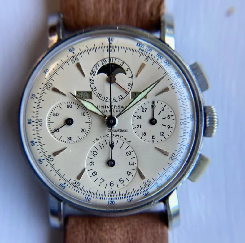 Pretty new to UG. And yes, even to my novice eye it looks like a redone dial. I also believe the crown is a later replacement. I also could not find another example of this hands/hour markers combination.