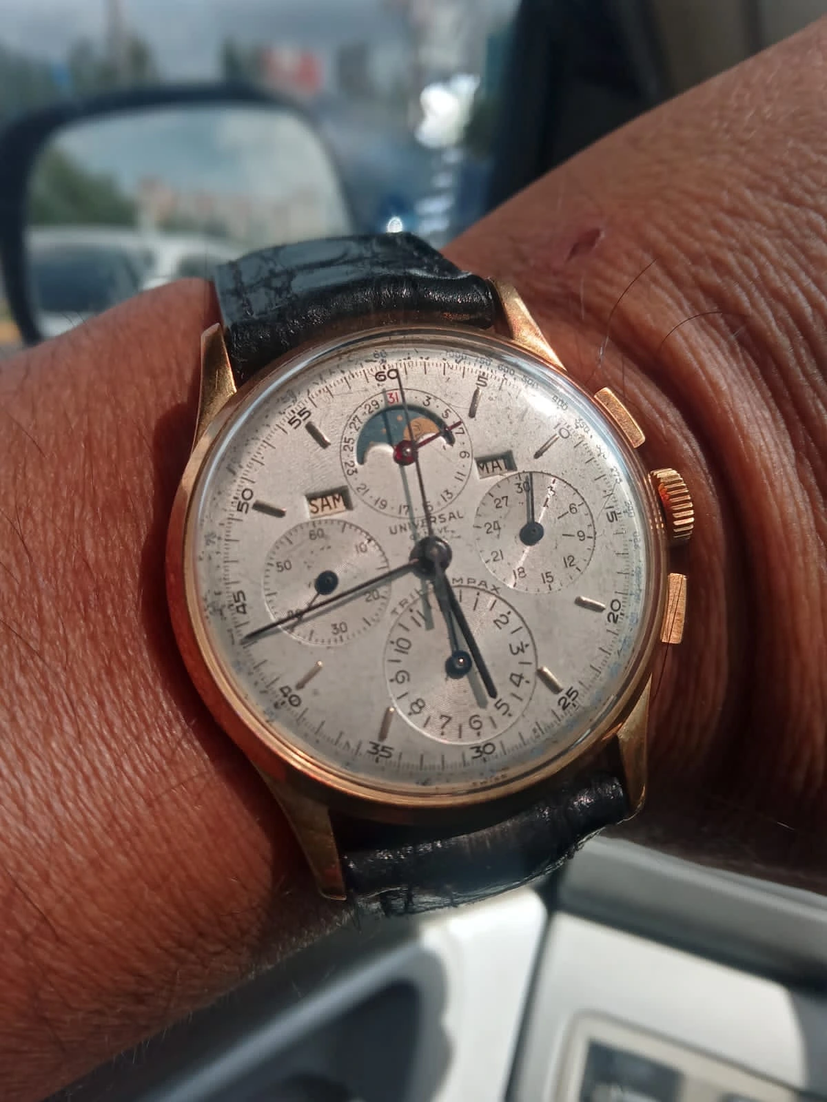 I’m new to this forum and would like to thank in advance for your time looking at these pictures. I’m interested in purchasing this UG tri-compax in 18k gold. I’m extremely unfamiliar with it but I find the watch very fascinating. I noticed one of the pushers (middle one) is not correct. I would also like to apologize in advance for the horrible pictures provided.
