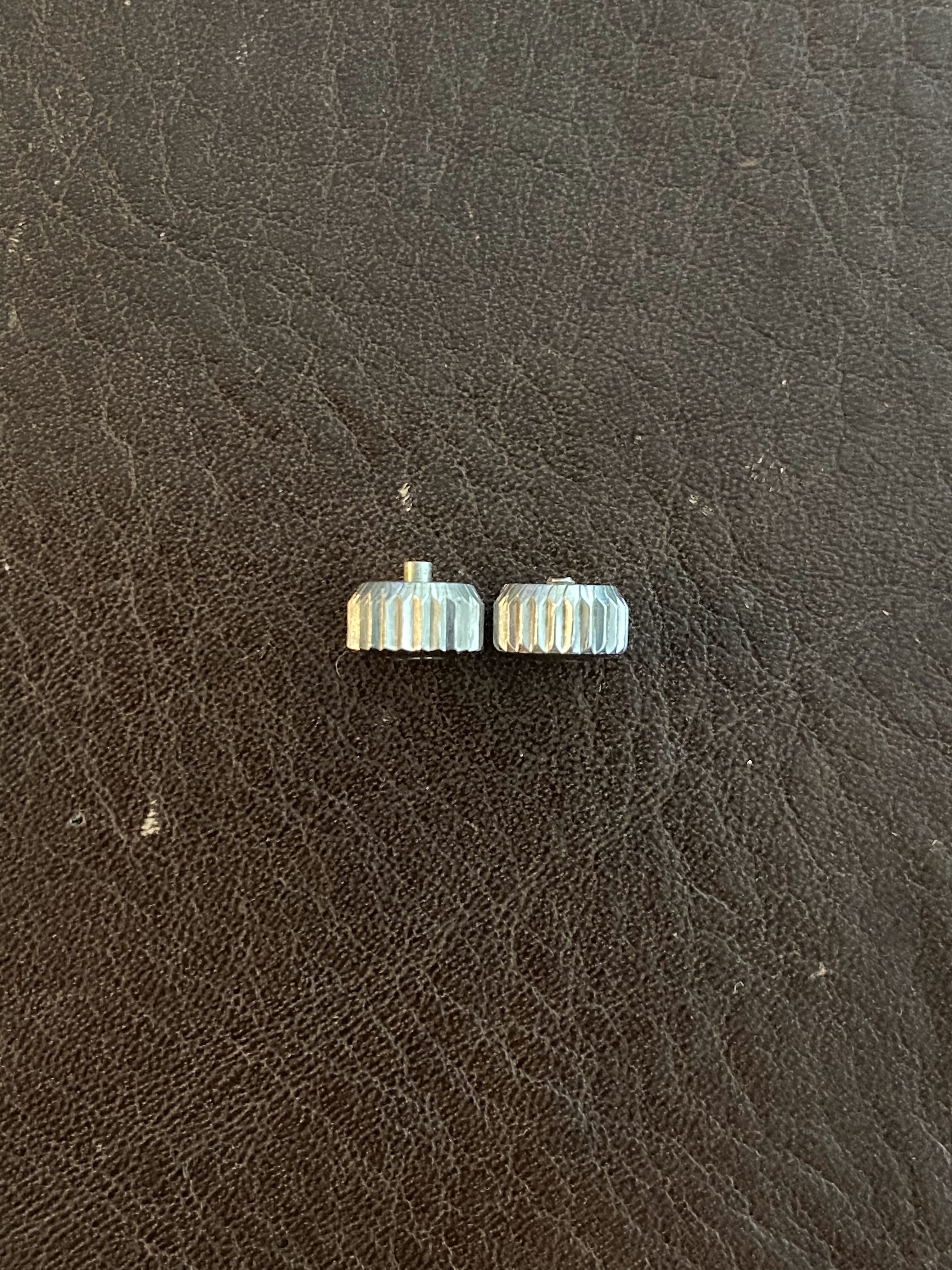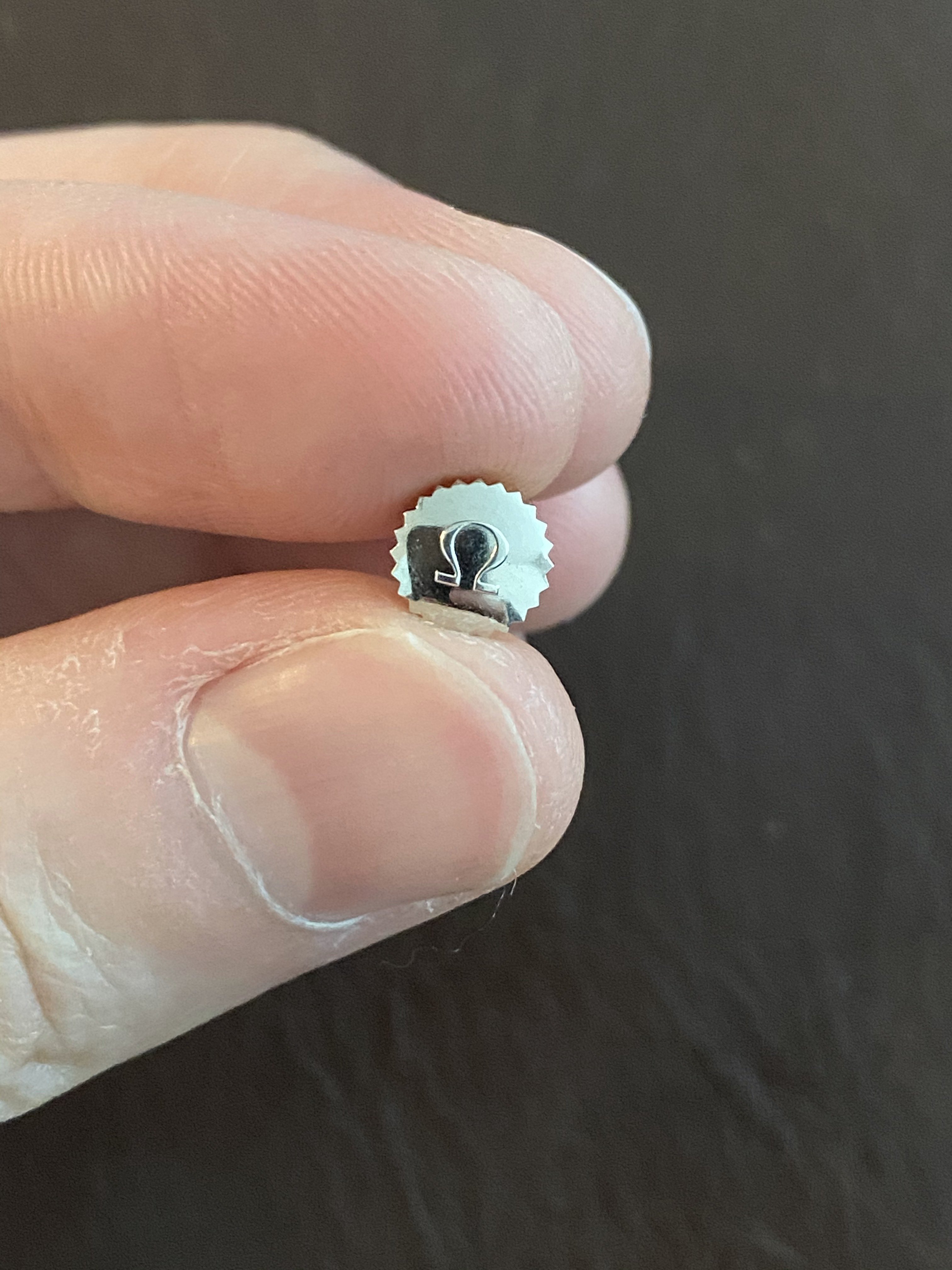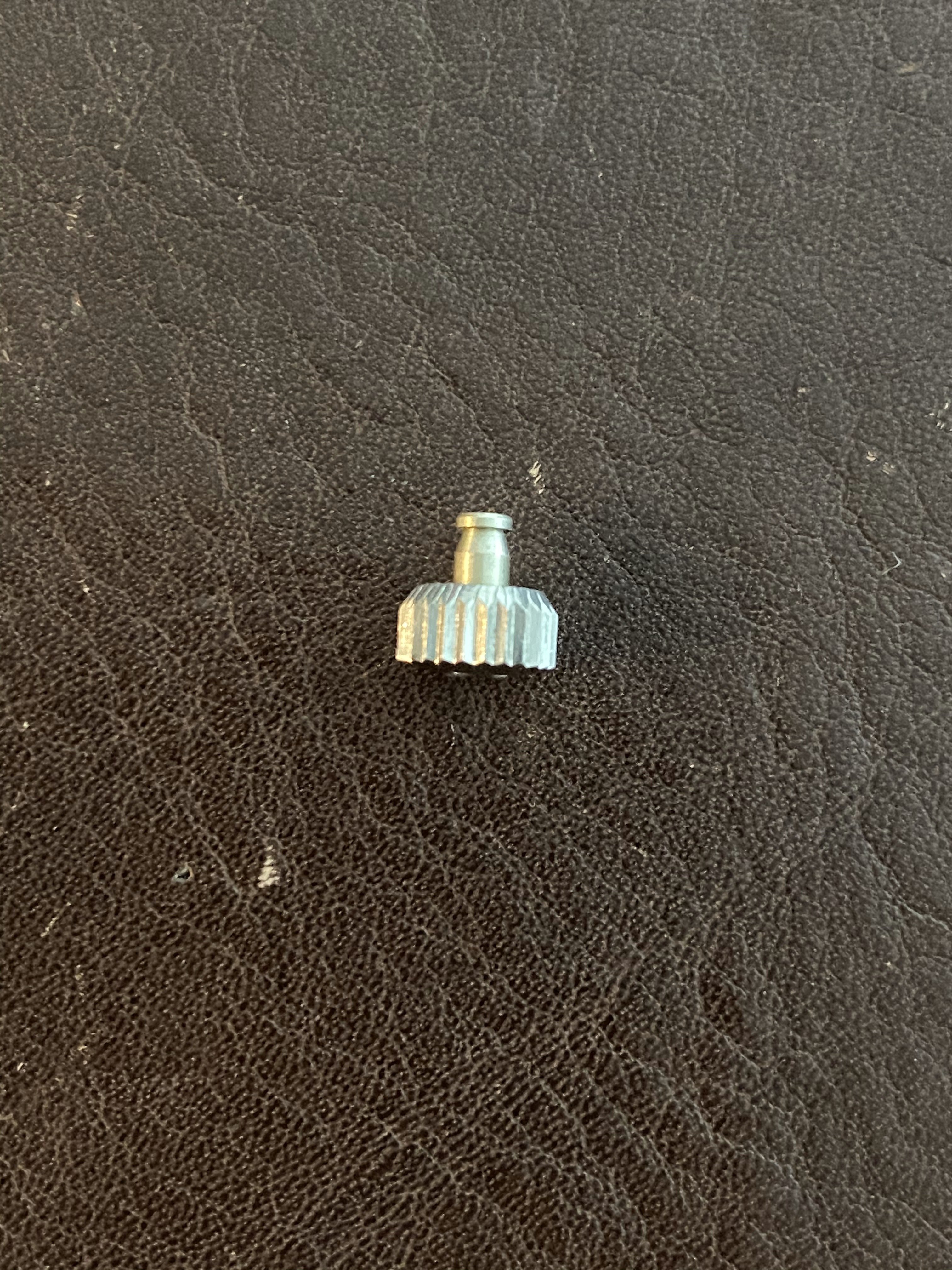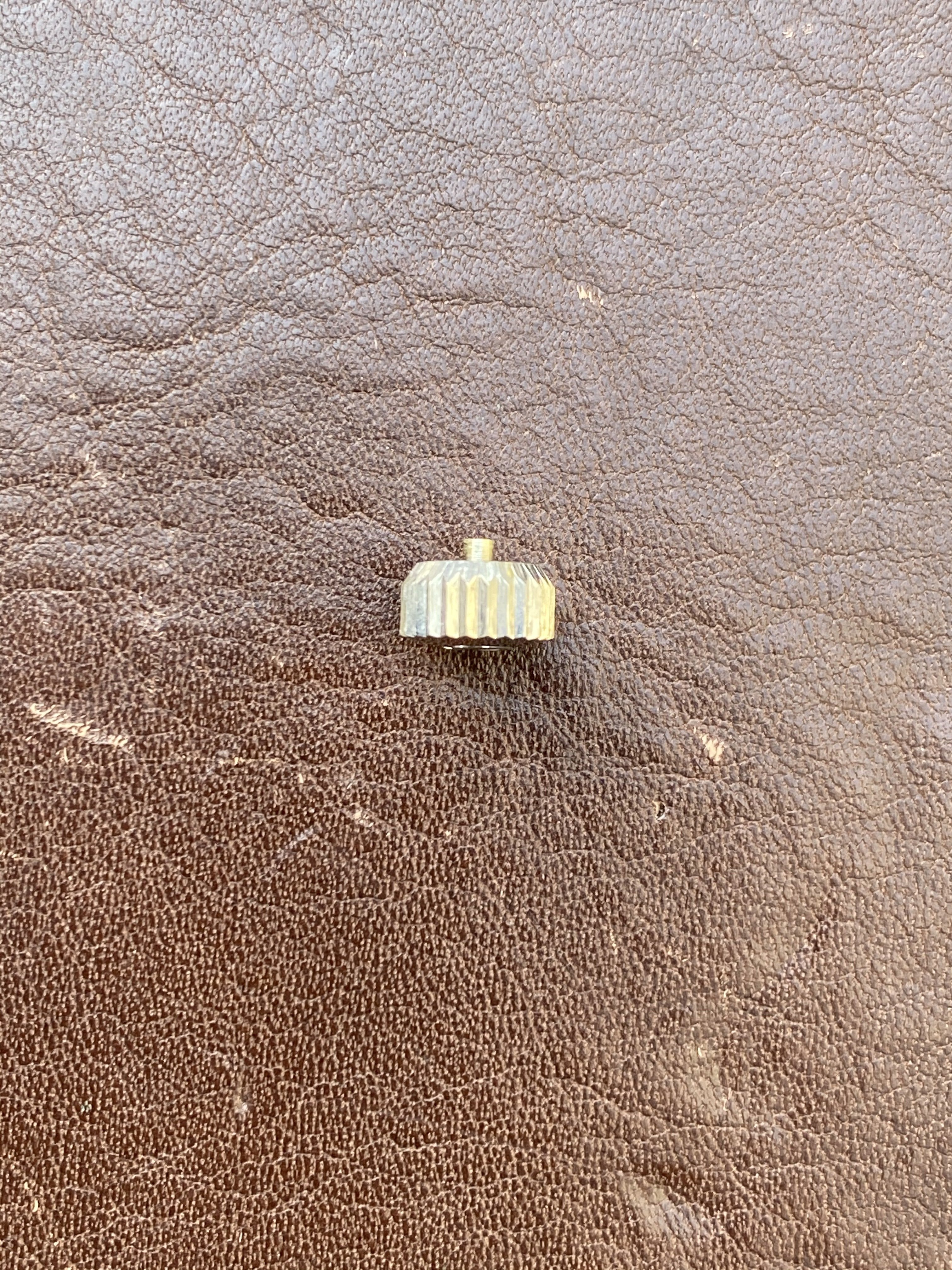 I believe this is referred to an A1 Speedmaster crown, correct for 321 Speedmaster references. Dimensions are 6.8mm diameter x 3.8mm thickness (4.9mm including protruding tube) and it has a 1.0 mm stem size. Crown is in very nice condition. The tube pictured was installed on it when I received it, and I've seen NOS crowns with a similar tube installed, so it's possible this is NOS. However, I received it in a crown lot so I can't confirm this. Asking $550.