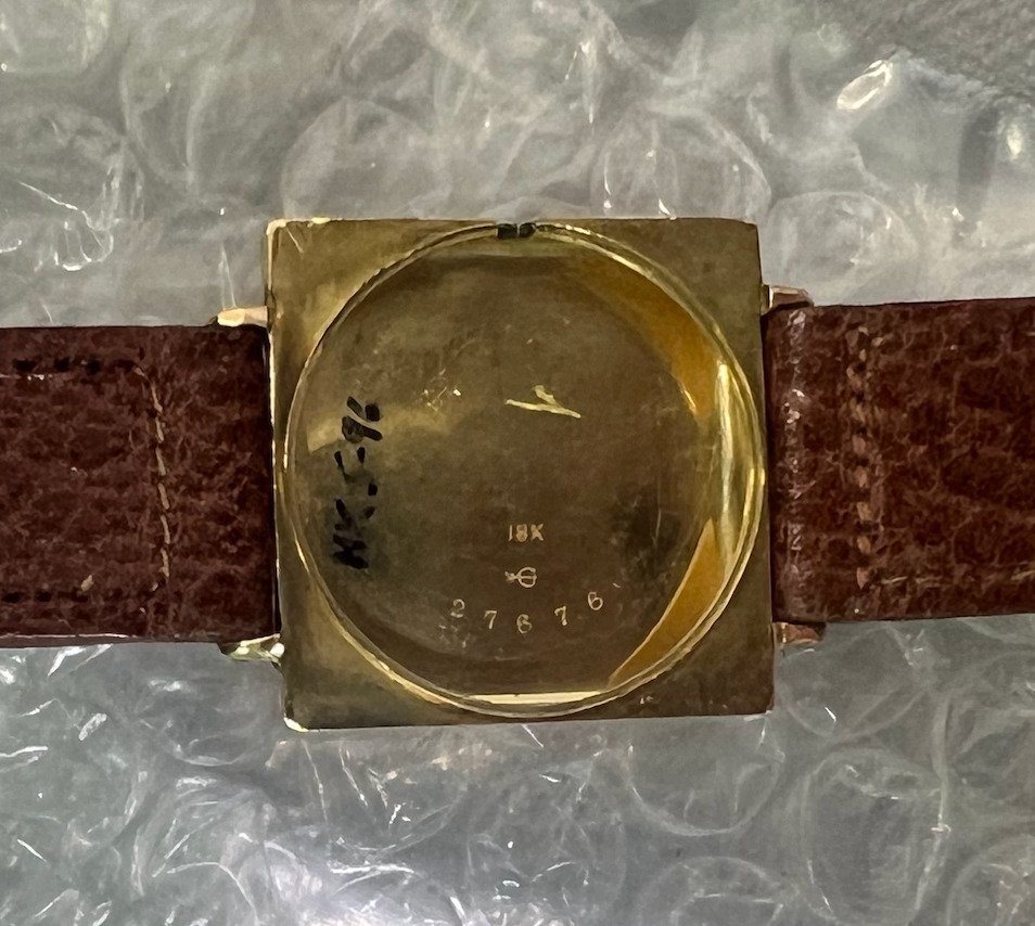 The movement is an IWC cal. 75, 10´´, which was the first wrist watch movement produced by IWC. The cal. 75 was intended for women´s watches in round cases and for men in square cases. The case bears the Cresarrow trademark and was made by Henry Blank & Co., USA. In 1912 Henry Blank had journeyed to Europe to conduct dealings with IWC, among others. He returned to the USA on board of the Titanic and survived. His firm was a supplier to Tiffany, including watches. These historical details match the date of the movement.