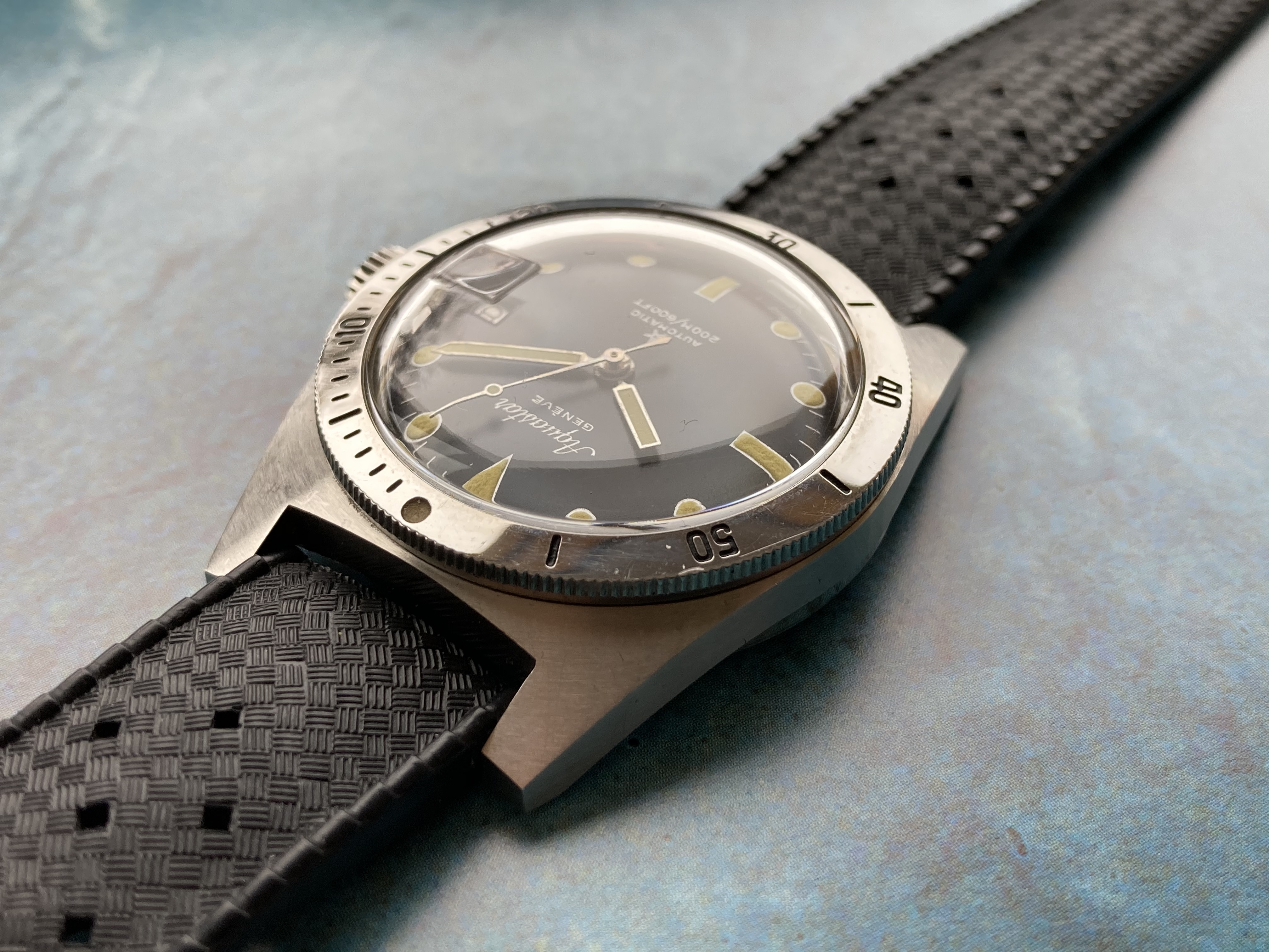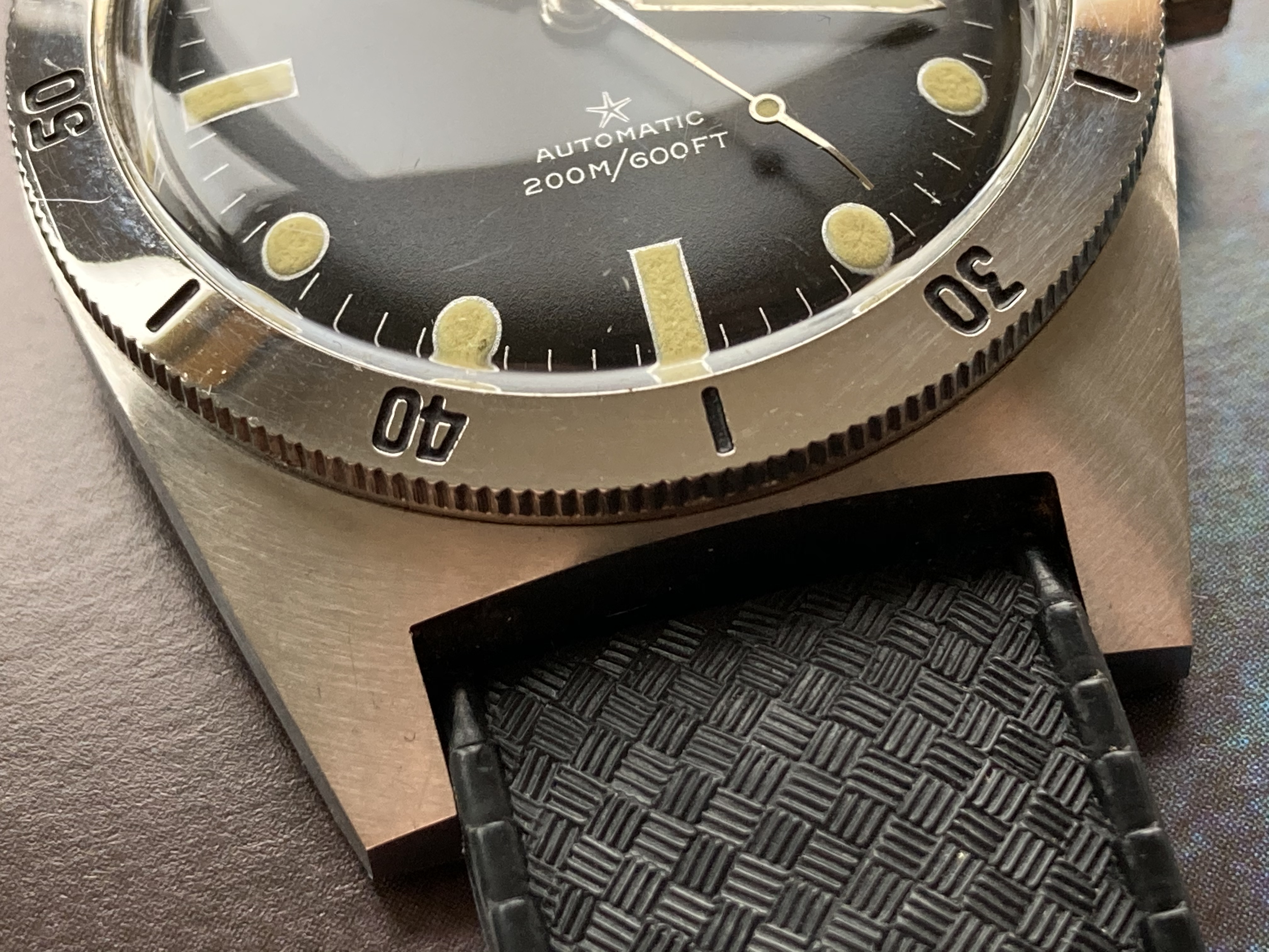 Overall great condition with light marks of use (not really wear as it was a demo item). Super sharp case. Superb and intact tritium, beautiful light patina. Signed caseback and crown. Rotating bezel. Vintage Tropic diver strap.