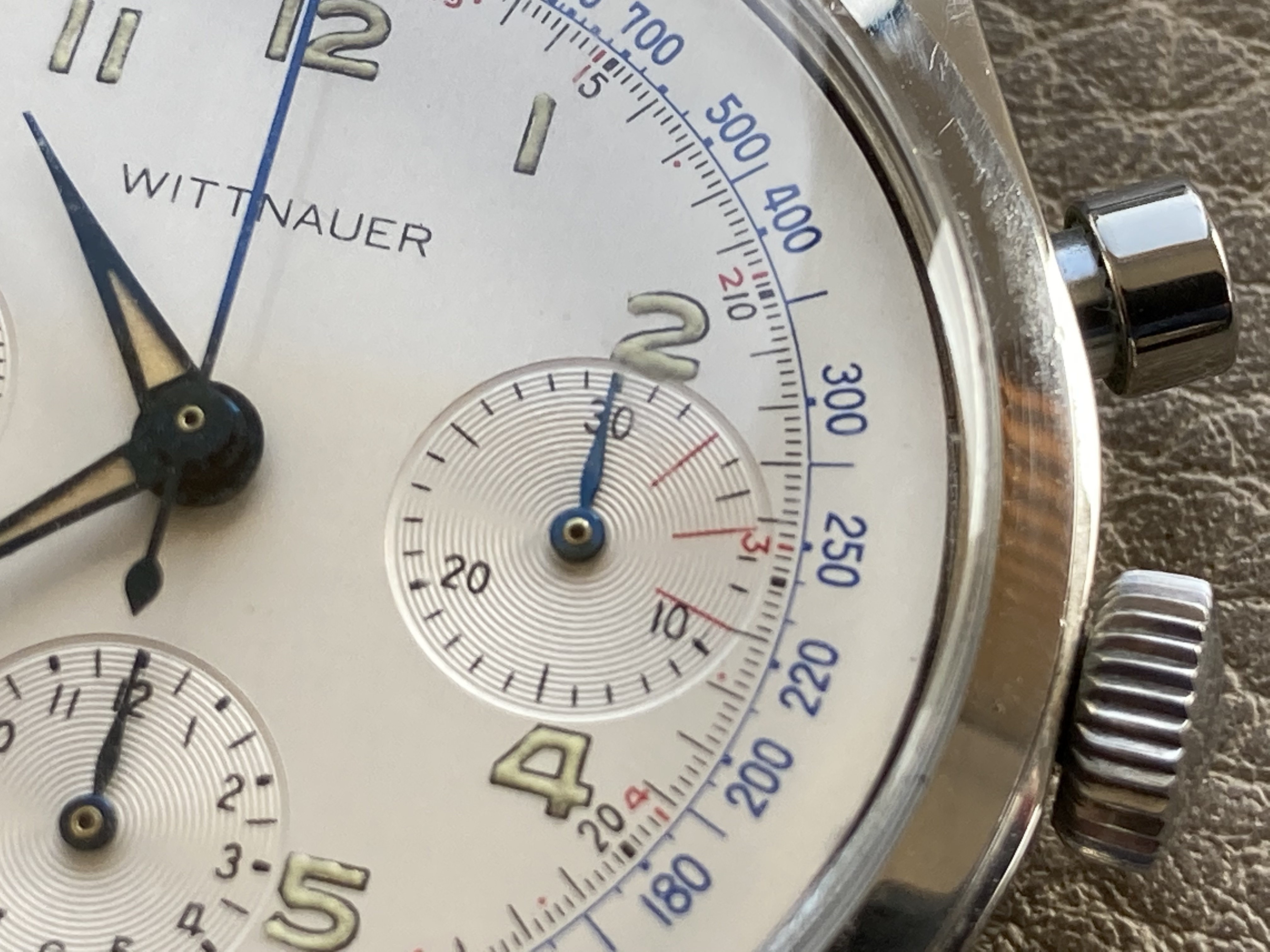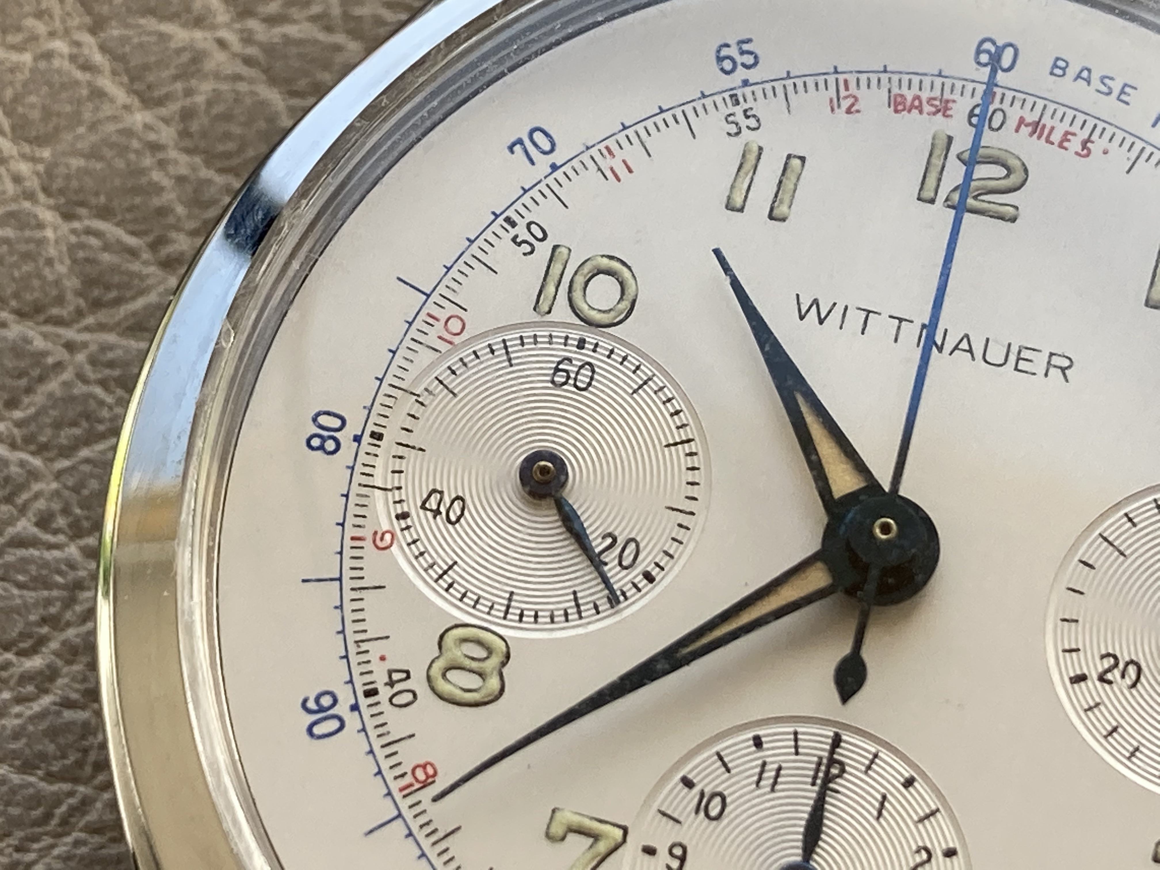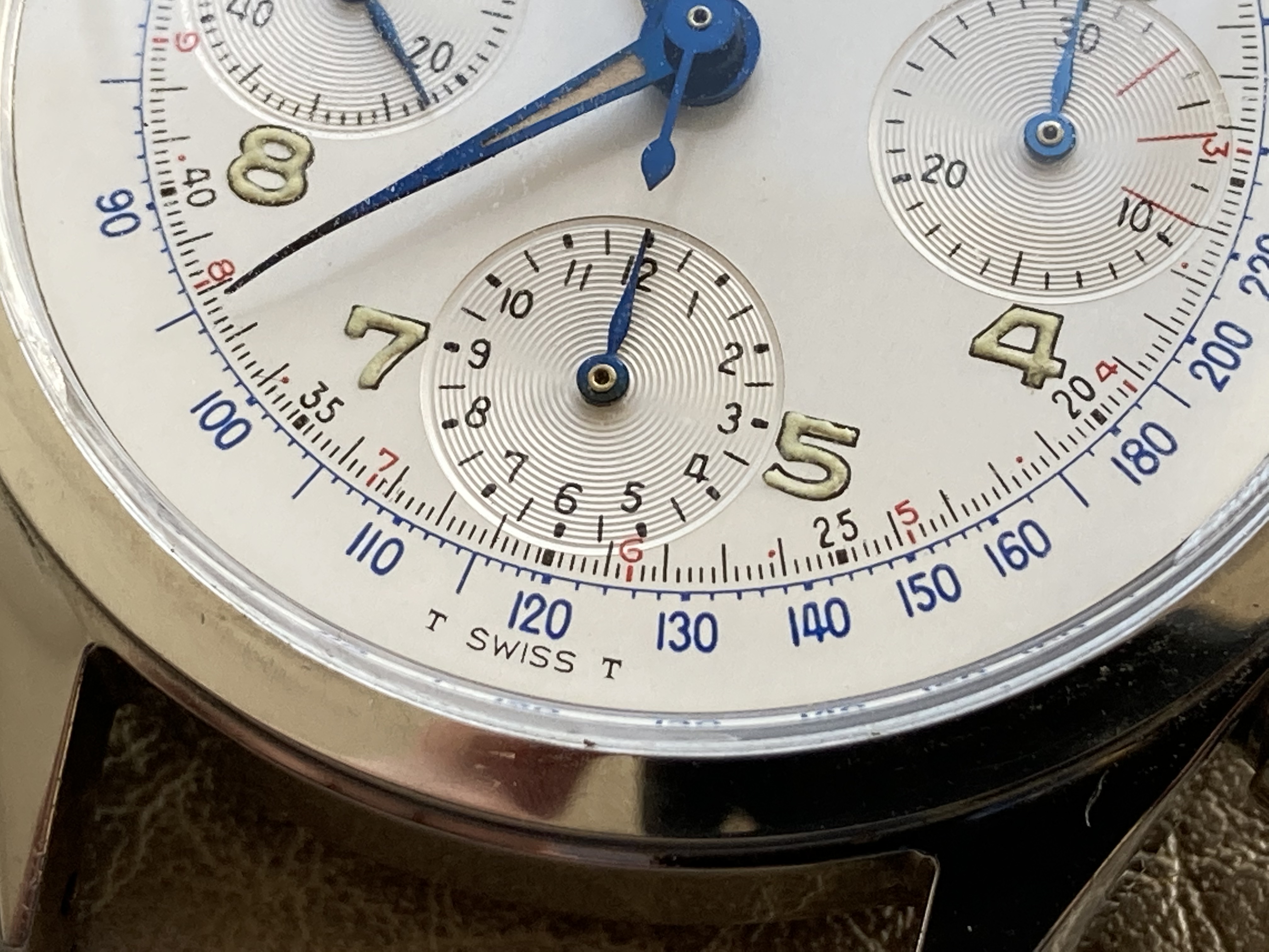 The dial is amazing. It is simply perfect. Vivid colors and wonderful lume. The blue hour and minute hands are superb, luminous material on the hands and numerals original and still intact. Behaves as should under UV light : glows and fades quickly.