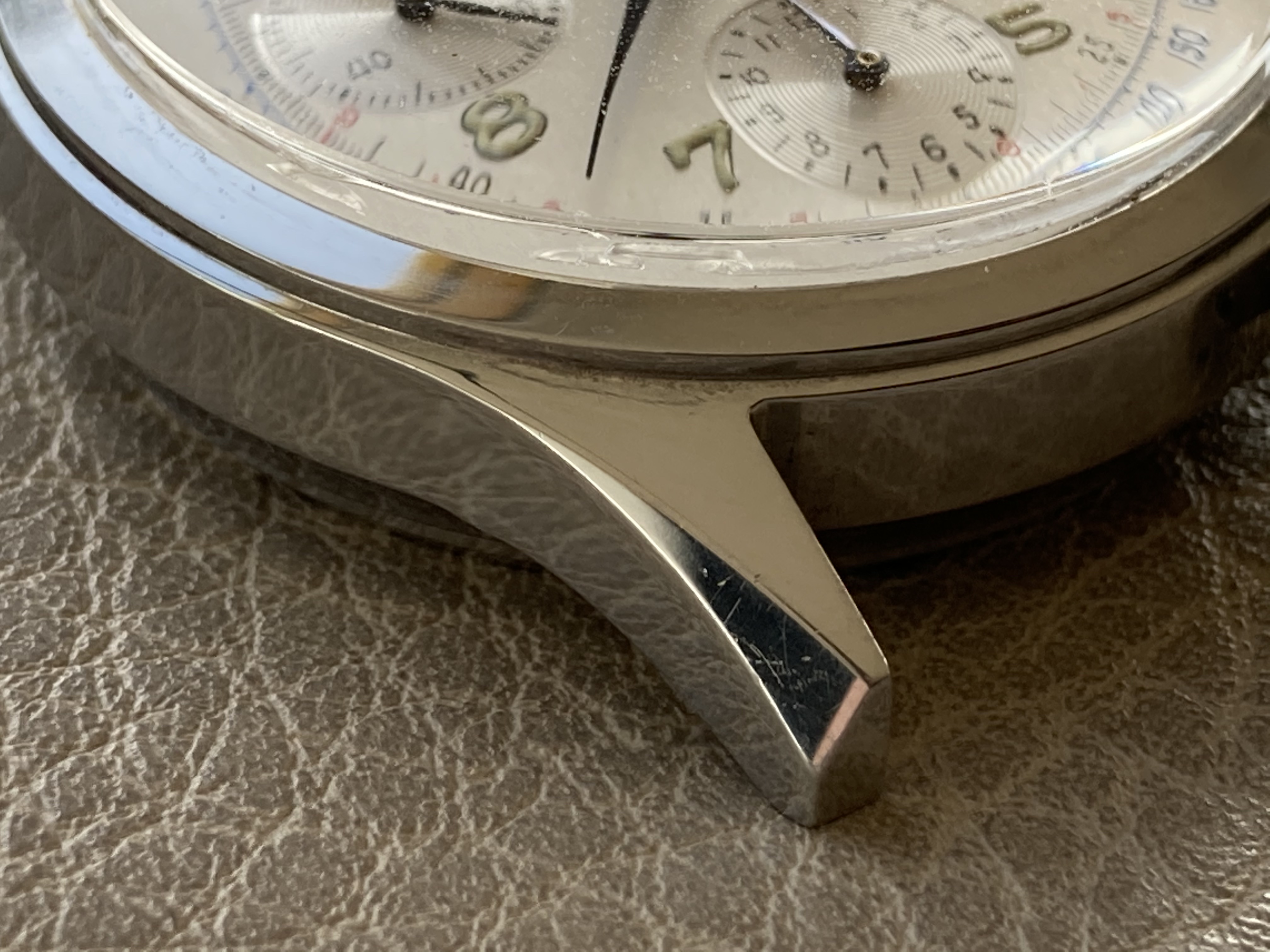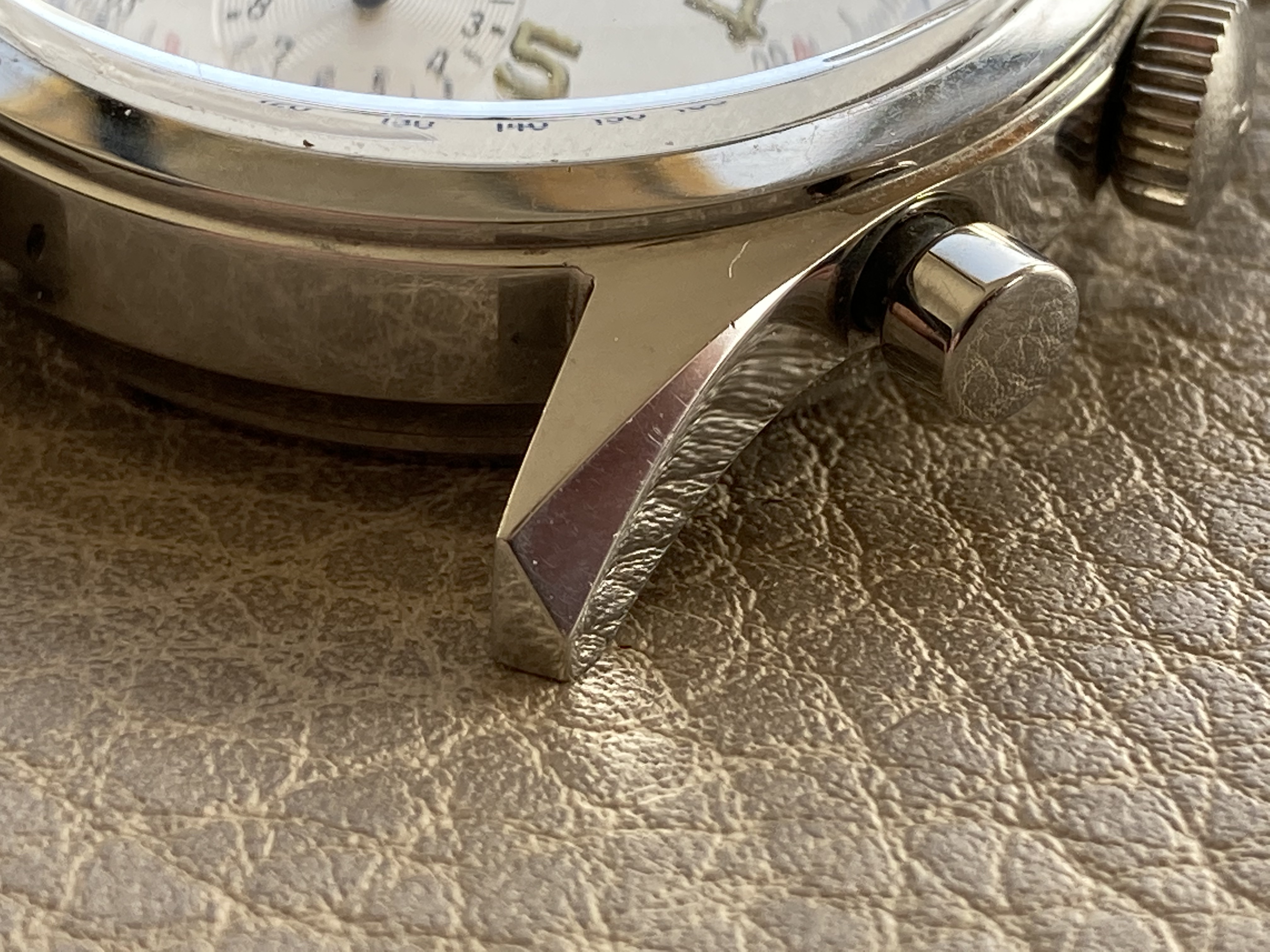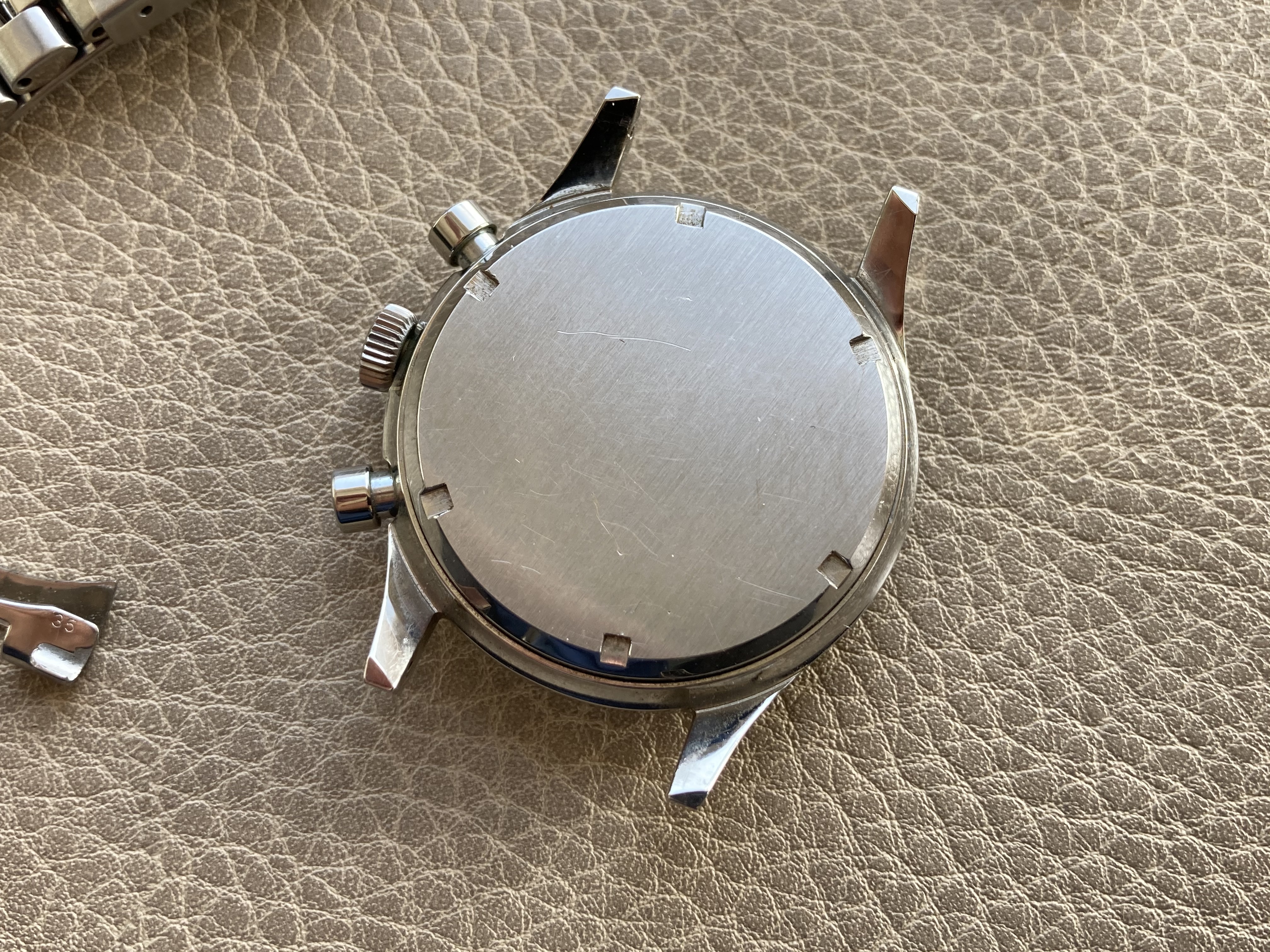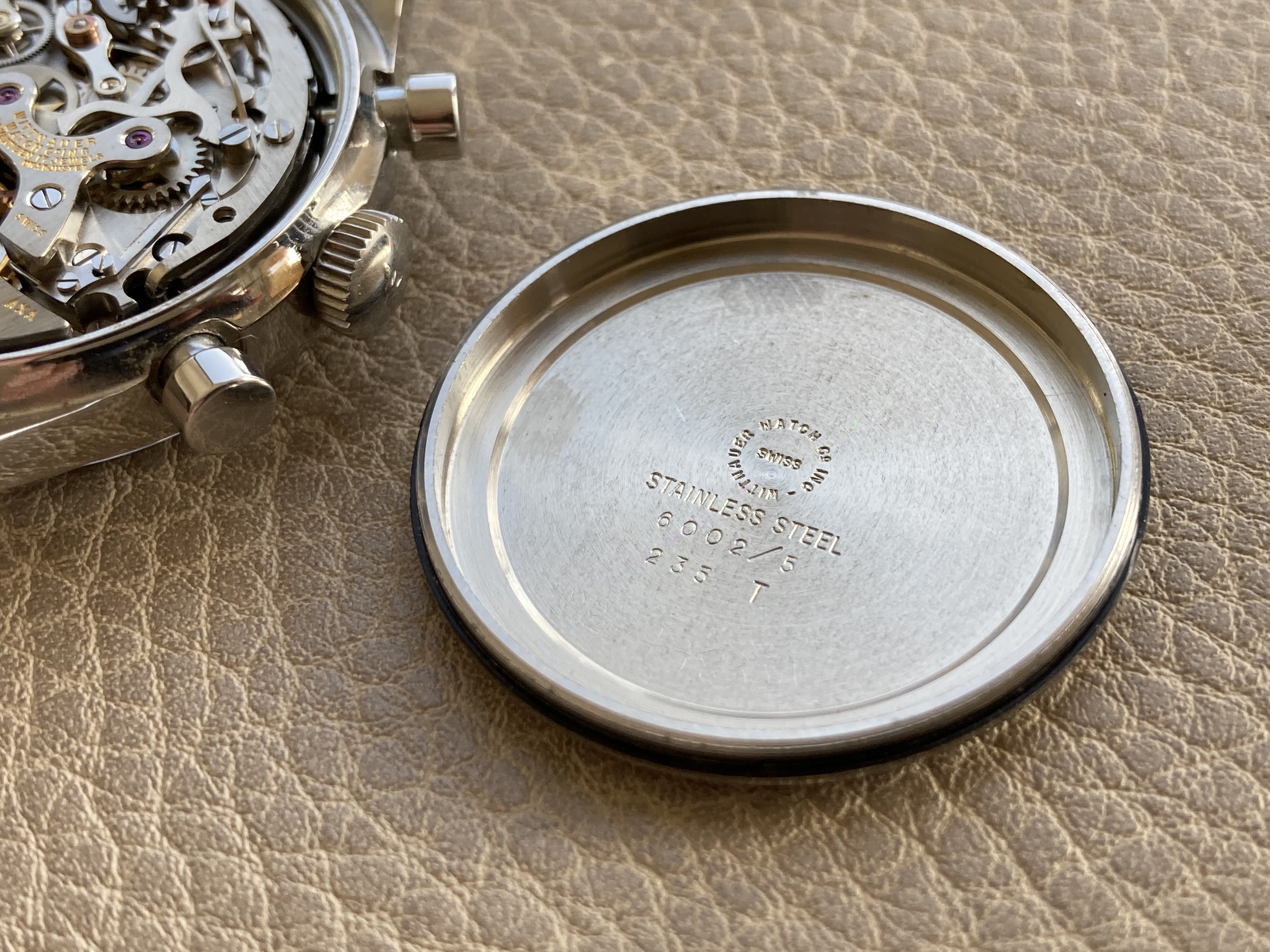Its 36mm case is great. There are some very light traces but no dings or scratches at all. The caseback is also in a great condition, some light marks of handling - correct reference (6002/5 and 235T) engraved inside.