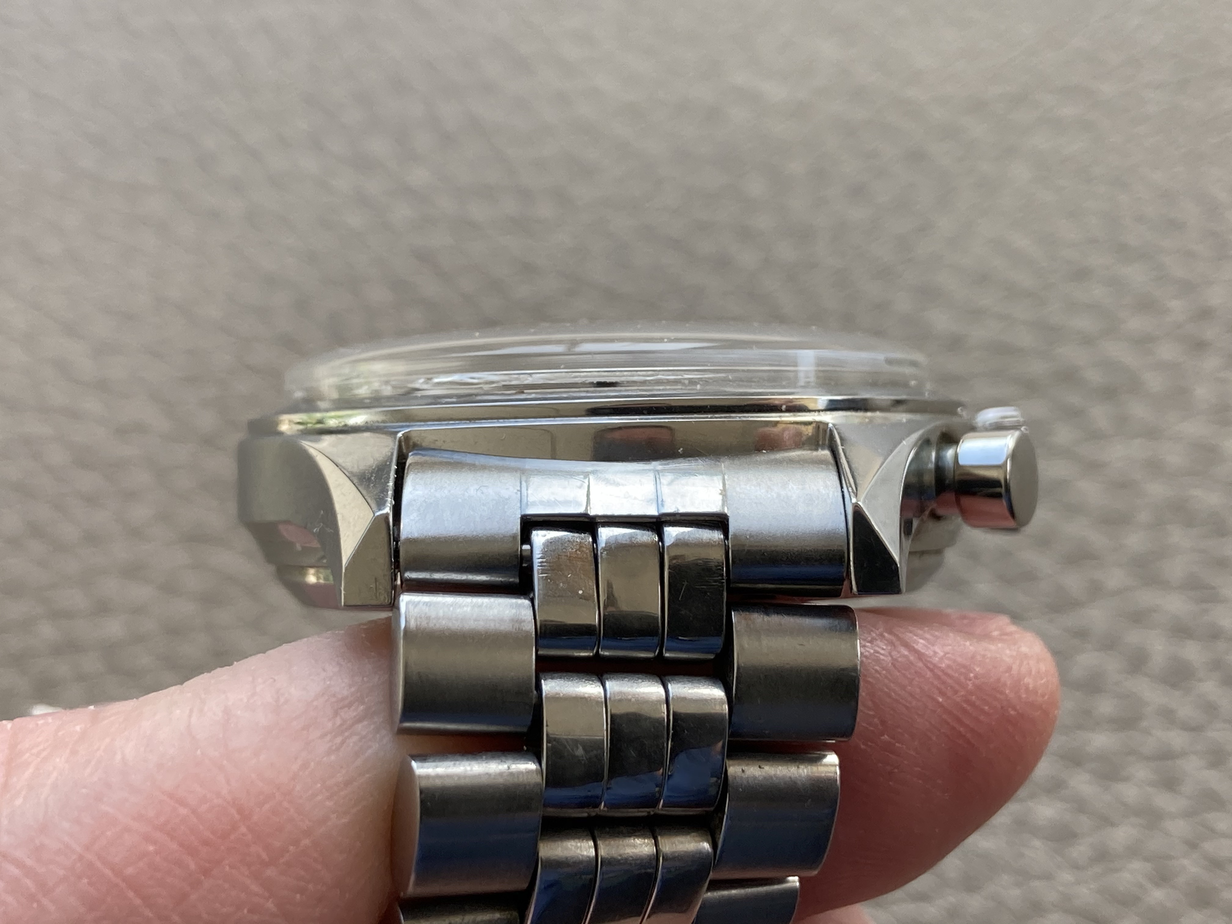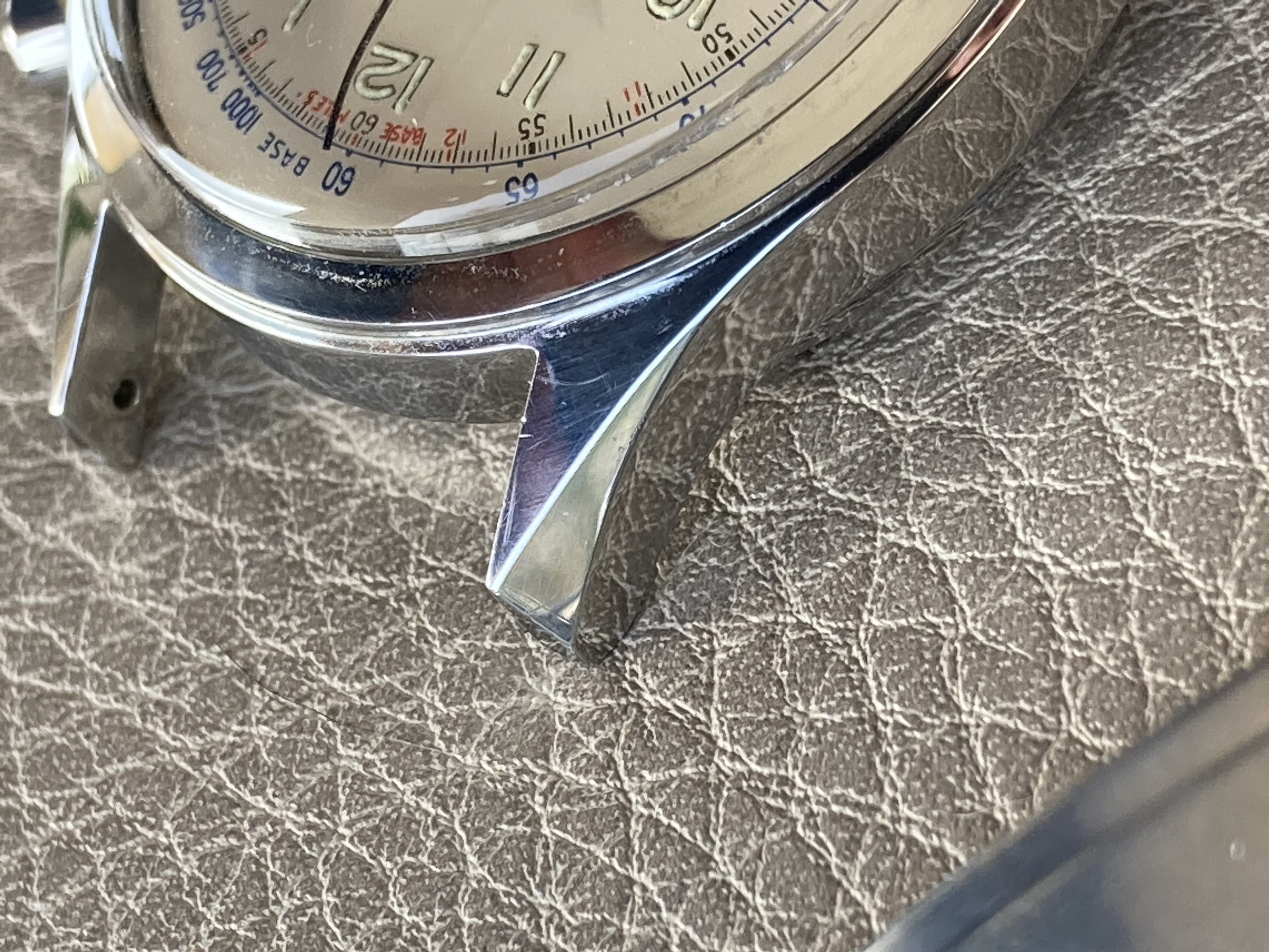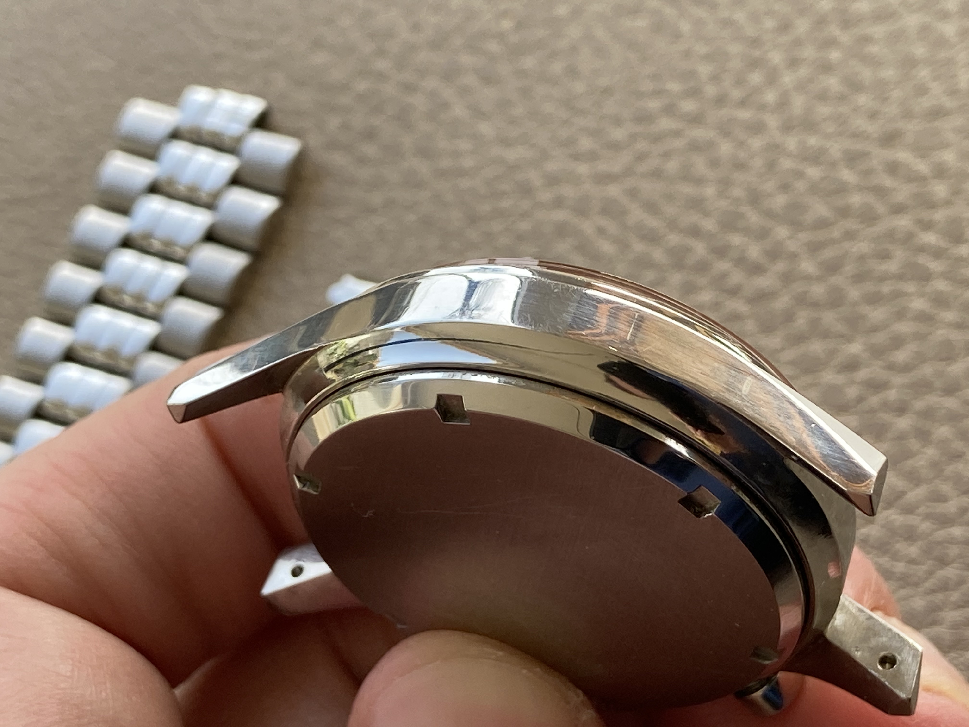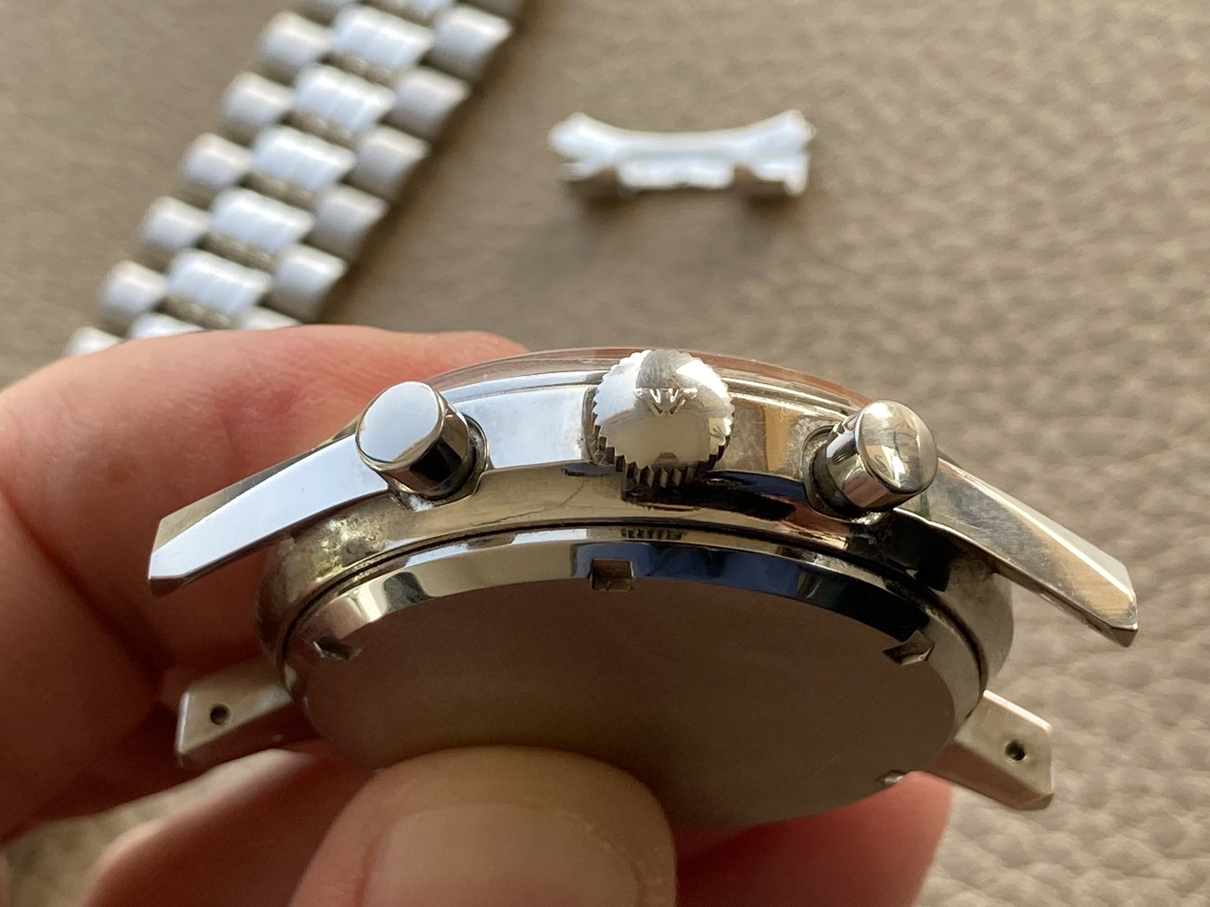Its 36mm case is great. There are some very light traces but no dings or scratches at all. The caseback is also in a great condition, some light marks of handling - correct reference (6002/5 and 235T) engraved inside.