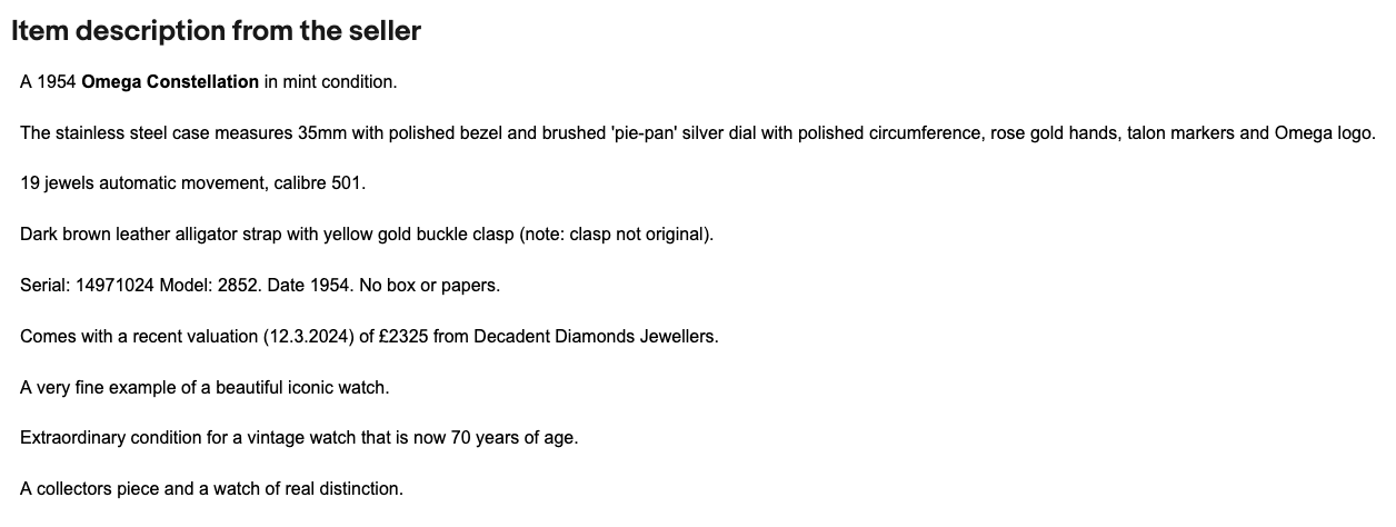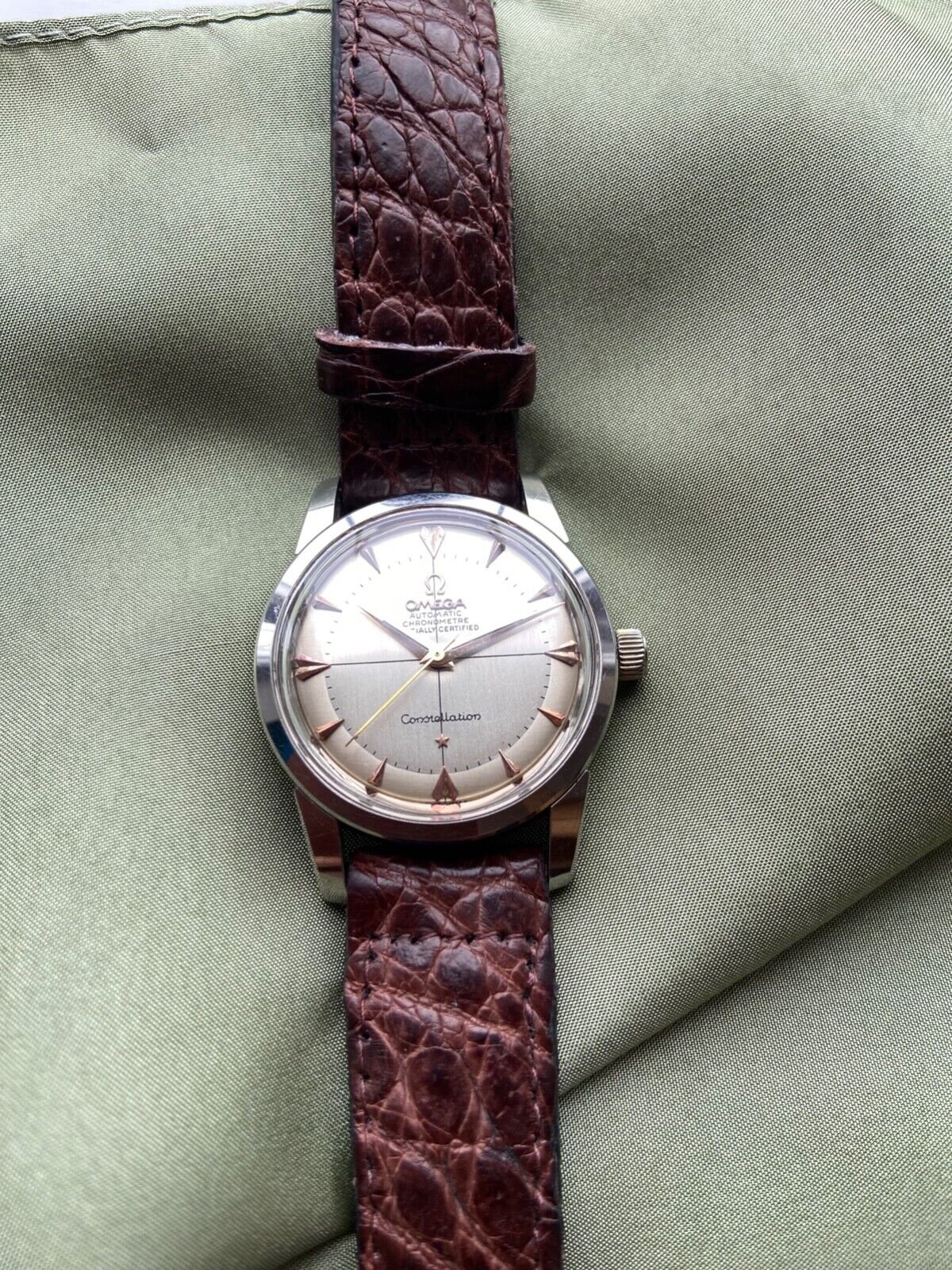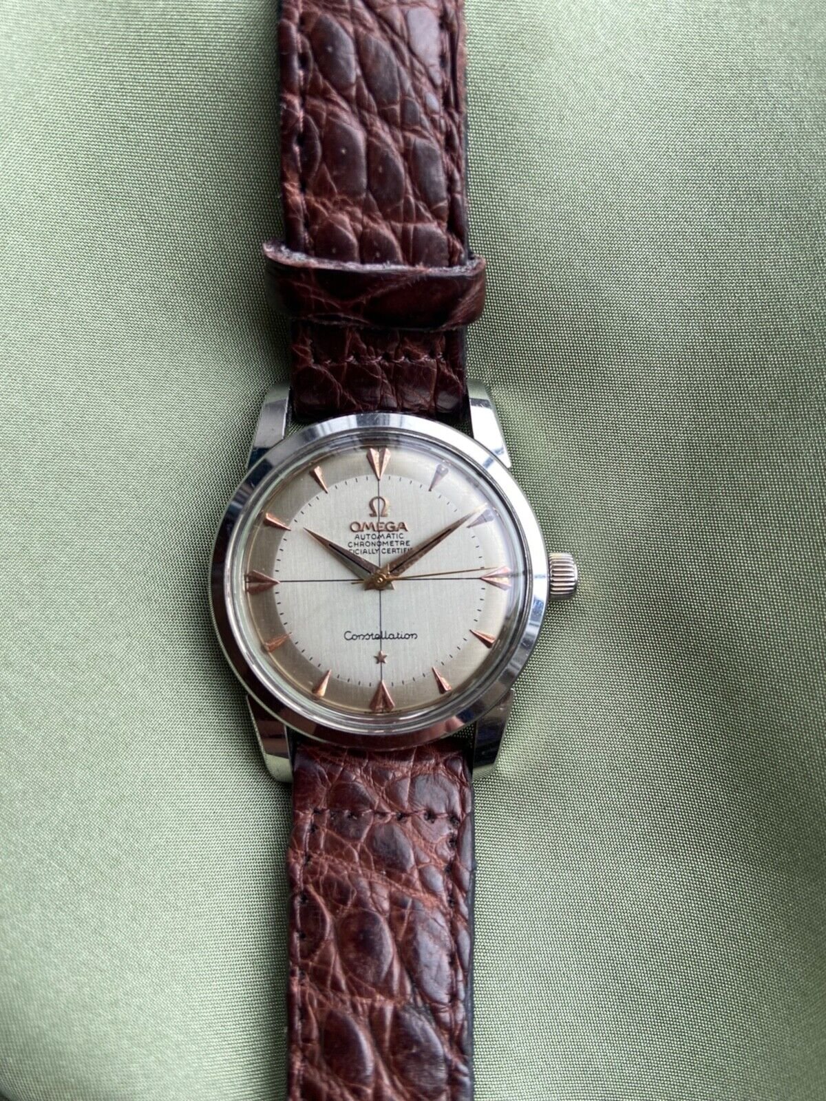 I'm squarely in the newbie camp, so I took a shot before cheating and scrolling. I saw the hands are clearly wrong (too long, mismatched gold), the Omega logo is far from centered, the crosshair lines look too thick, minute markers look too far outboard, and the crown is wrong. It's also not a pie pan in the sense the term is used on OF, at least. Lugs look good to me. I didn't catch the case issues at all, but I didn't research comparables before compiling this list.