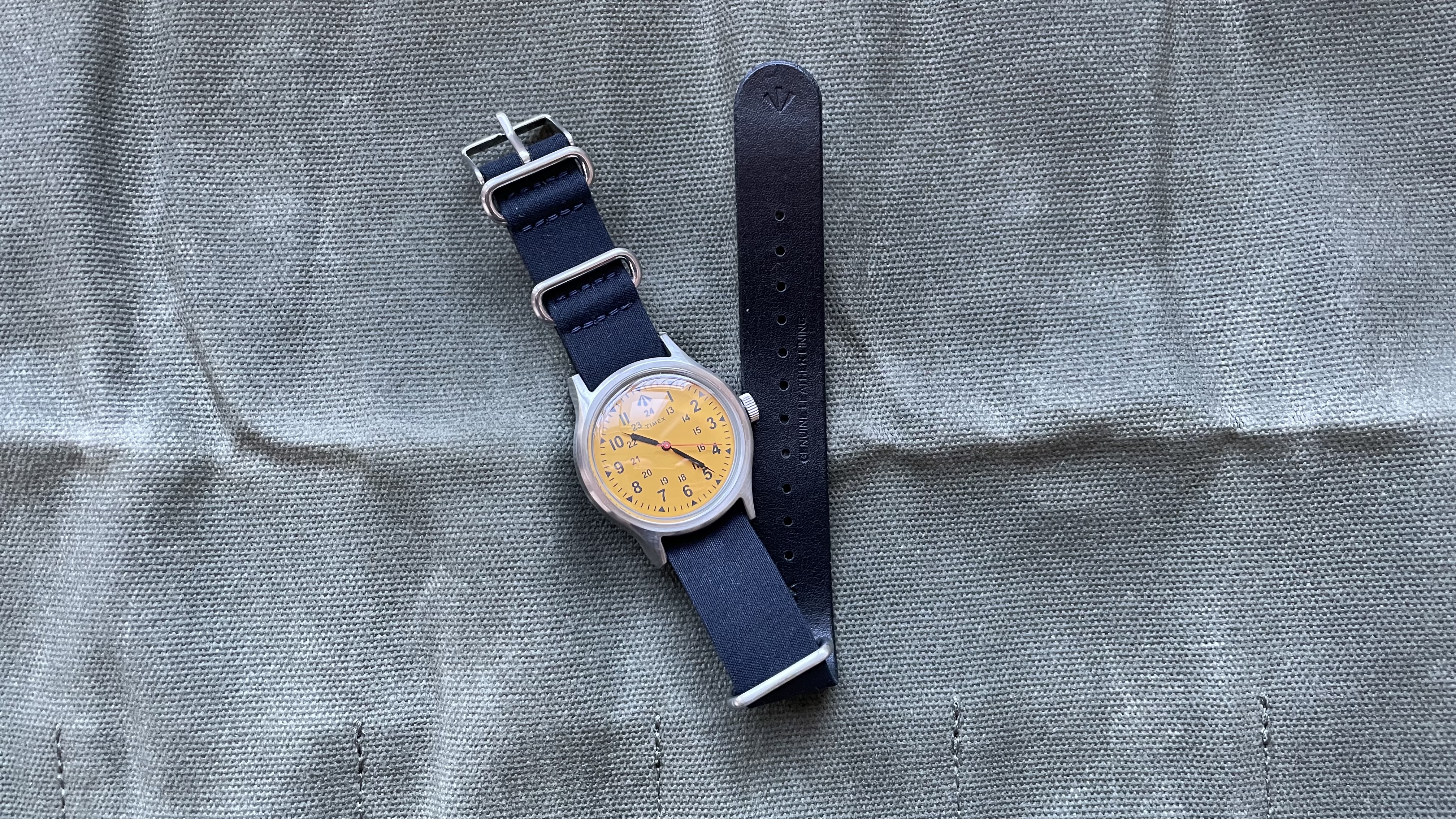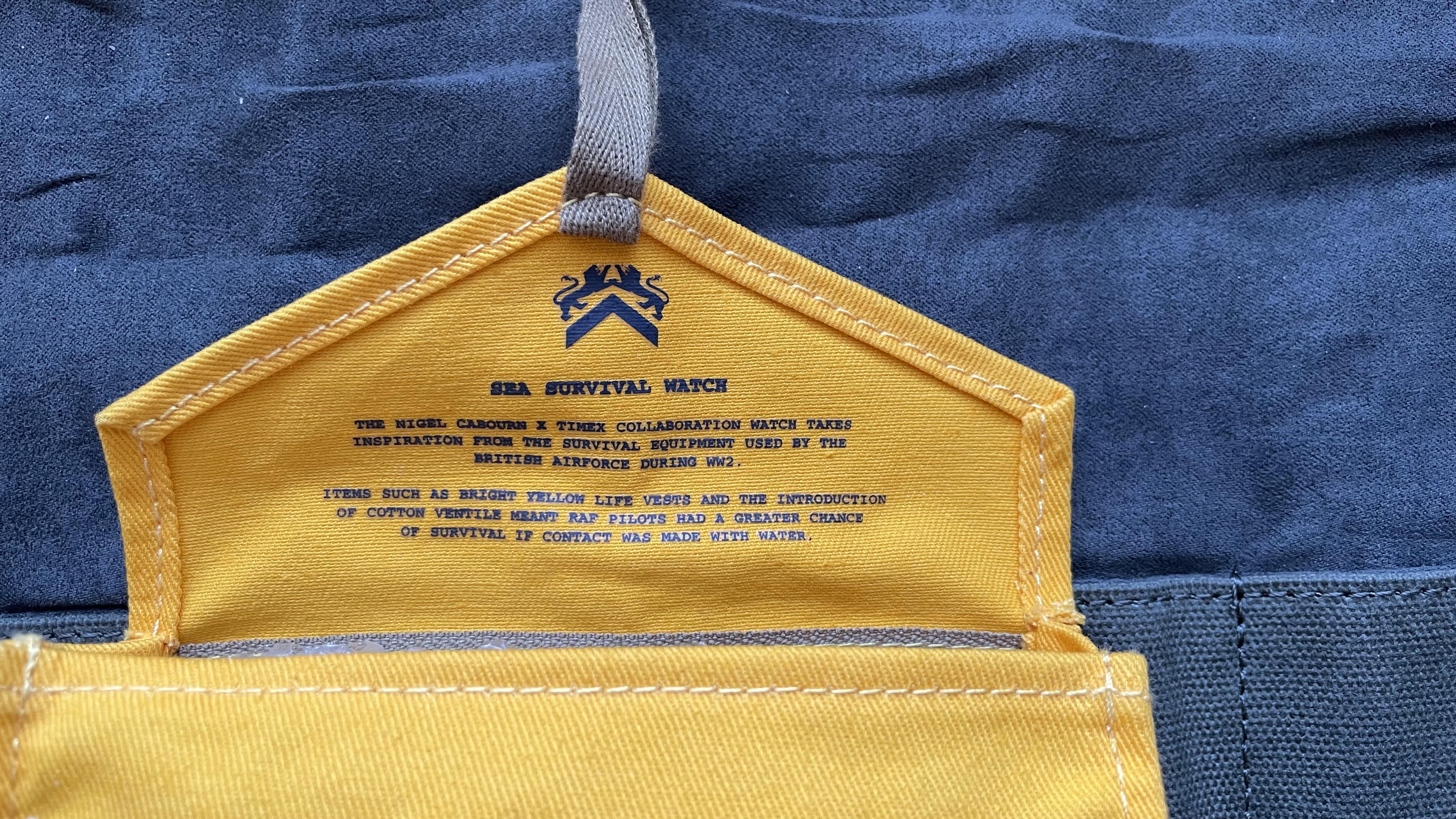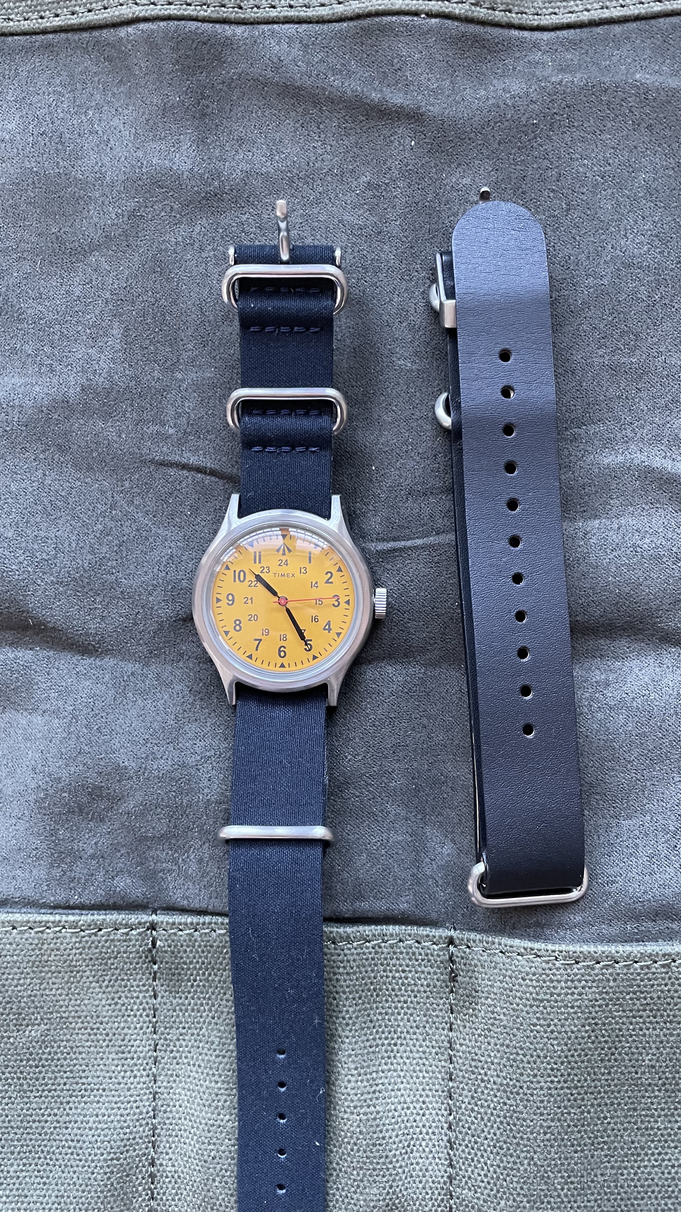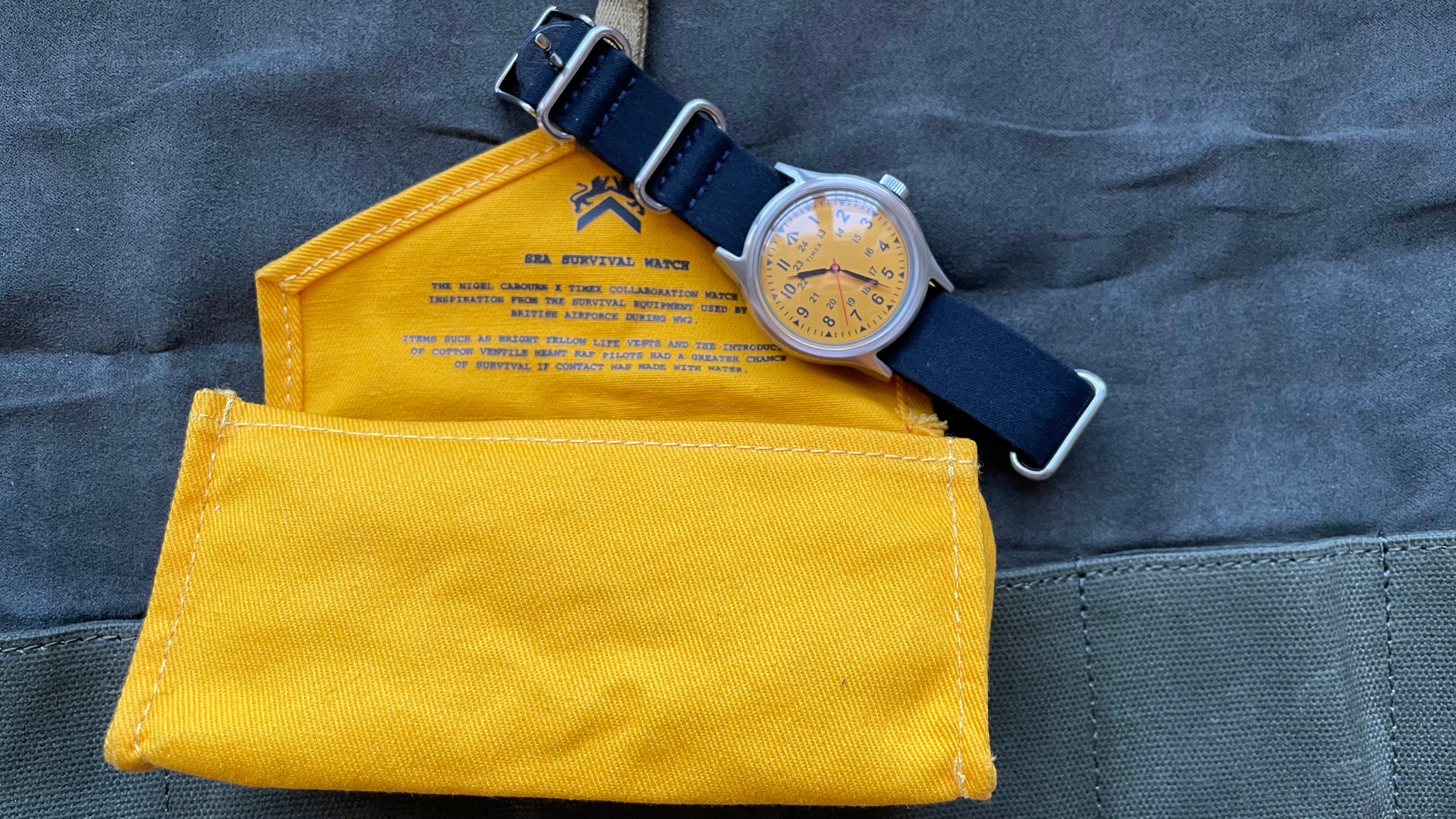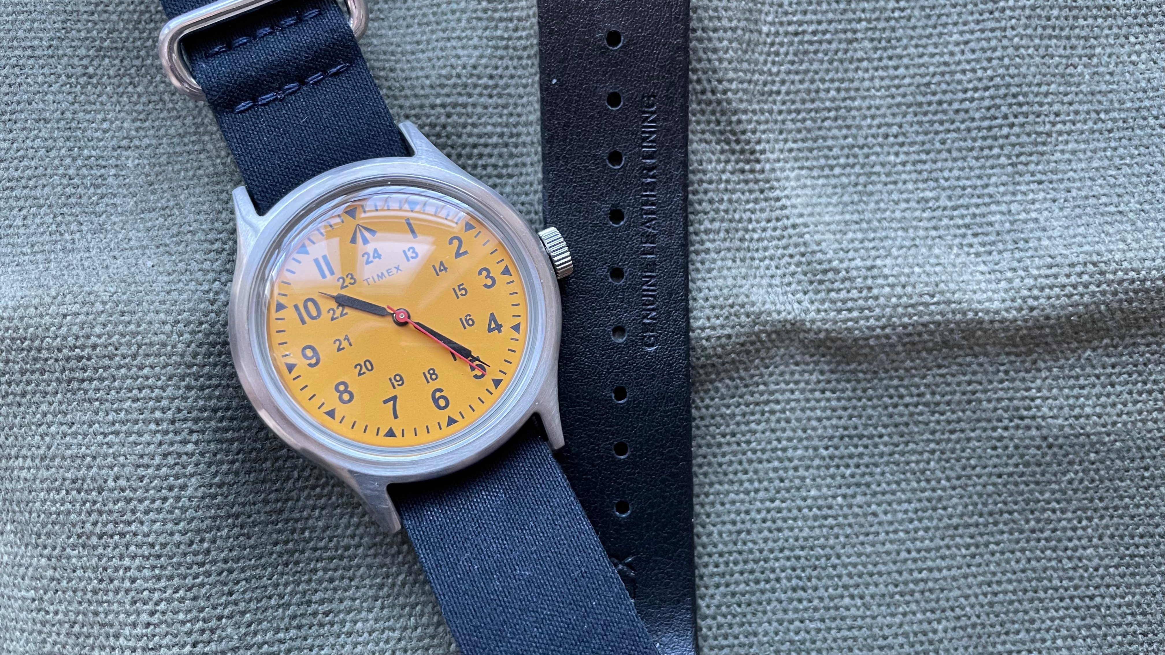 Our much-anticipated third collaboration with leading global watchmaker, Timex, is based on their 36mm MK1 field watch in stainless steel, with nods to military heritage and British innovation with the striking yellow dial and Ventile cotton strap.