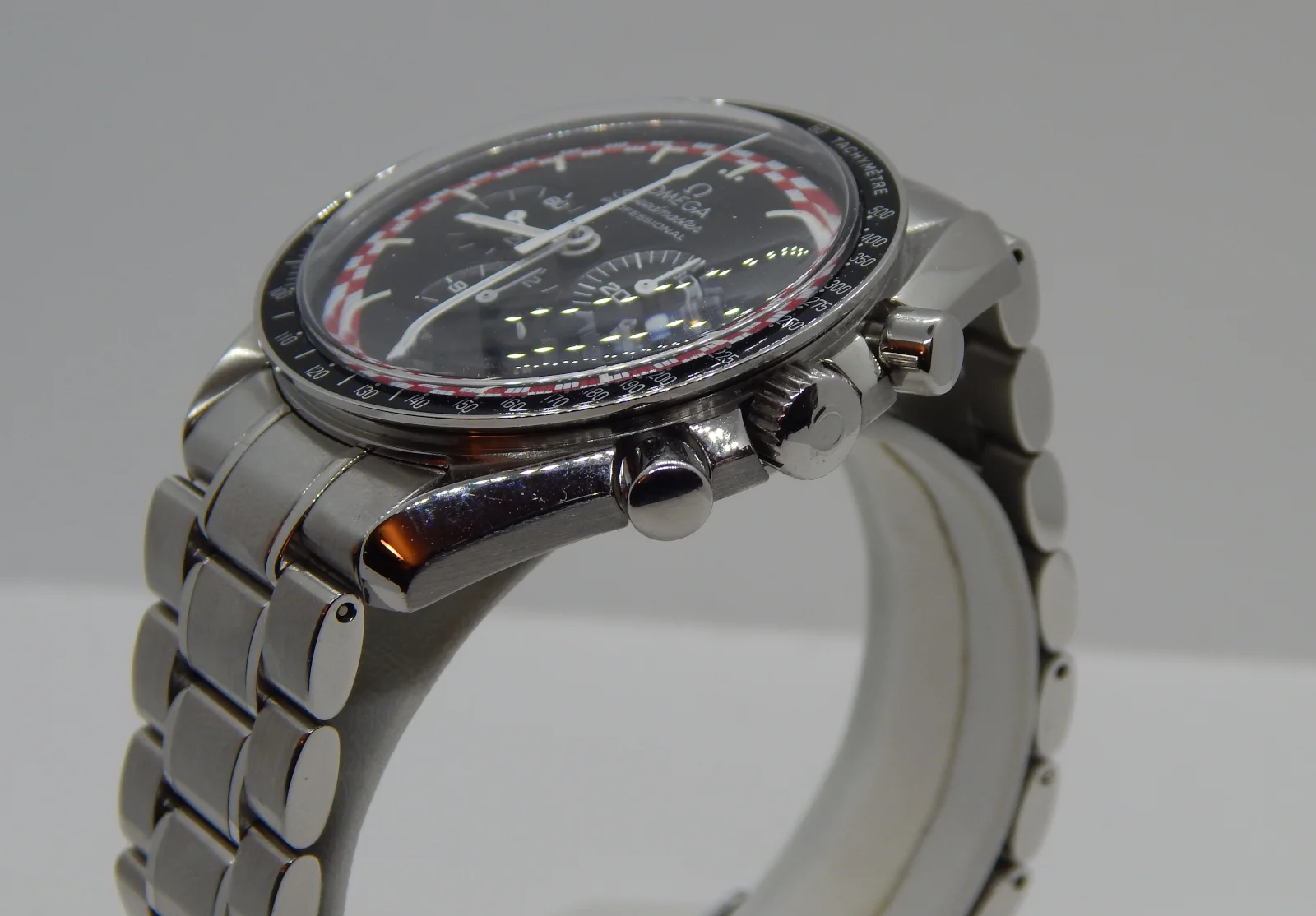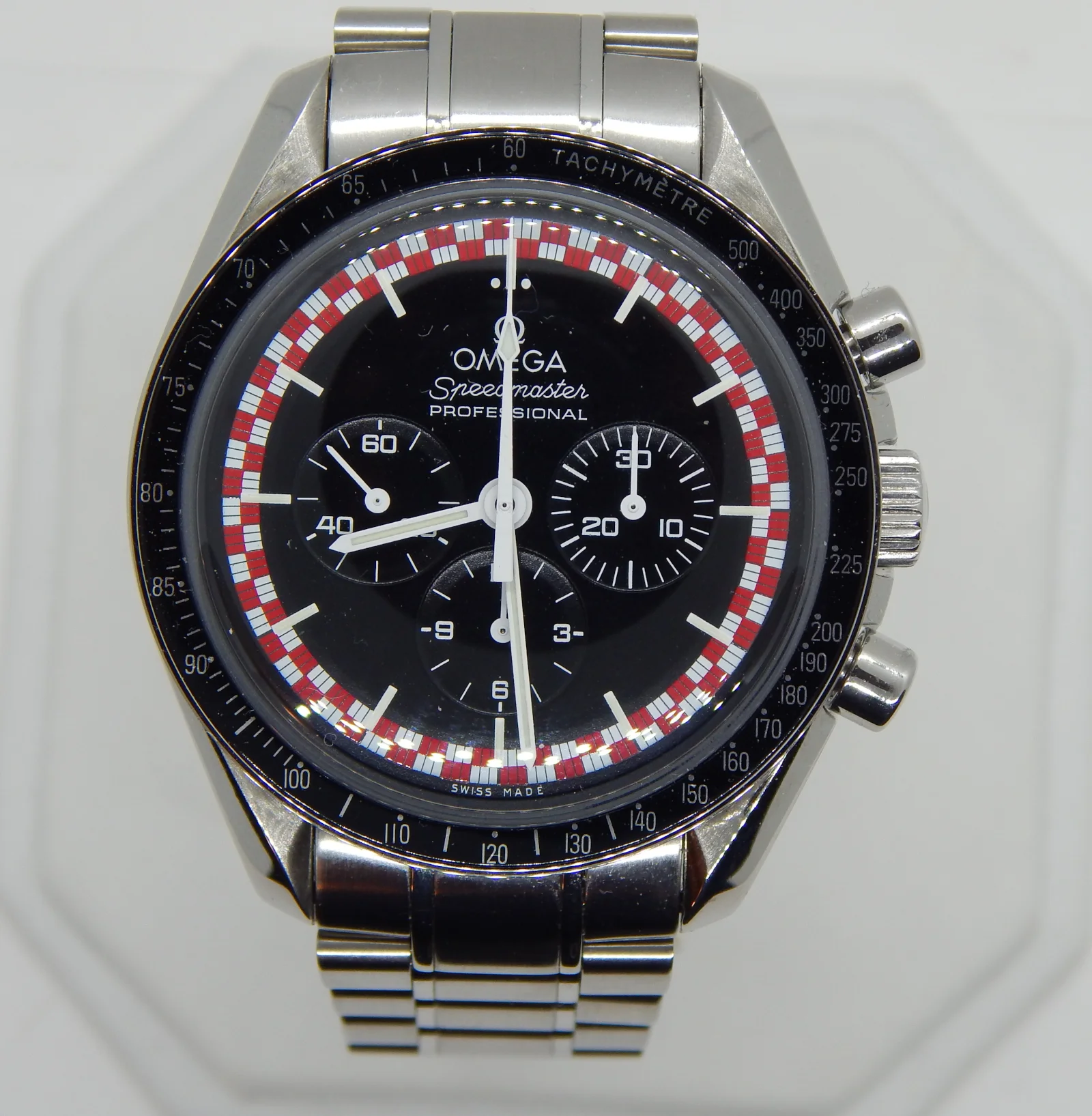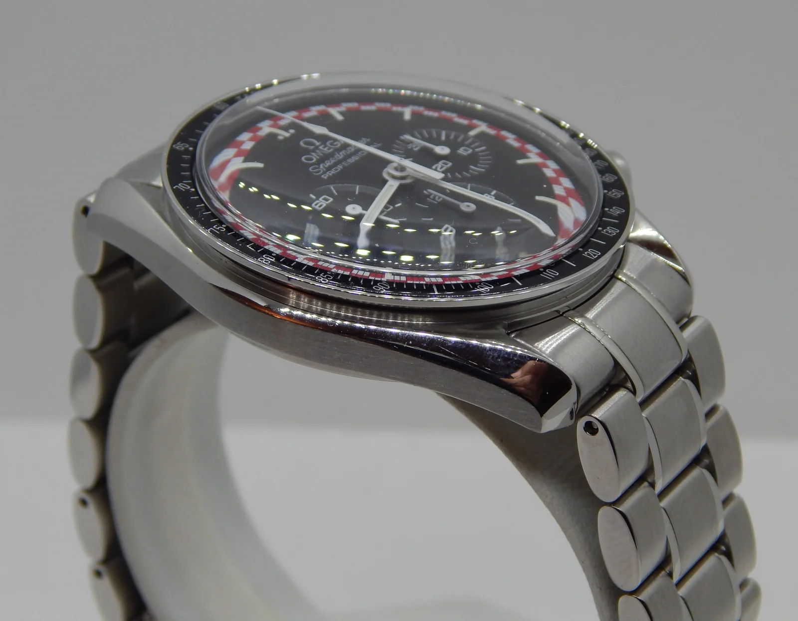·A while back I had purchased a very nice Tintin dial from member @robinhook. I'd already been putting aside some gently used parts -- including a slightly scruffy donor 3594.50 -- in contemplation of a racing dial mod but decided to do the Tintin mod instead. I sent the watch and parts (dial, caseback, bezel, and a new service handset) out to TM Watch. They serviced the movement, swapped in my parts, installed a new Omega crystal, and changed the black paintfill on the caseback to red. The donor watch came on a 1498 bracelet which I replaced with a 1998 to get a little closer to the look of the original.