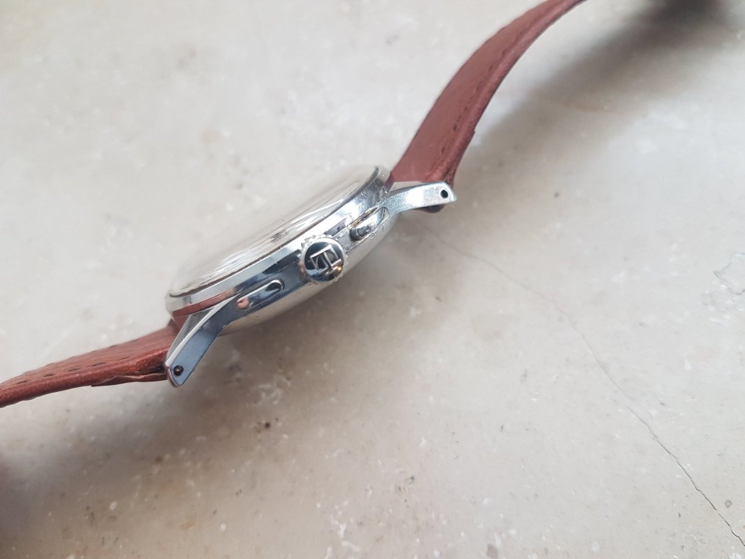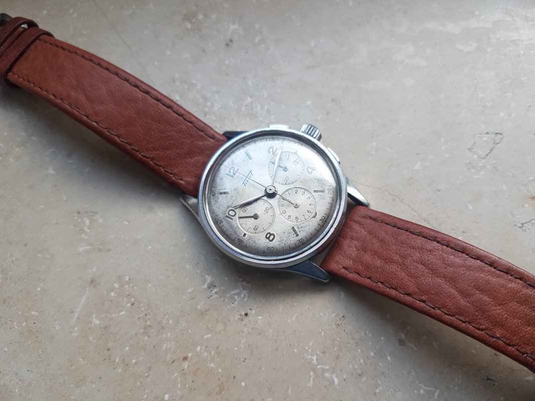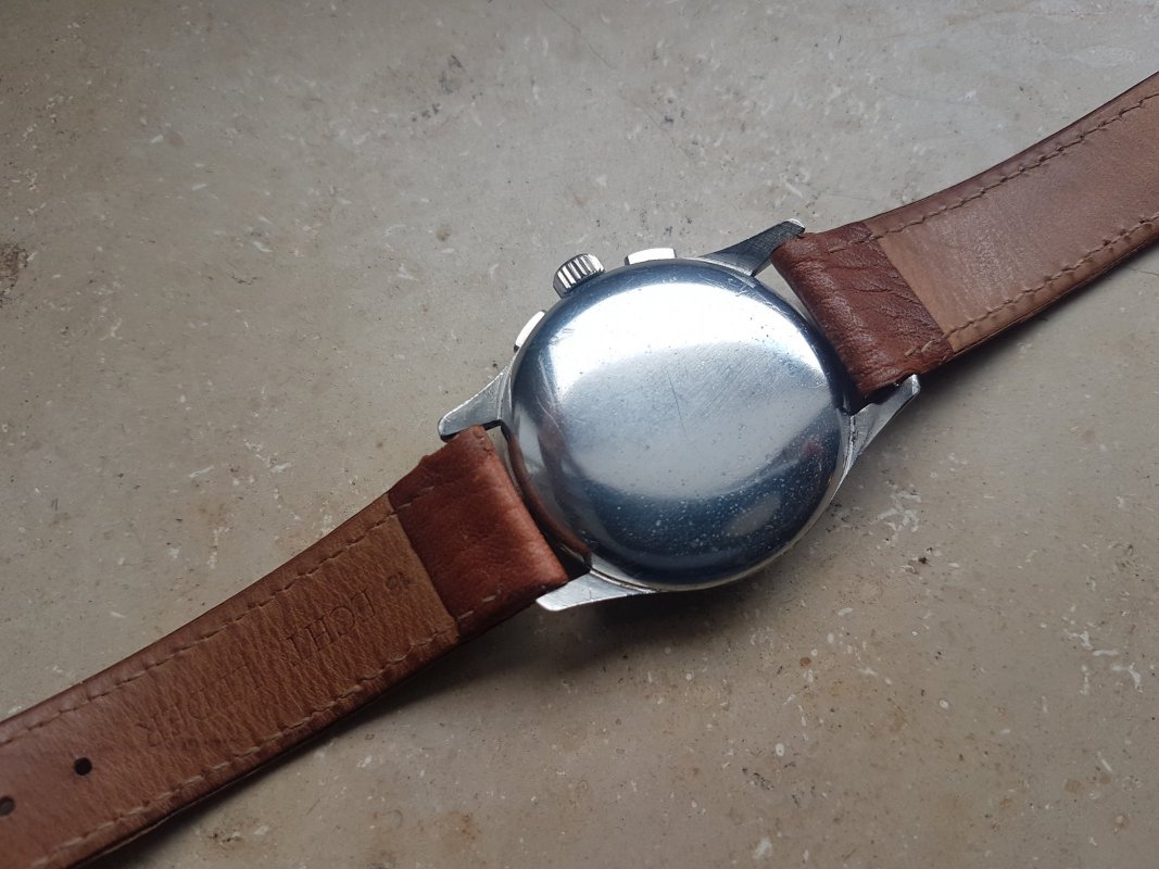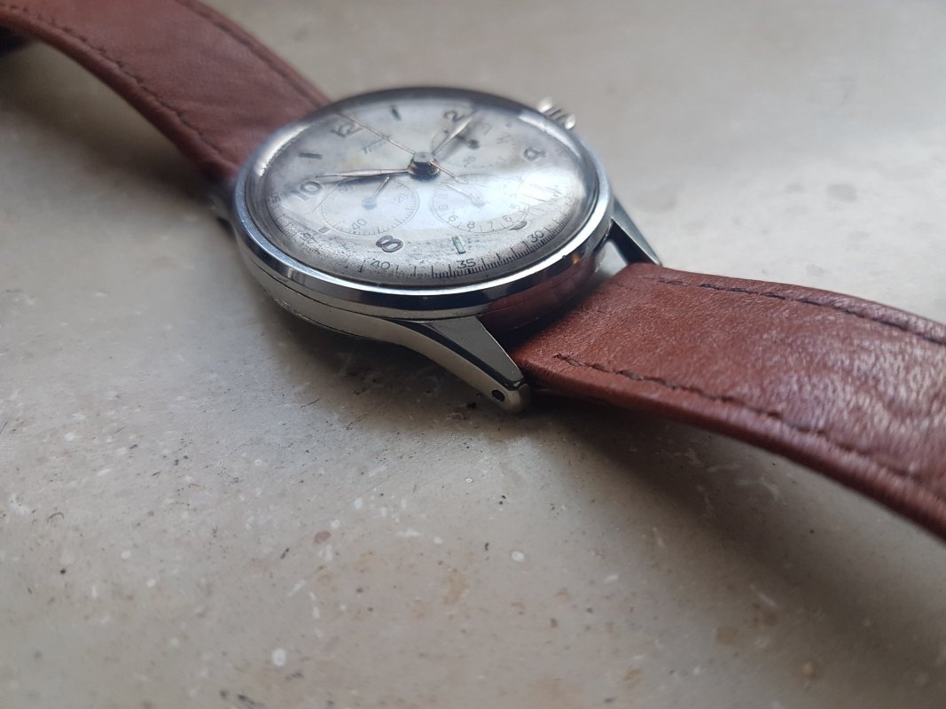 The Dial has a lot of Patina. These cases are not Waterproof at all, so many dials didnt survive or have signs of the times. The Crown was changed at some point but the rest is original: dial, hands etc. The watch runs ca. 1 min fast in 24 Hours. Winds very smooth and has a good Powerreserve: ca. 45 hrs. Chrono Functions work as they should. If you you want to wear the watch regularly i would recommend a service. Caliber is lemania 27CH. Brother of the Omega 321 Movement 😀 diameter is ca. 34mm without the crown