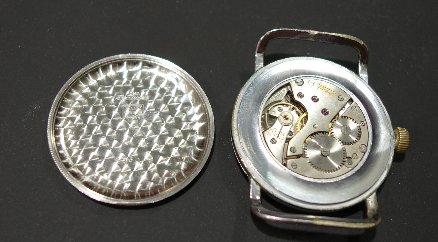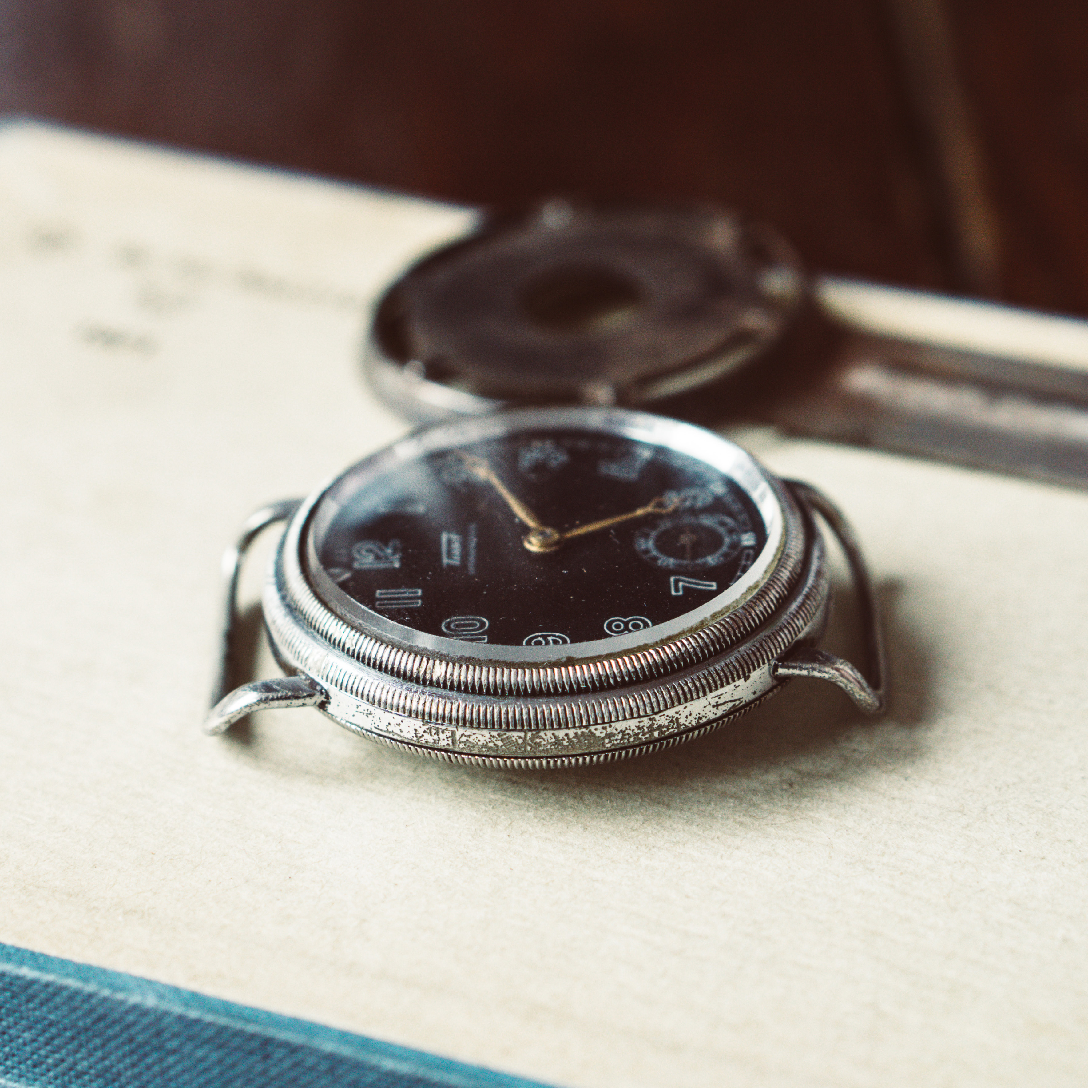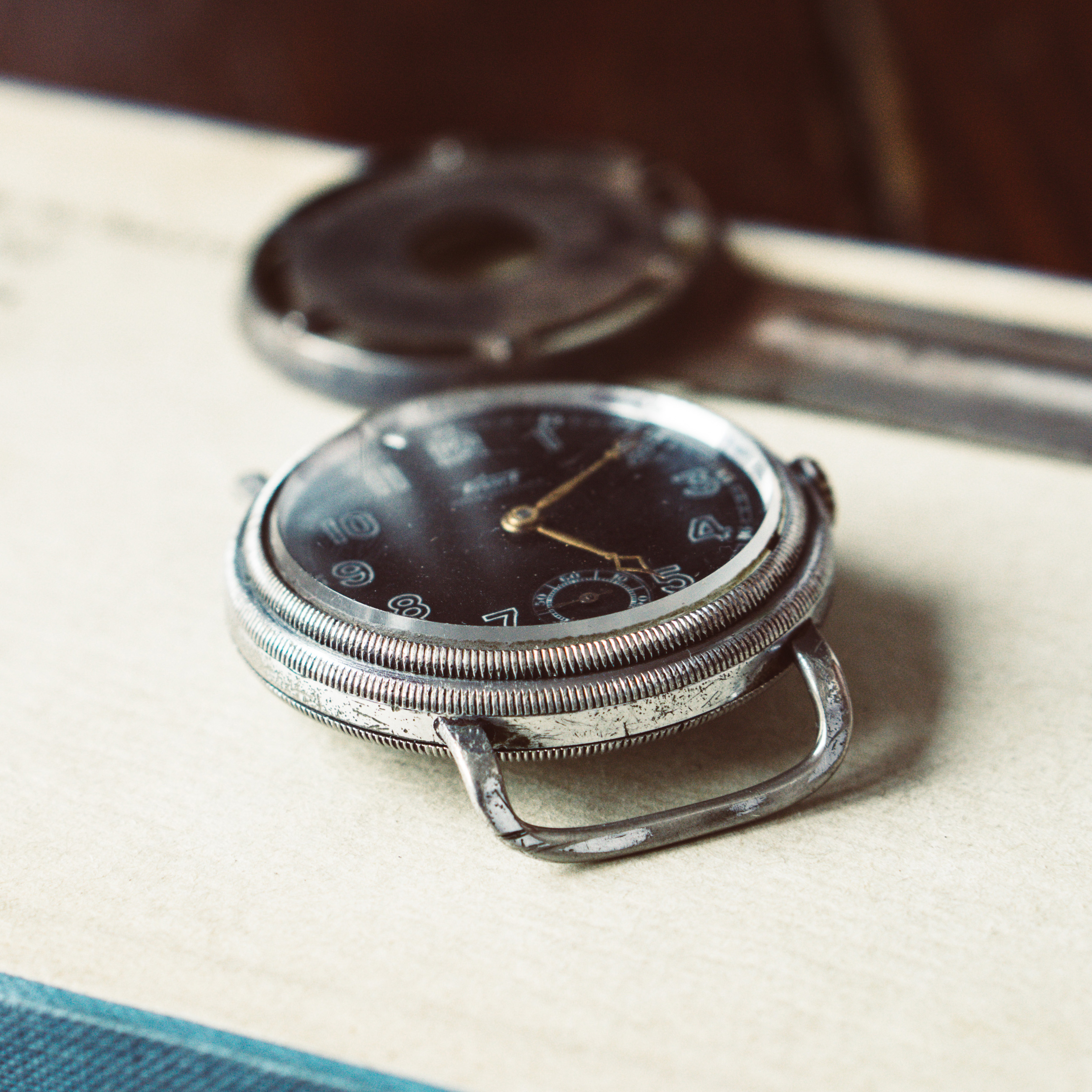 It's a pre-war aviator's watch of a type known as "1928 German Air Force Pattern" and you can find this same case (some slightly different) with a large number of different innards; Doxa, Omega, Helvetia, Zenith and others made them as well. Always fixed lugs, black dial and heavy on the radium.