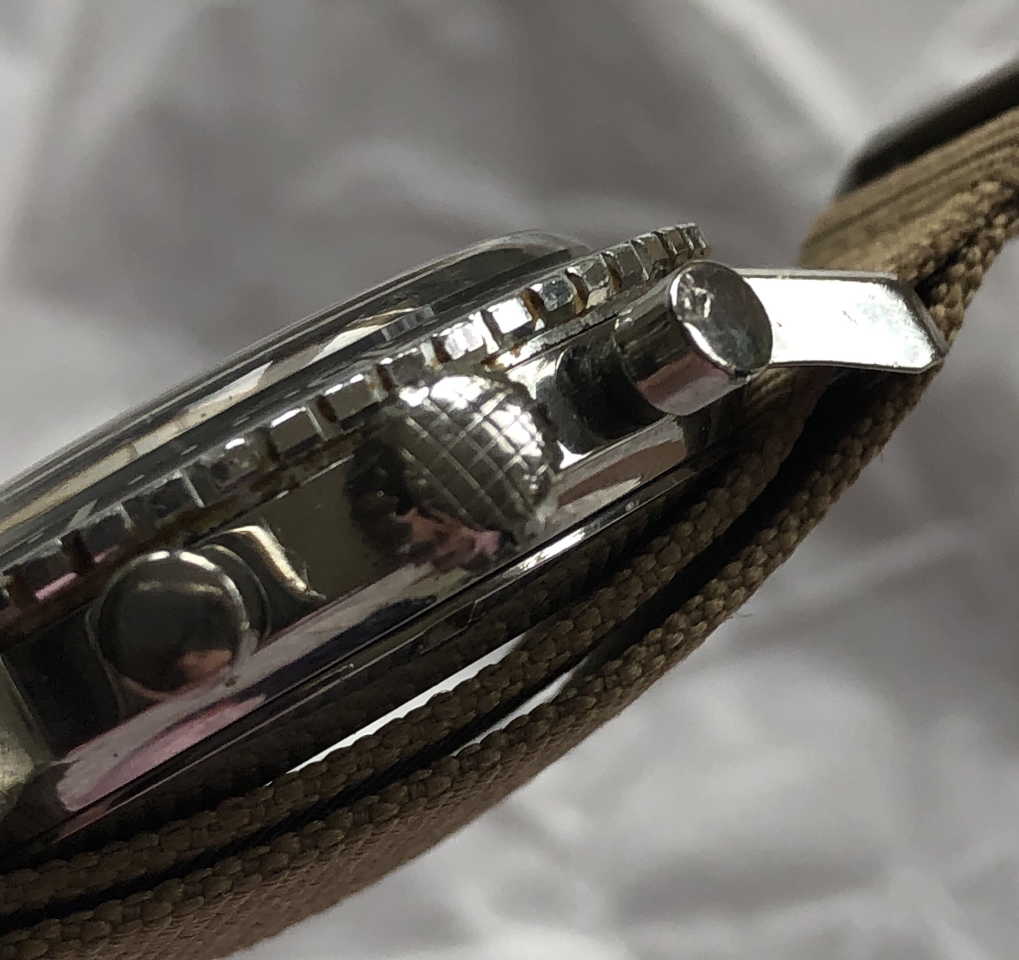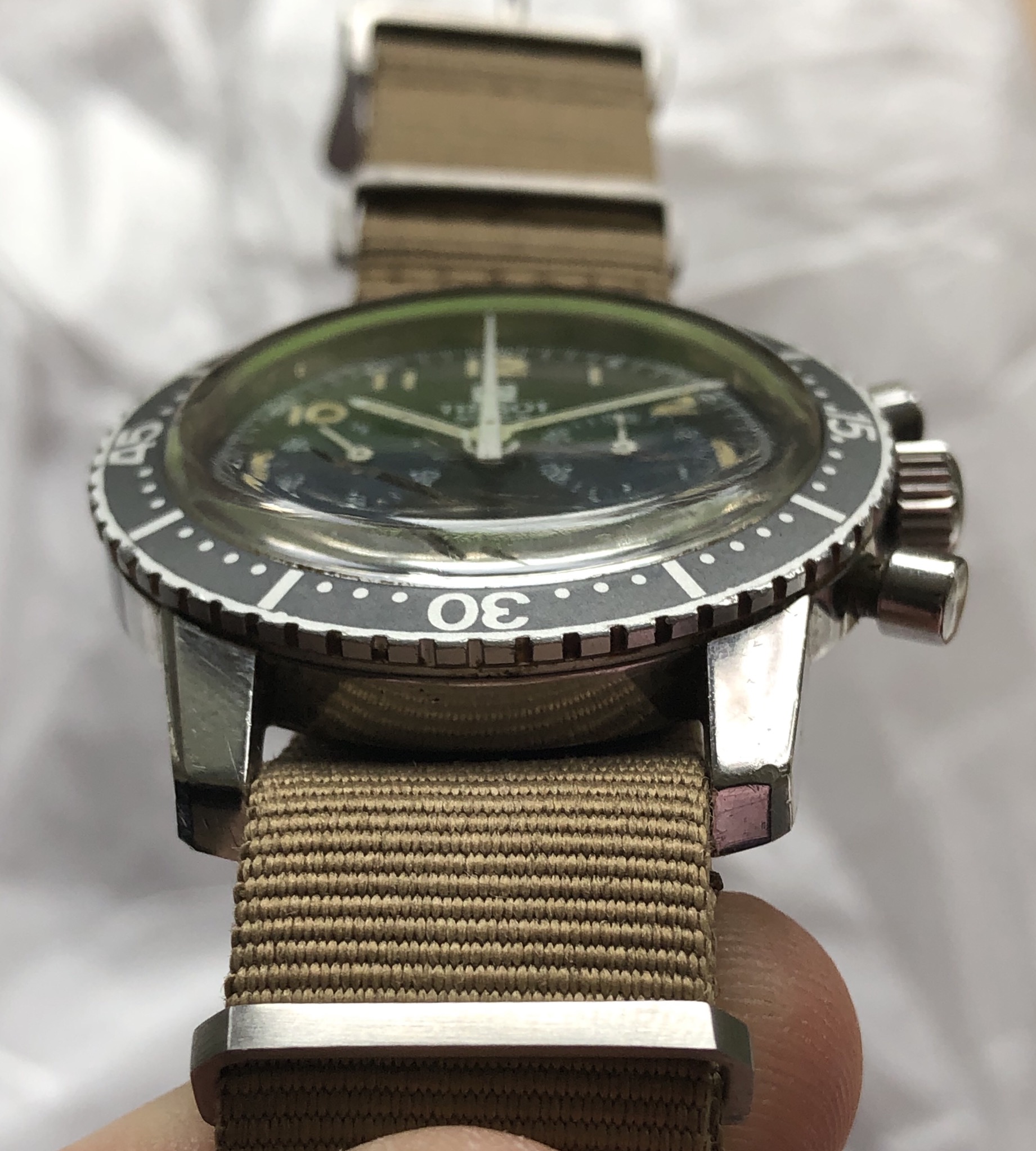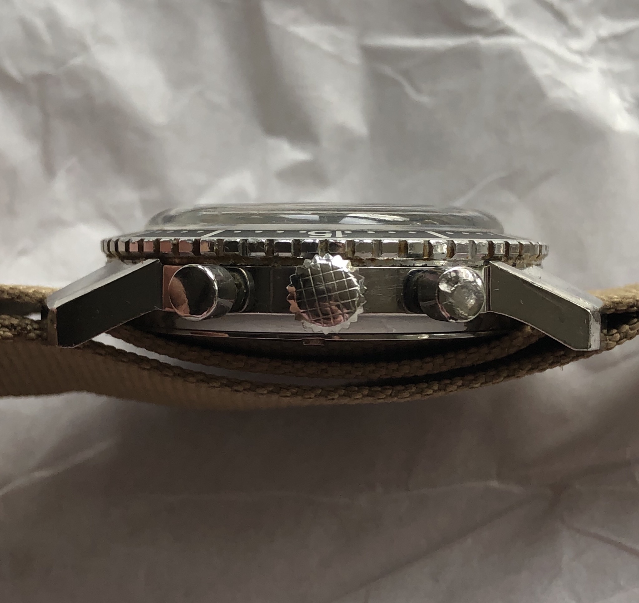 Hands/Crown/Pushers/Crystal: Hands are original with matching patina. Crown is orinigal compressor. Pushers are original, with top pusher having a ding as pictured. Crystal is original and has stress cracks as seen at certain angles.