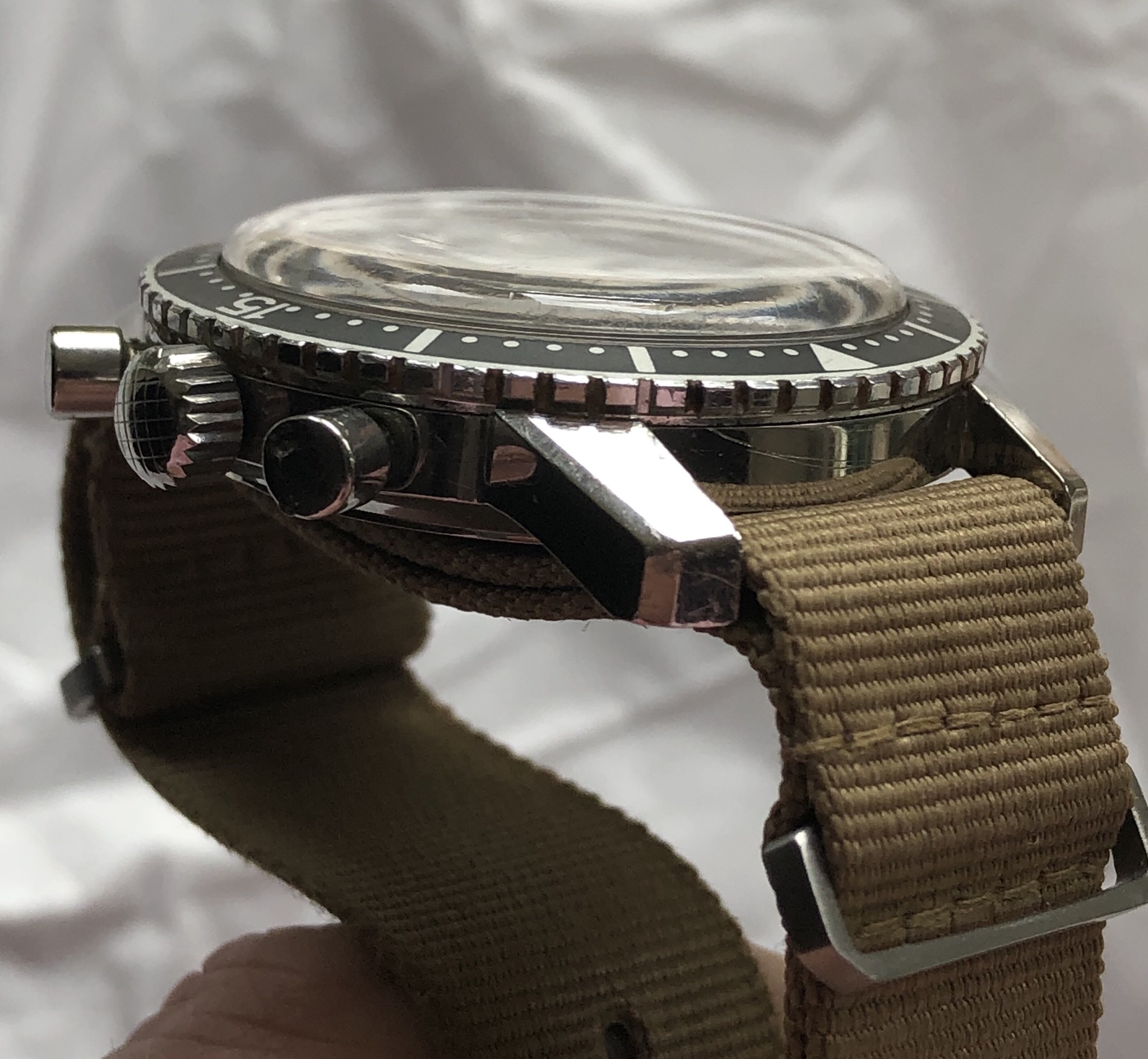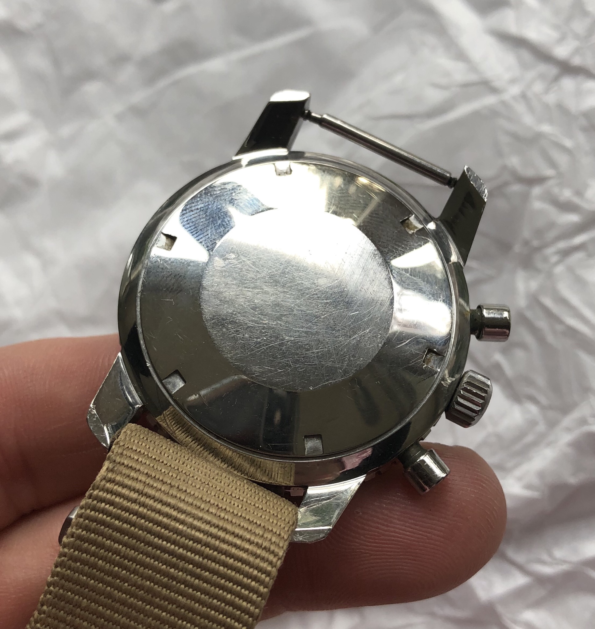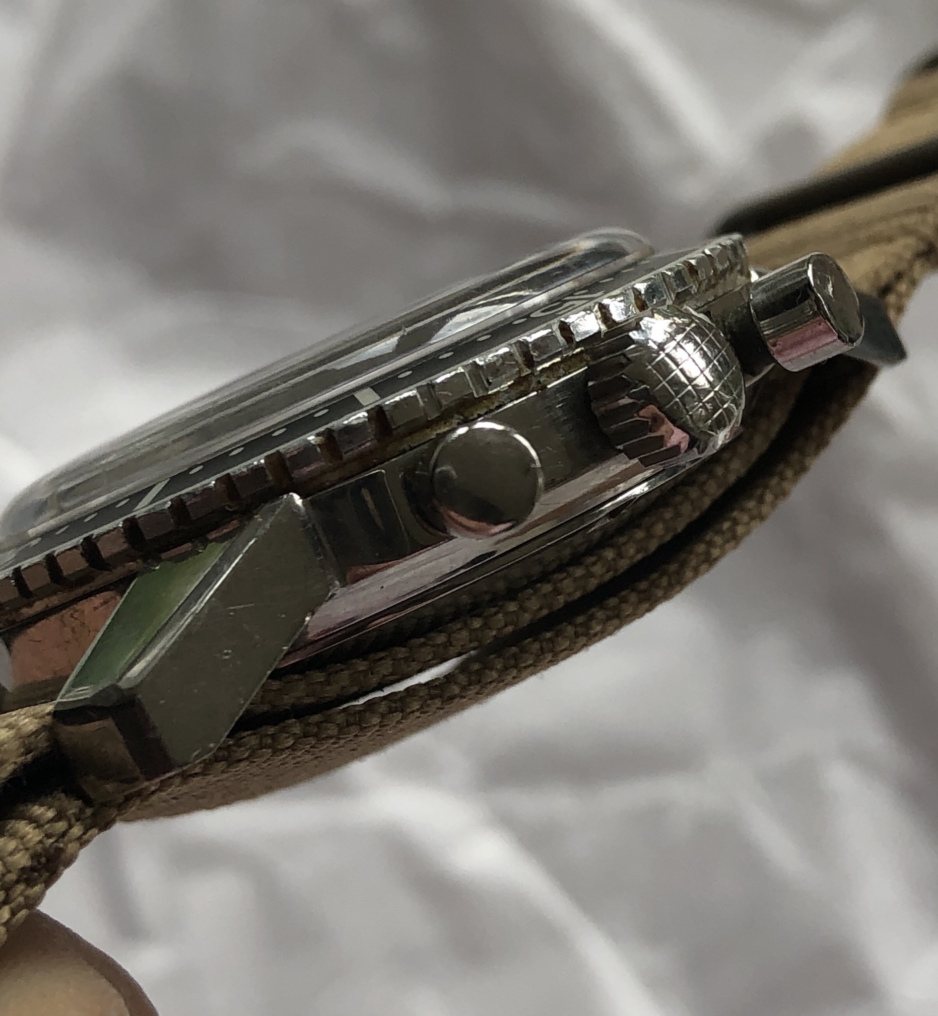 Hands/Crown/Pushers/Crystal: Hands are original with matching patina. Crown is orinigal compressor. Pushers are original, with top pusher having a ding as pictured. Crystal is original and has stress cracks as seen at certain angles.