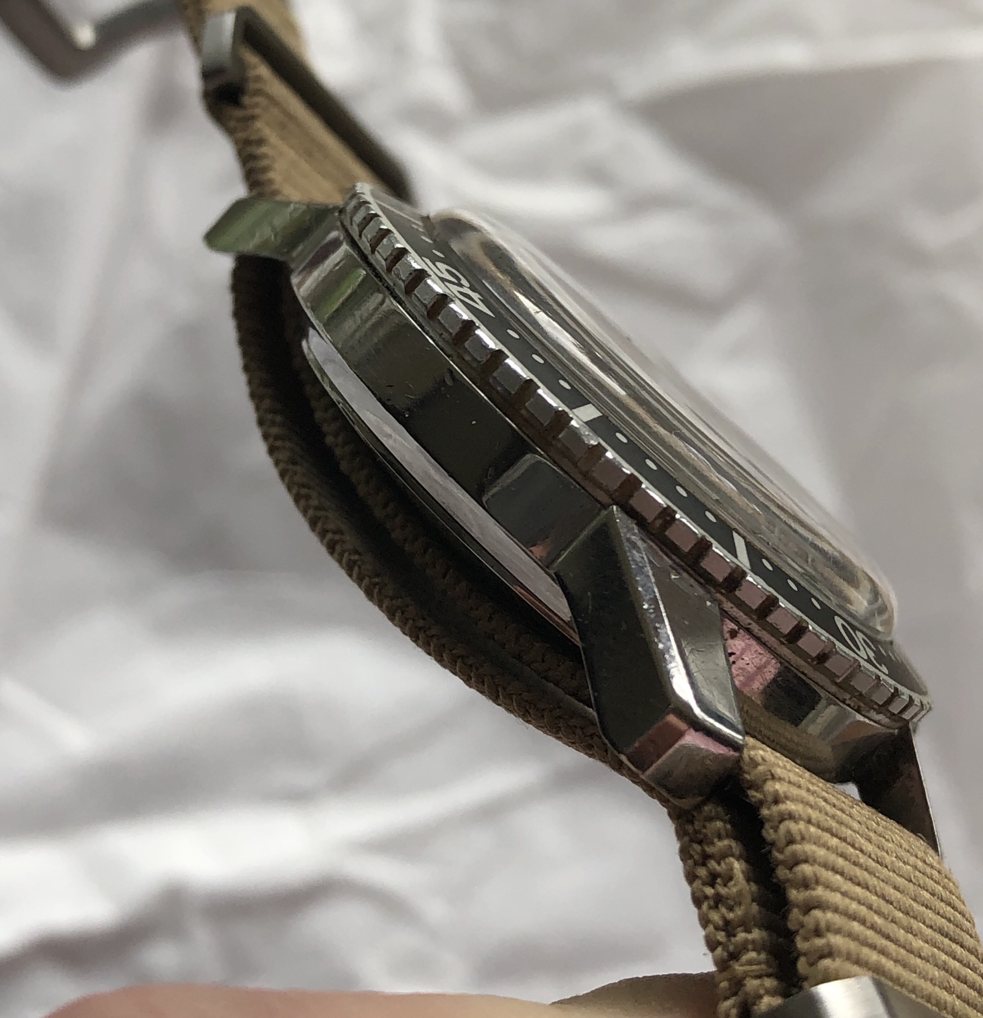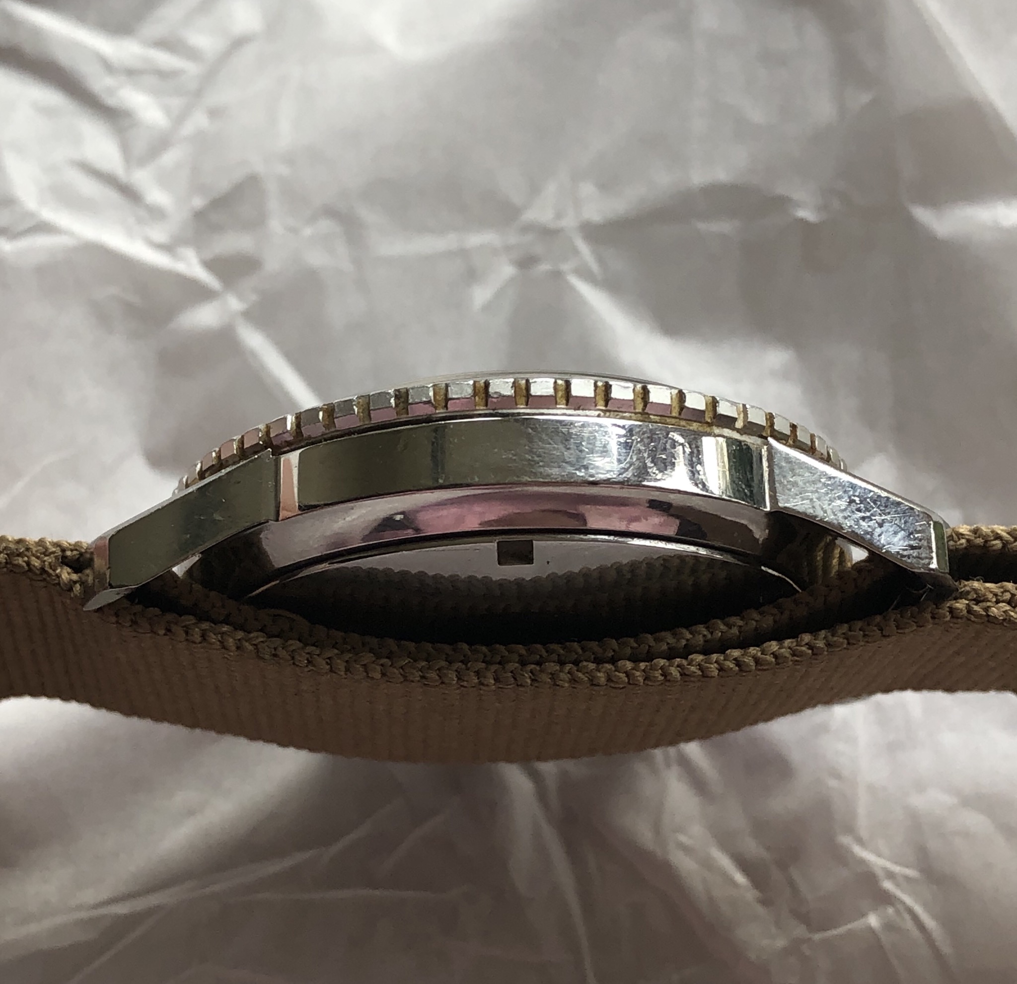 Case/Bezel: 40mm compressor case that appears to be unpolished with crisp case lines and bevels, wear consistent with age. Bezel is original with a slight ghost fade.