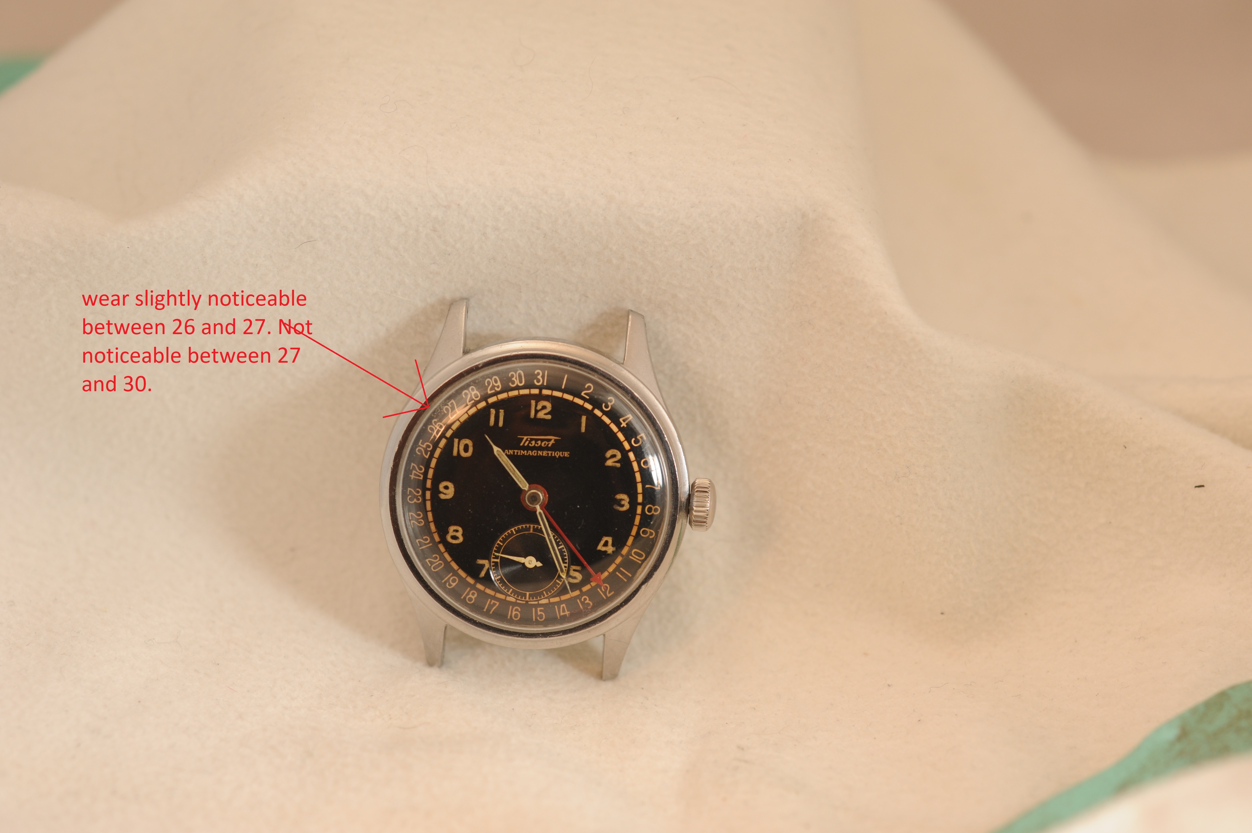 ·Dial: Lovely and somewhat uncommon in black. A few tiny dust spots on inner crystal. Some scuffs/abrasions noted (and barely visible with naked eye) in outer periphery behind 26-27 date markings. Also some scuffing noted between 27 and 30 marks which on close inspection is on the crystal, not the dial.. also in outer periphery and only visualized at an angle with loupe. Overall the dial presents as excellent.