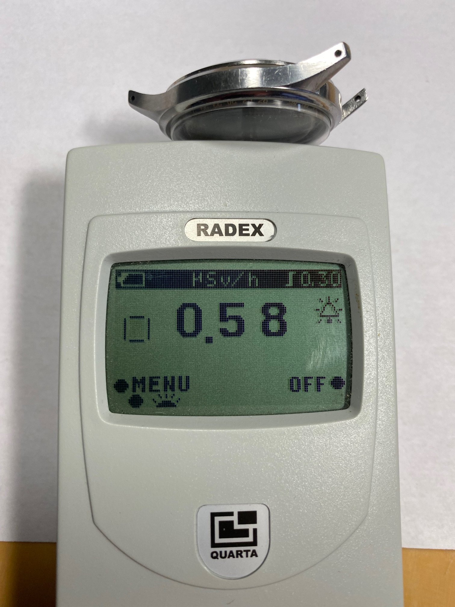 Hands: original and lume on hour hand a bit lighter. Hands have no glow and read a .58 on my Radex geiger counter. A bit too hot for tritium, so probably very thin radium. But a bit too low for the readings I see on radium, so not sure... Hour hand is slightly offset to the right. Please see picture of hands at 12:00.
