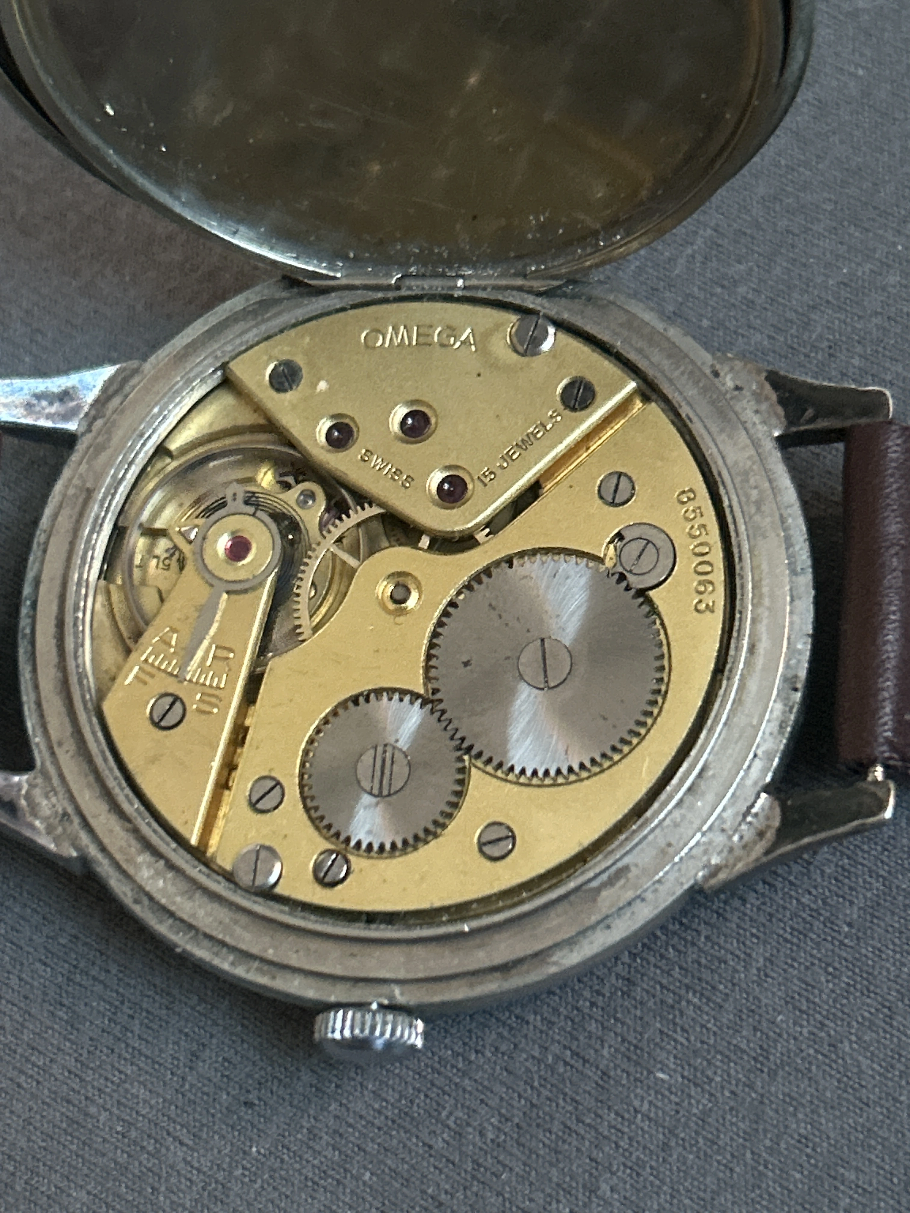 - Movement: Hand-wound, marked Omega, Swiss, 15 Jewels. Serial number 8550063, which according to Omega serial lists dates to around 1934–1936.