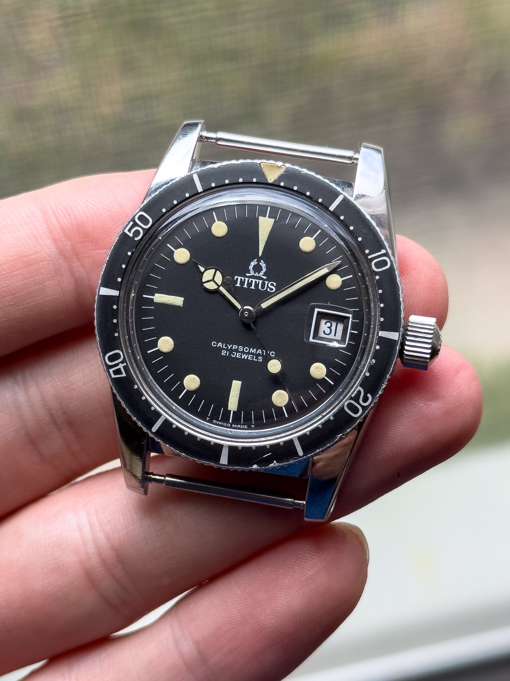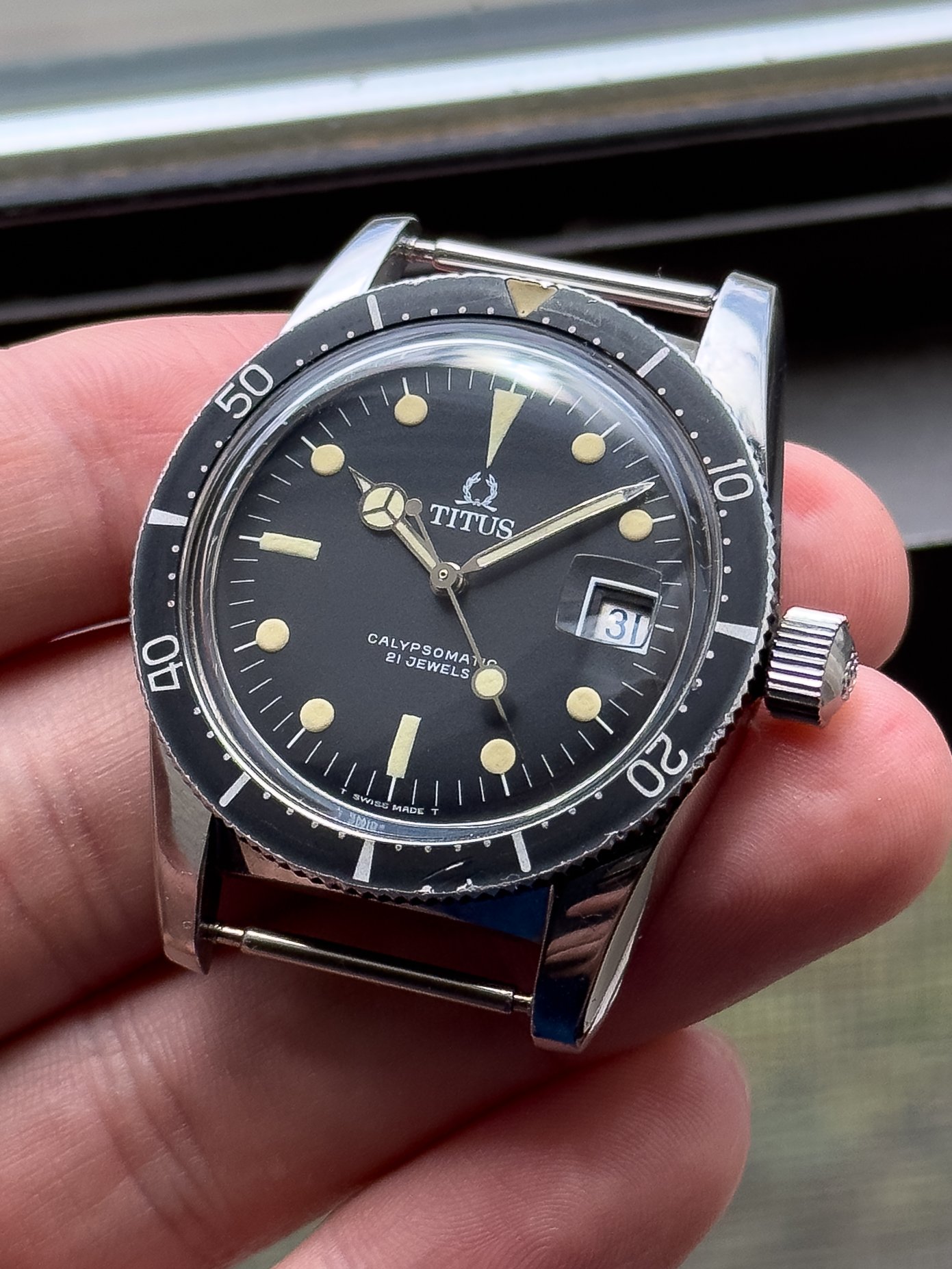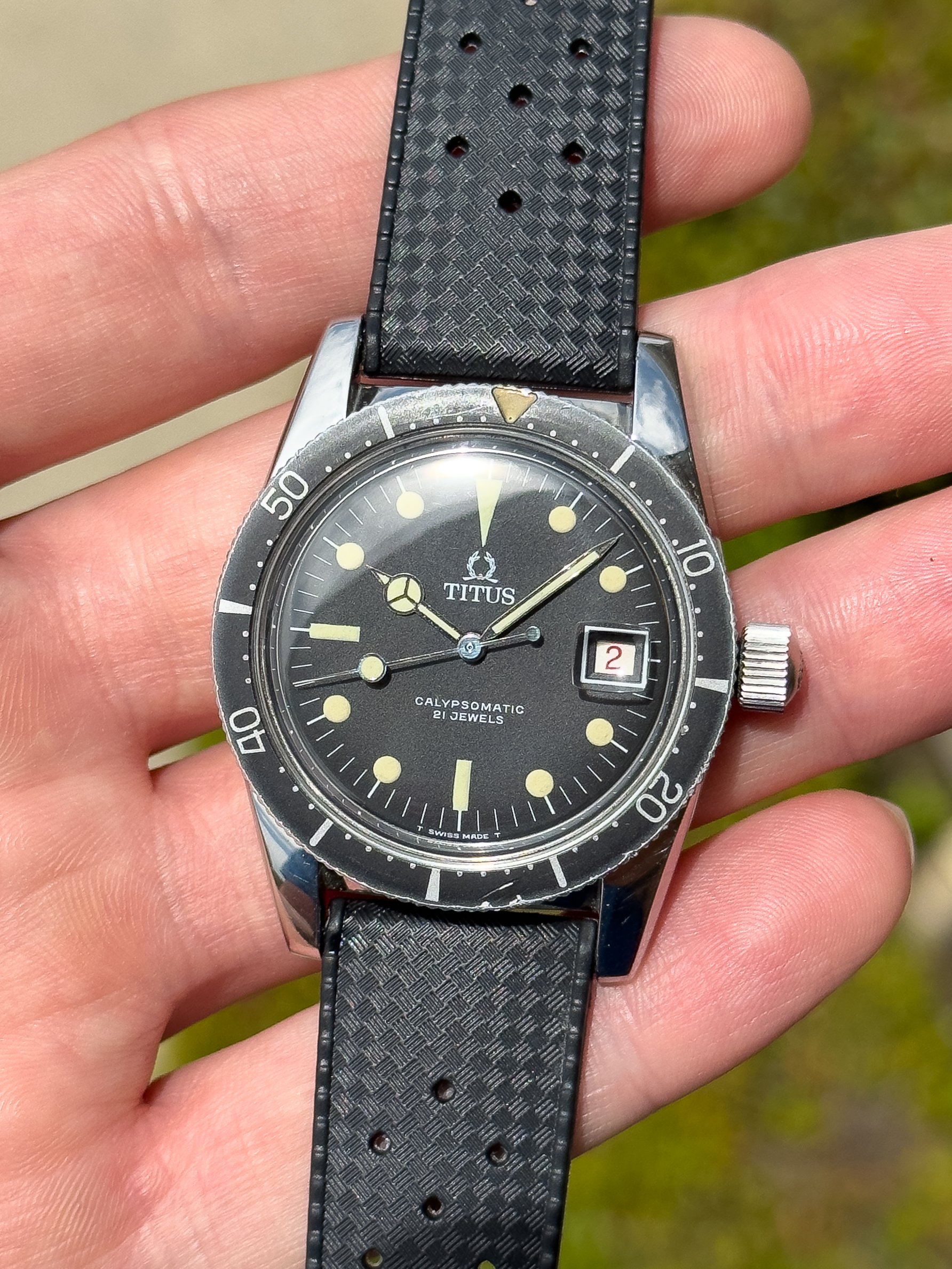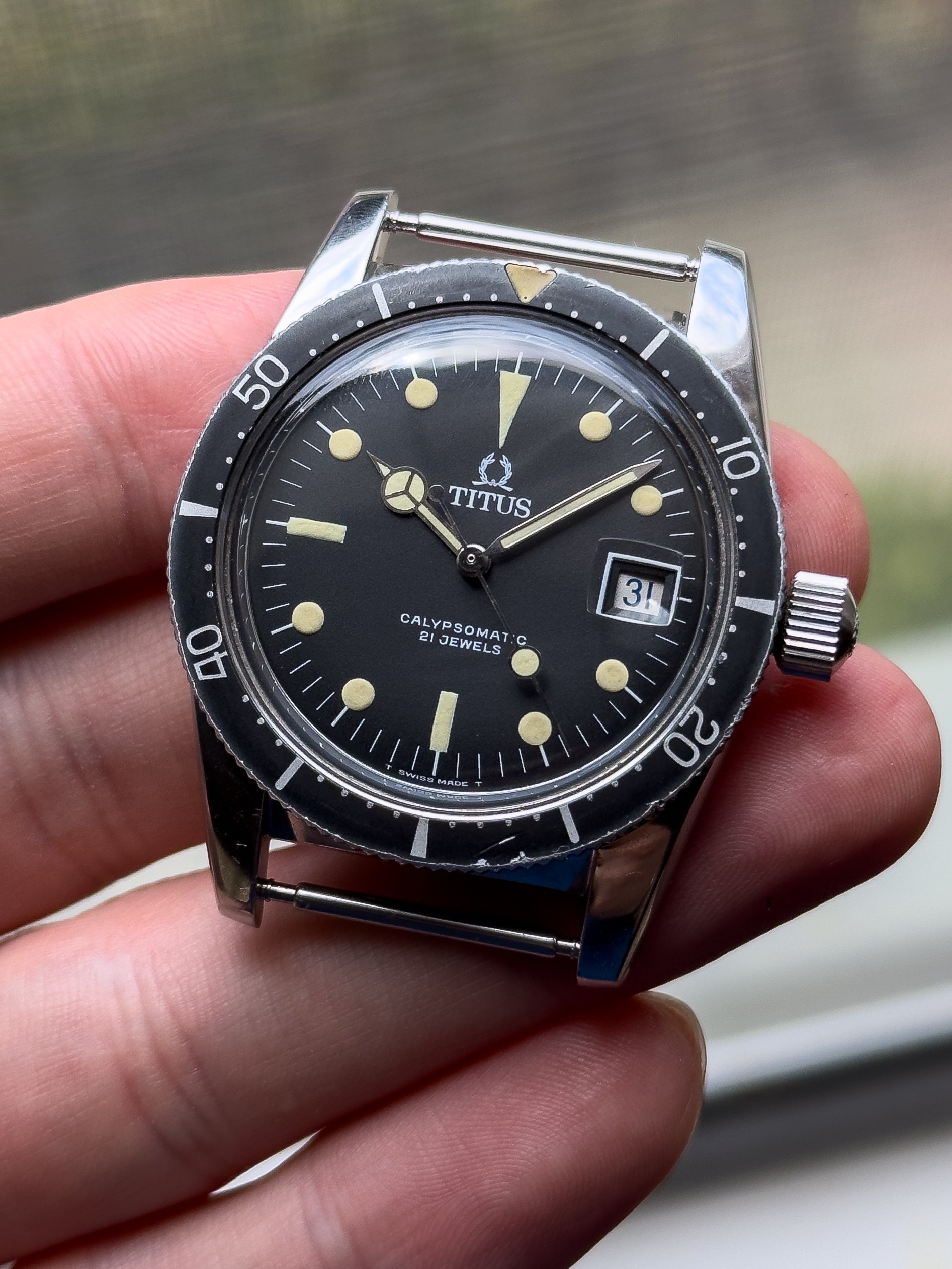 ·For sale is an early 70's Titus Calypsomatic 7986 with big crown, beautiful matte dial, and wonderfully aged tritium hands & dial.