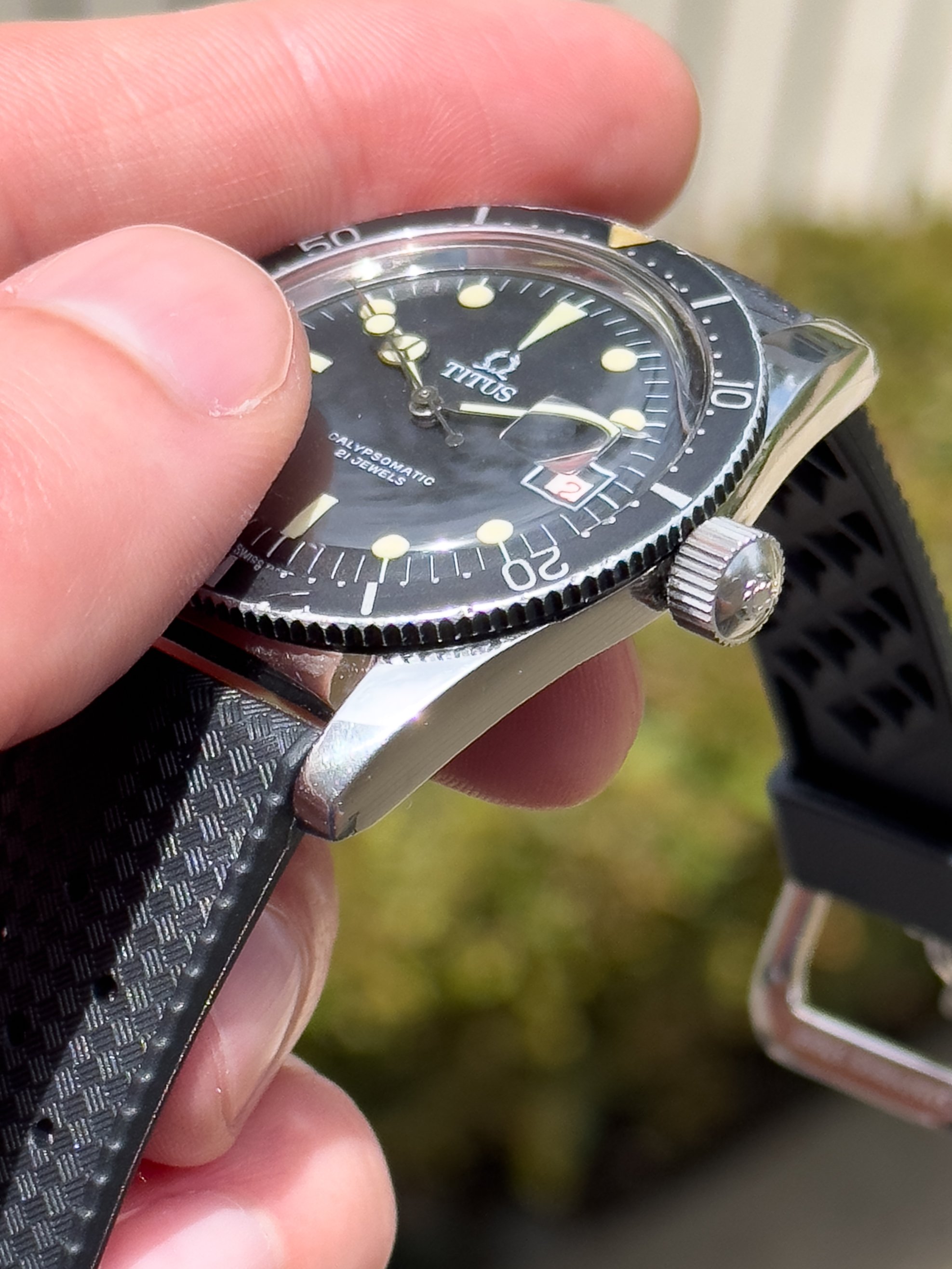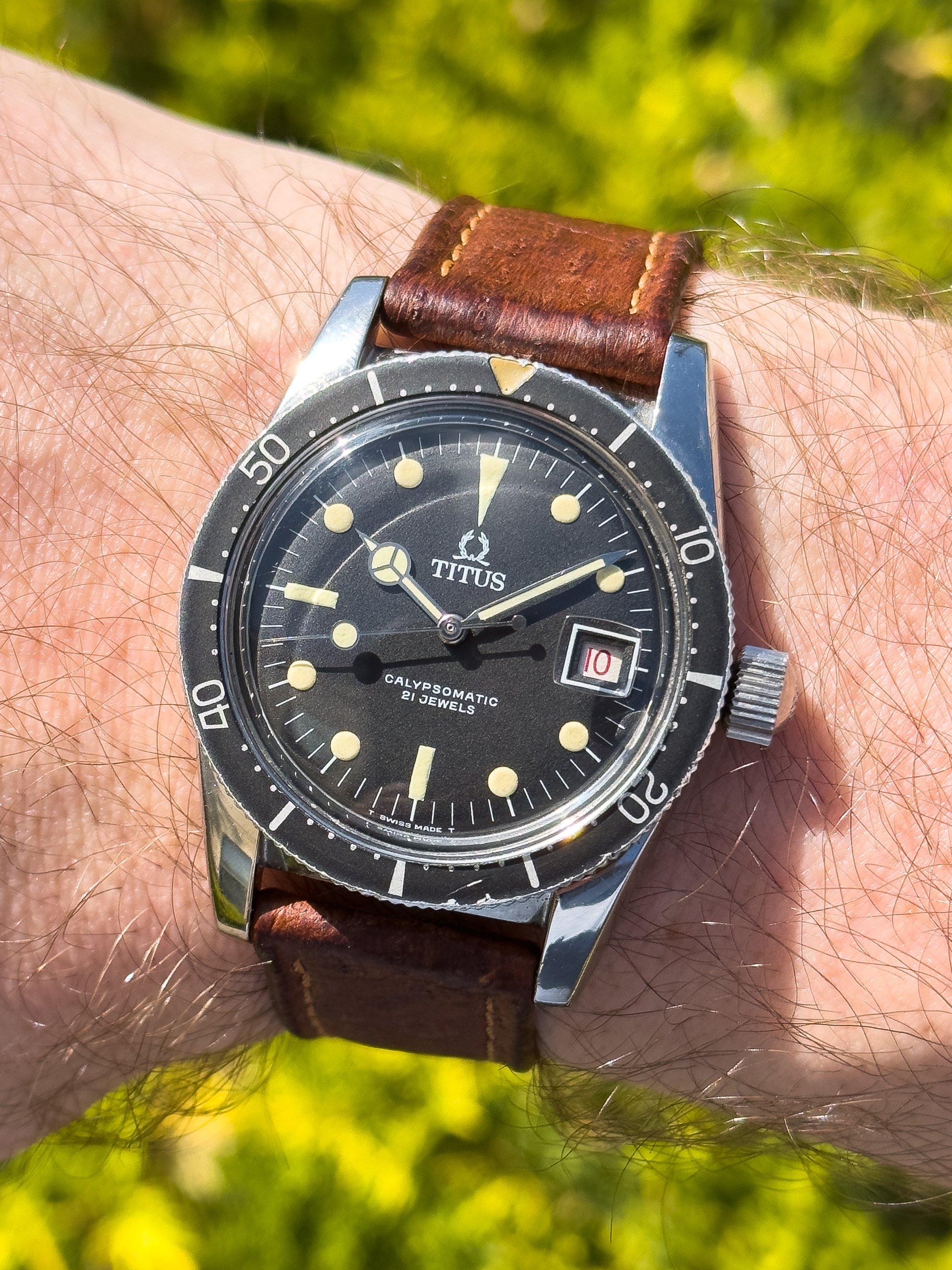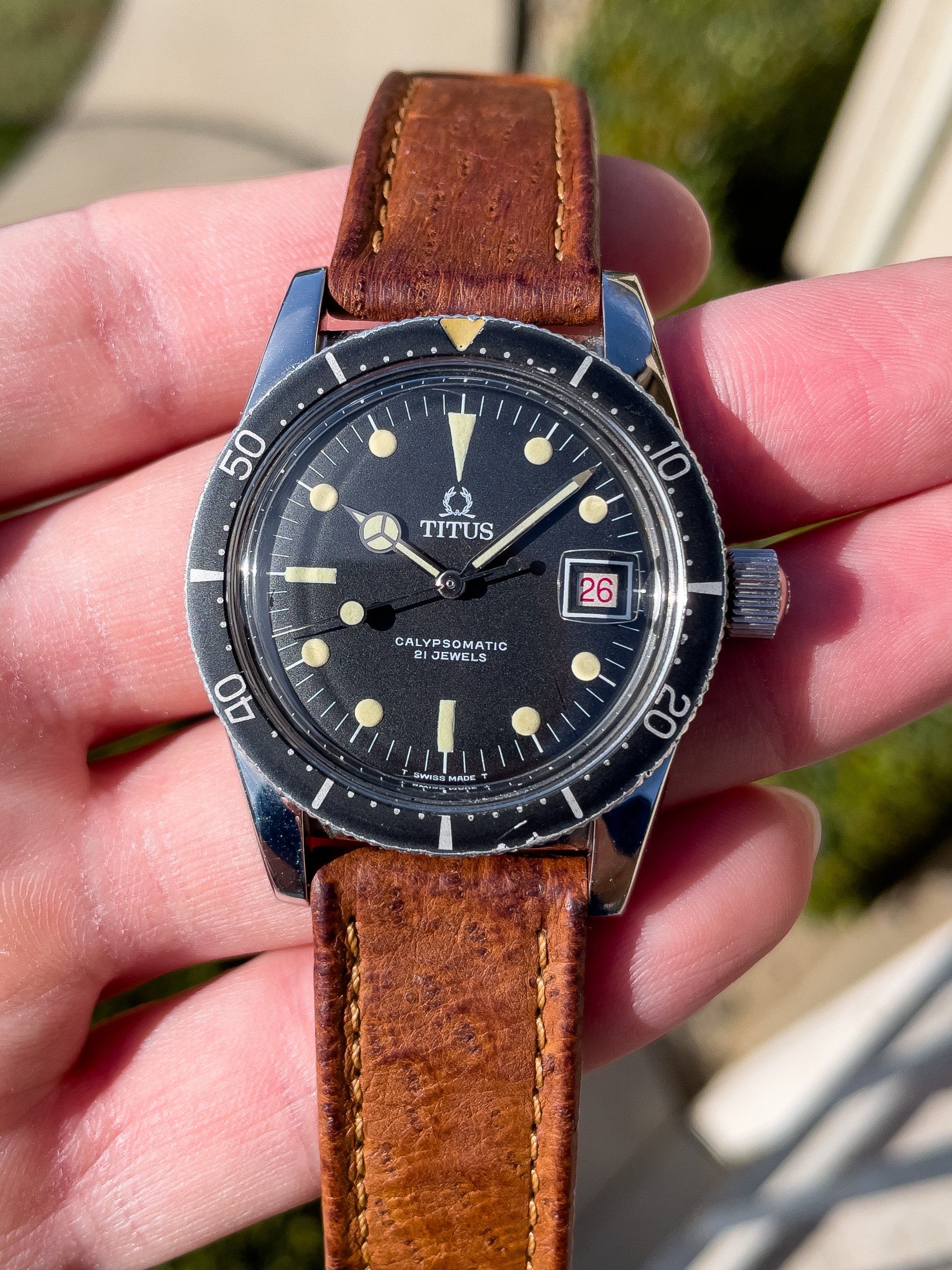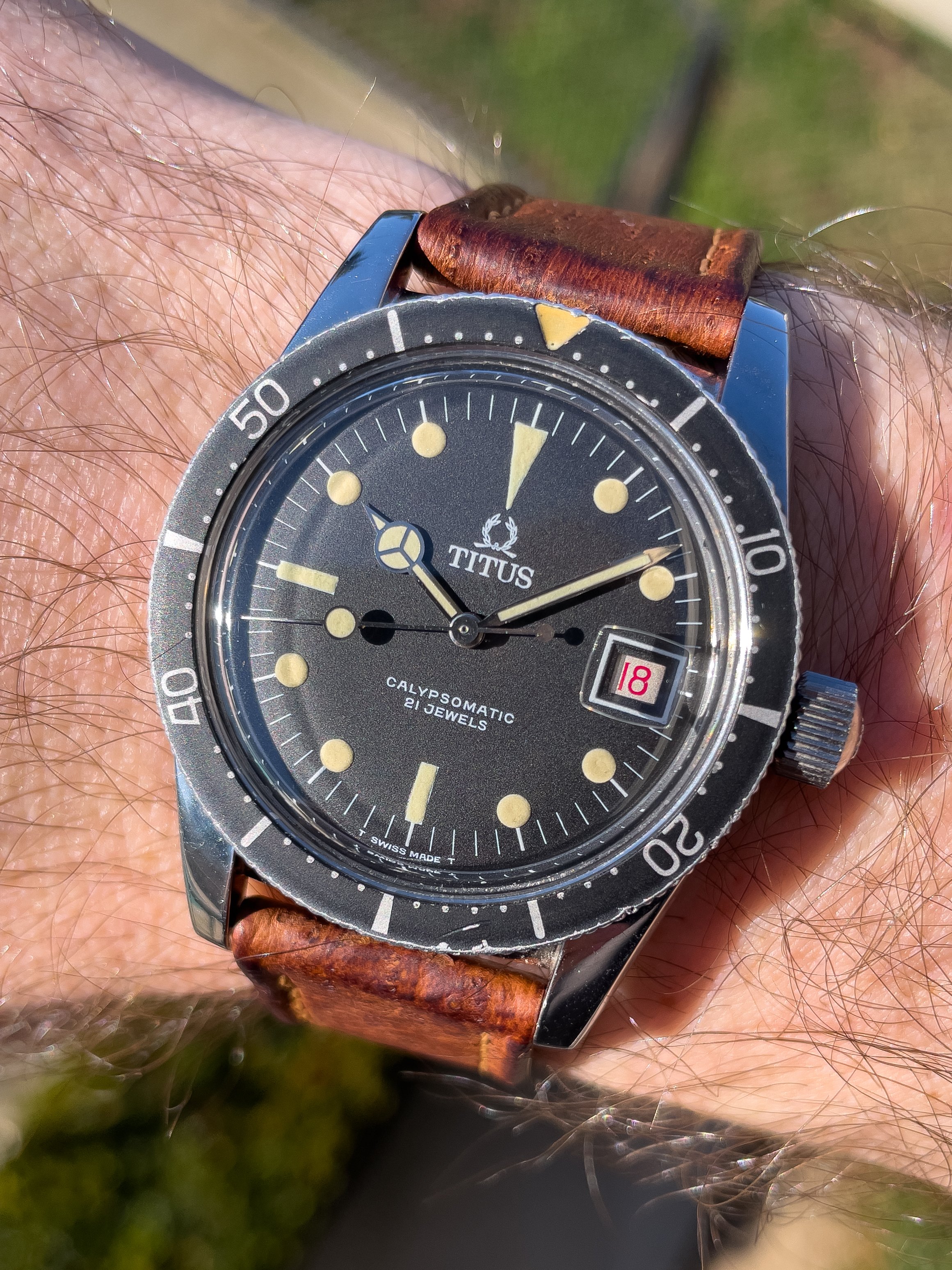 ·For sale is an early 70's Titus Calypsomatic 7986 with big crown, beautiful matte dial, and wonderfully aged tritium hands & dial.