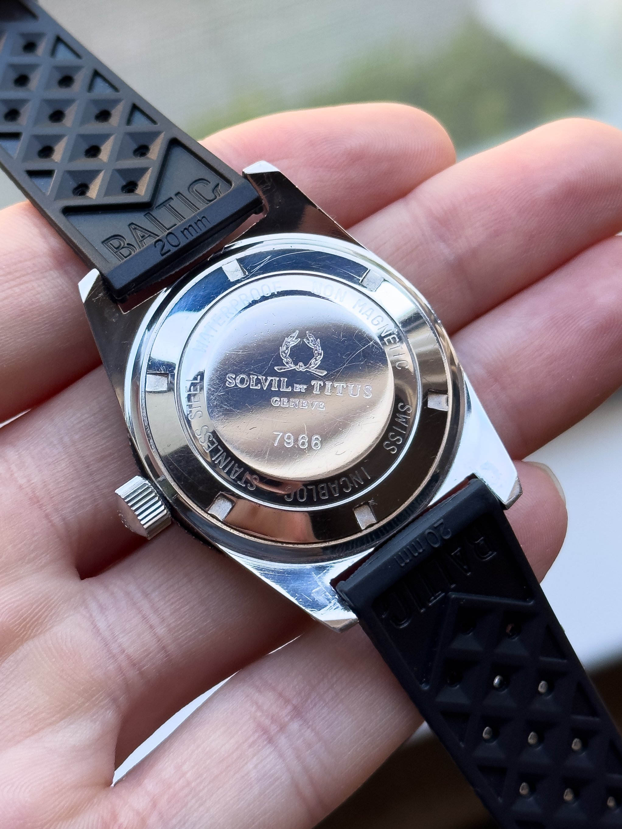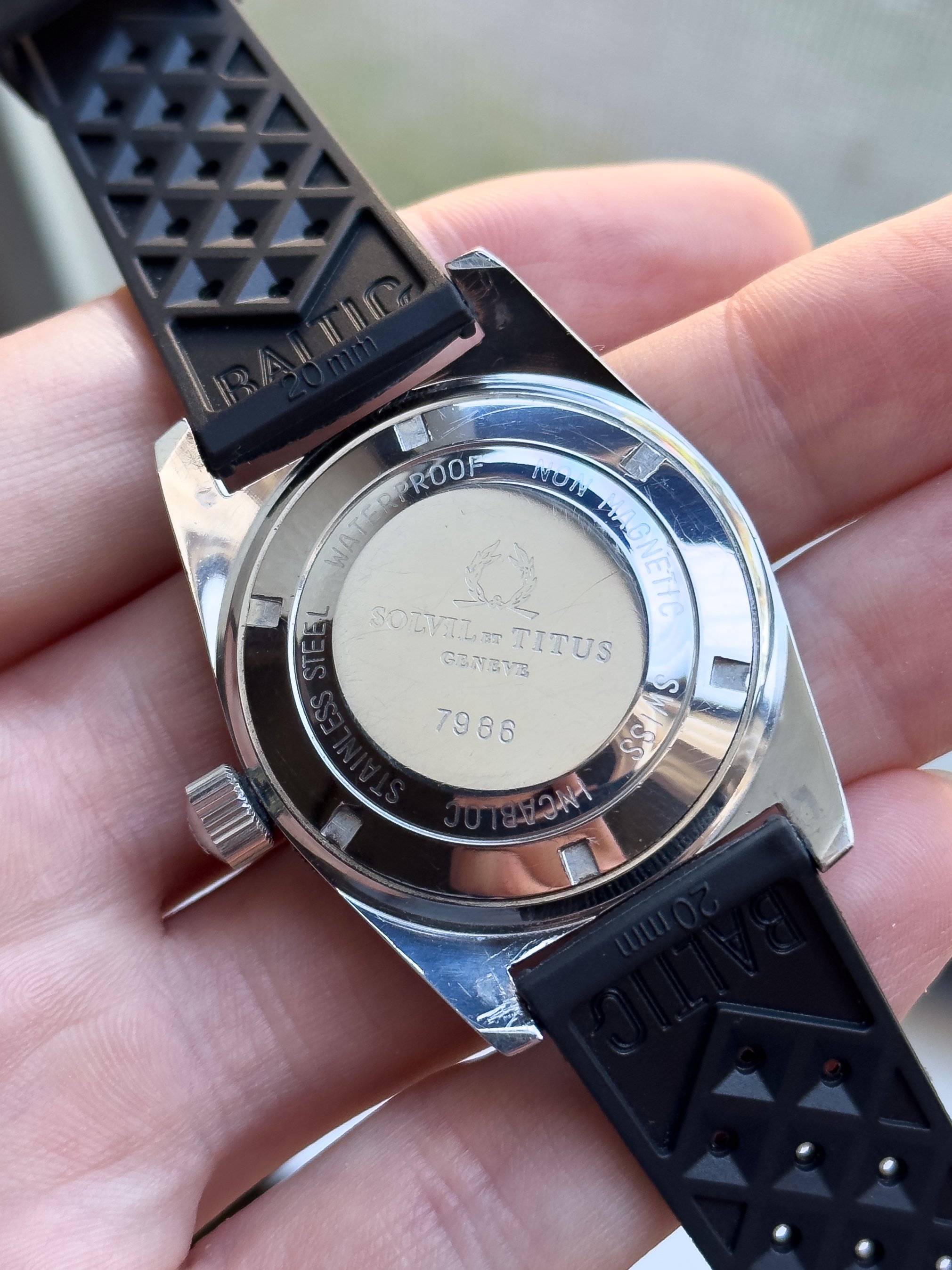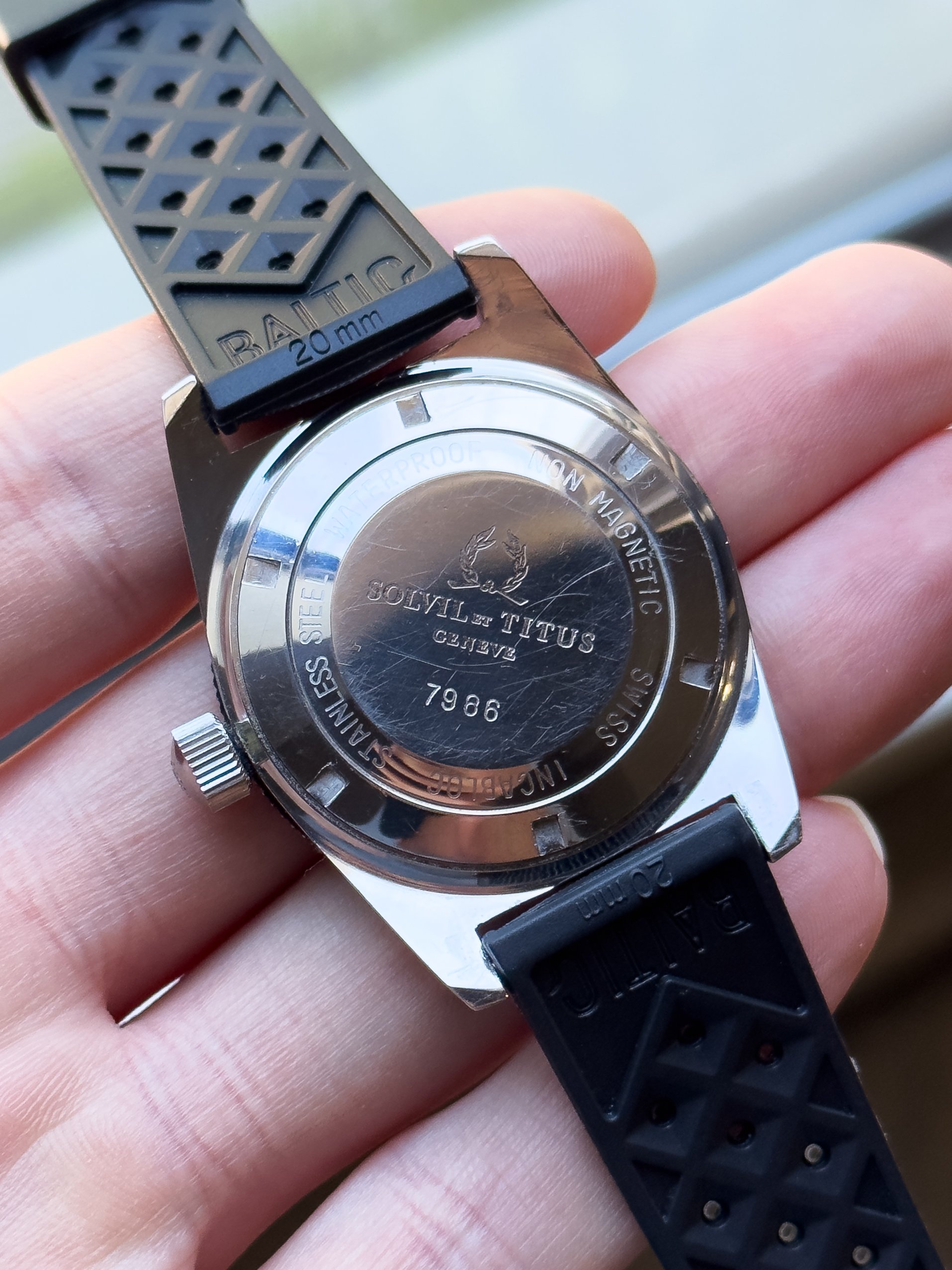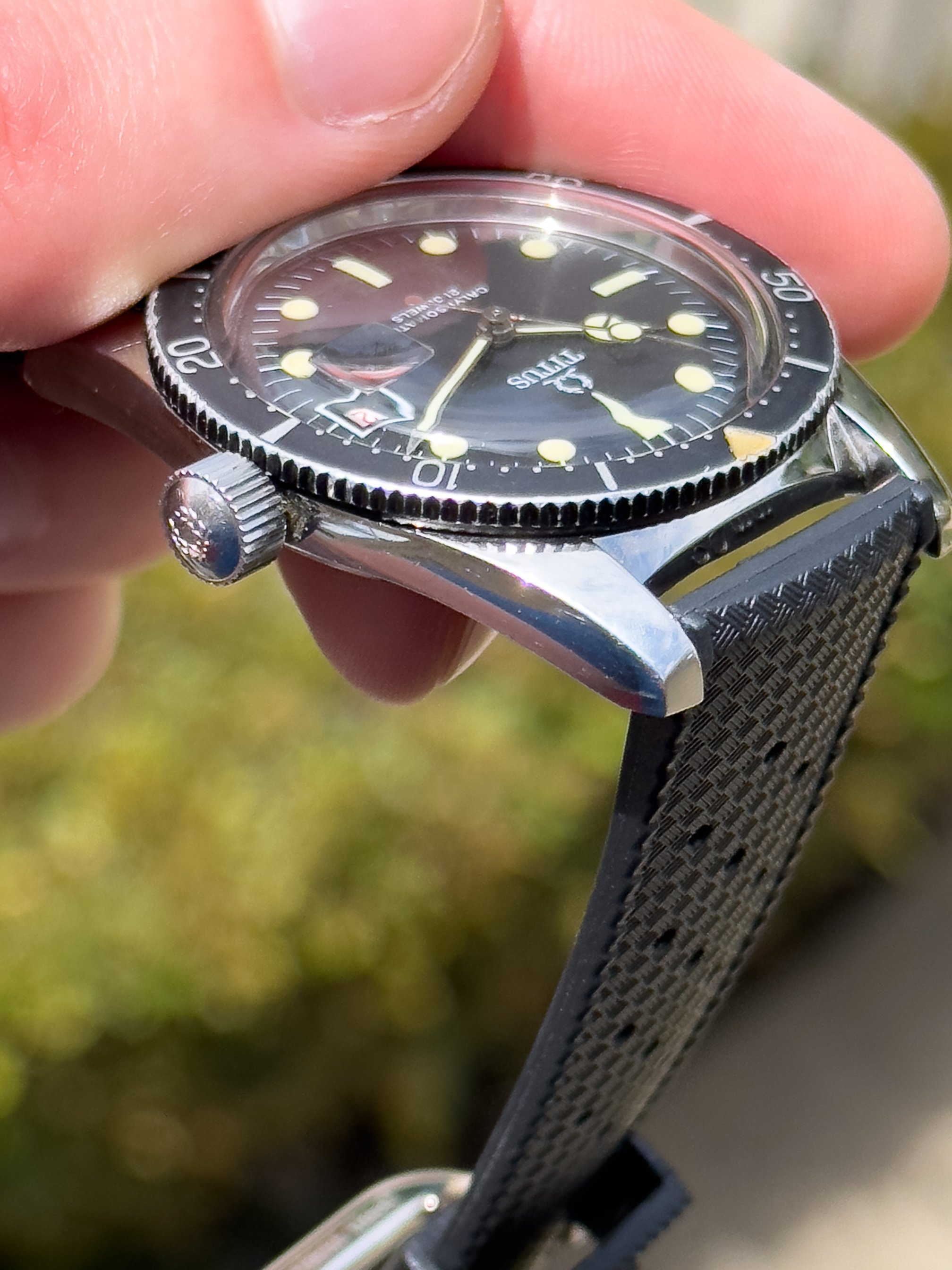 ·For sale is an early 70's Titus Calypsomatic 7986 with big crown, beautiful matte dial, and wonderfully aged tritium hands & dial.