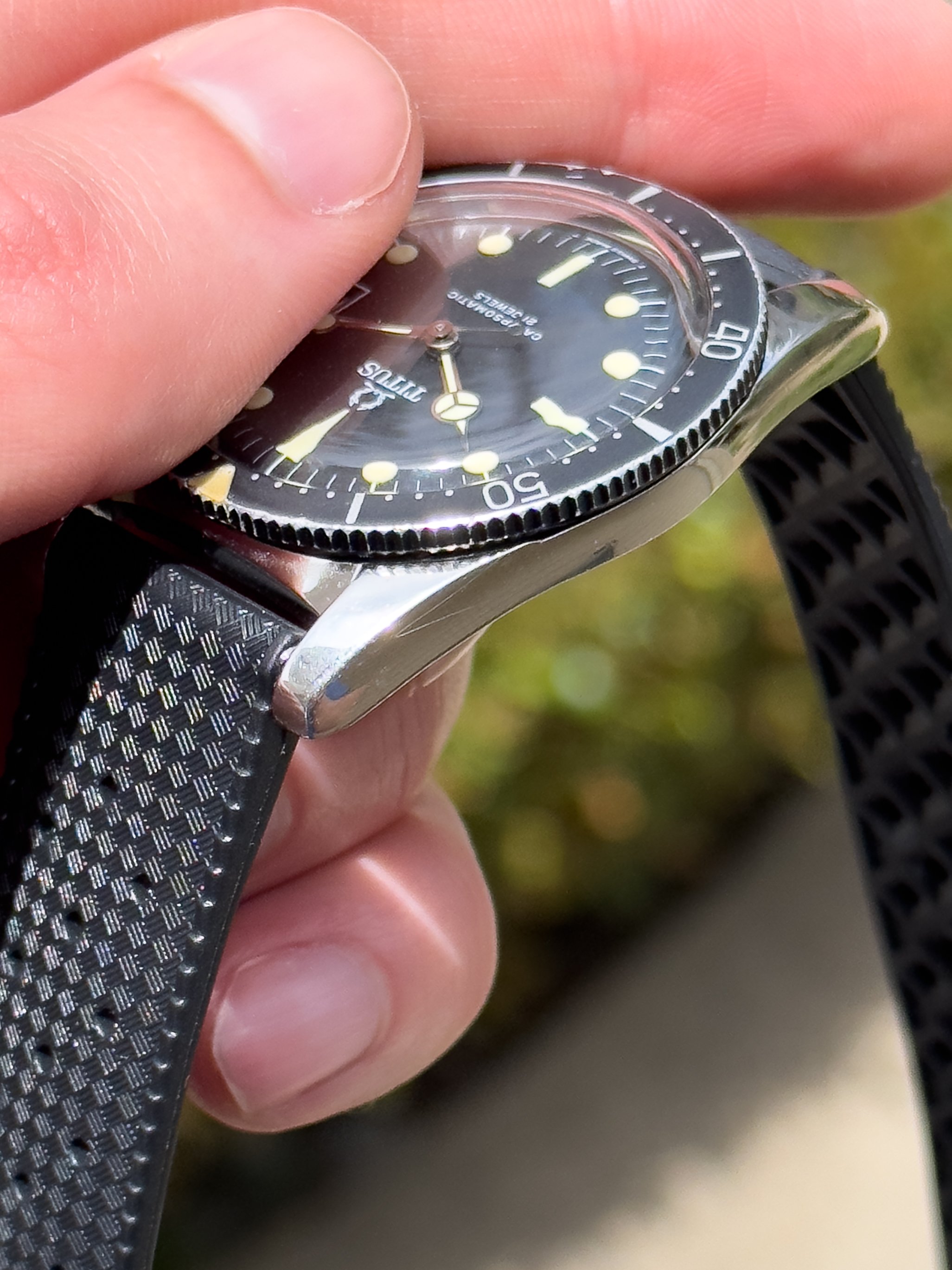 This reference is 37.5mm not including crown and very comfortable to wear. For reference, my wrist is just over 7". This will come on a modern Baltic rubber strap that obviously isn't original to the watch, however, it is the correct style strap for the time. Overall the case is in excellent condition with few superficial scratches, which is commensurate with age. The lug width is 20mm. The black bezel is in overall great shape and has a nice even fade to it. There is a small scratch to the right of the indicator for "30" on the bezel. The entire bezel including the coin edge is black, however, over time the lip of the bezel has gone evenly polished around the entire bezel. The magnified crystal is clean inside and out and shows off the beautiful textured matte dial. The original tritium lume has aged beautifully and as you would expect, reacts to light but quickly fades. As said in the title, this reference has a big crown and the crown is original, signed, and screws down smoothly and securely. Unscrewing the crown puts you in position to wind and the ETA 2472 movement winds smoothly and immediately comes to life. It looks to have been serviced at some point as there are markings on the inside of the case back, but I don't have any service history. It keeps great time and has a healthy power reserve. I have reliably worn this daily for long stints and have not experienced an issue. The date wheel rotates between navy blue and red. The caseback shows the most wear from actual wear/usage but it is largely superficial. There are multiple reflective surfaces on the caseback, so I took plenty of photos to highlight the complete condition. I believe this just about sums it up, but please message me with any questions.