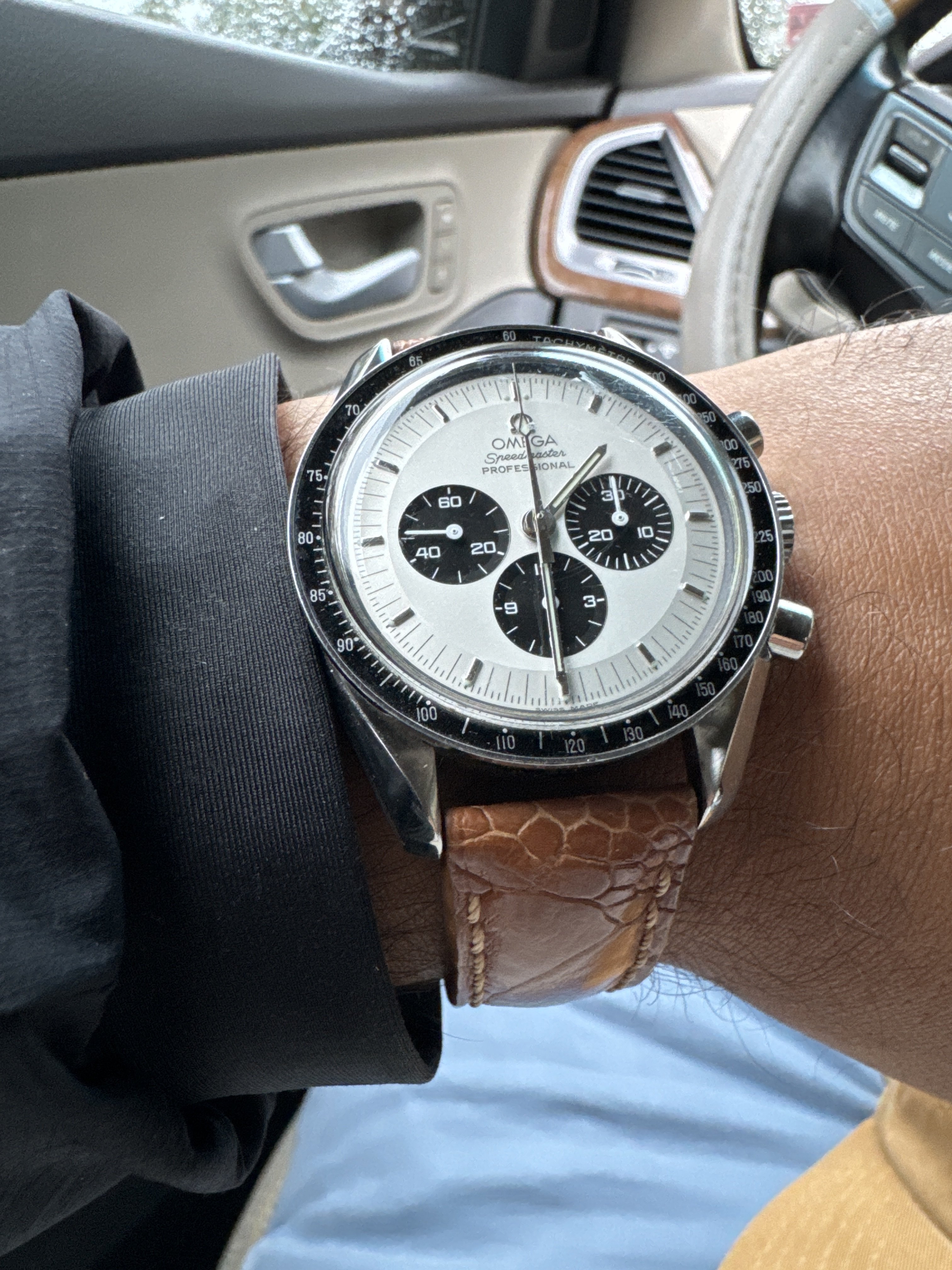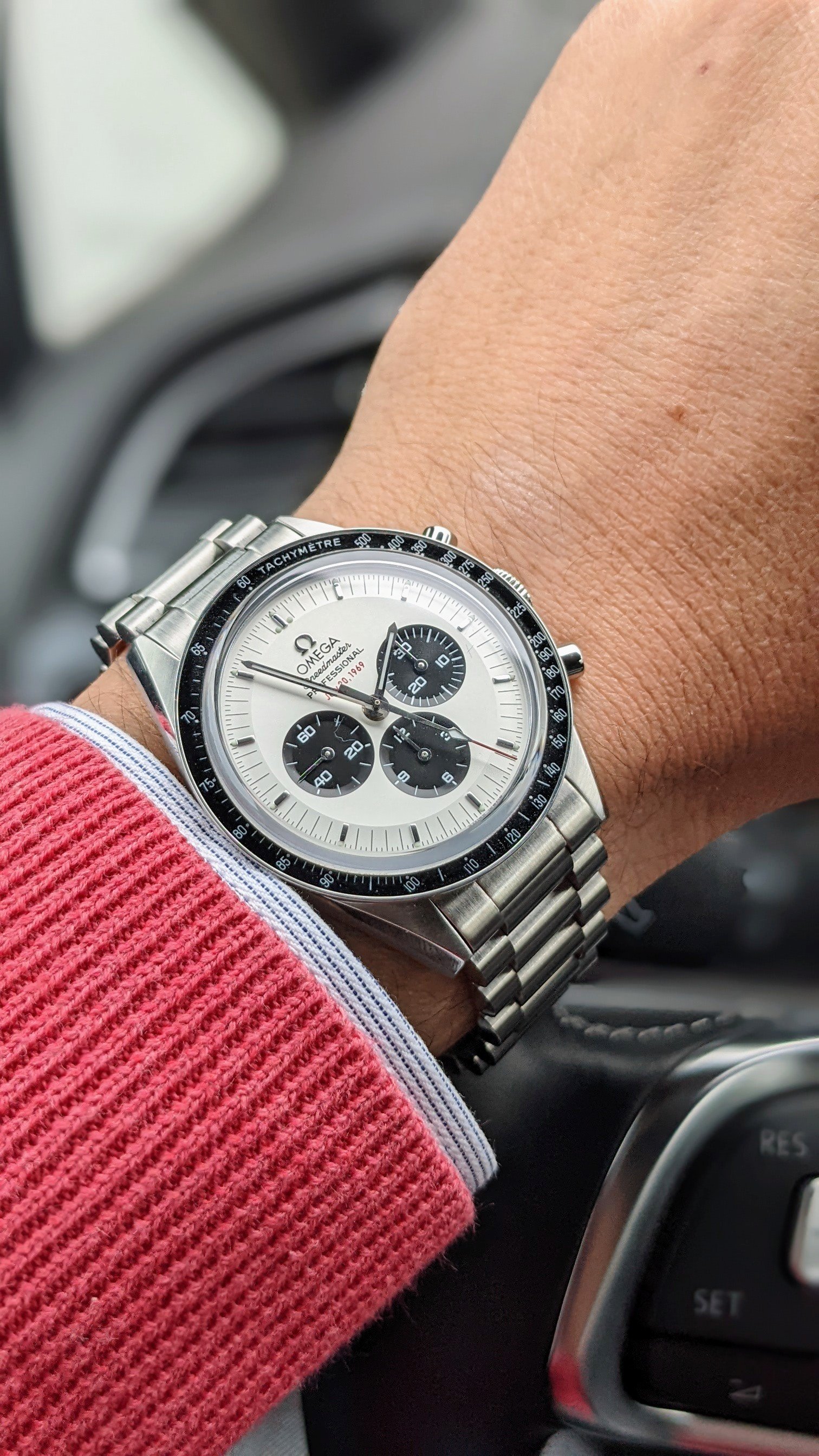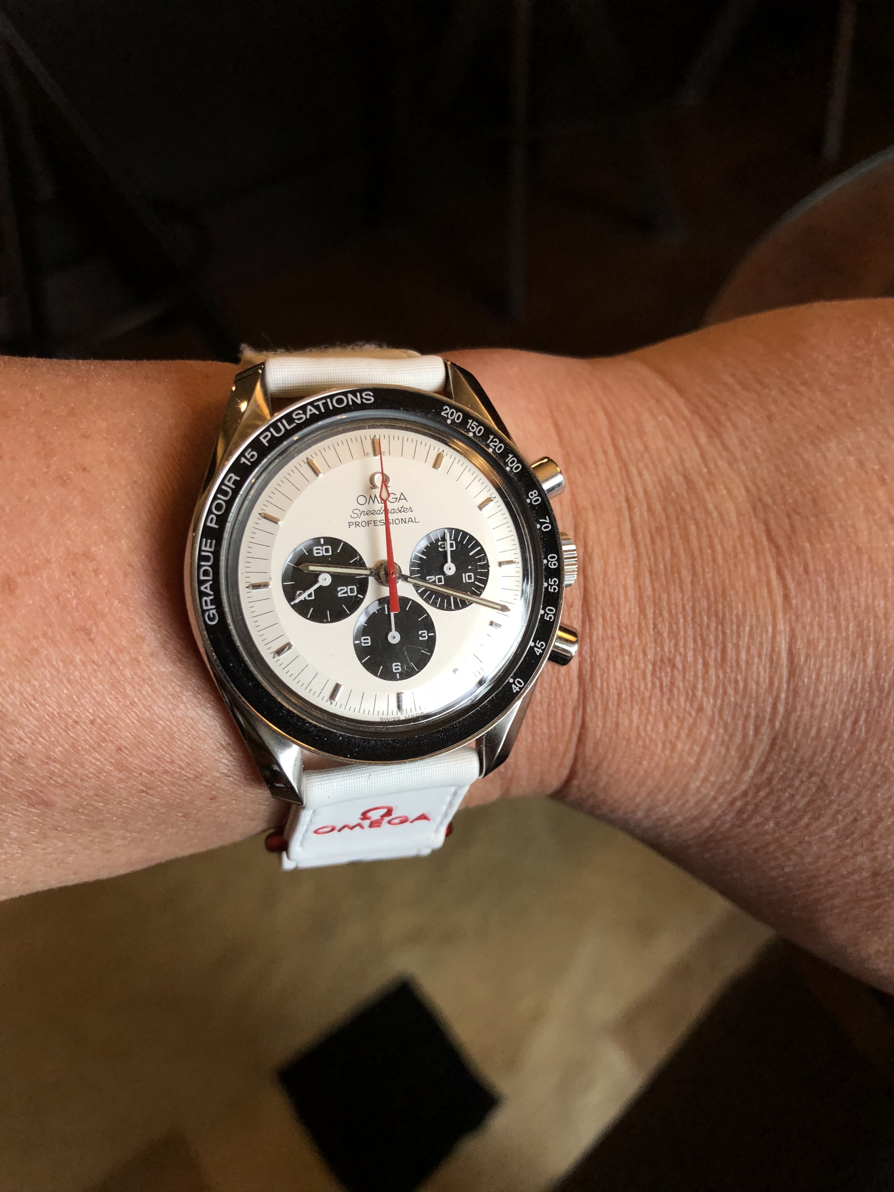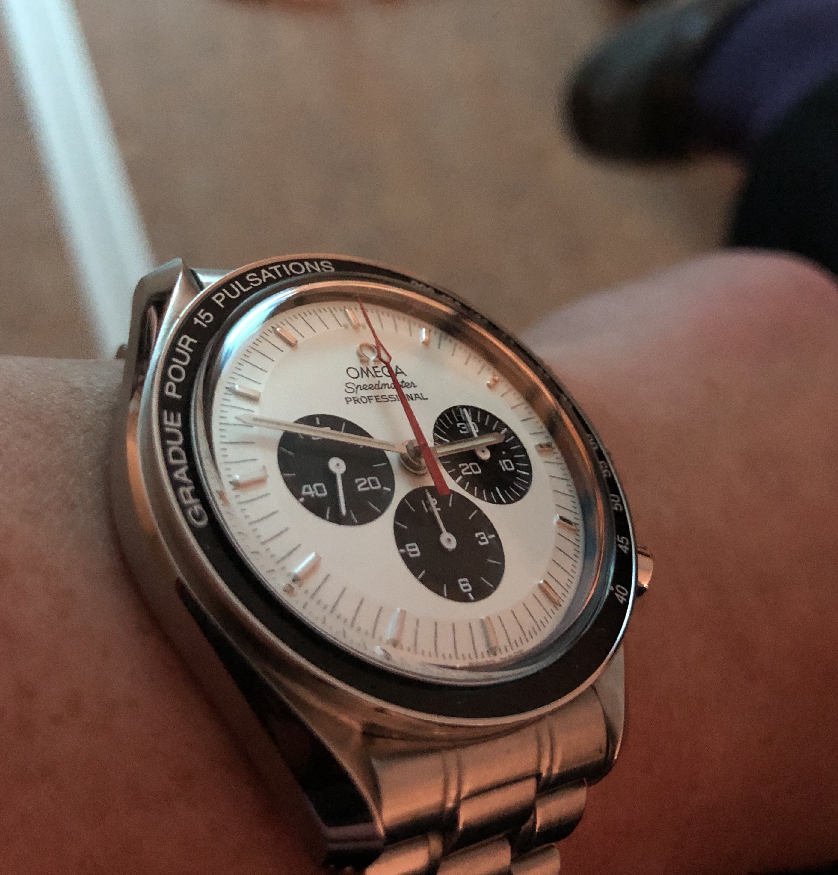 ·I was in the same boat a couple of years ago. I found a reasonably priced, almost new hesalite version and bought it after I found a set of hands and a dial in unopened packages. I had an Omega certified watchmaker swap the dial and hands onto it thinking I'd have two speedy's, with completely different looks to wear. Unfortunately, without my reading glasses, I can't read the dial well enough (for reasons explained above) to justify wearing it. Since I can see all my other watches without glasses, I just don't wear the Mitsukoshi mod. To date, I've only worn it to two Christmas parties. I just can't bring myself to part with it. One day I will offer it up.
