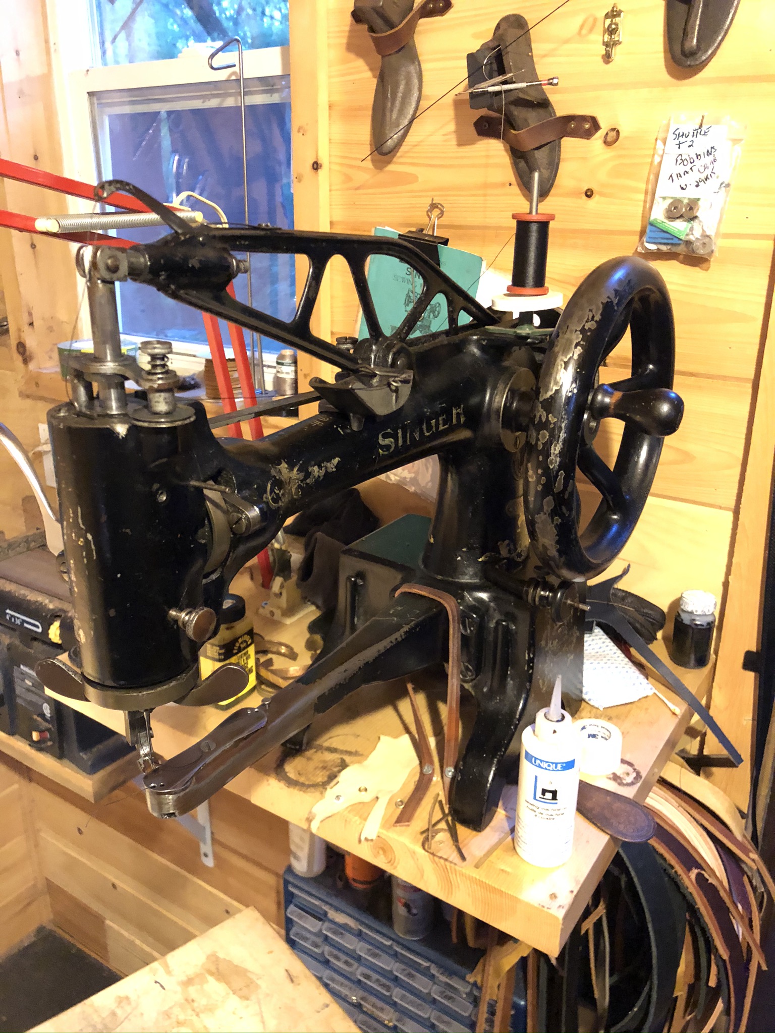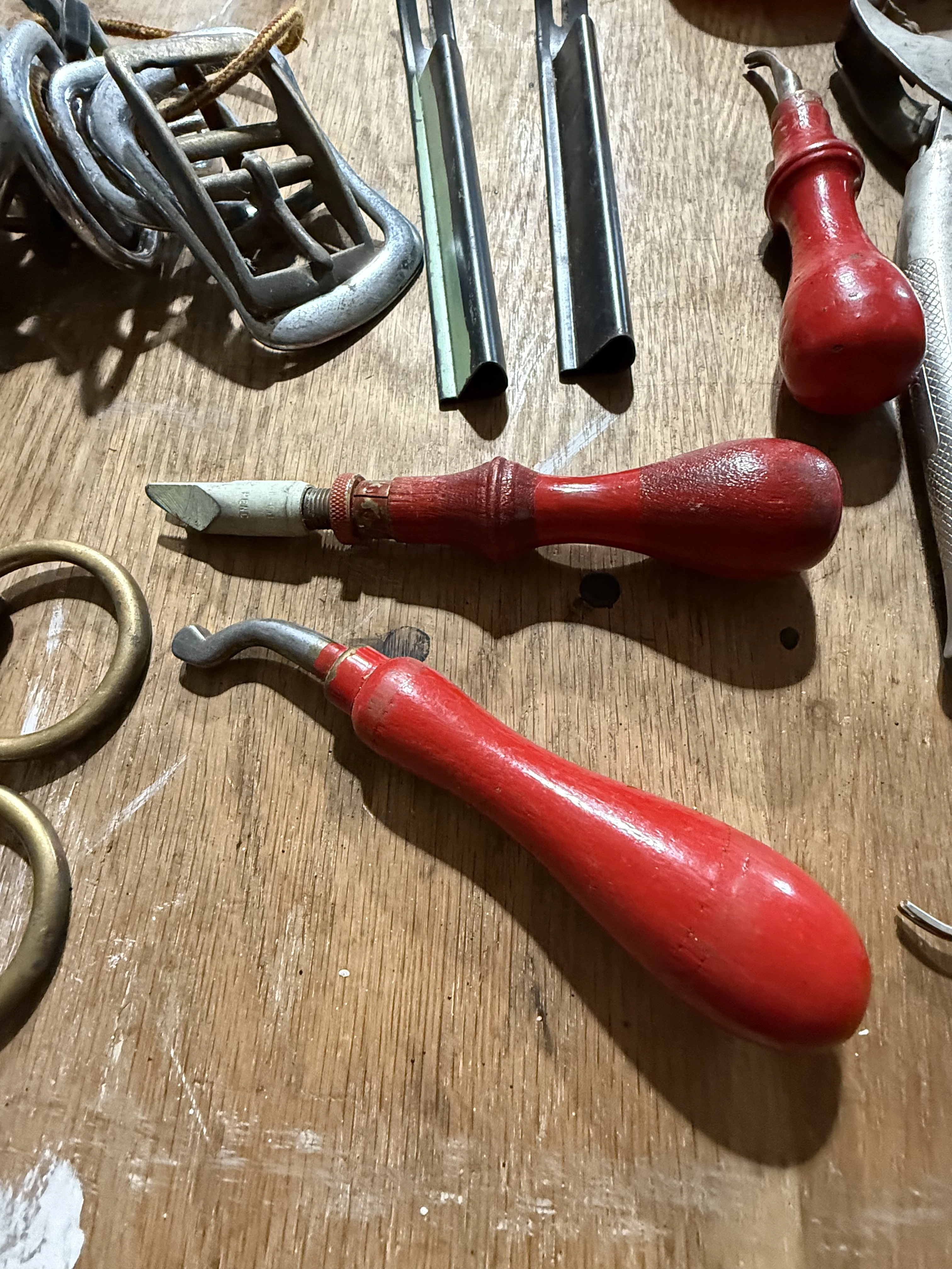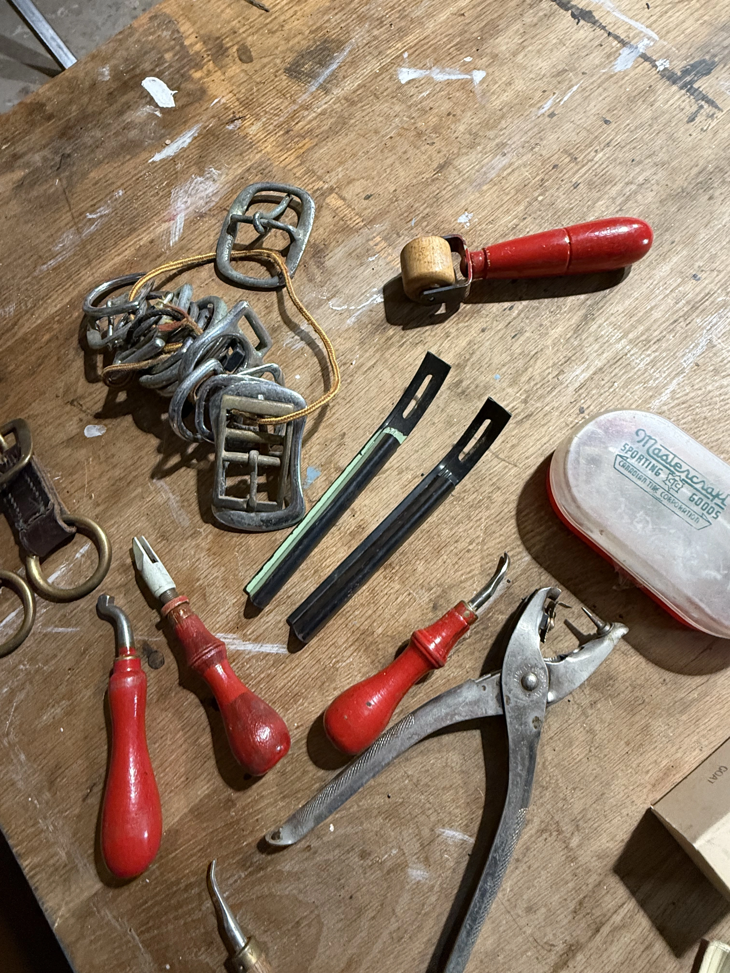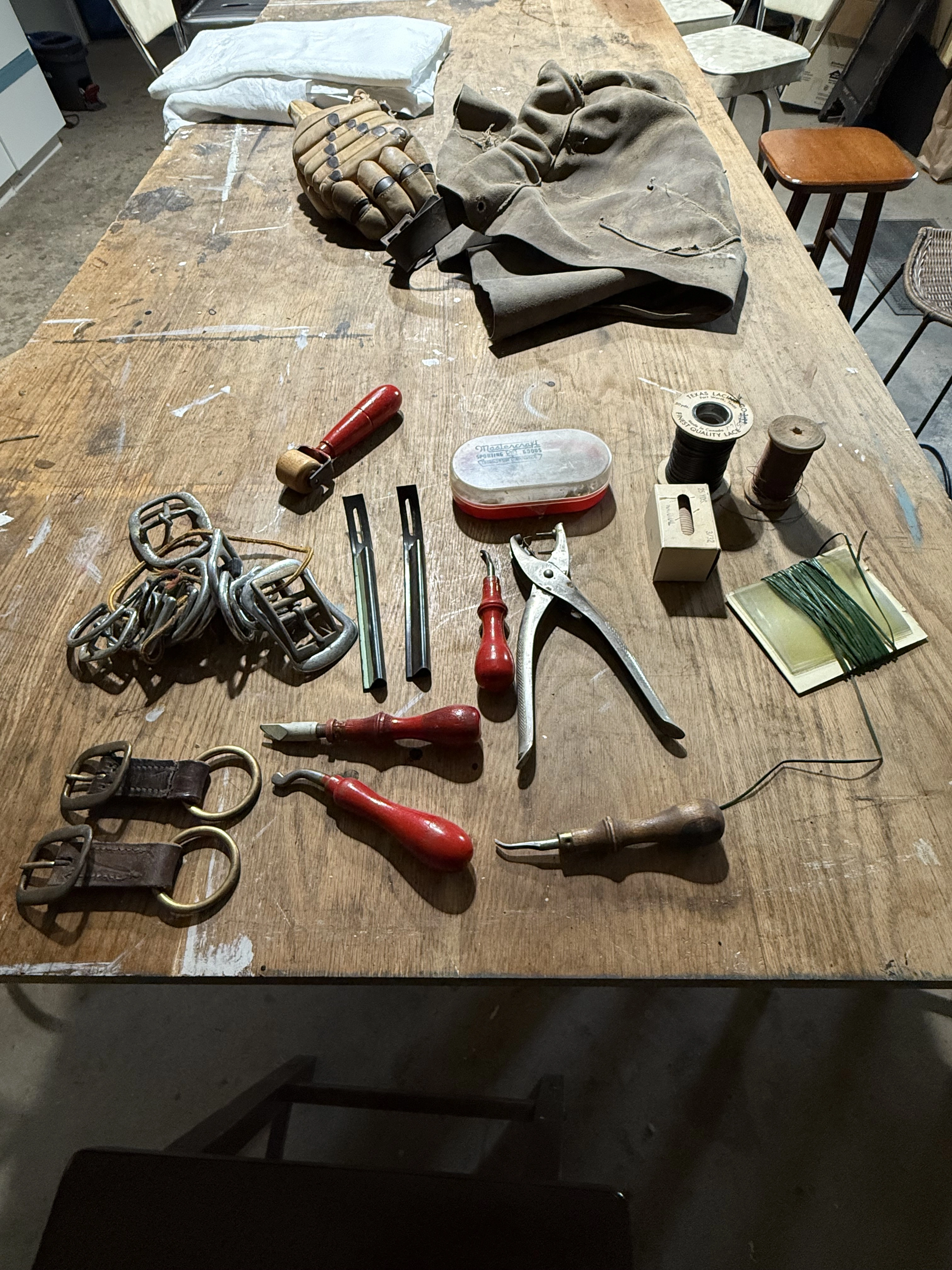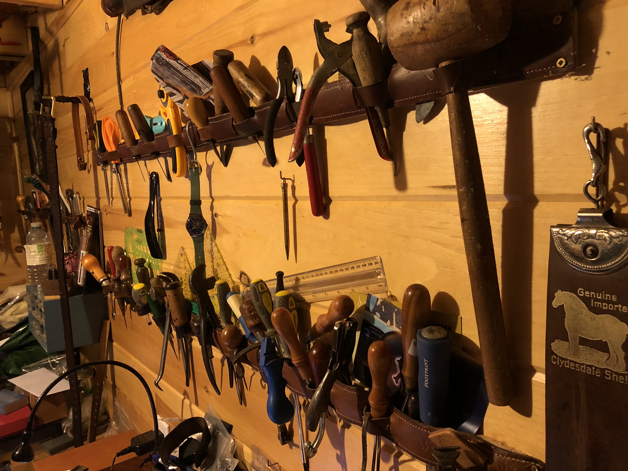 List: Adler patcher, Special straps for a big man, Anvils, Clamps to bond leather, Hammers, Boot/shoe stretchers for the mrs’ Ferragamo collection, Edge creaser, Edge beveler, Channel making tool, Awl, Cutting board / rotary cutter and ruler, Skiver to thin leather (looks like a razor), Potbelly stove for winter, Singer patcher, Strap cutter for belts, Longines too that I added just because it’s cool, Hand tools on a wall bracket that I made out of leather, Old fur removal blade (looks like Damascus), Swatch (works!), Needles, Singer 201, Old Ikea bench for naps (this is the upstairs of my shop), Heavy duty leather cutter and skiver, Thread, Punches (old ones from England are the best I’ve used), Leather scissors, I have no idea what the hand tool with the conical expanding end is for. Some type of pain implement? A strap end punch, Buffing pad, and my favorite blade that I strop regularly.