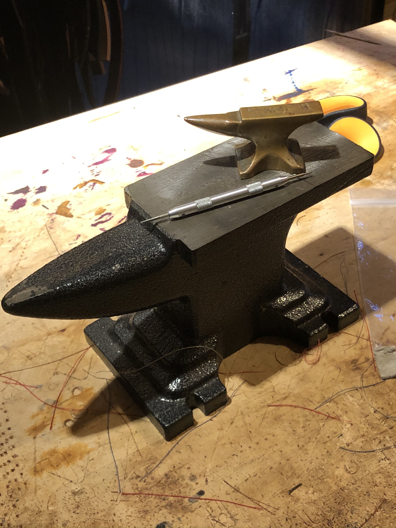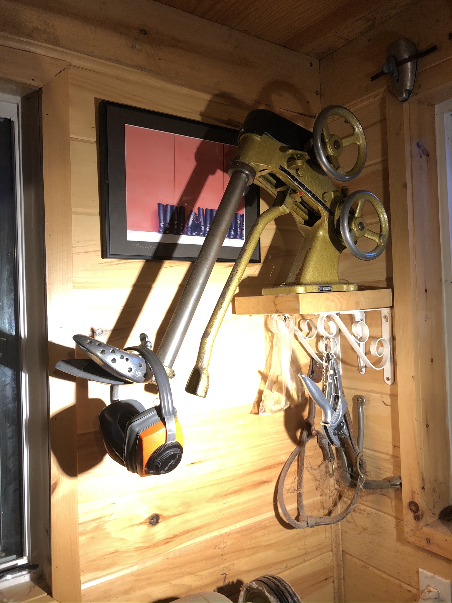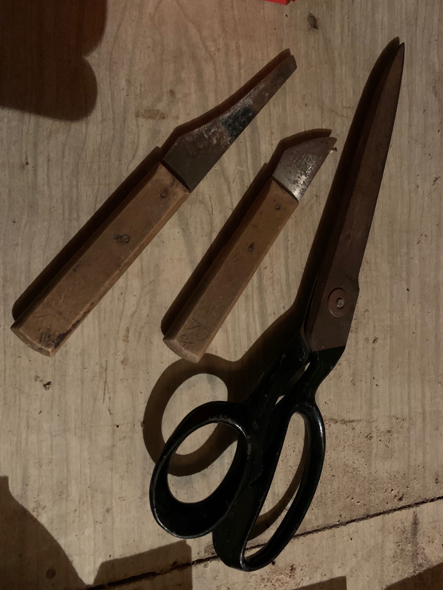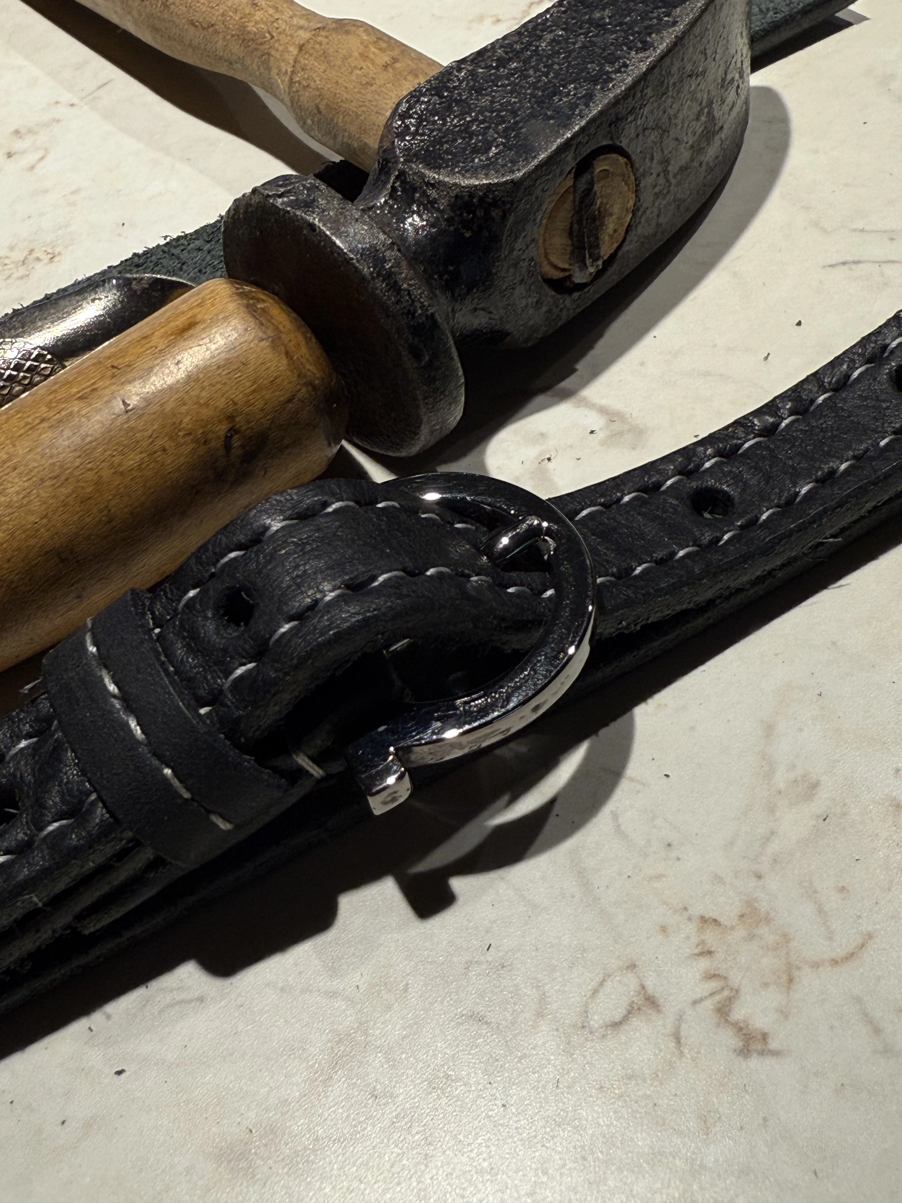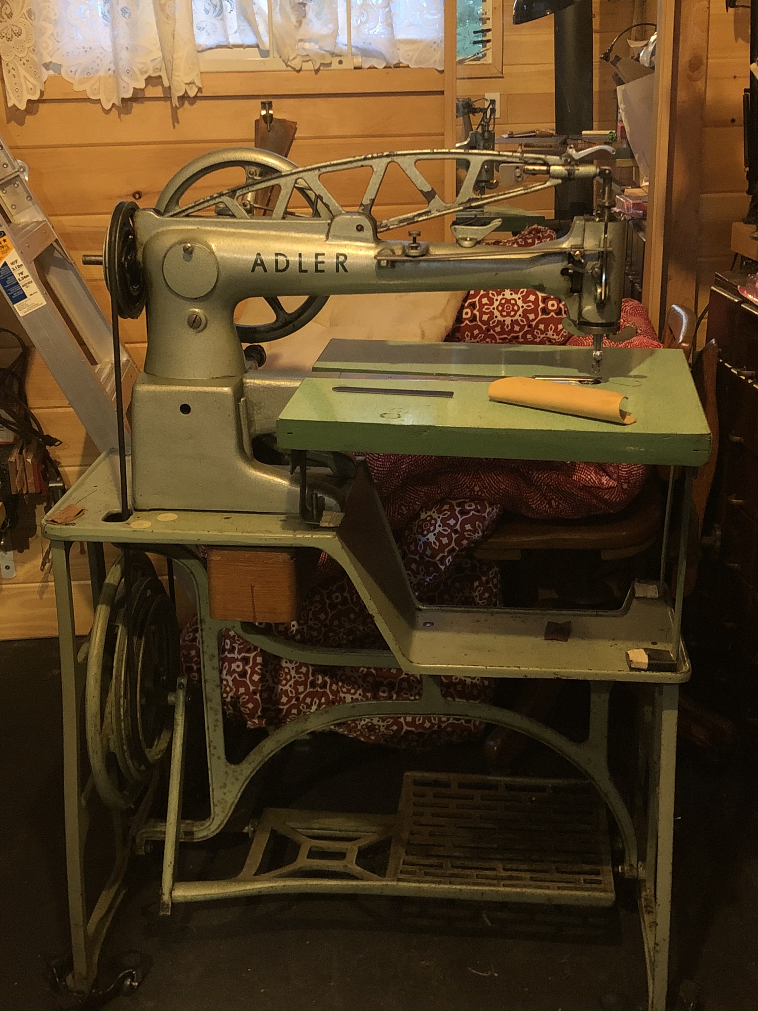 List: Adler patcher, Special straps for a big man, Anvils, Clamps to bond leather, Hammers, Boot/shoe stretchers for the mrs’ Ferragamo collection, Edge creaser, Edge beveler, Channel making tool, Awl, Cutting board / rotary cutter and ruler, Skiver to thin leather (looks like a razor), Potbelly stove for winter, Singer patcher, Strap cutter for belts, Longines too that I added just because it’s cool, Hand tools on a wall bracket that I made out of leather, Old fur removal blade (looks like Damascus), Swatch (works!), Needles, Singer 201, Old Ikea bench for naps (this is the upstairs of my shop), Heavy duty leather cutter and skiver, Thread, Punches (old ones from England are the best I’ve used), Leather scissors, I have no idea what the hand tool with the conical expanding end is for. Some type of pain implement? A strap end punch, Buffing pad, and my favorite blade that I strop regularly.