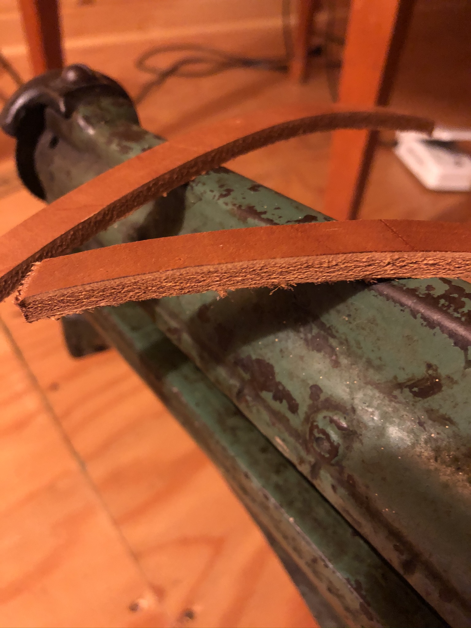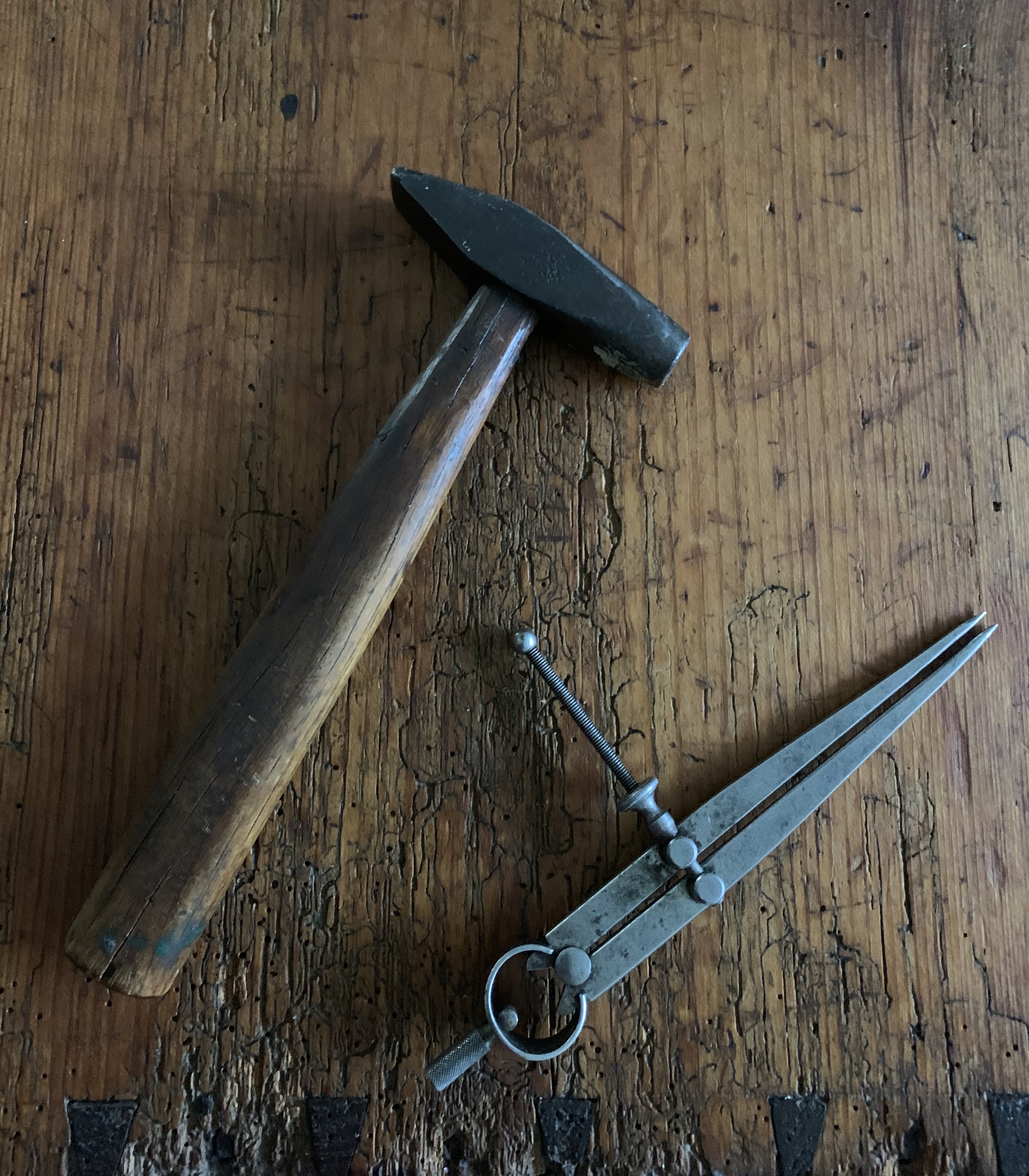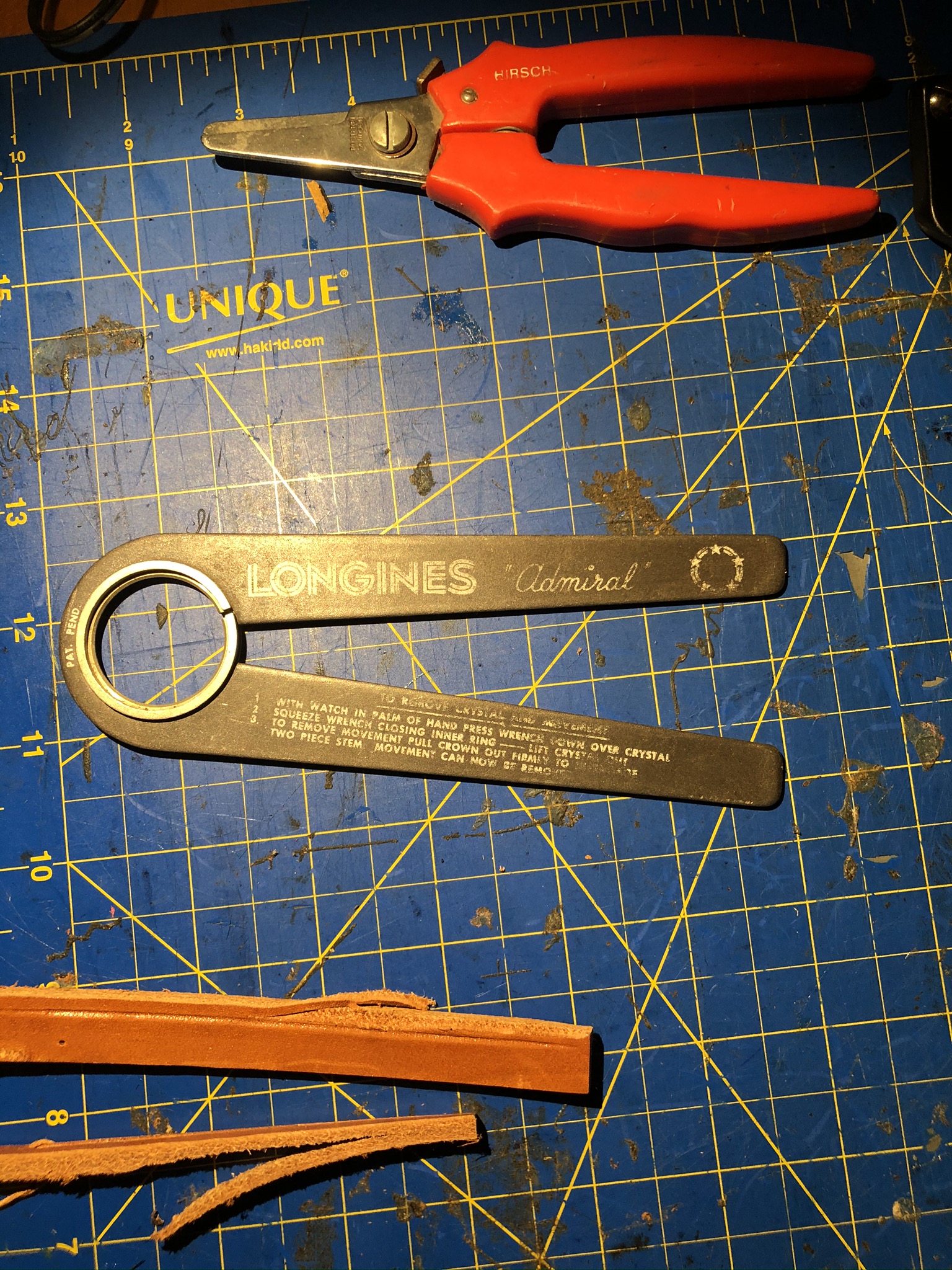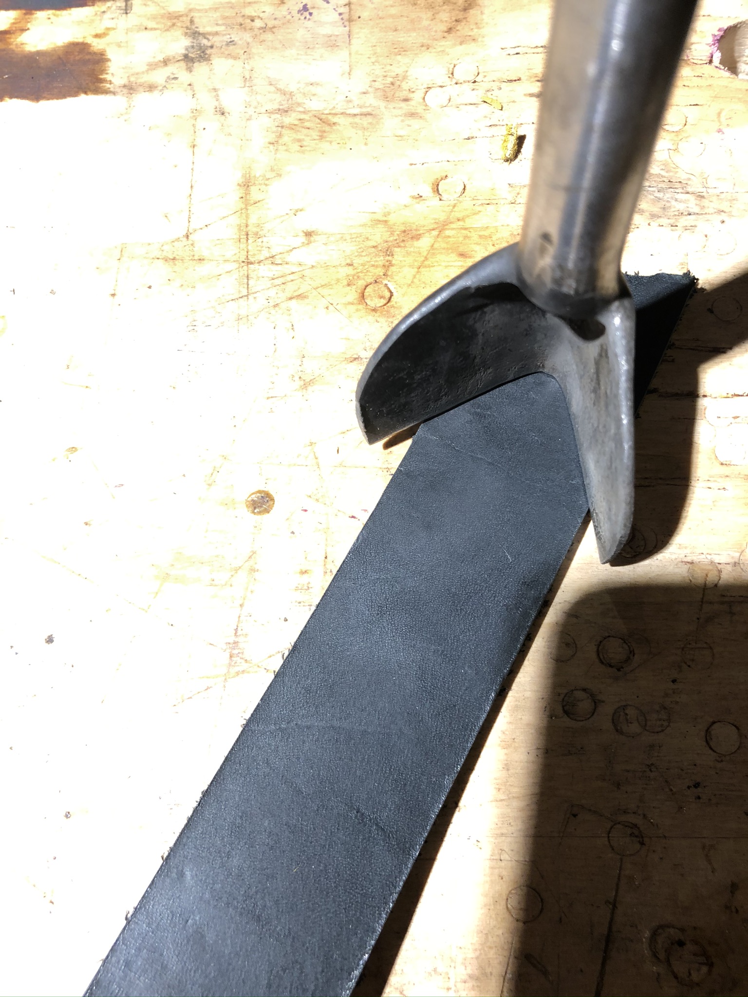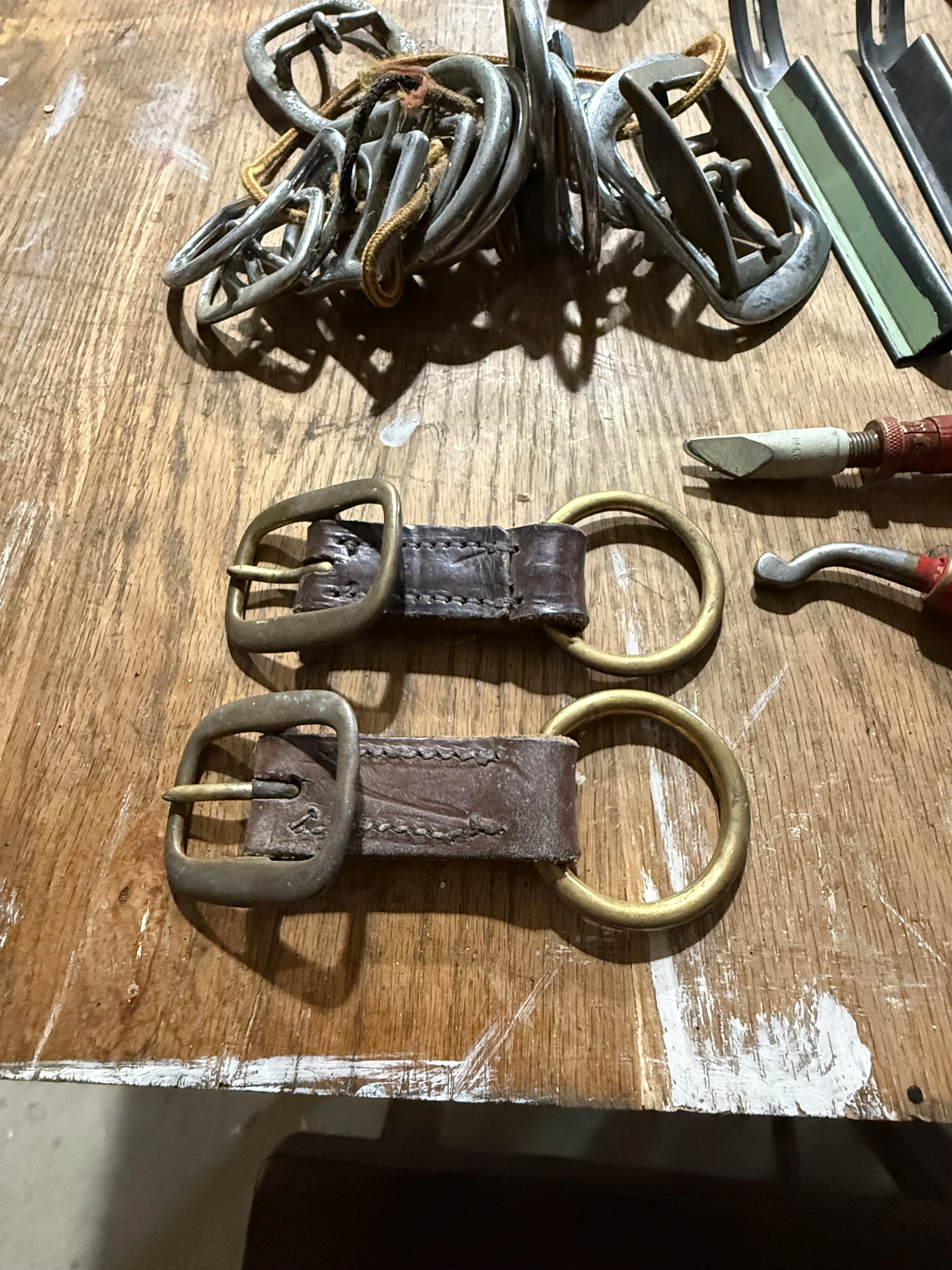 List: Adler patcher, Special straps for a big man, Anvils, Clamps to bond leather, Hammers, Boot/shoe stretchers for the mrs’ Ferragamo collection, Edge creaser, Edge beveler, Channel making tool, Awl, Cutting board / rotary cutter and ruler, Skiver to thin leather (looks like a razor), Potbelly stove for winter, Singer patcher, Strap cutter for belts, Longines too that I added just because it’s cool, Hand tools on a wall bracket that I made out of leather, Old fur removal blade (looks like Damascus), Swatch (works!), Needles, Singer 201, Old Ikea bench for naps (this is the upstairs of my shop), Heavy duty leather cutter and skiver, Thread, Punches (old ones from England are the best I’ve used), Leather scissors, I have no idea what the hand tool with the conical expanding end is for. Some type of pain implement? A strap end punch, Buffing pad, and my favorite blade that I strop regularly.