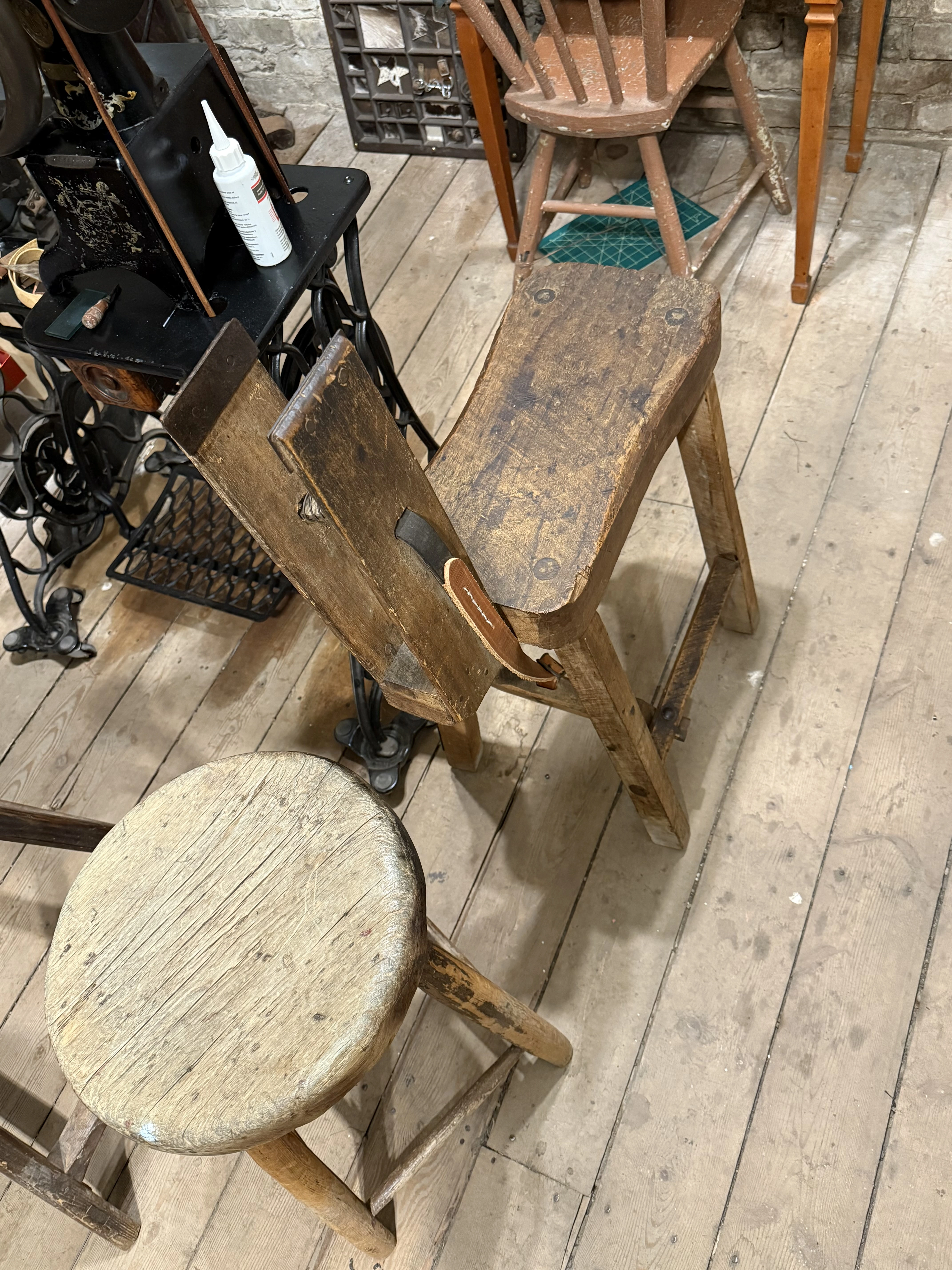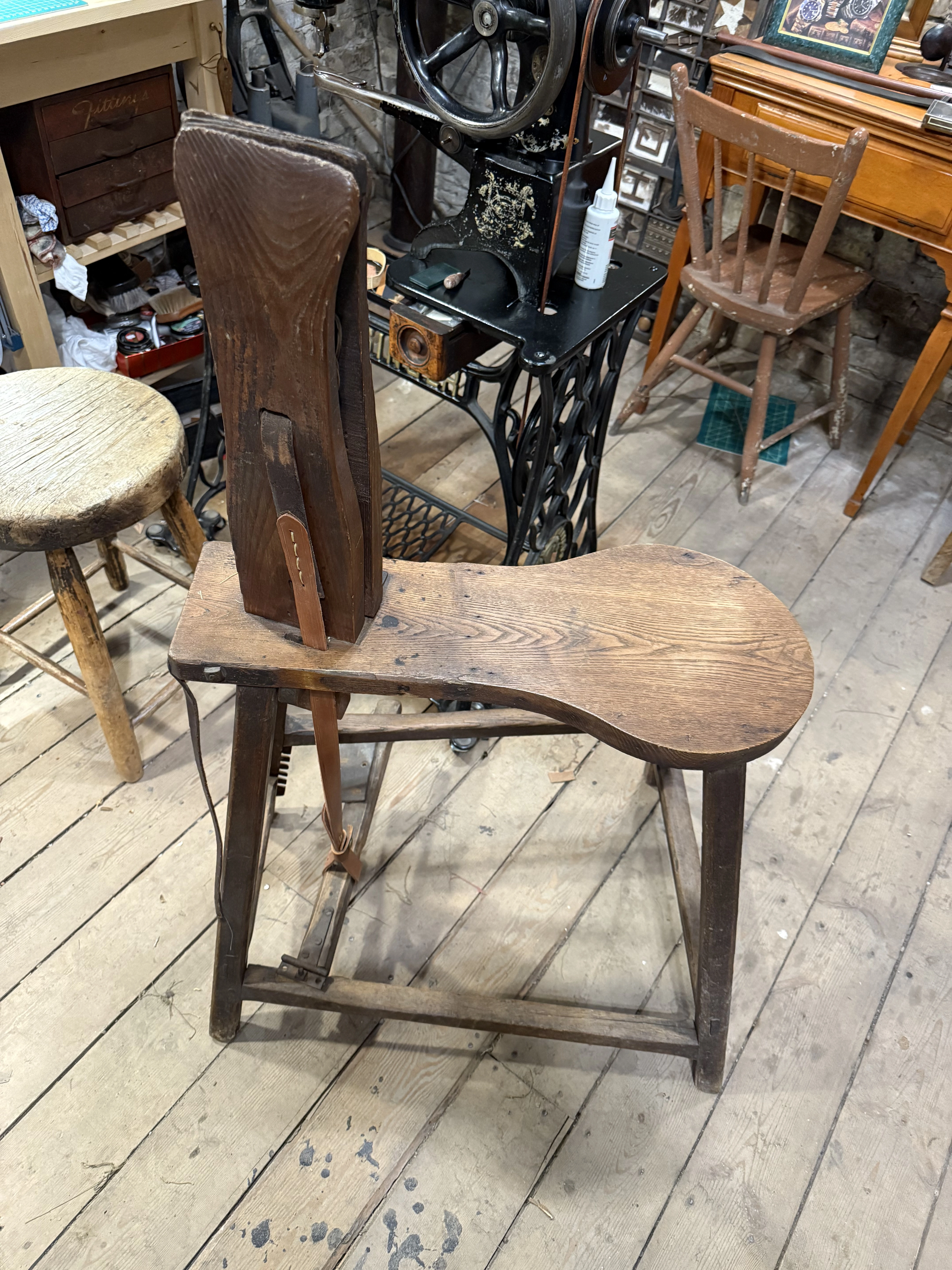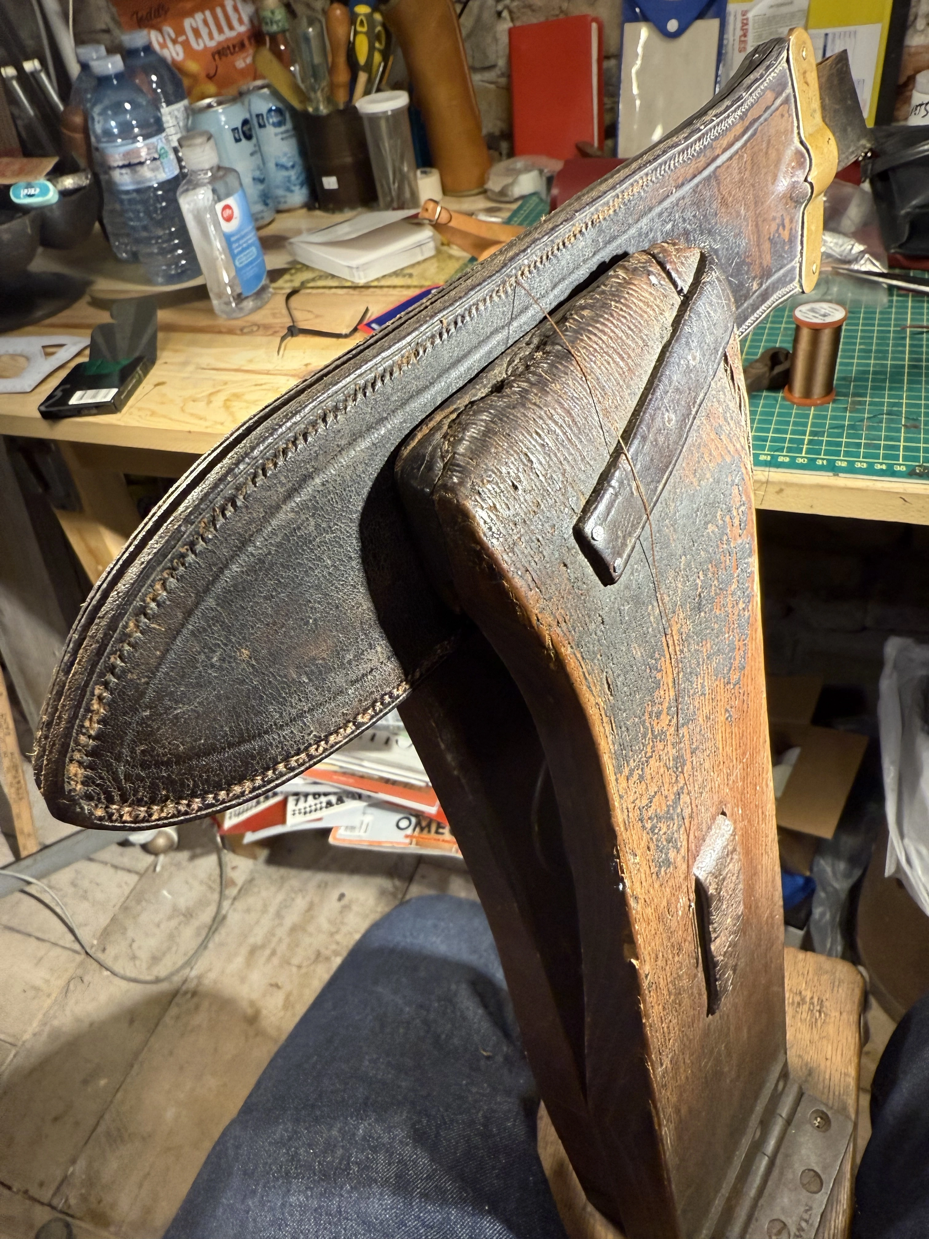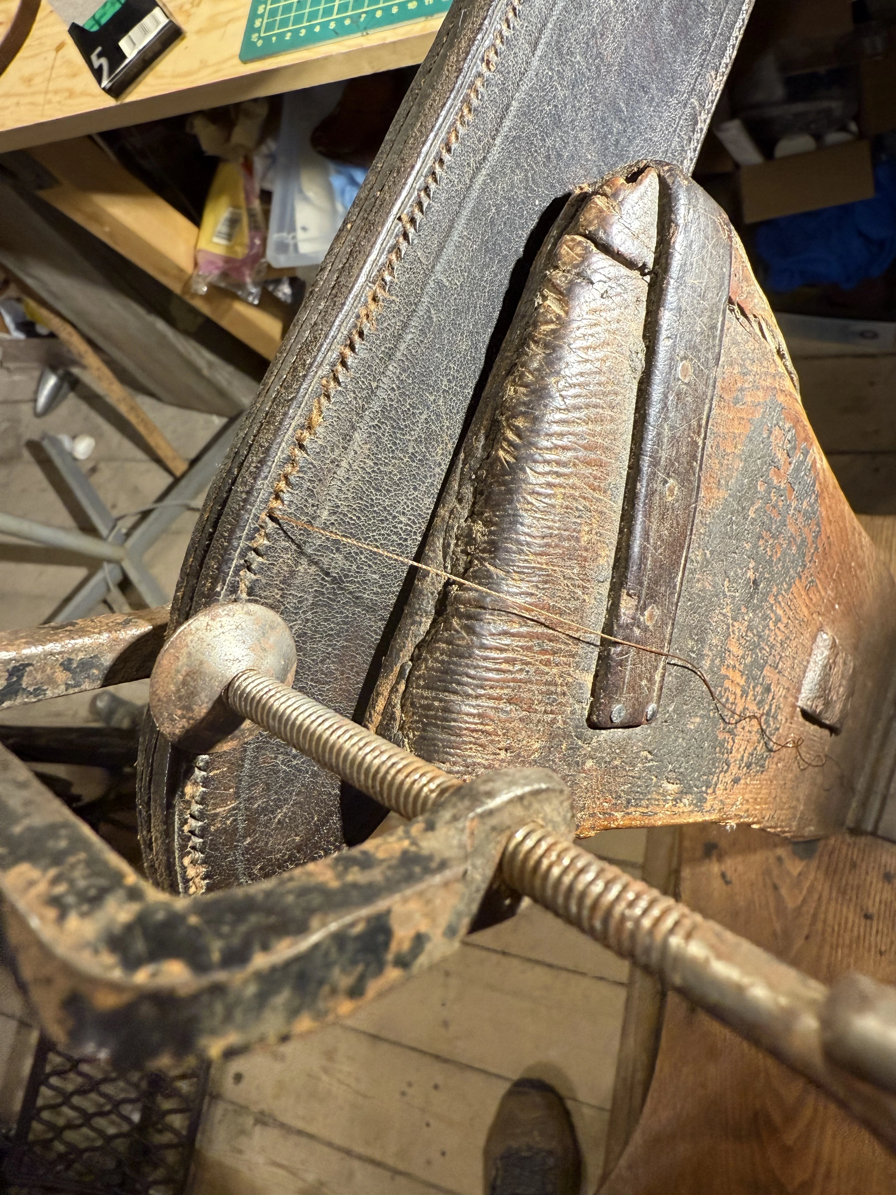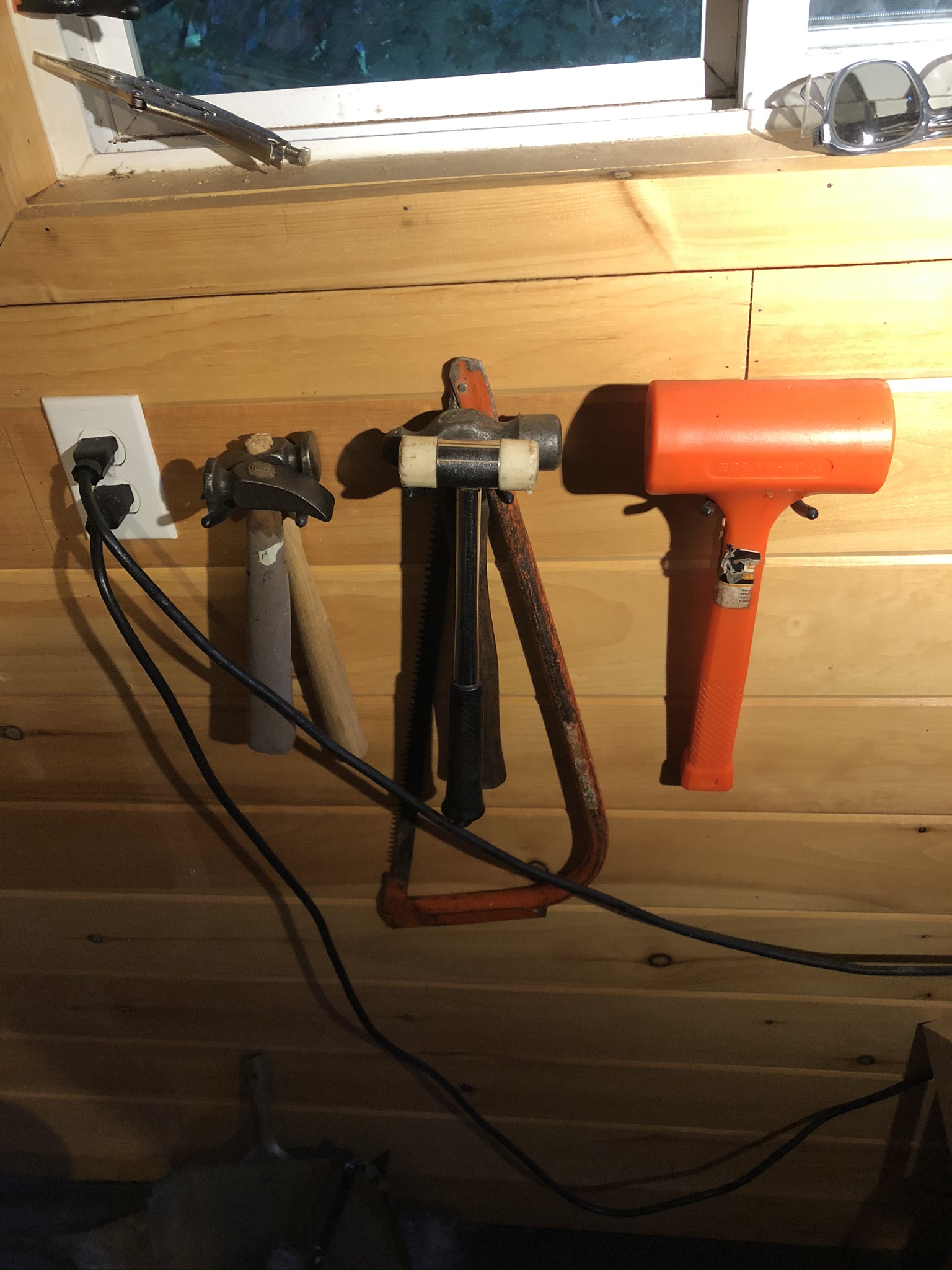List: Adler patcher, Special straps for a big man, Anvils, Clamps to bond leather, Hammers, Boot/shoe stretchers for the mrs’ Ferragamo collection, Edge creaser, Edge beveler, Channel making tool, Awl, Cutting board / rotary cutter and ruler, Skiver to thin leather (looks like a razor), Potbelly stove for winter, Singer patcher, Strap cutter for belts, Longines too that I added just because it’s cool, Hand tools on a wall bracket that I made out of leather, Old fur removal blade (looks like Damascus), Swatch (works!), Needles, Singer 201, Old Ikea bench for naps (this is the upstairs of my shop), Heavy duty leather cutter and skiver, Thread, Punches (old ones from England are the best I’ve used), Leather scissors, I have no idea what the hand tool with the conical expanding end is for. Some type of pain implement? A strap end punch, Buffing pad, and my favorite blade that I strop regularly.