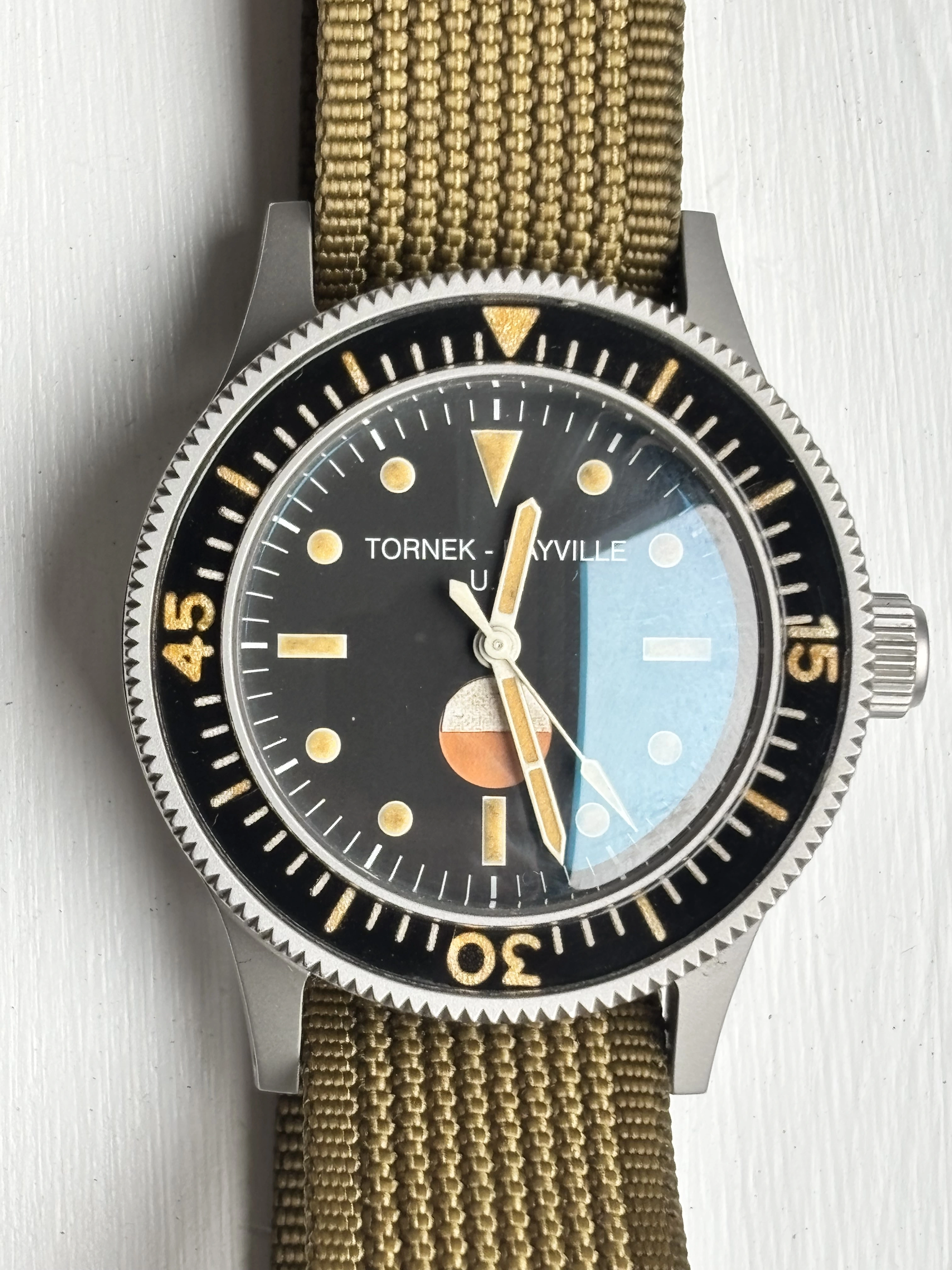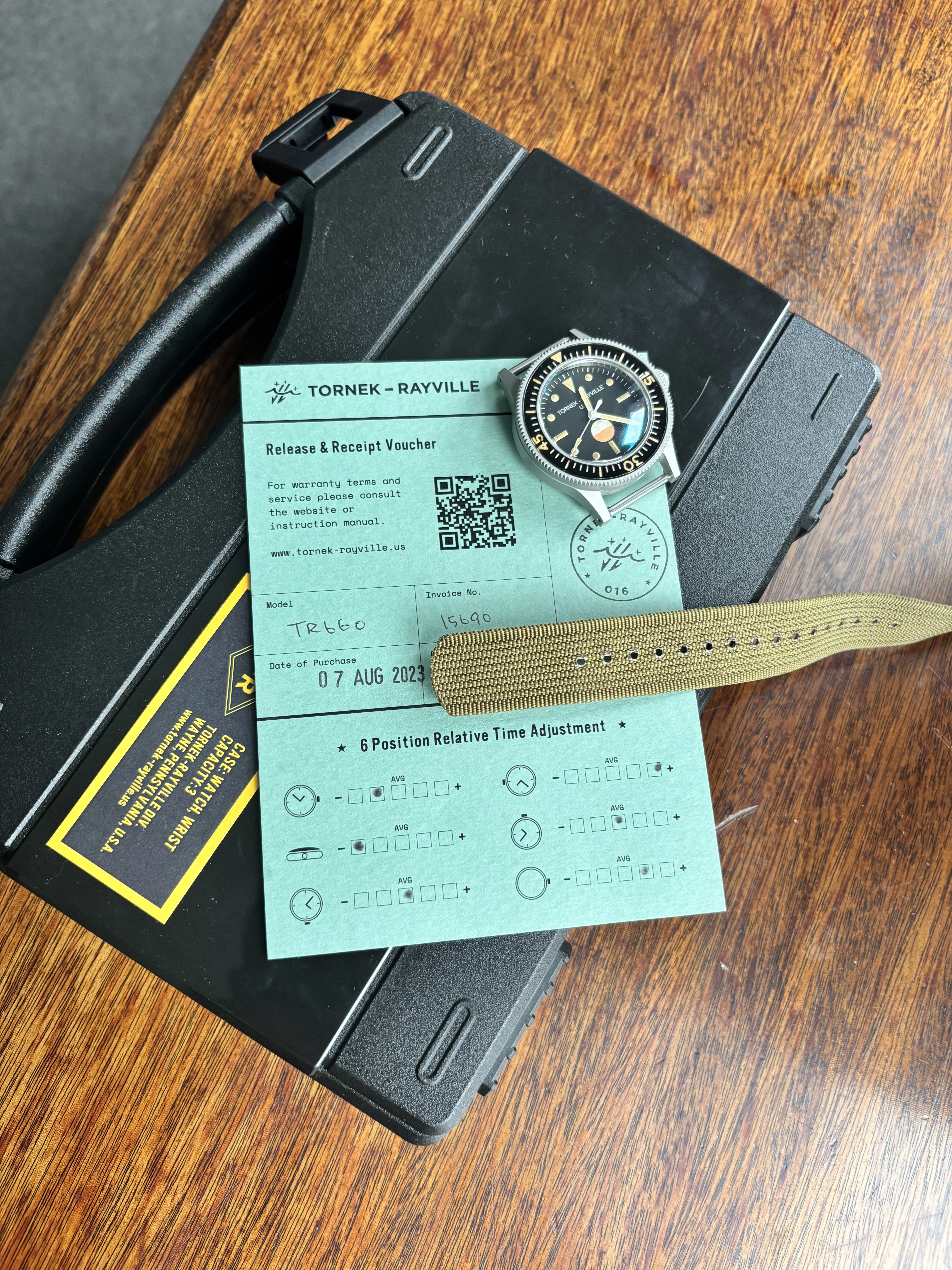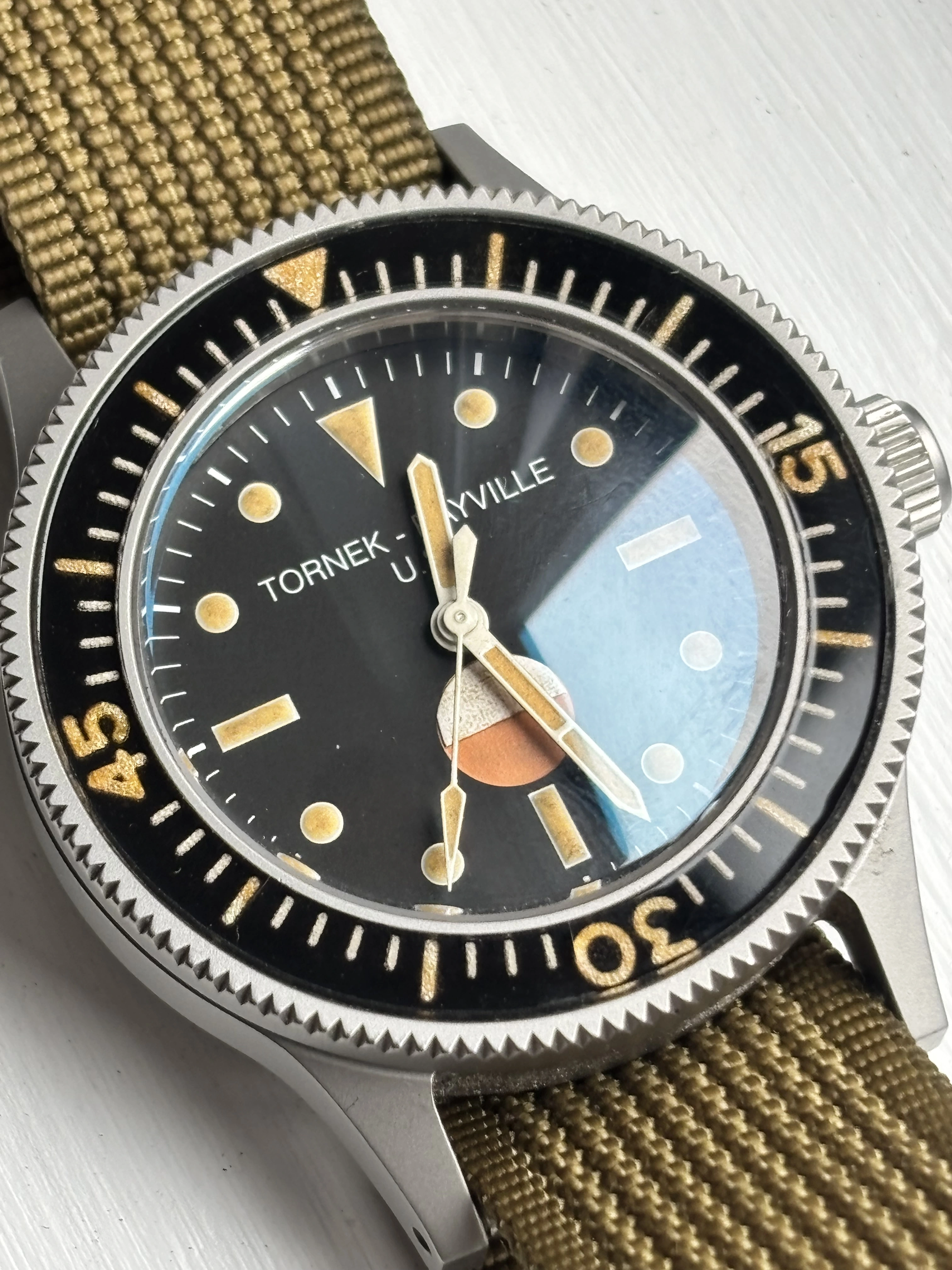Note the dial, hands and bezel have been aged by the UKs premier watch restorer (alchemistrelumer) to give this watch a vintage appearance. Fast fade lume & working moisture control indicator. Comes with official strap, box and paperwork.