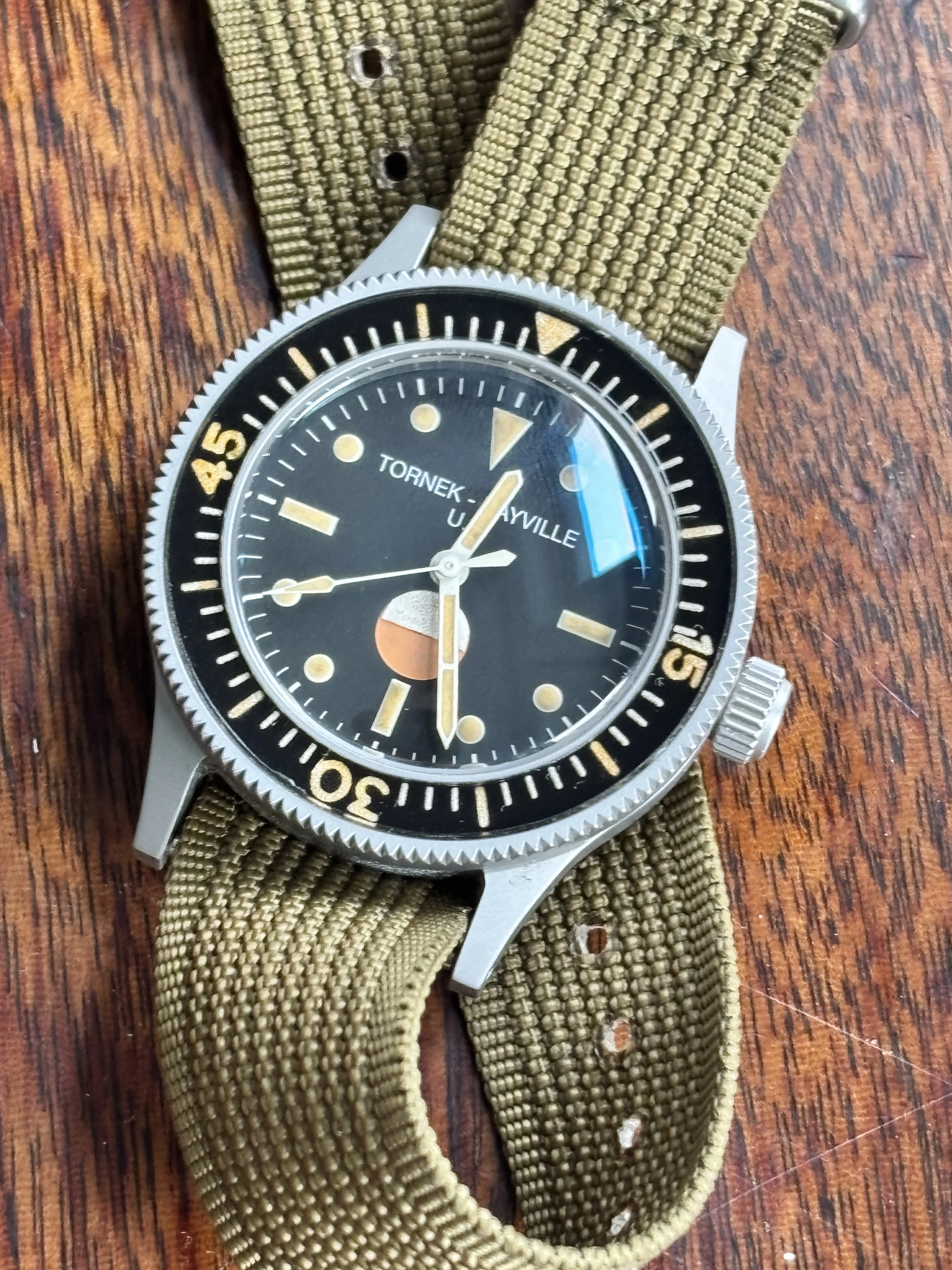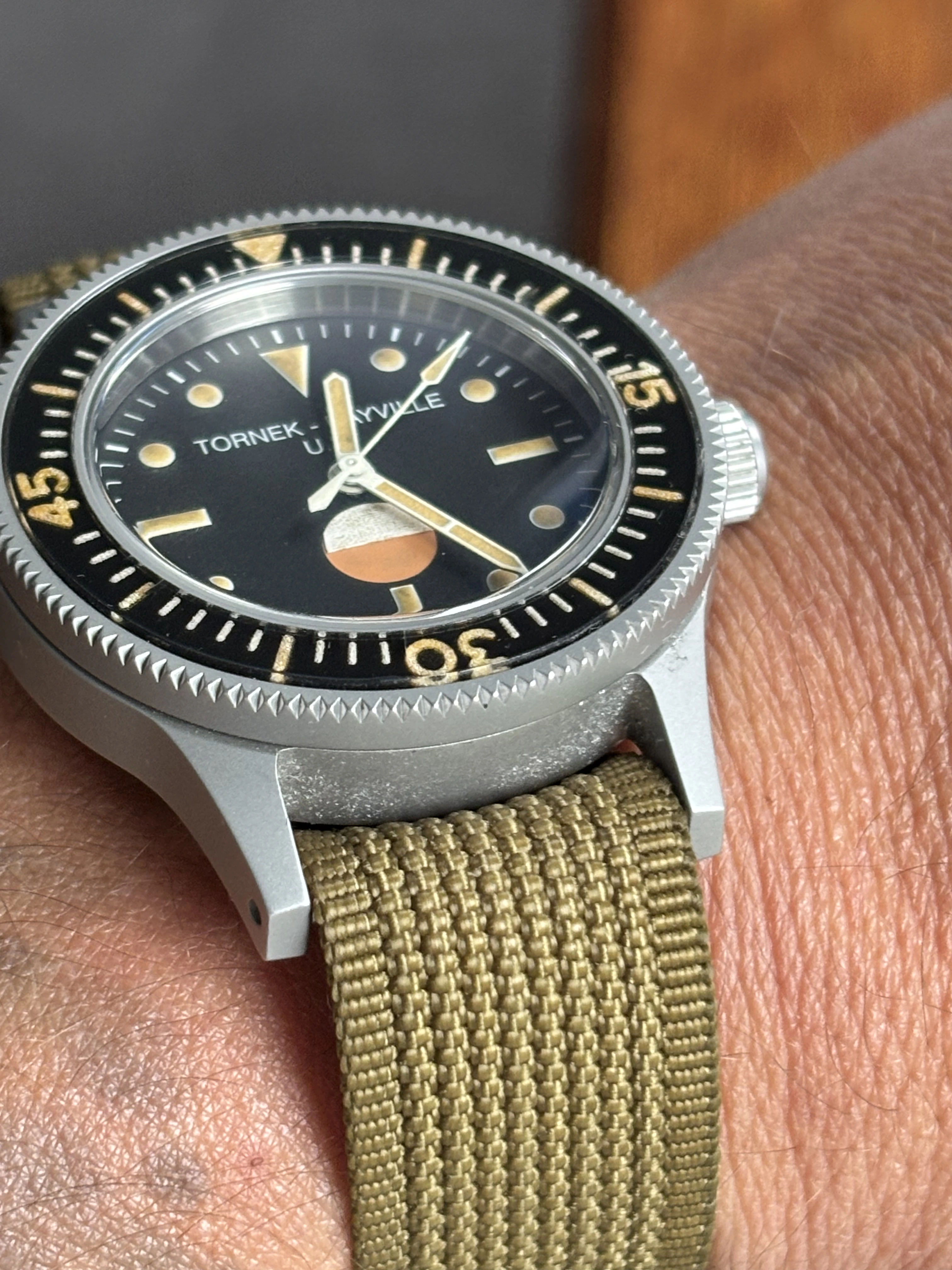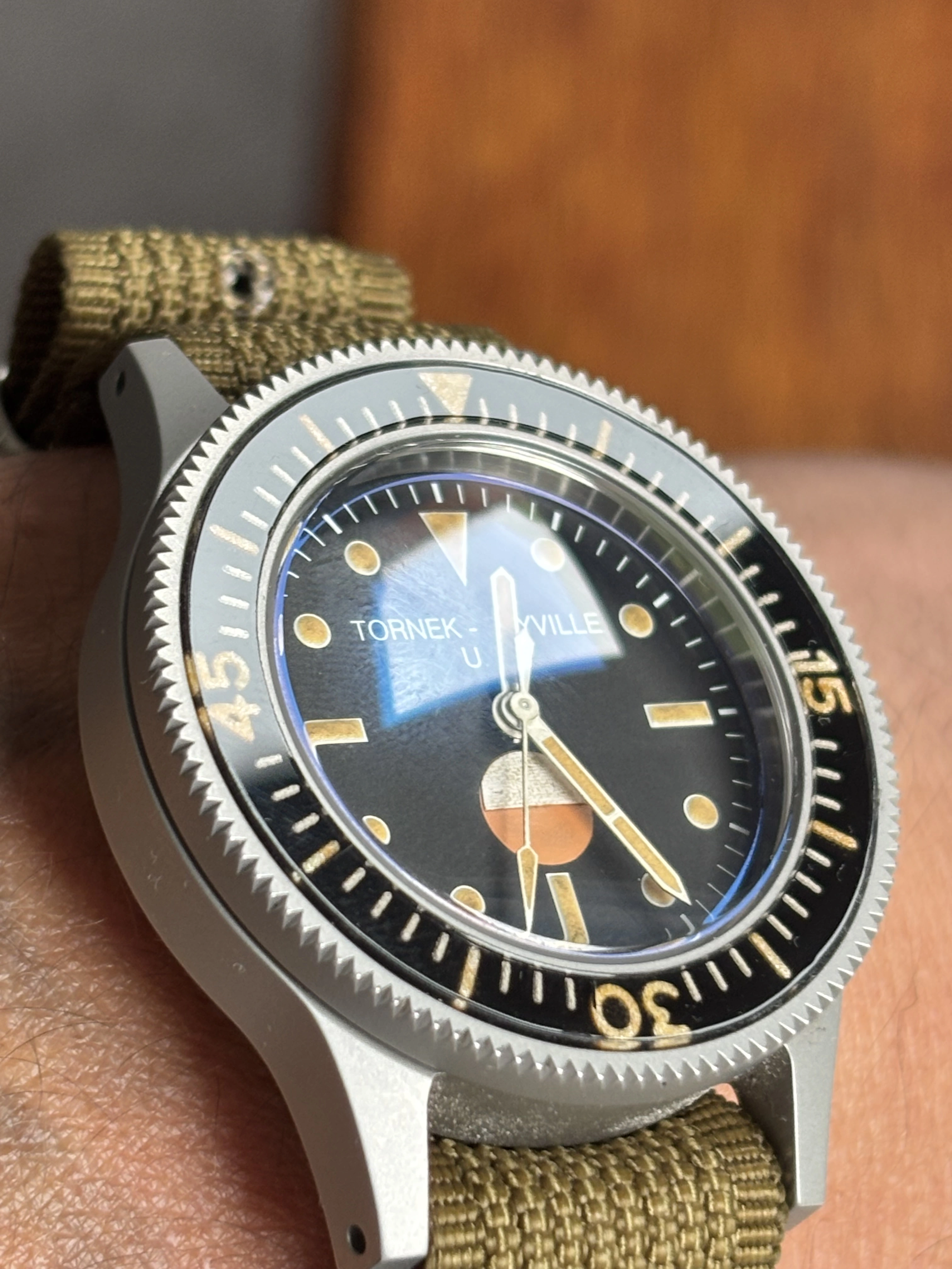 Note the dial, hands and bezel have been aged by the UKs premier watch restorer (alchemistrelumer) to give this watch a vintage appearance. Fast fade lume & working moisture control indicator. Comes with official strap, box and paperwork.