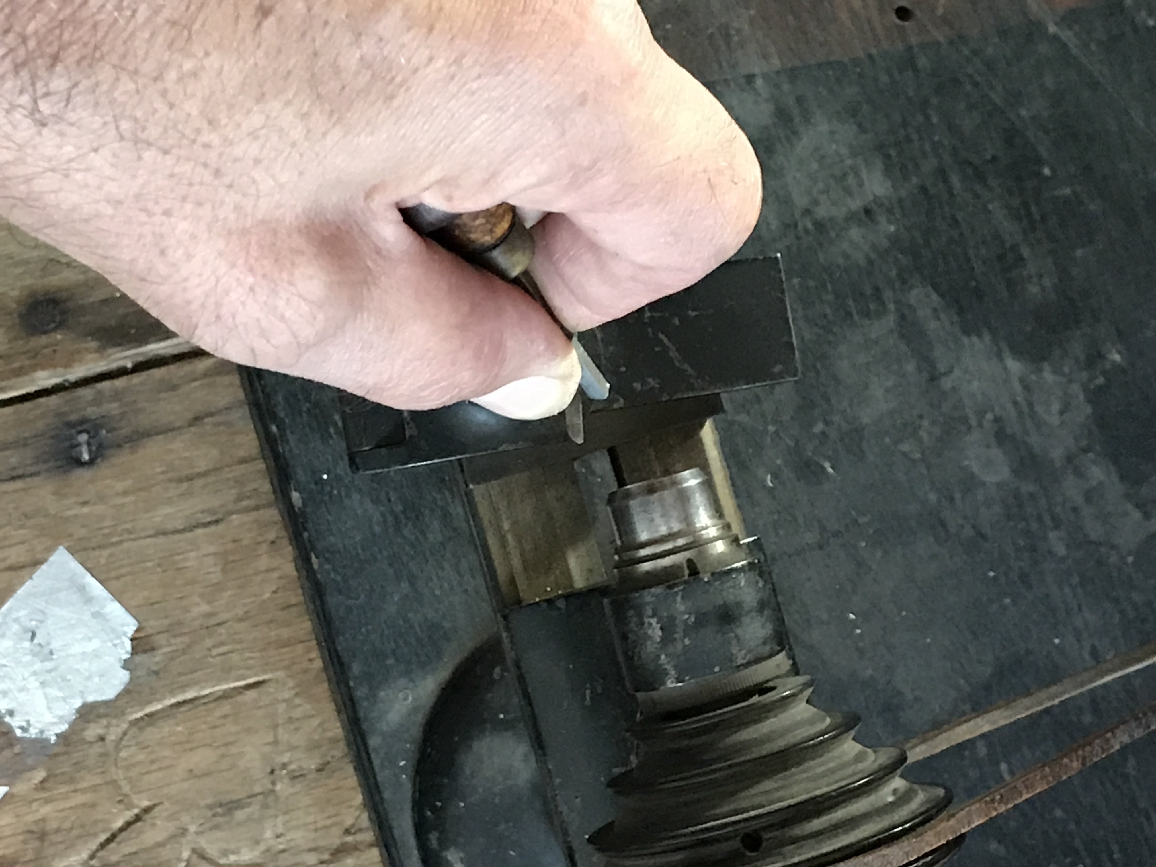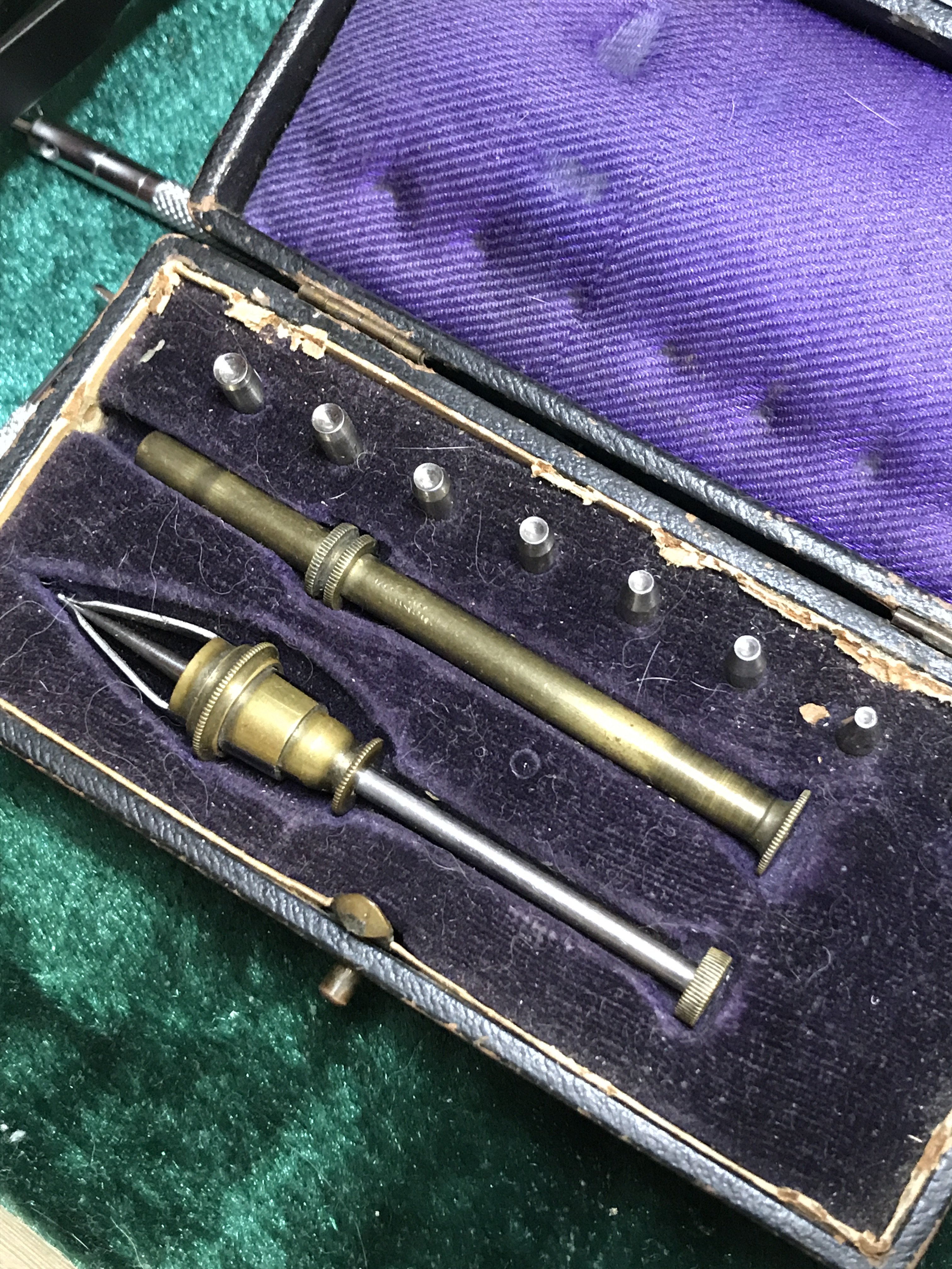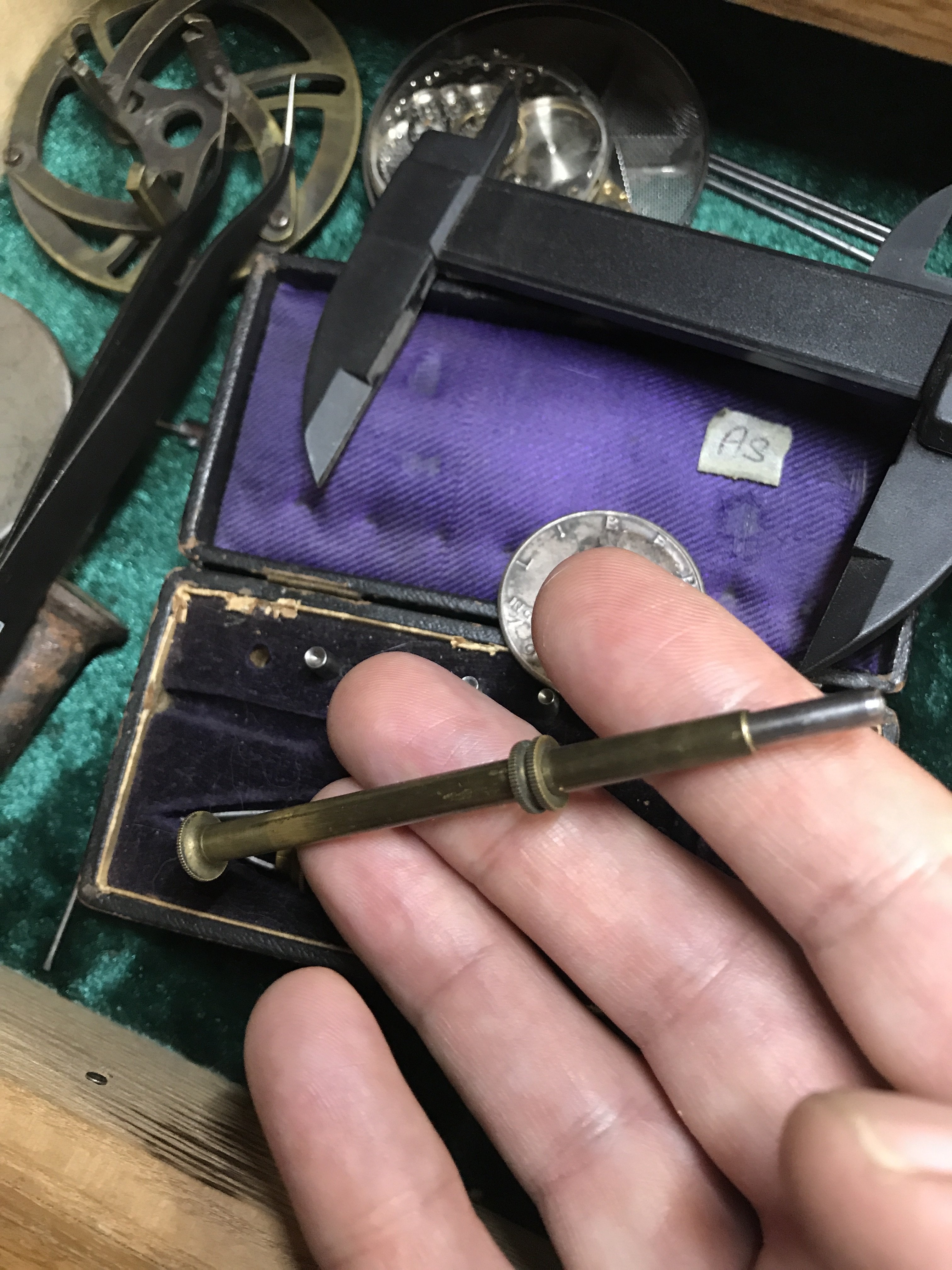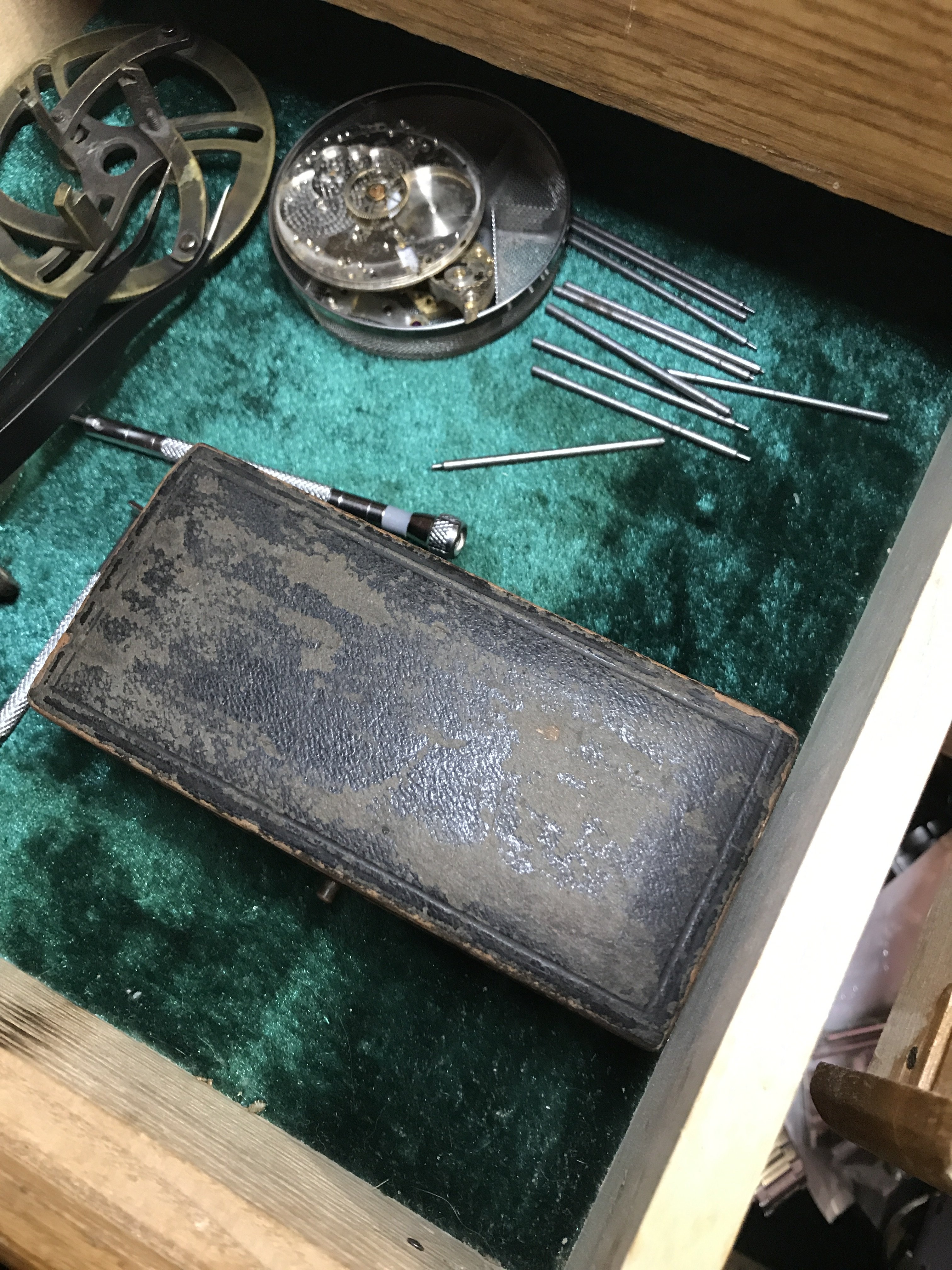The aluminum strip in leather case is a jewel gauging strip differnt size holes..?