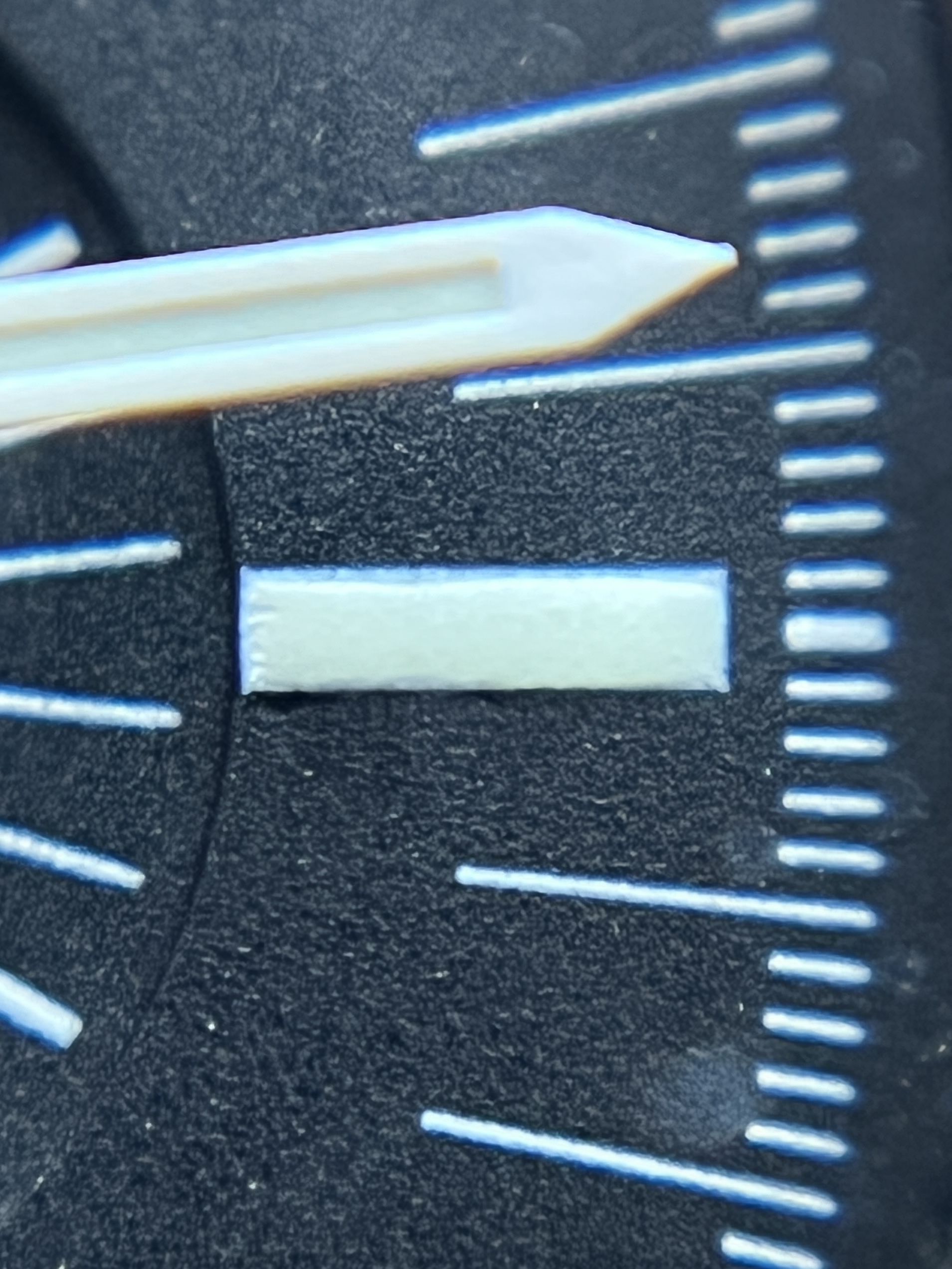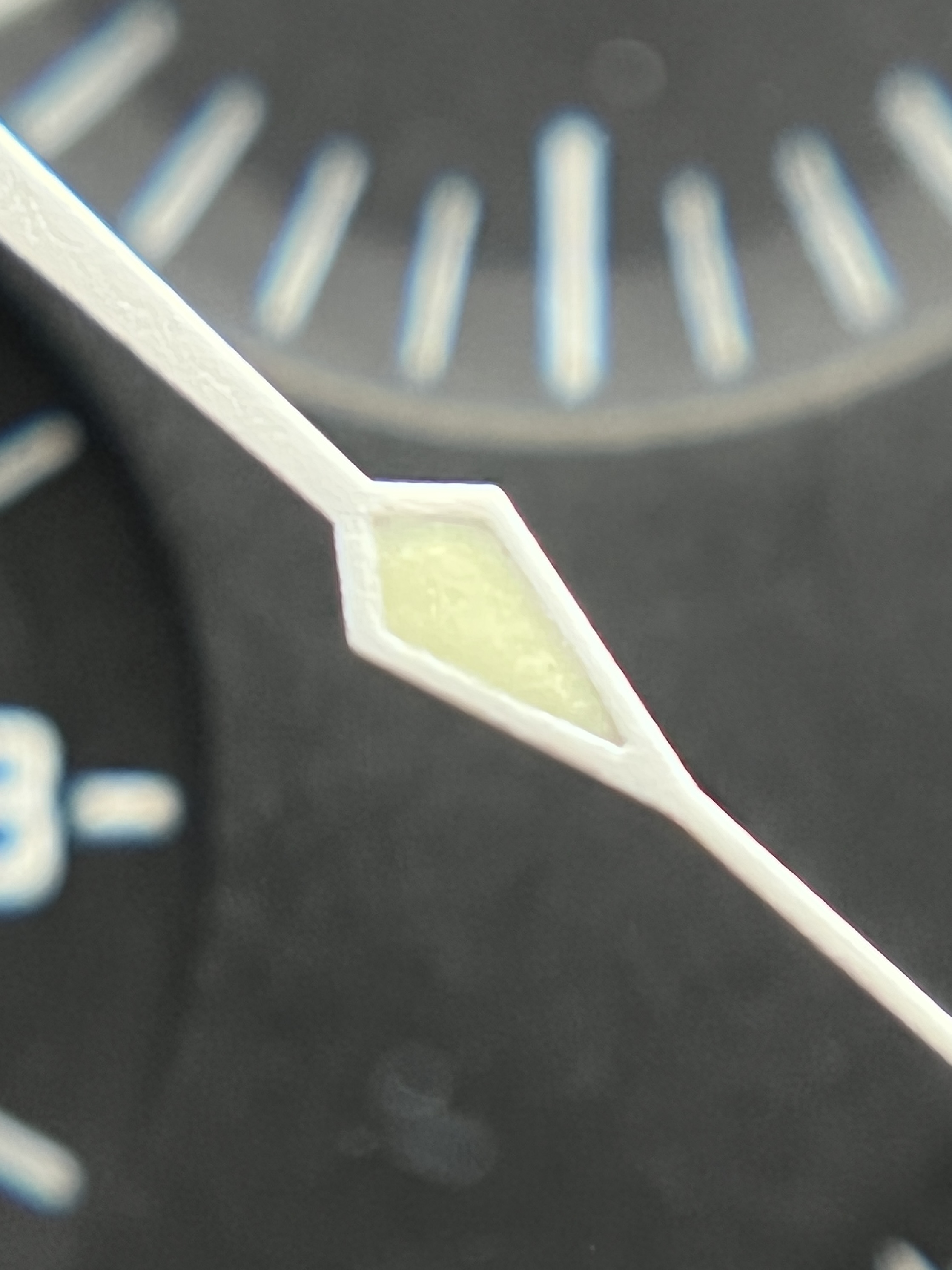 Here are a few close-ups of the lume plots, do let me know your thoughts please. The quality of the application appears to be in line with Omega standards from that time and, well, it just isn’t a redial. The only thing that I have no explanation for is the tiny, shiny black spots around some of the indices, especially noticeable on the 12 o clock one.