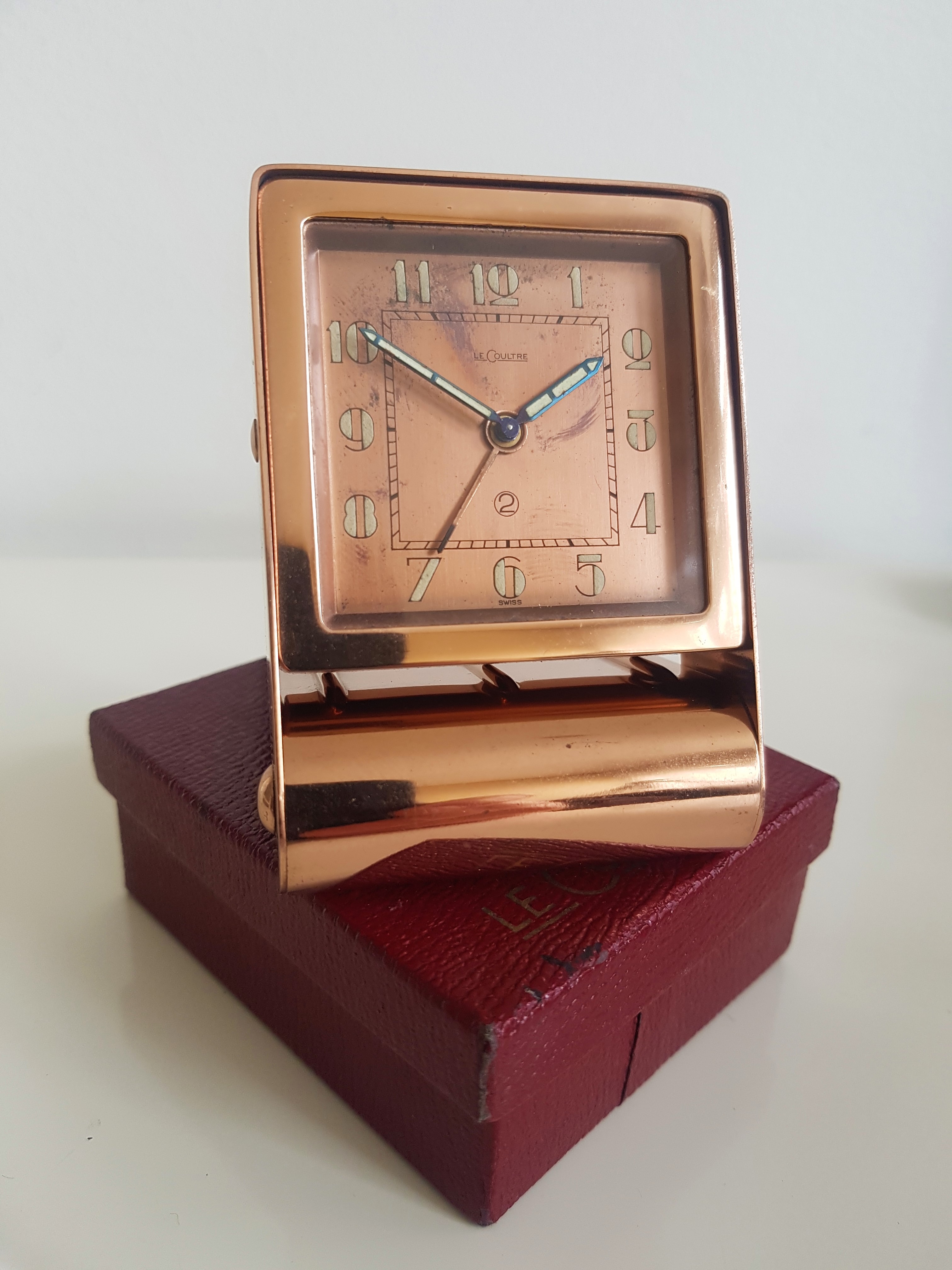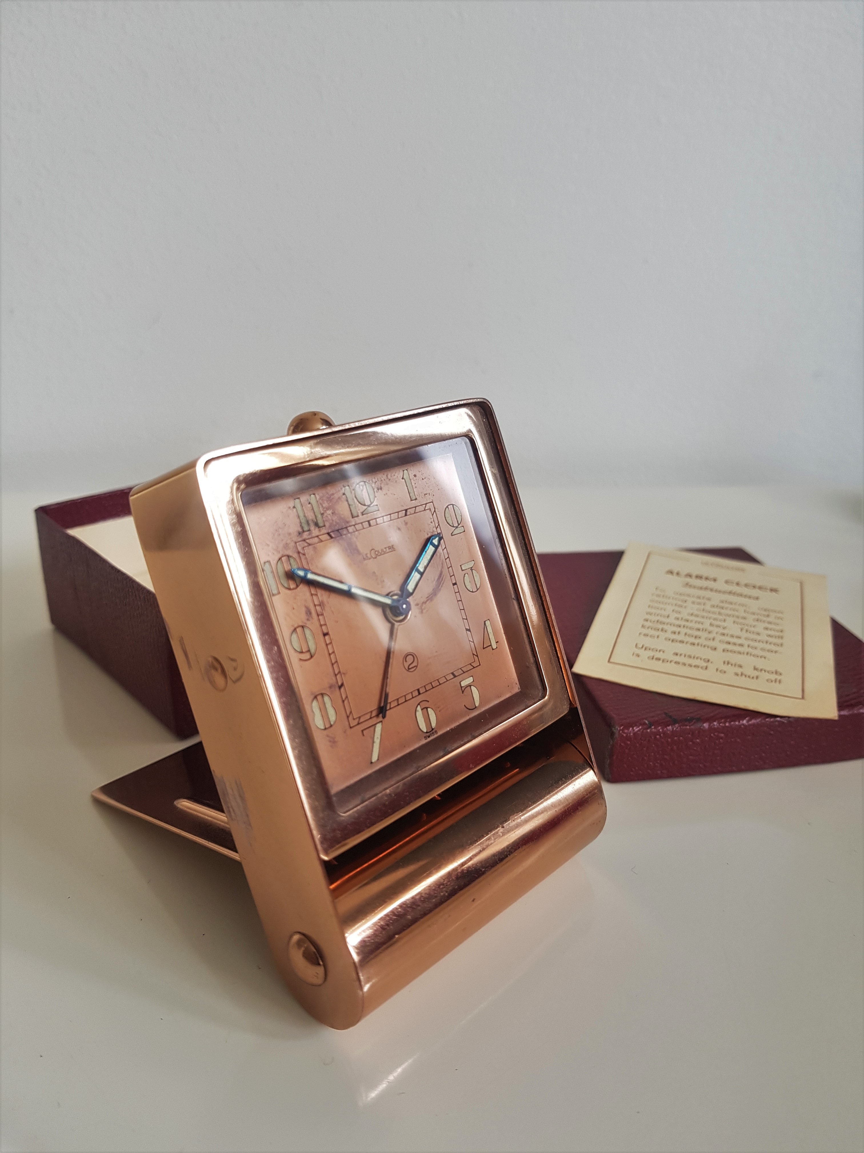1. To start with this beautiful Jaeger Le Coultre folding copper coloured two day travel alarm clock which comes with it's original box and instructions- €125 SOLD!