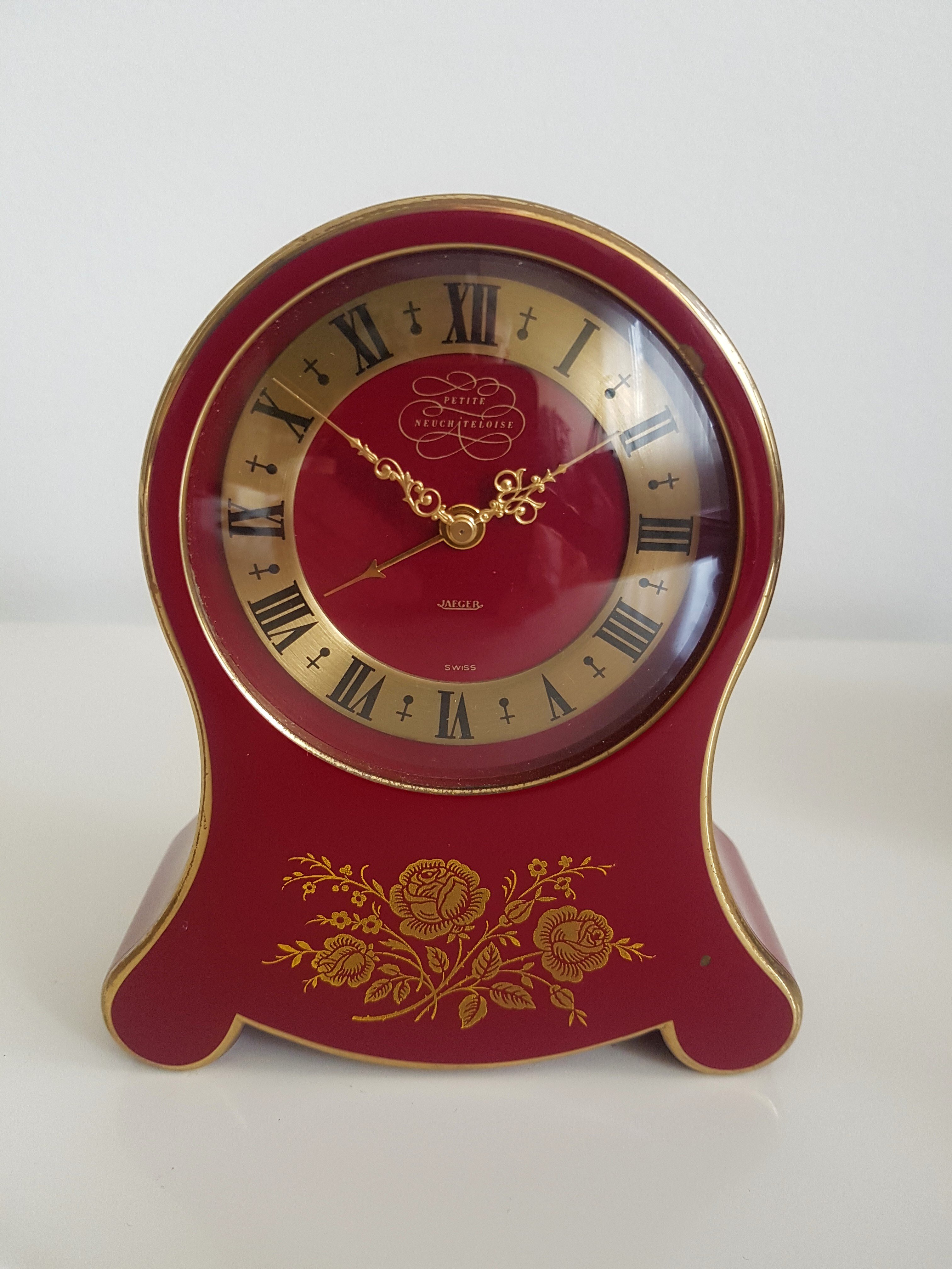 2. Here a Jaeger Le Coultre 8 day Petiite Neuchateloise alarm clock in lovely vintage condition. The dark red and gilt case is in excellent shape and has flower motifs, a gold and black Roman numeral dial and golden fancy hands. This one is running but intermittently starting and stopping and will need a clean. So with a service in mind- €100 SOLD
