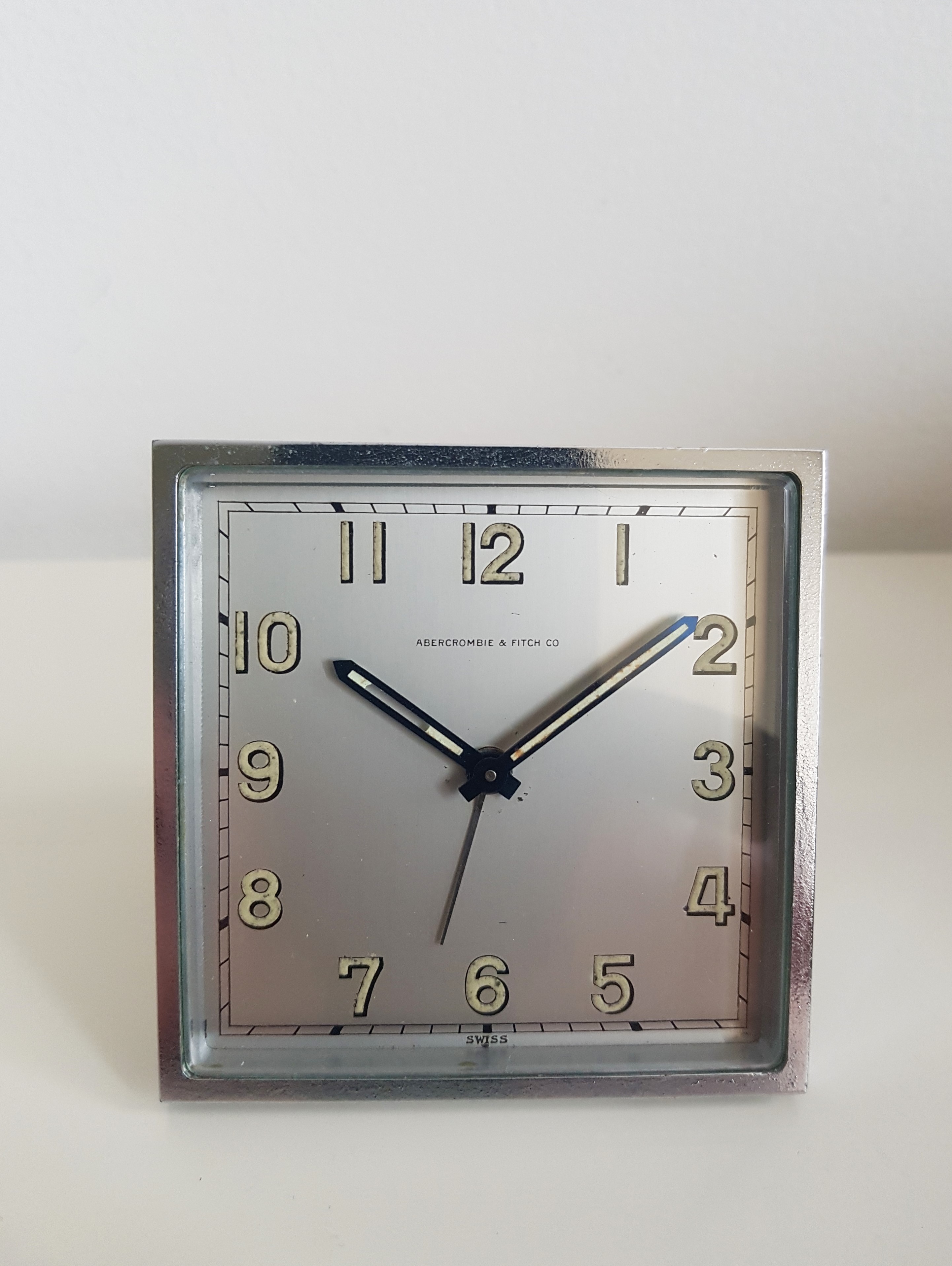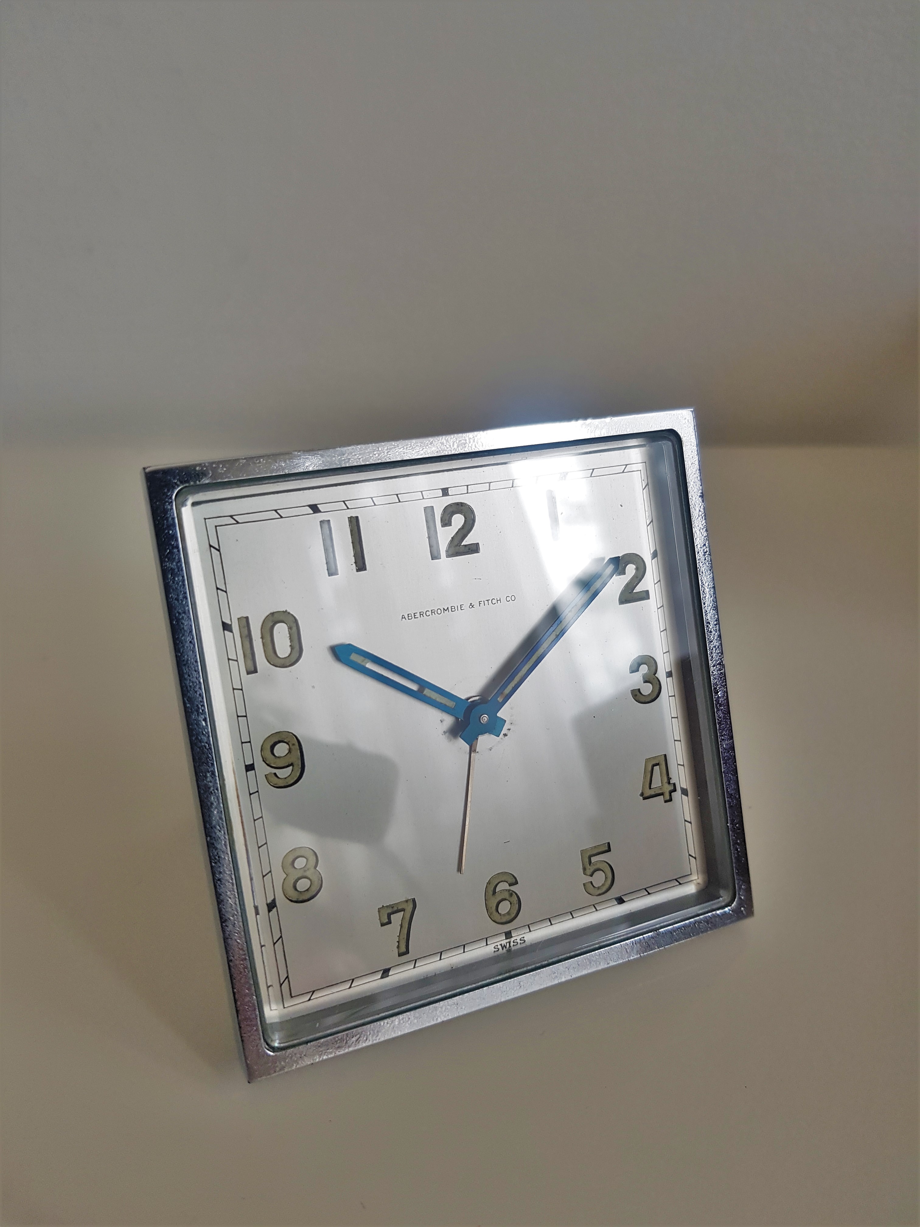 5. Abercrombie and Fitch travel alarm clock in chrome with an Angelus alarm movement. The condition is excellent with a very strong minimalist design in a chromed case with bracket stand. The dial has lumed Arabics and blued hands.