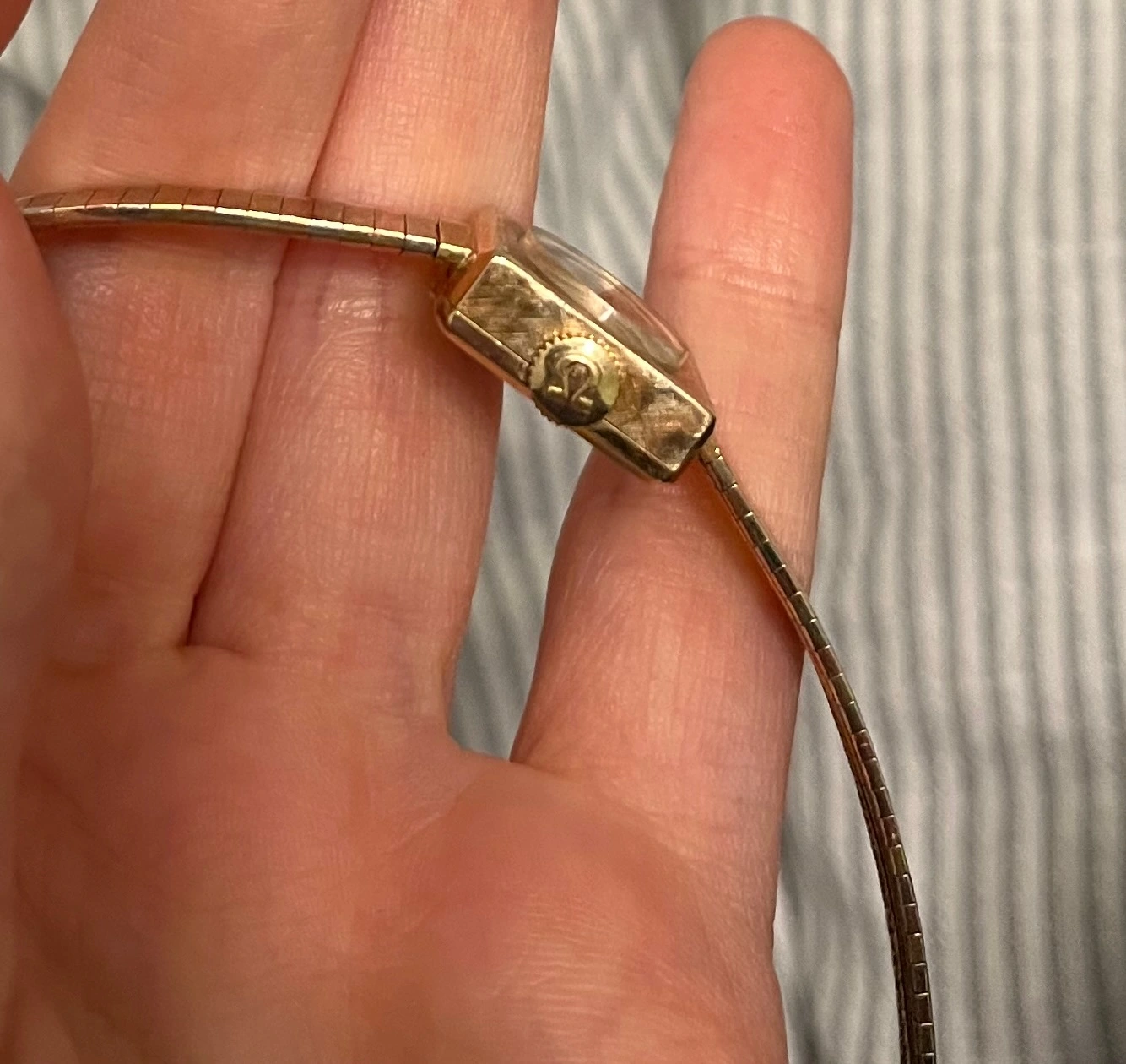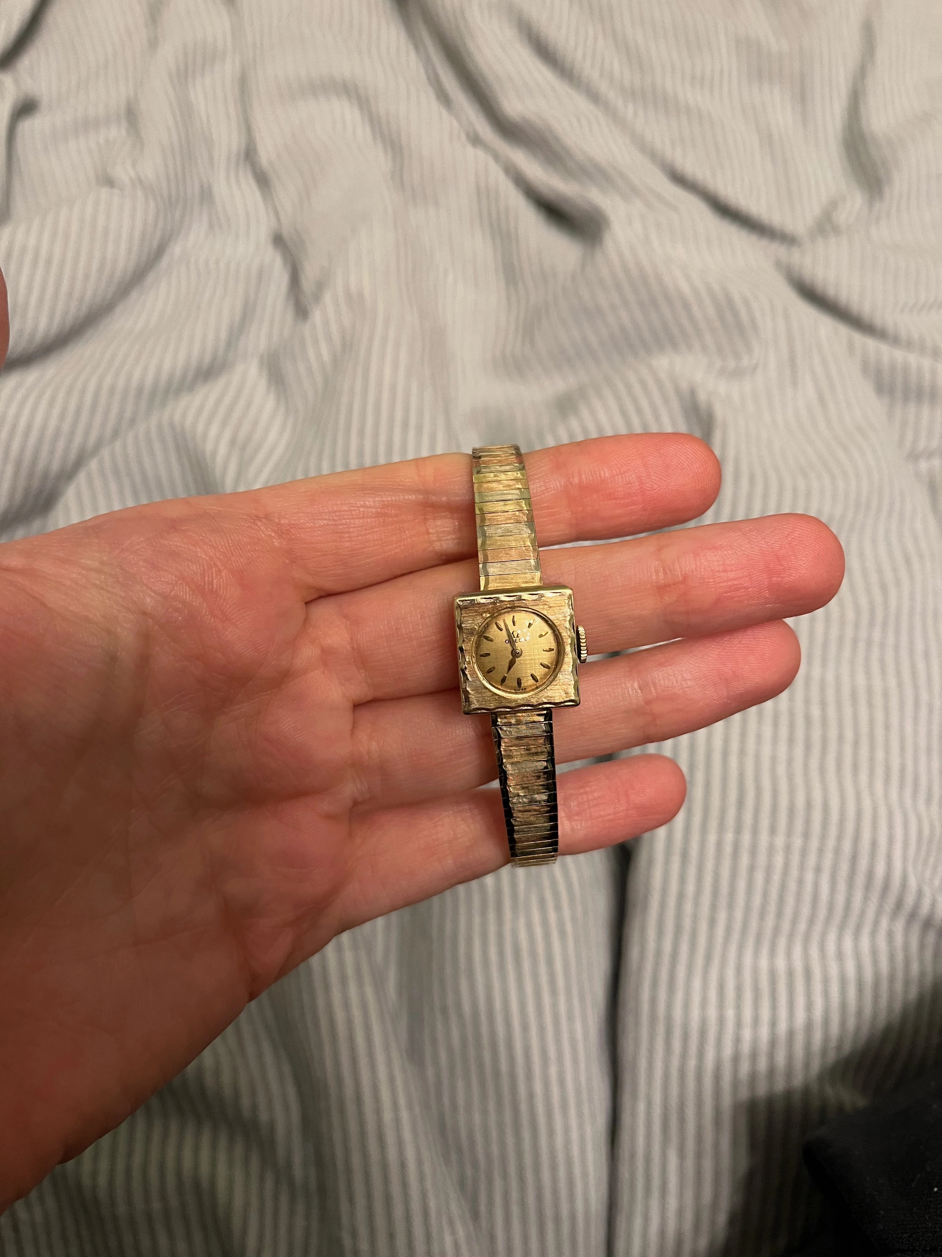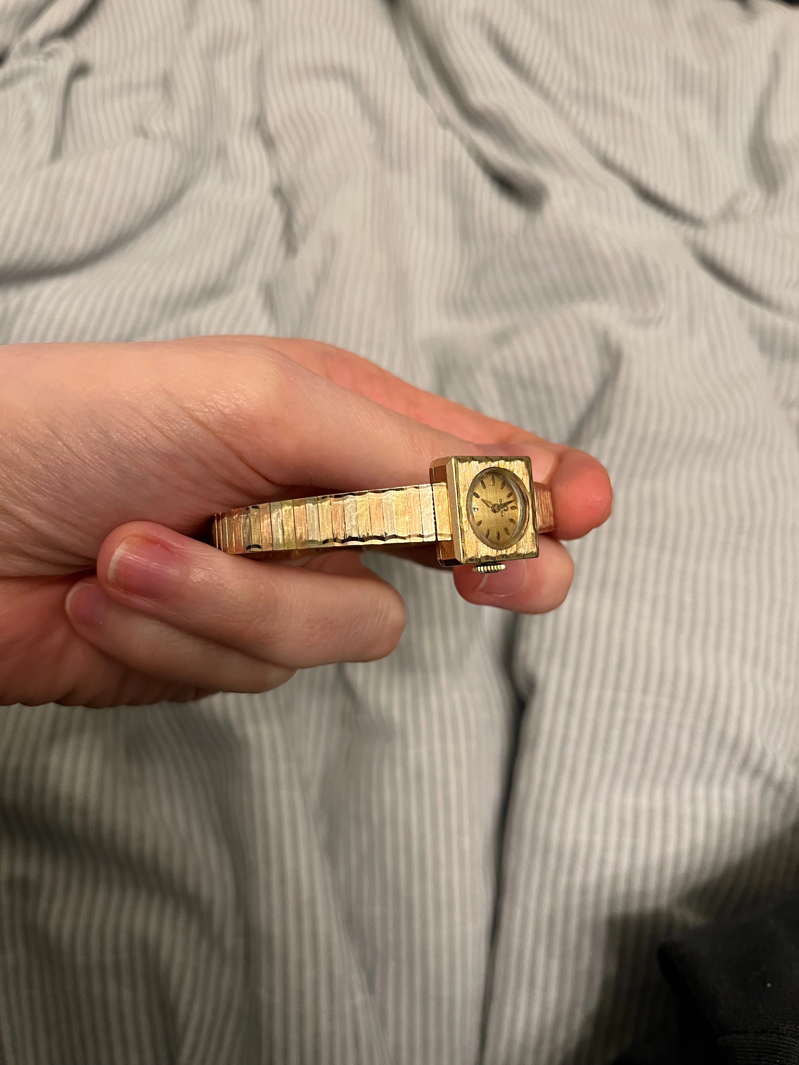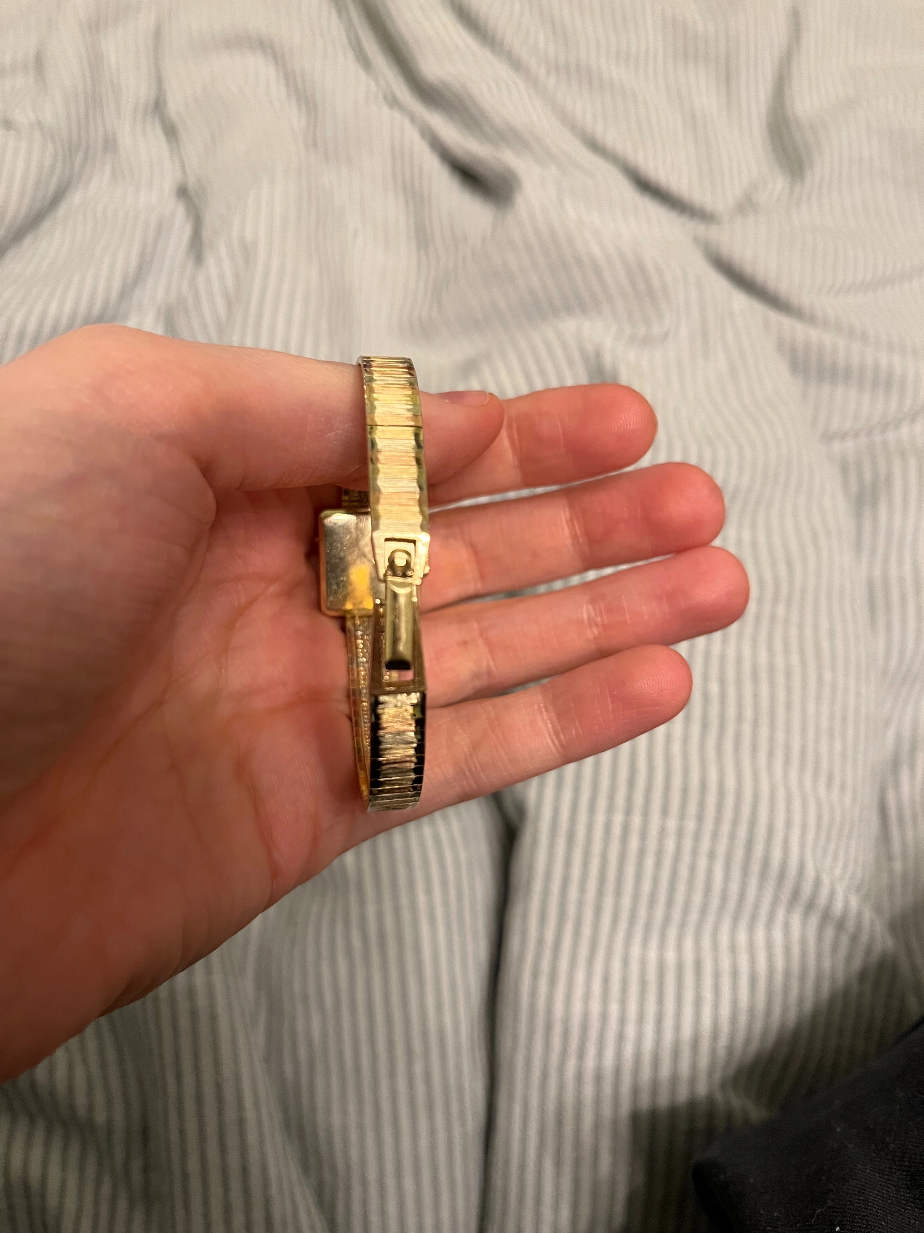 I'm looking to identify my grandmother's watch. Unfortunately, I can't get to a watchmaker to open up the back. I haven't been able to find photos of another quite like it. It's tri-color gold, 14K per the clasp on the band. Value would be interesting, but mostly I'm trying to find some history on the watch, even if that's just when it was made. These photos already stretch the limits of what my phone can do but I can try to get some better ones if needed.