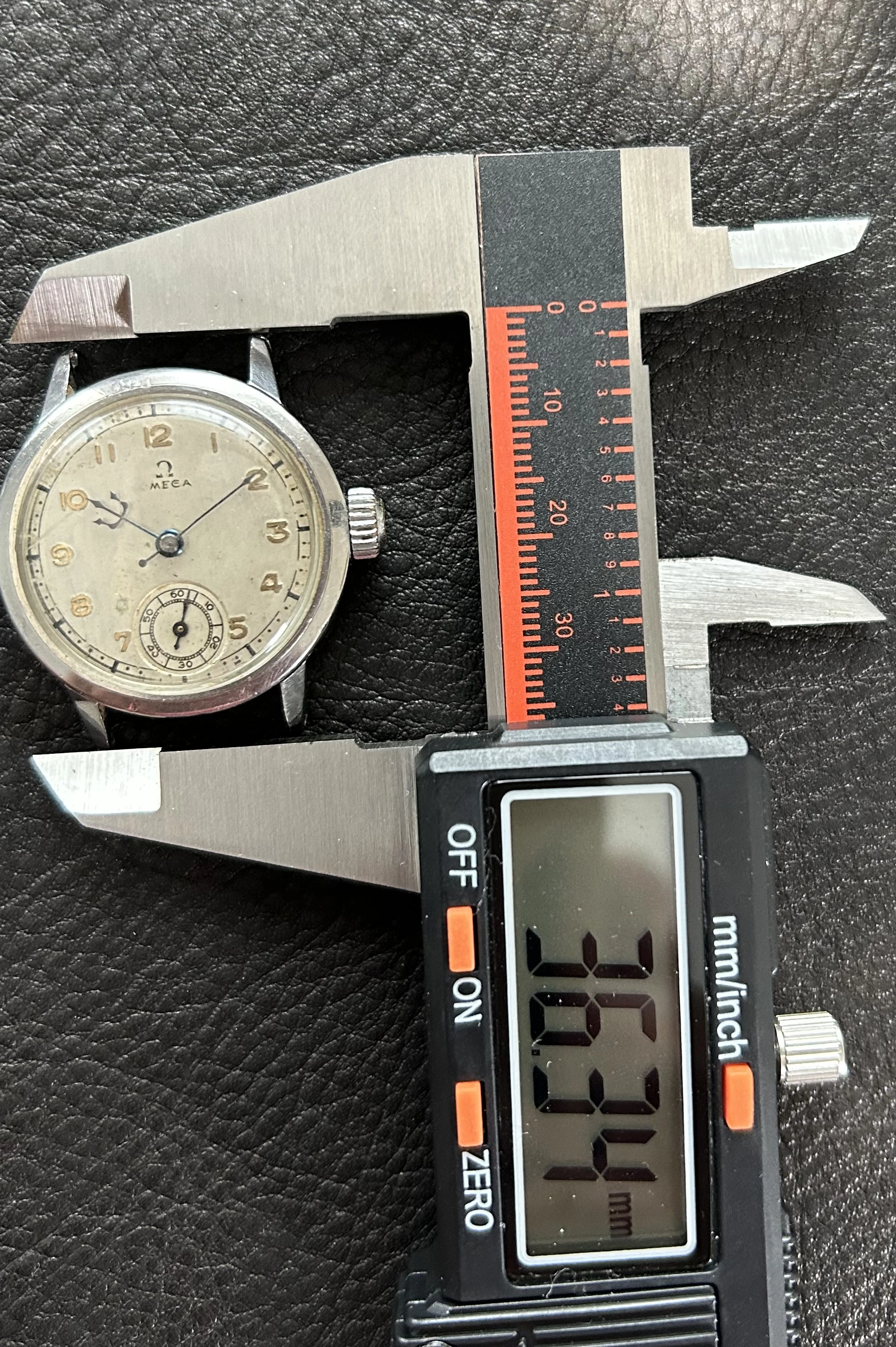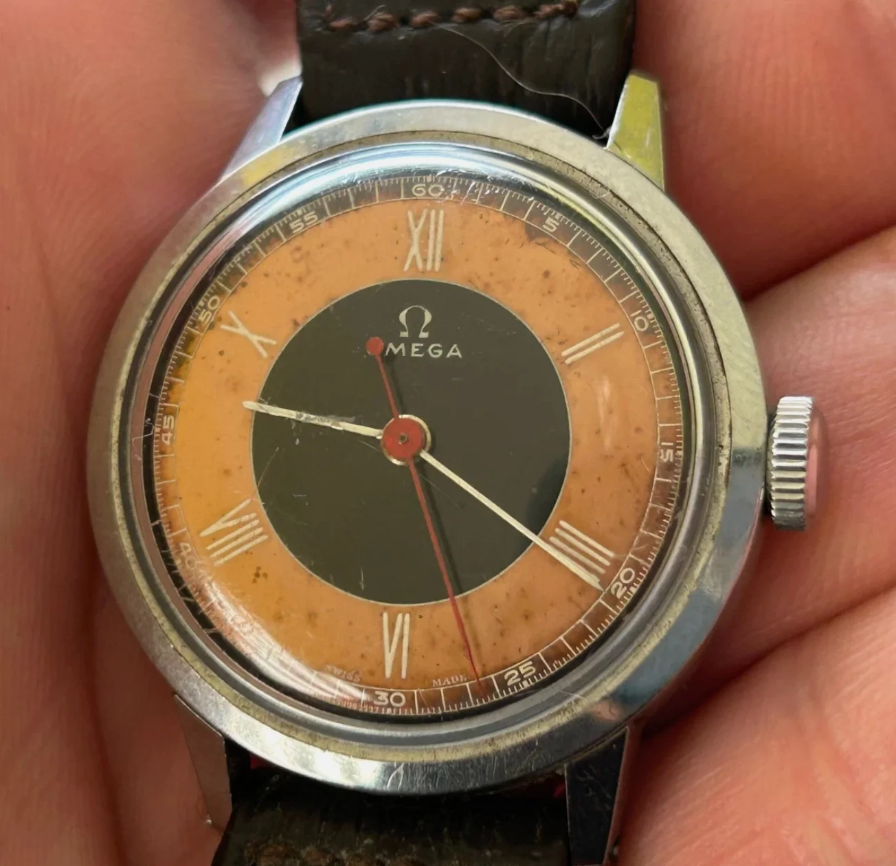Based on the photo, I suspect the dial might have been repainted at one point, and at least 1 of the hands doesn't seem to match, though I'm far from an expert on these. The minute track looks 'heavy handed' for an Omega watch, and the seconds track has some inconsistencies I wouldn't expect to see from an original dial.