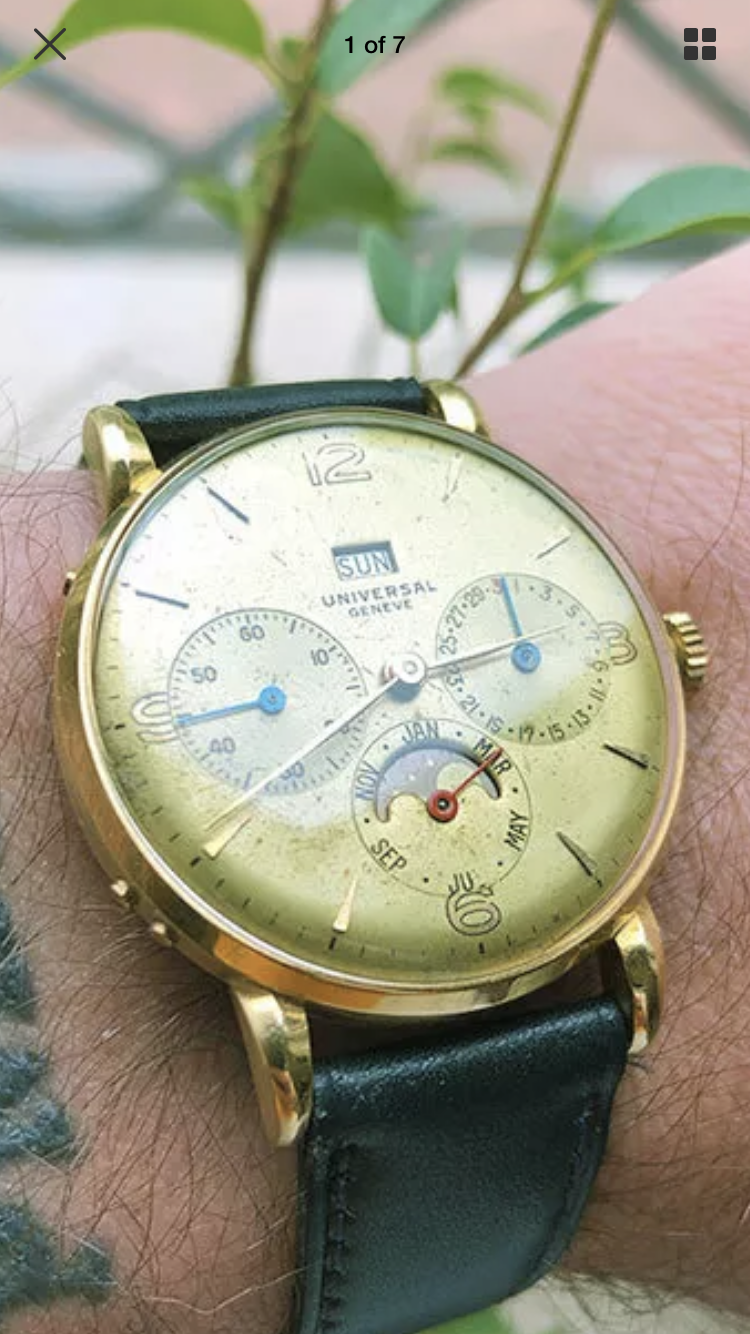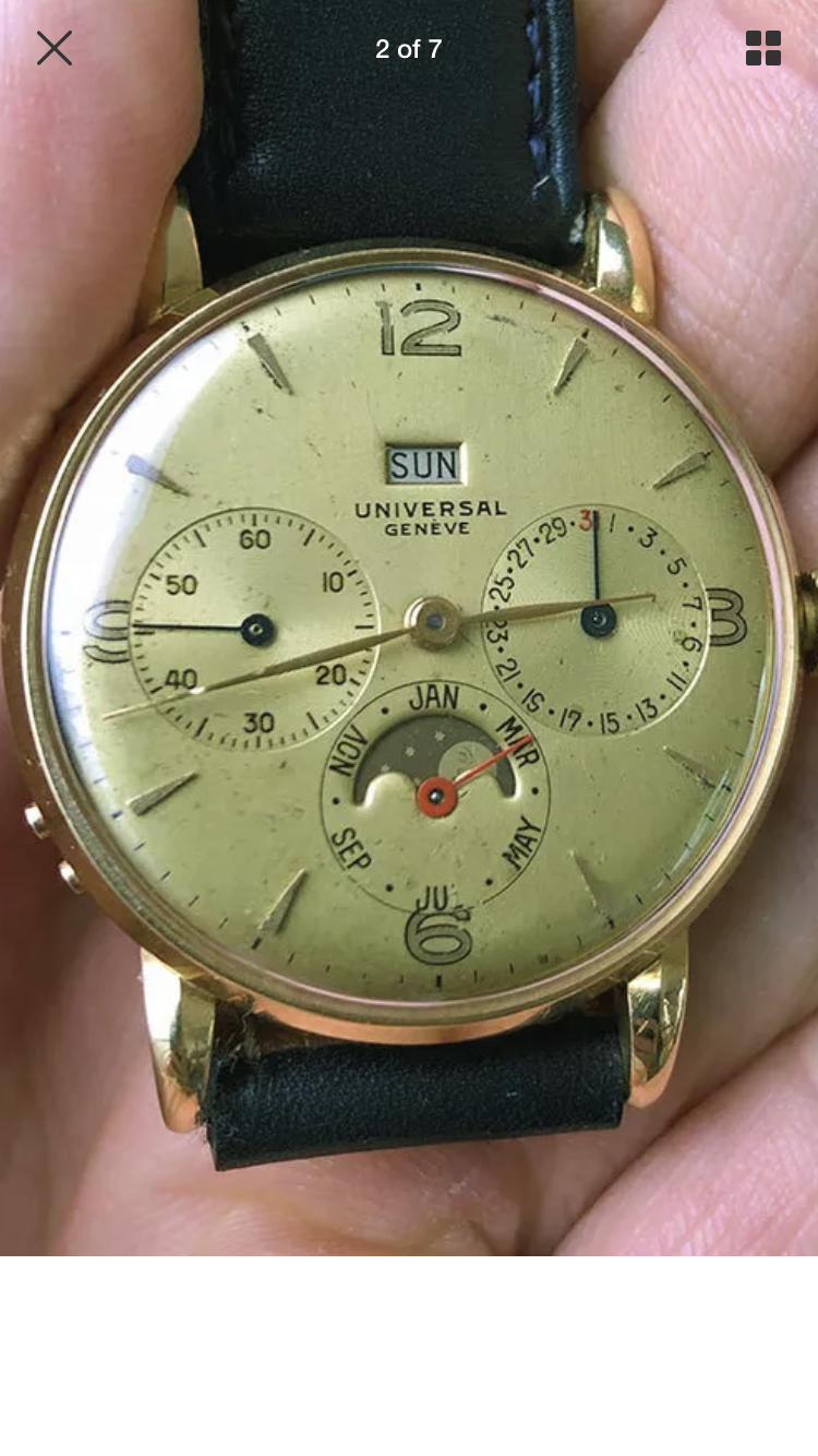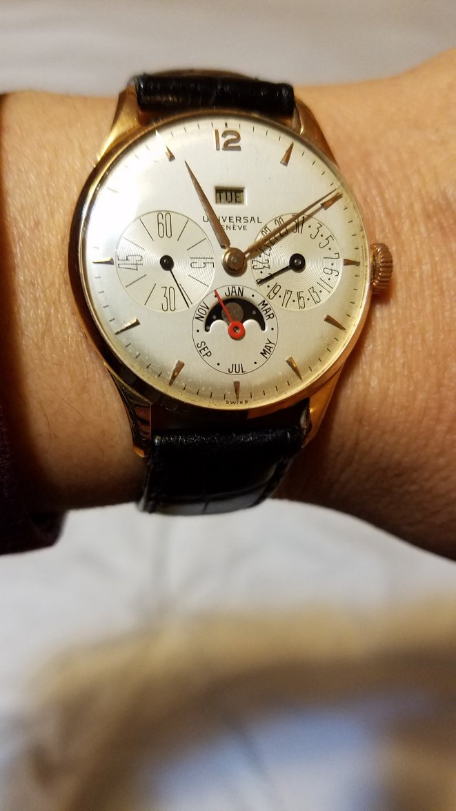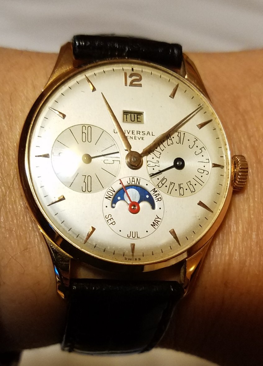 I am not an expert in UG, my focus is merely on Omega. Anyway, I have a similar UG triple date watch. Here are two pictures of mine for comparison.